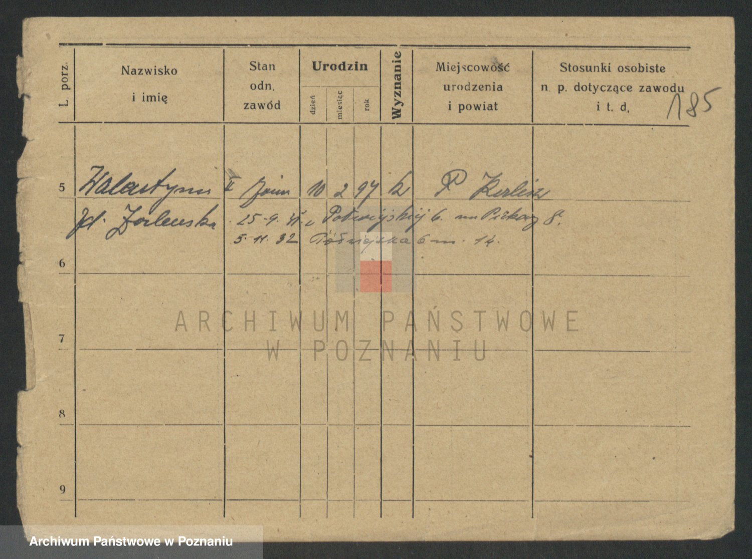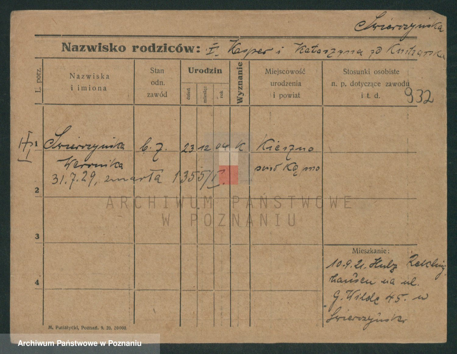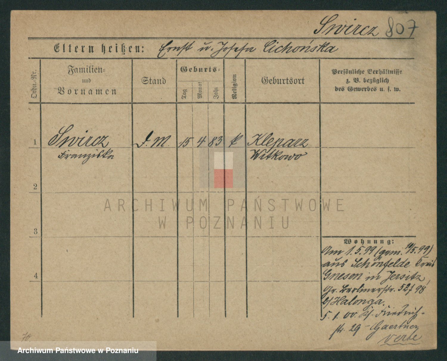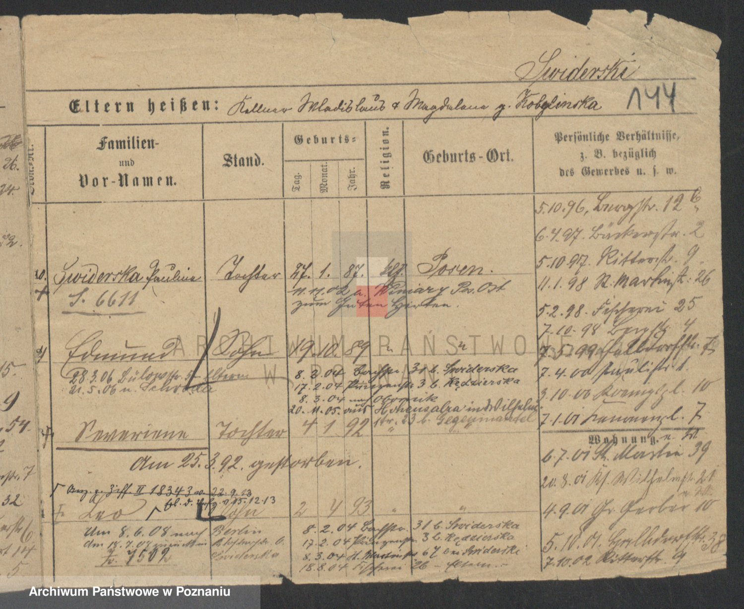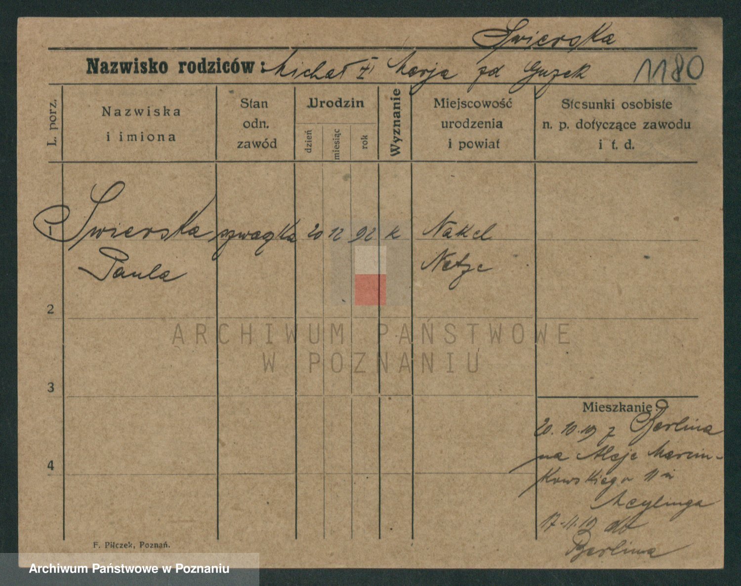 Podgląd karty osobowej dostępny jest po kliknięciu na nazwisko lub ikonkę karty. Można dokonywać powiększenia (ikony na górze) lub przechodzić między kolejnymi skanami (strzałki po bokach).