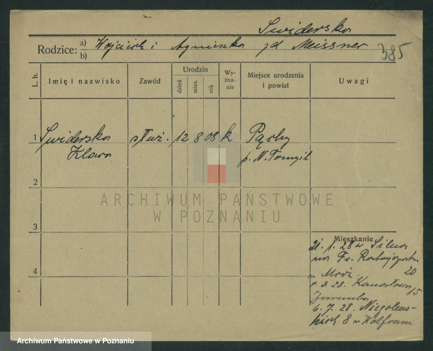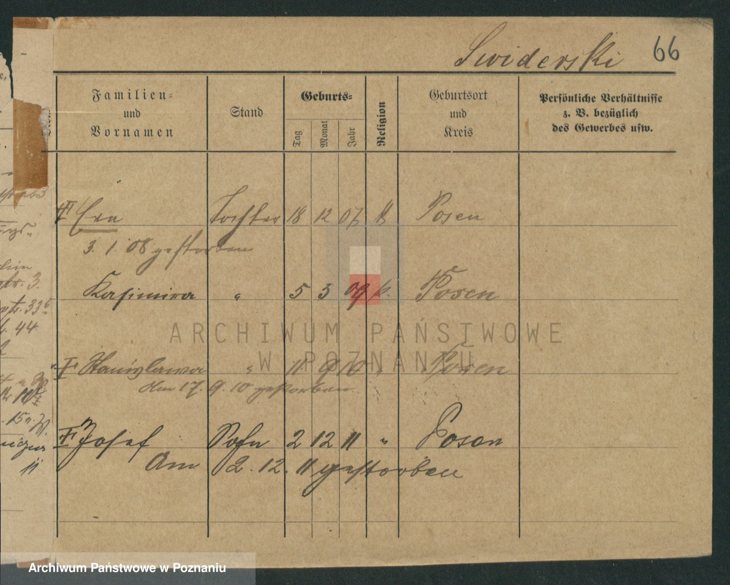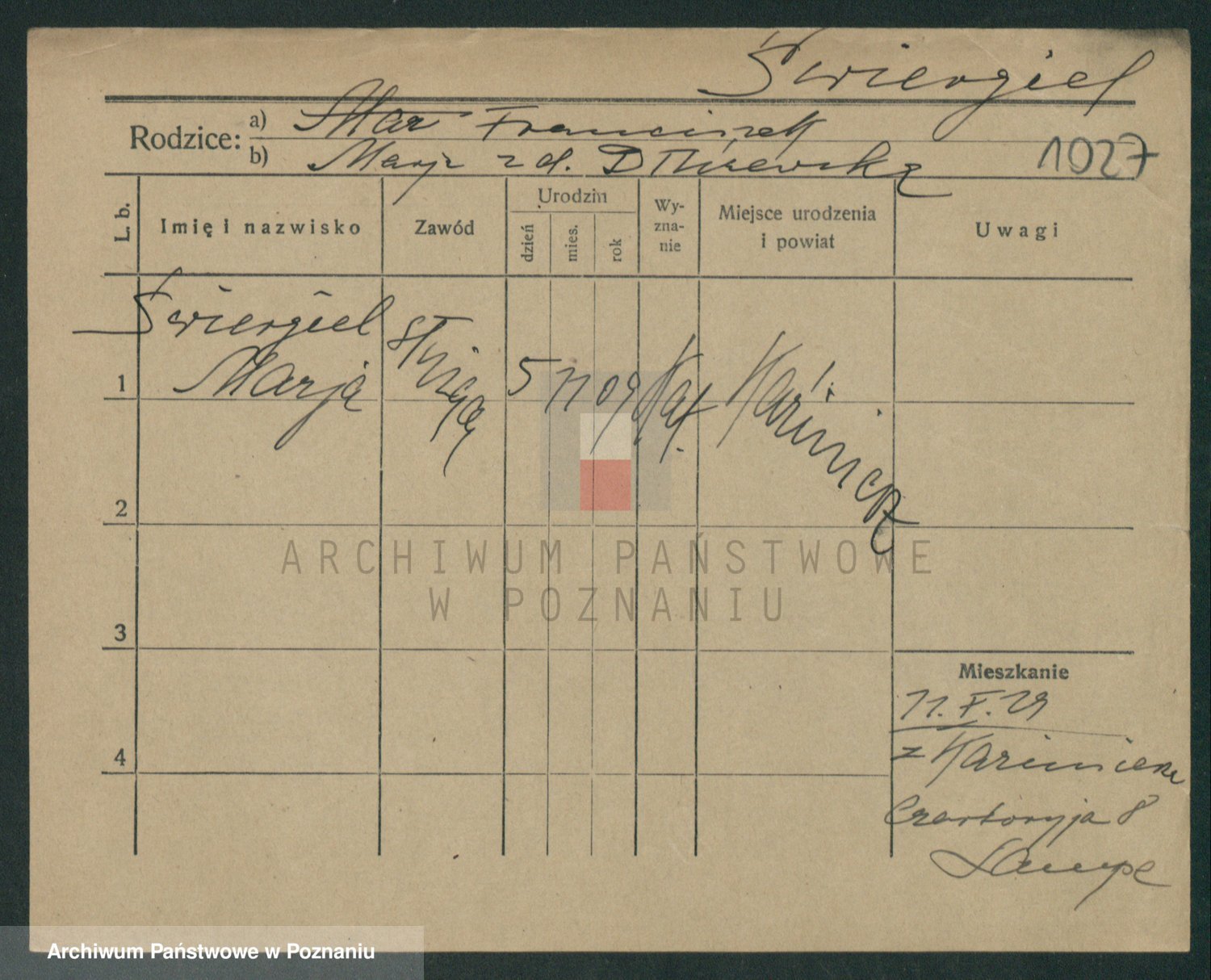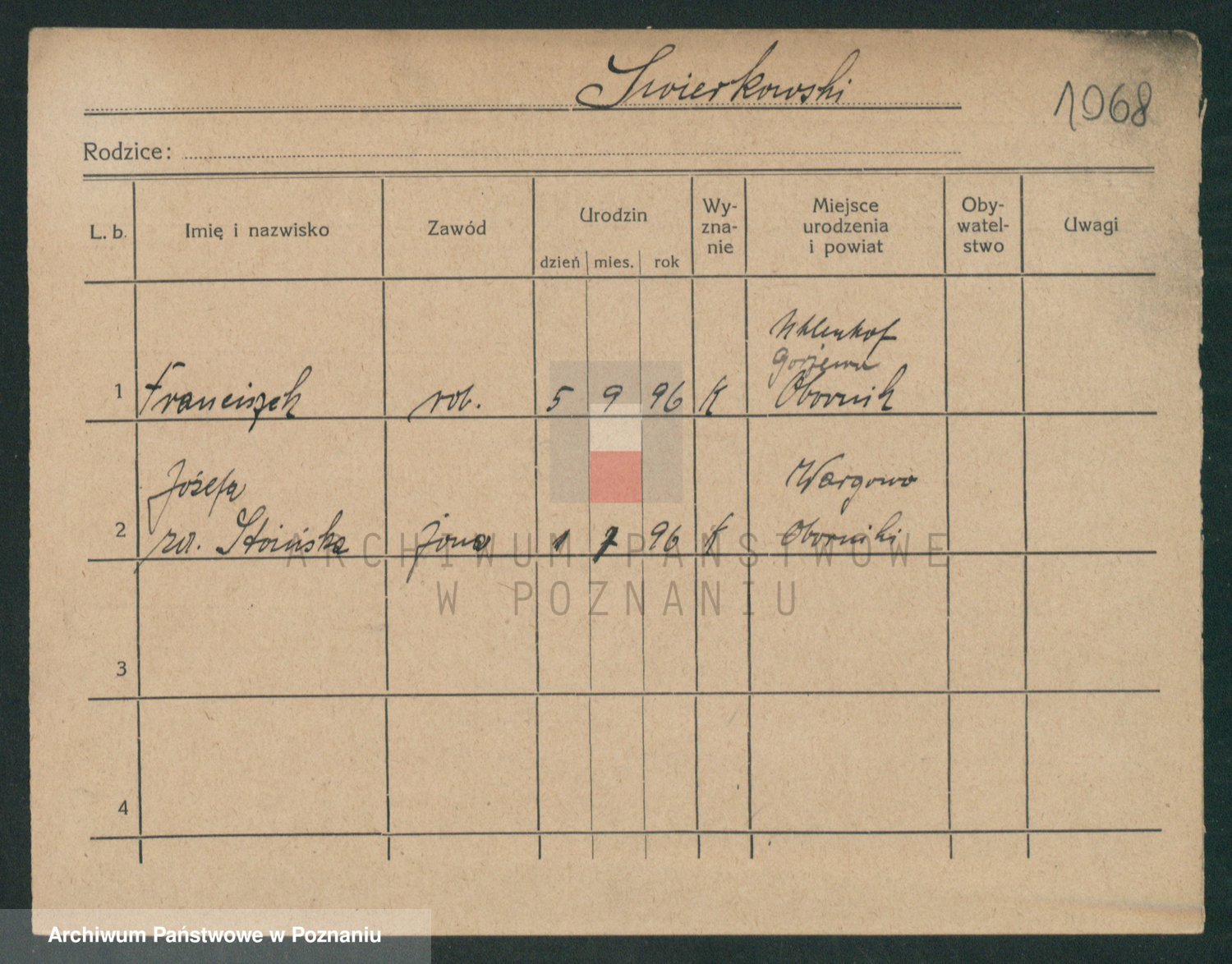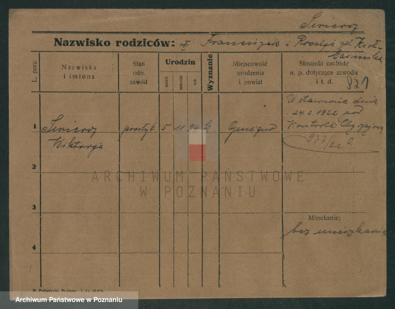Podgląd karty osobowej dostępny jest po kliknięciu na nazwisko lub ikonkę karty. Można dokonywać powiększenia (ikony na górze) lub przechodzić między kolejnymi skanami (strzałki po bokach).