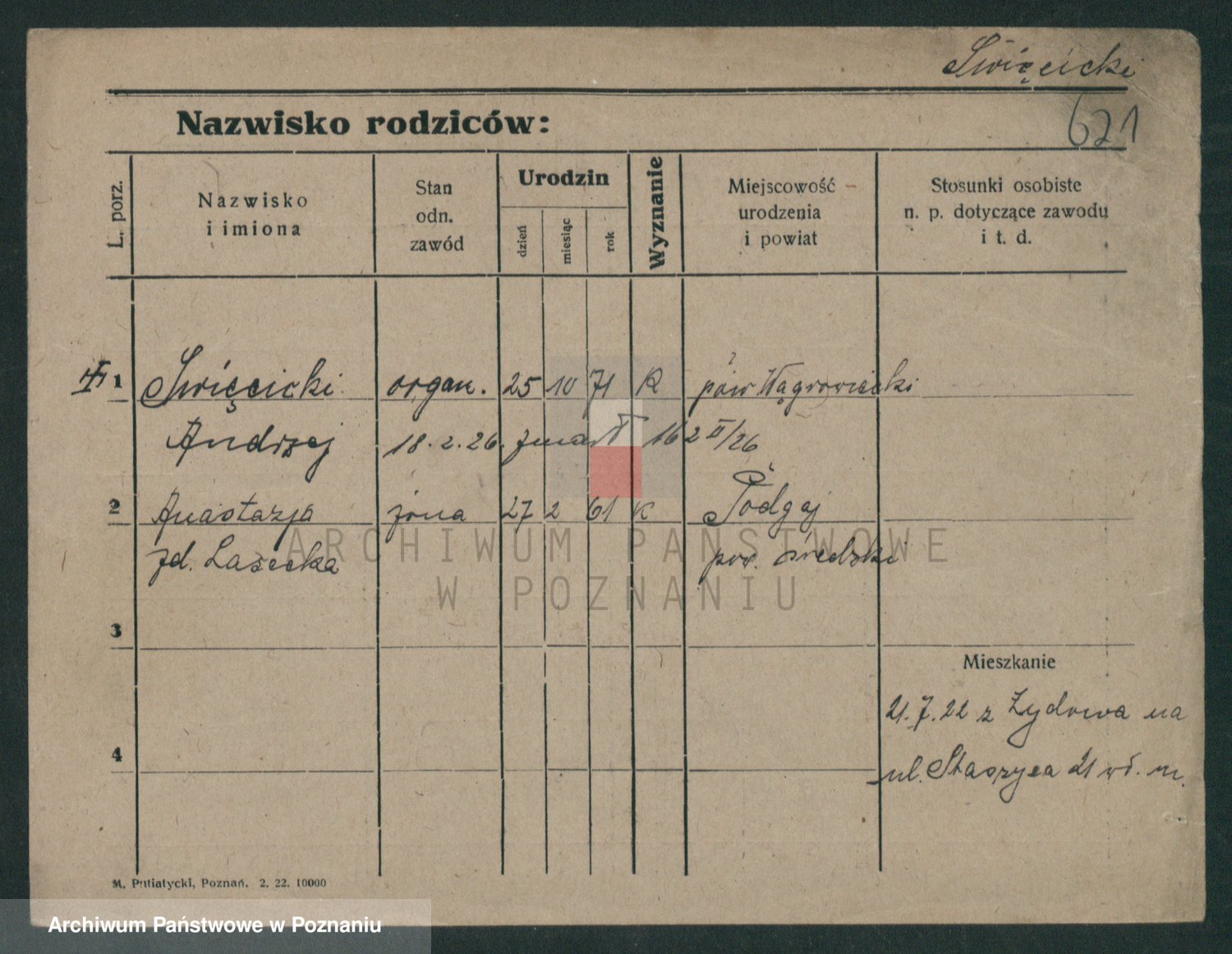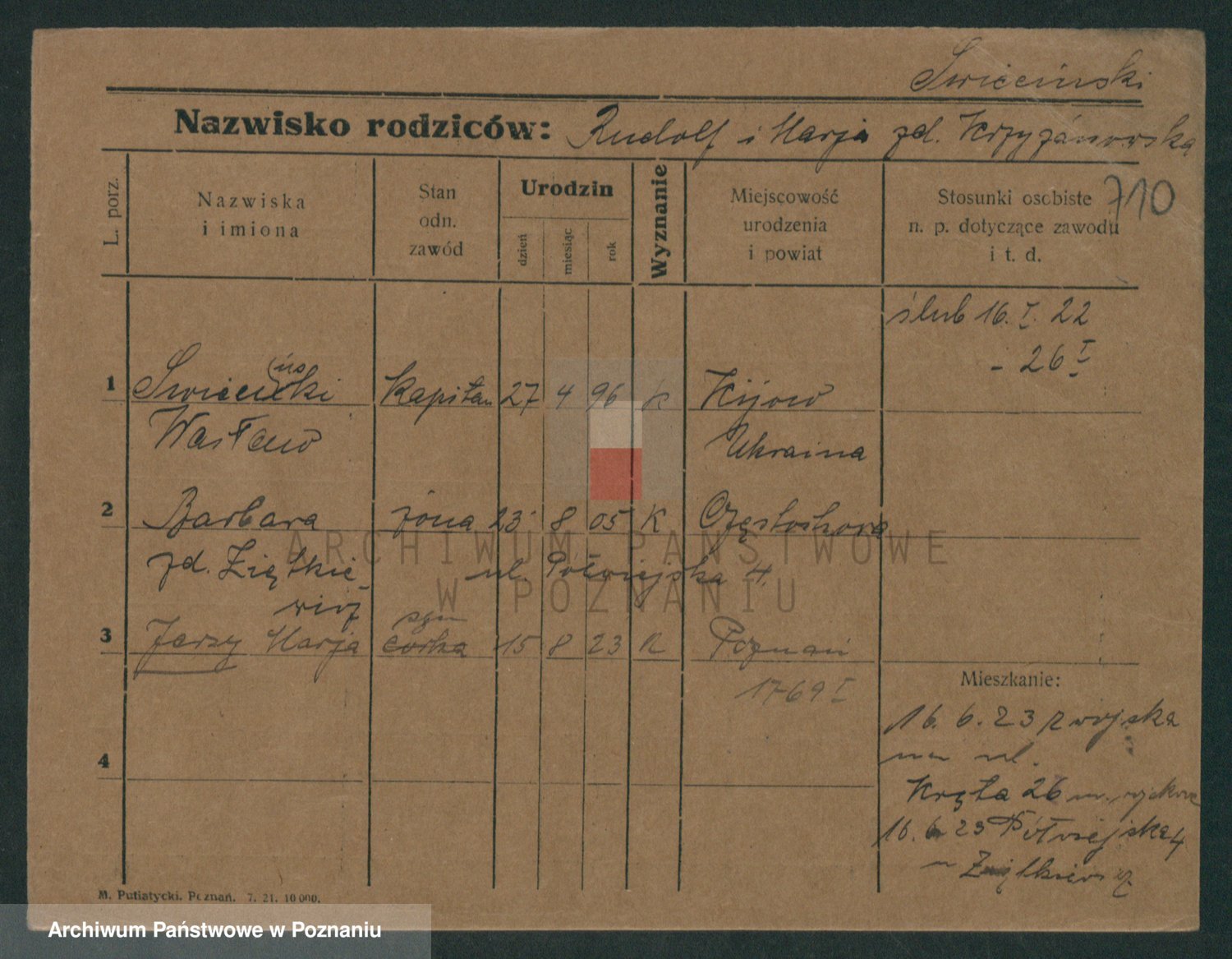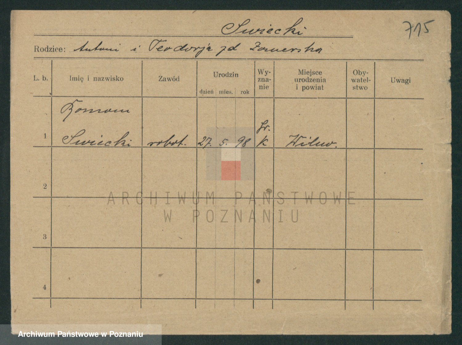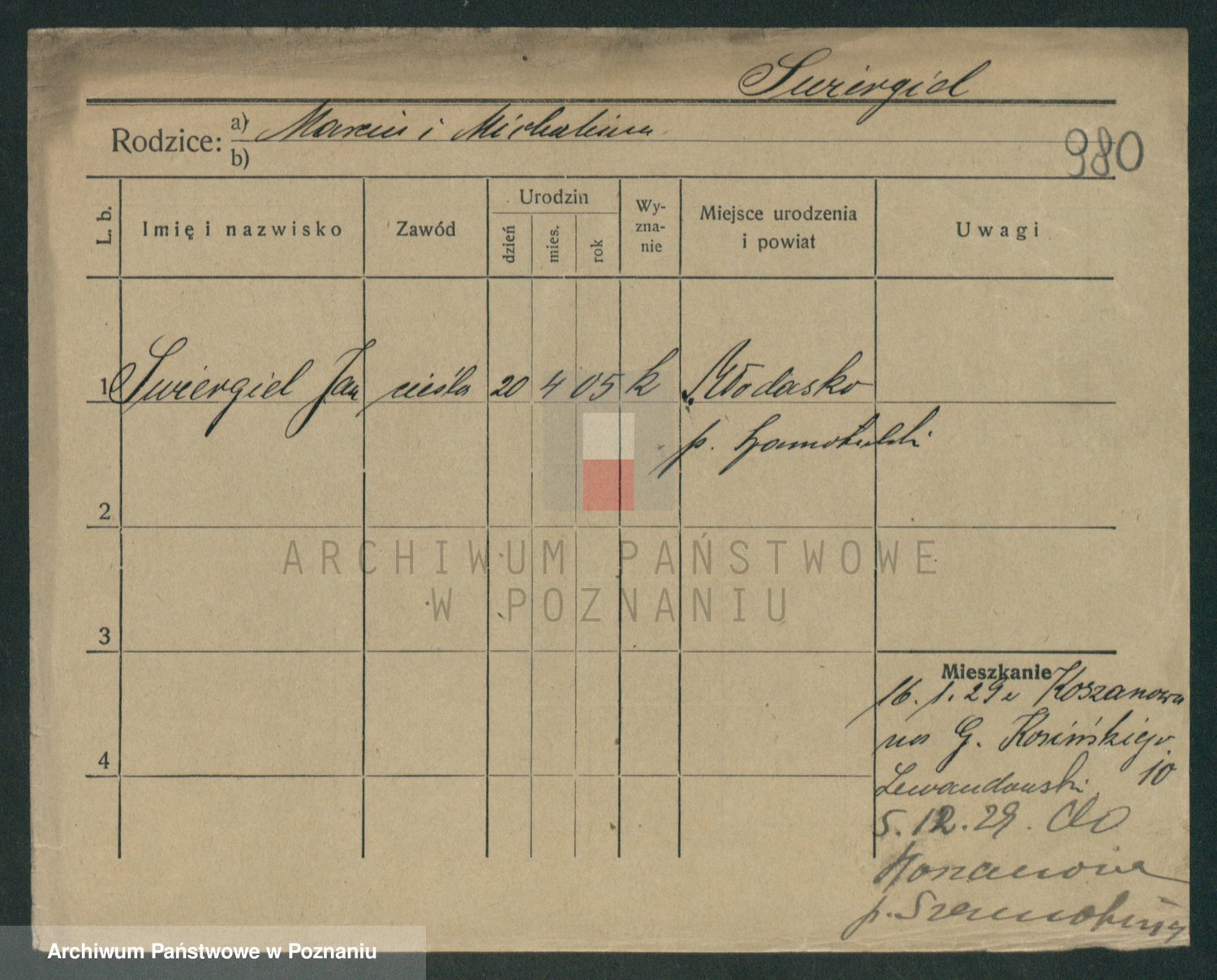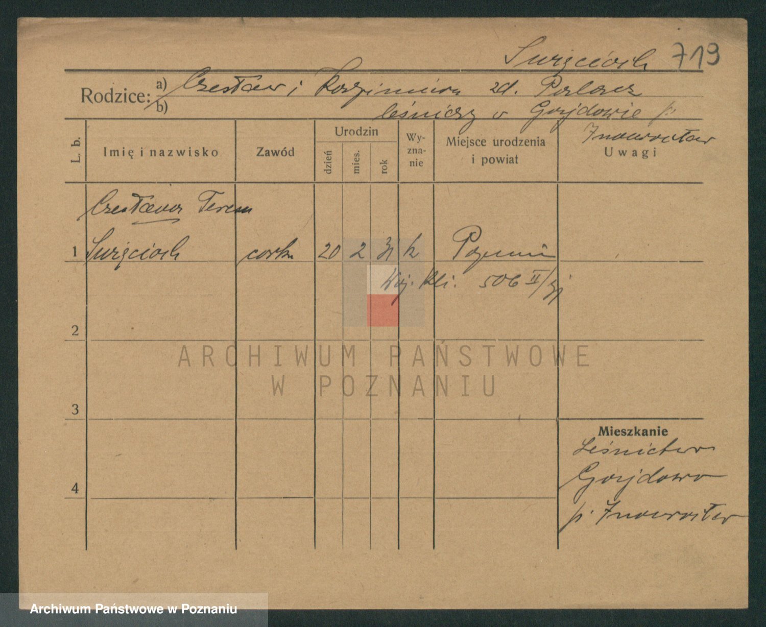 Podgląd karty osobowej dostępny jest po kliknięciu na nazwisko lub ikonkę karty. Można dokonywać powiększenia (ikony na górze) lub przechodzić między kolejnymi skanami (strzałki po bokach).