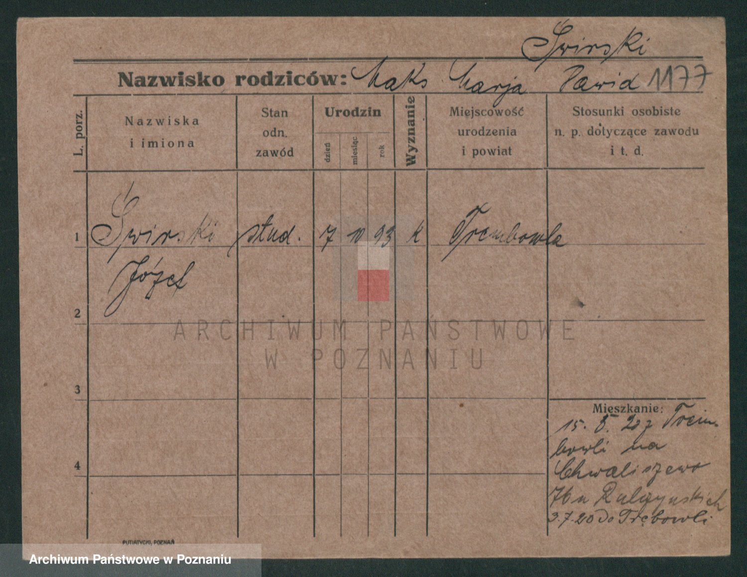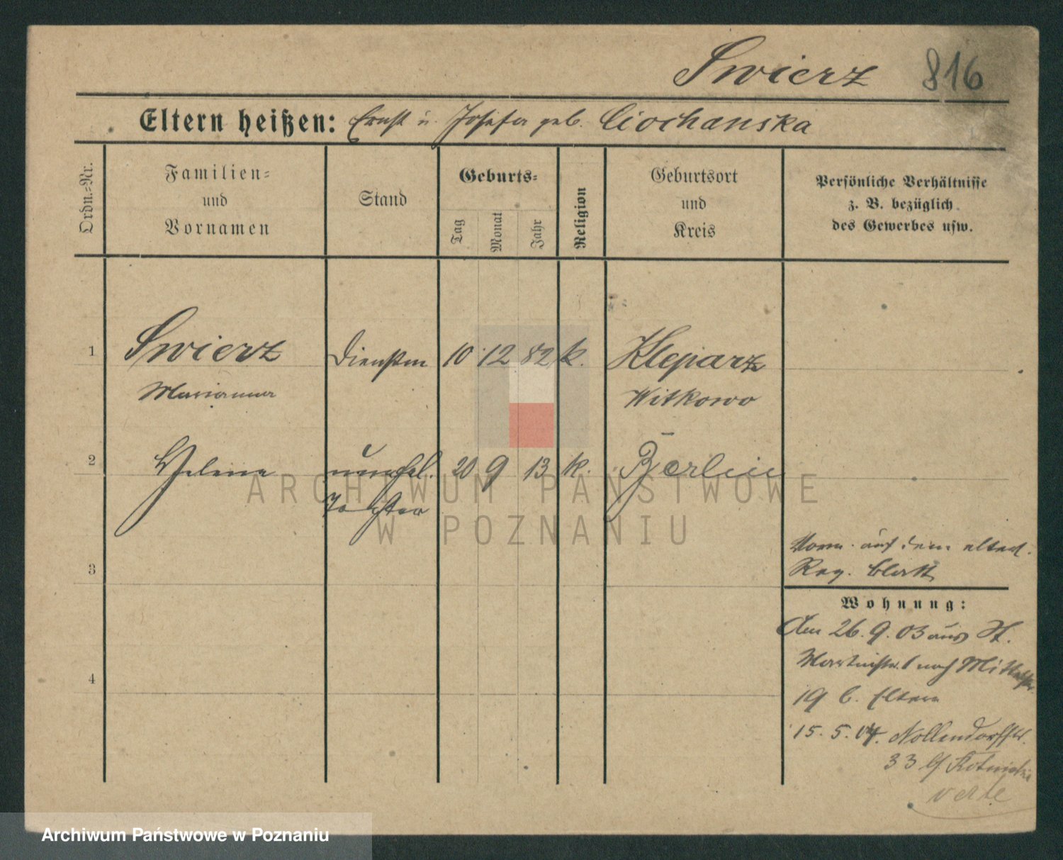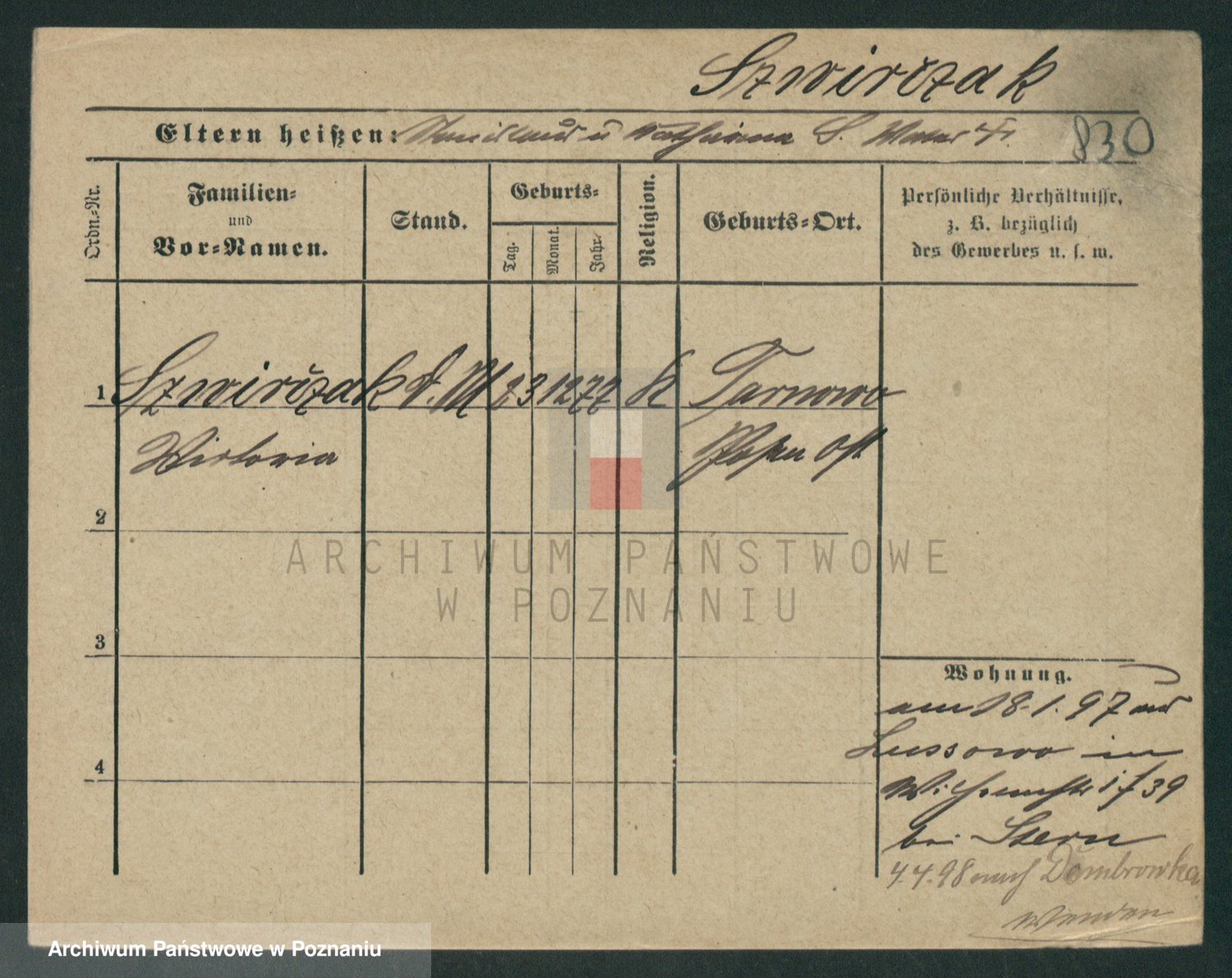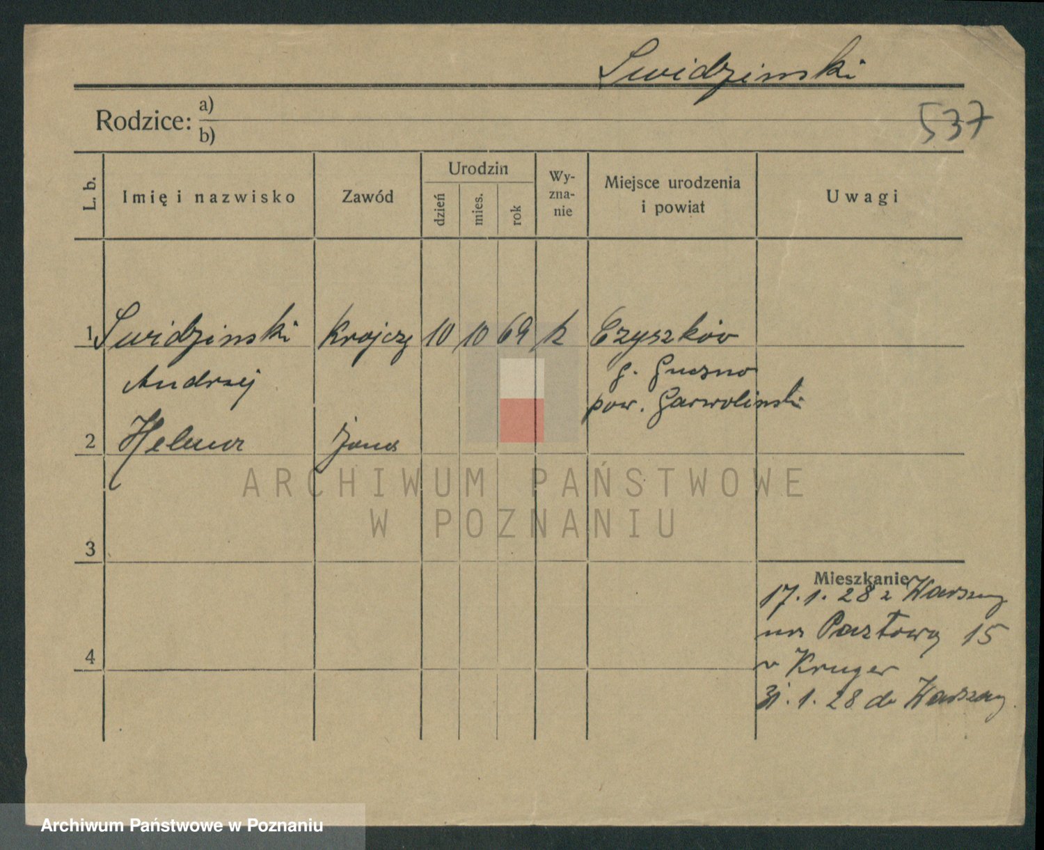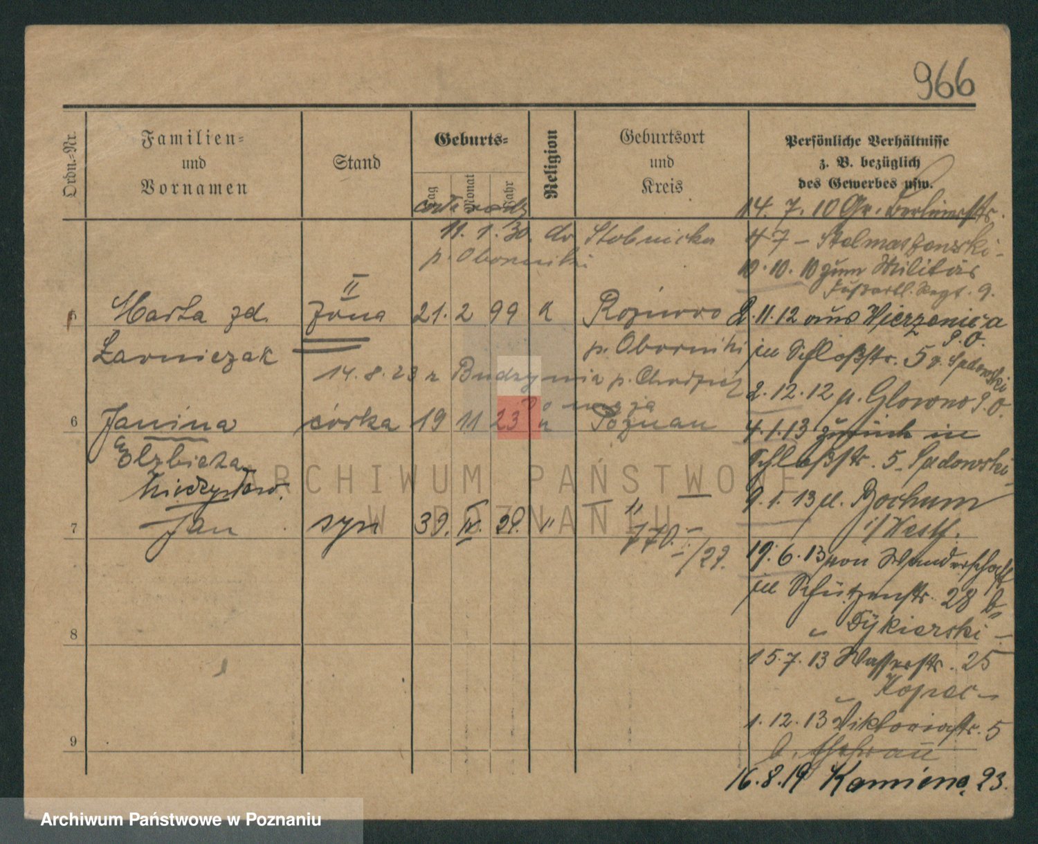 Podgląd karty osobowej dostępny jest po kliknięciu na nazwisko lub ikonkę karty. Można dokonywać powiększenia (ikony na górze) lub przechodzić między kolejnymi skanami (strzałki po bokach).
