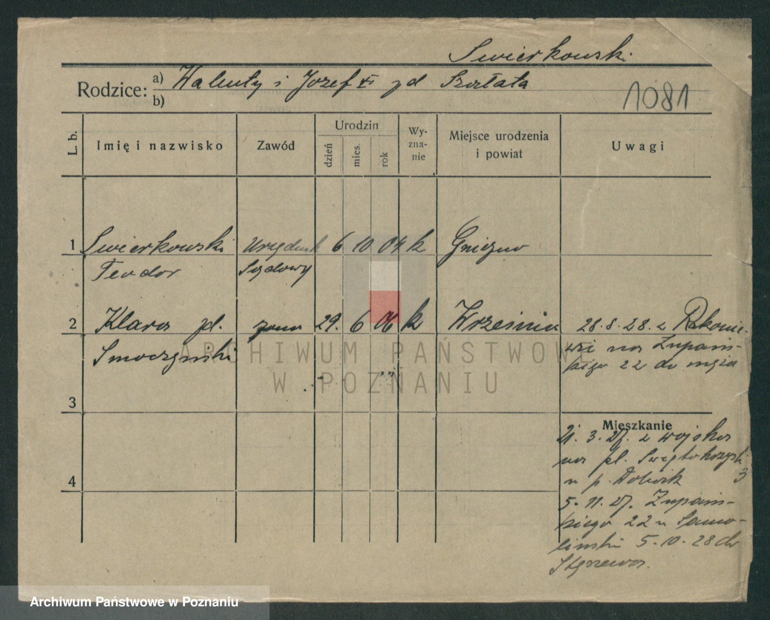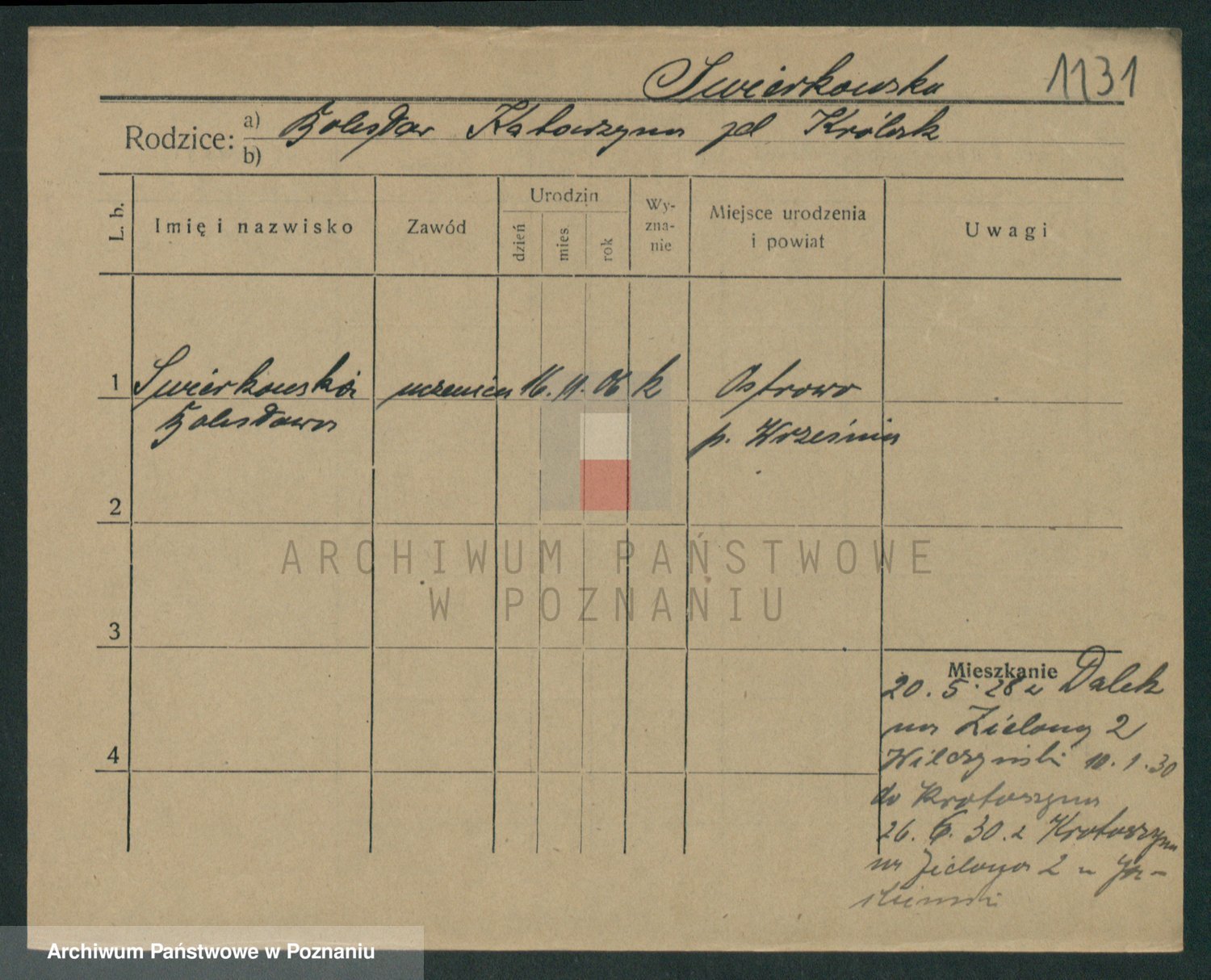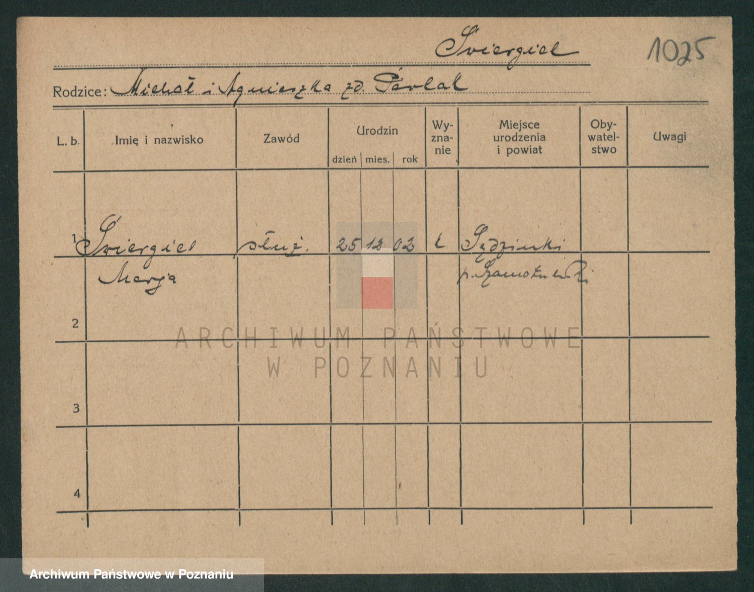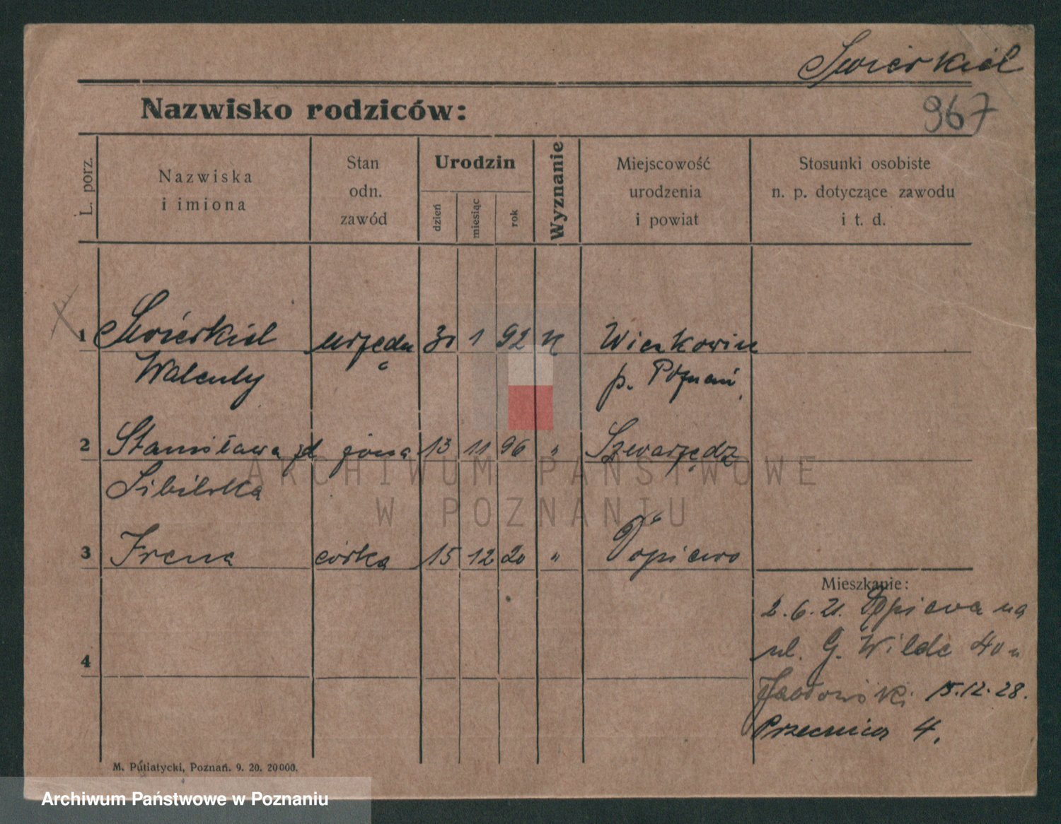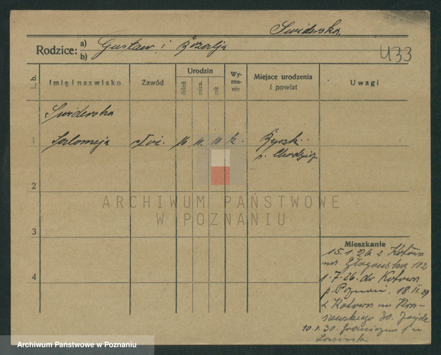 Podgląd karty osobowej dostępny jest po kliknięciu na nazwisko lub ikonkę karty. Można dokonywać powiększenia (ikony na górze) lub przechodzić między kolejnymi skanami (strzałki po bokach).