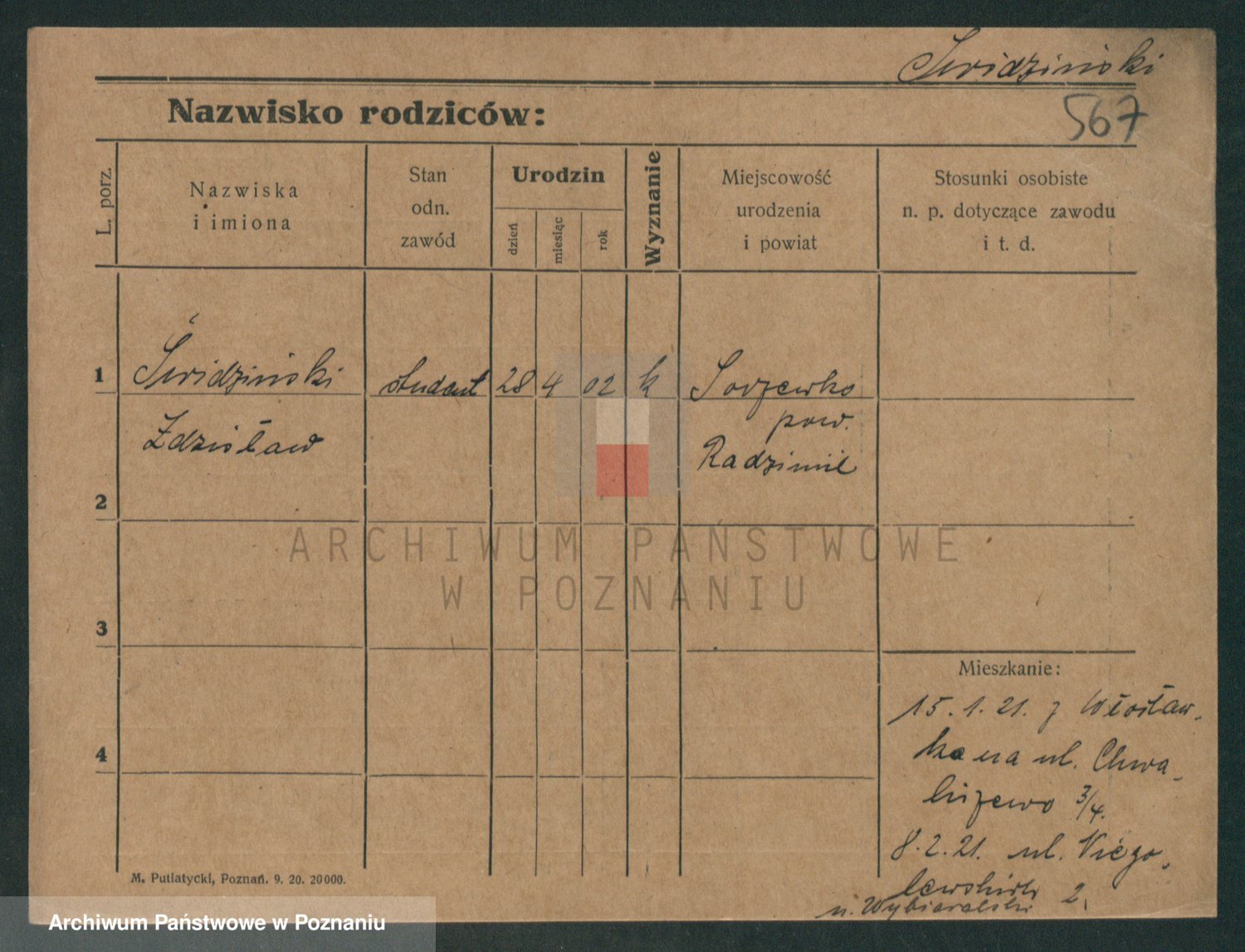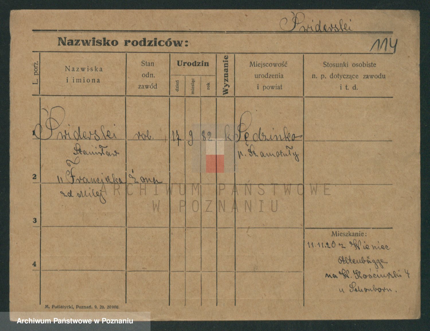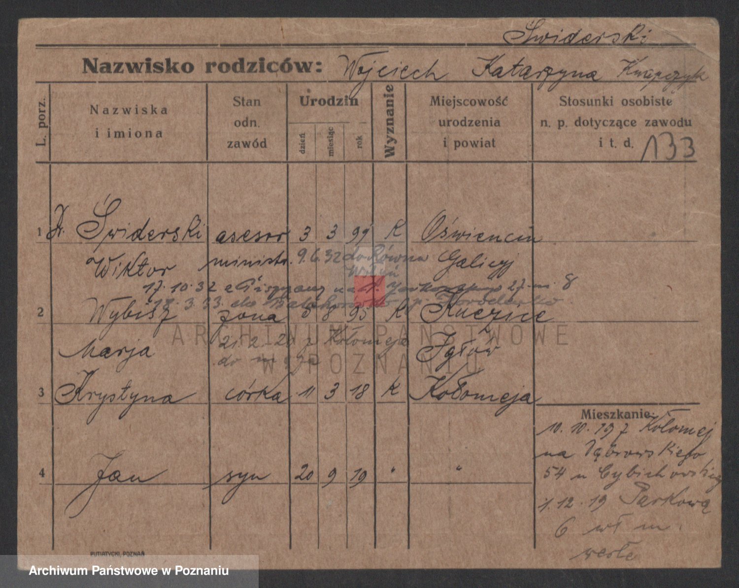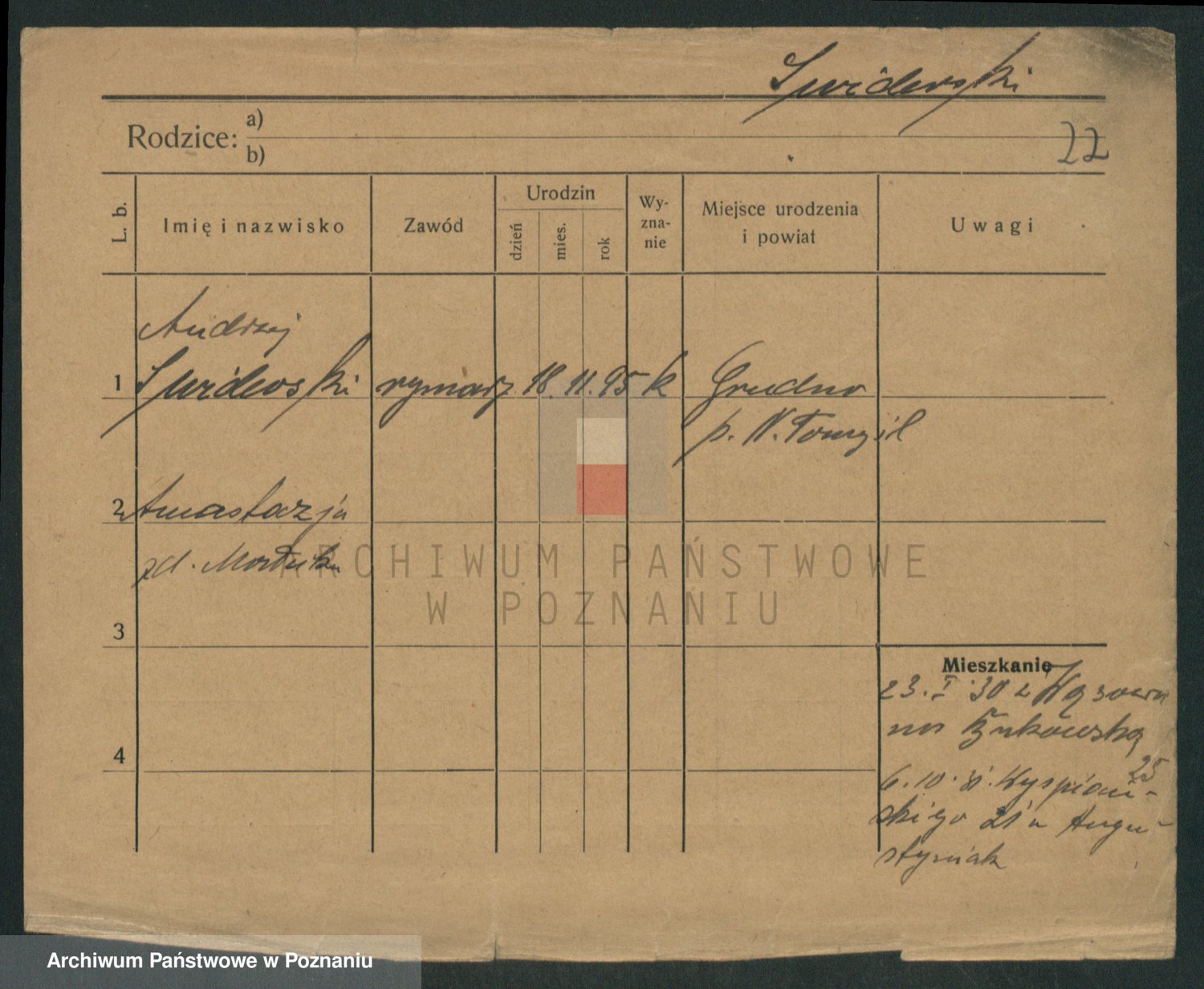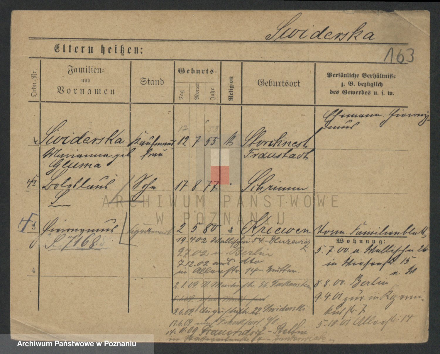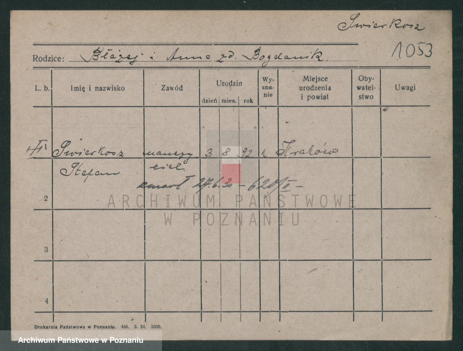Podgląd karty osobowej dostępny jest po kliknięciu na nazwisko lub ikonkę karty. Można dokonywać powiększenia (ikony na górze) lub przechodzić między kolejnymi skanami (strzałki po bokach).