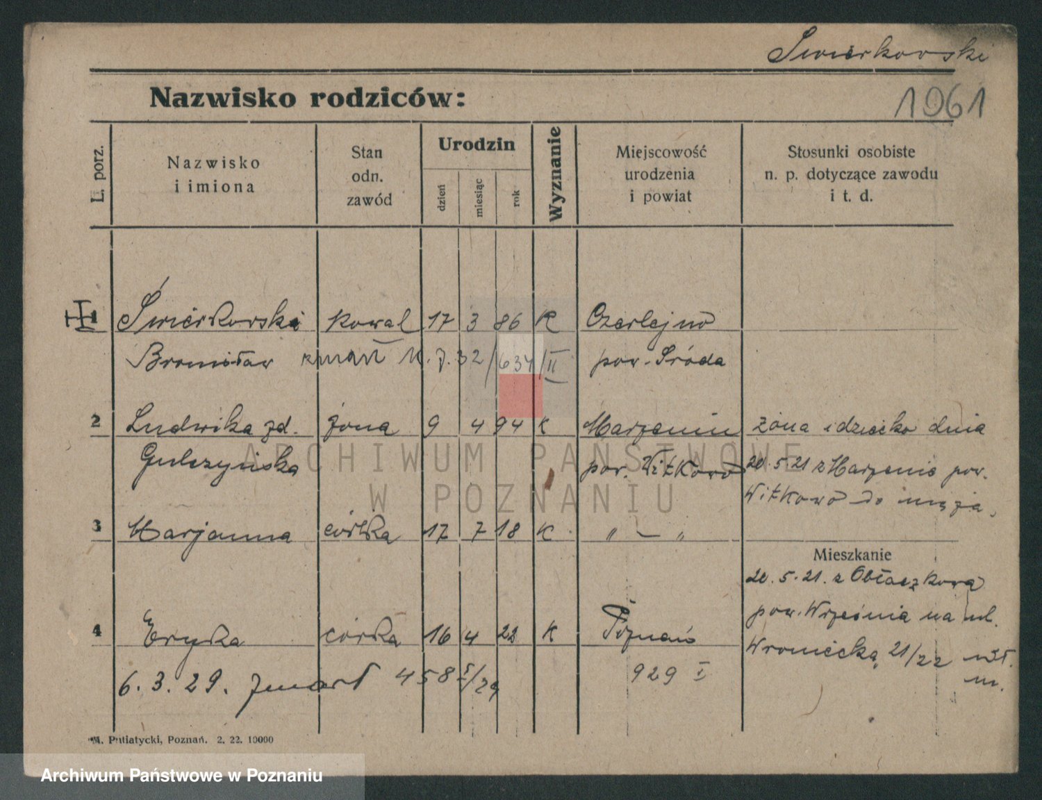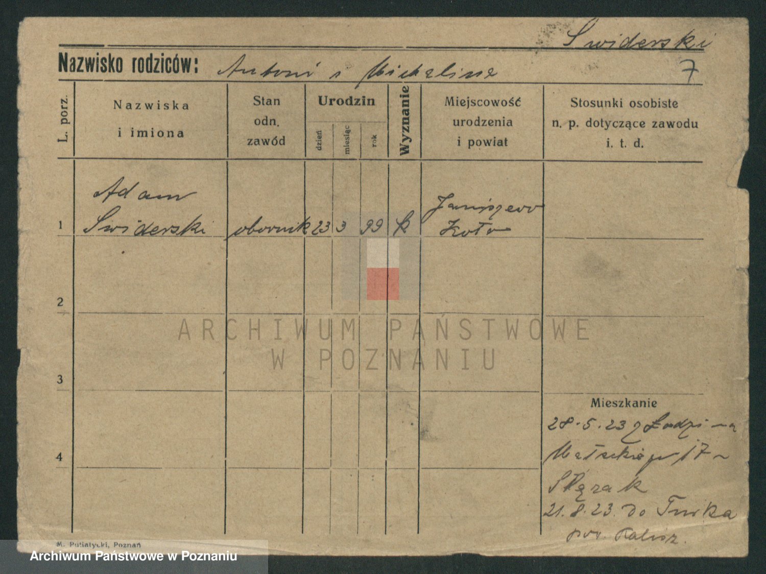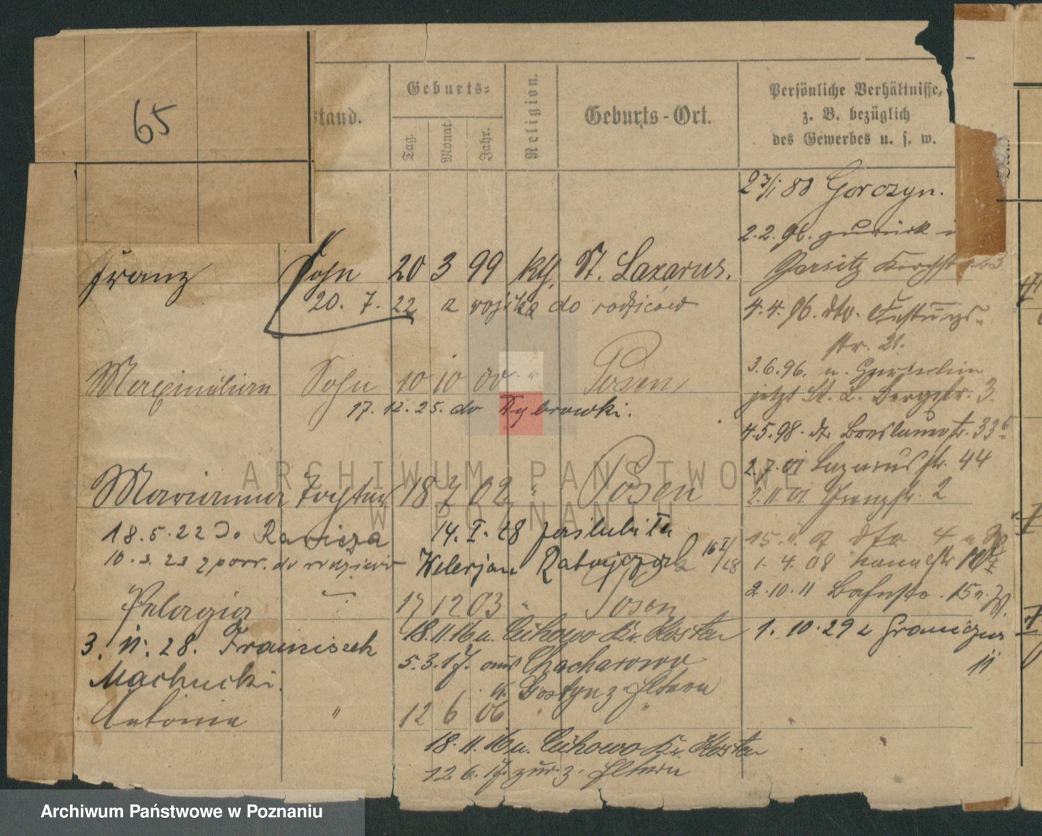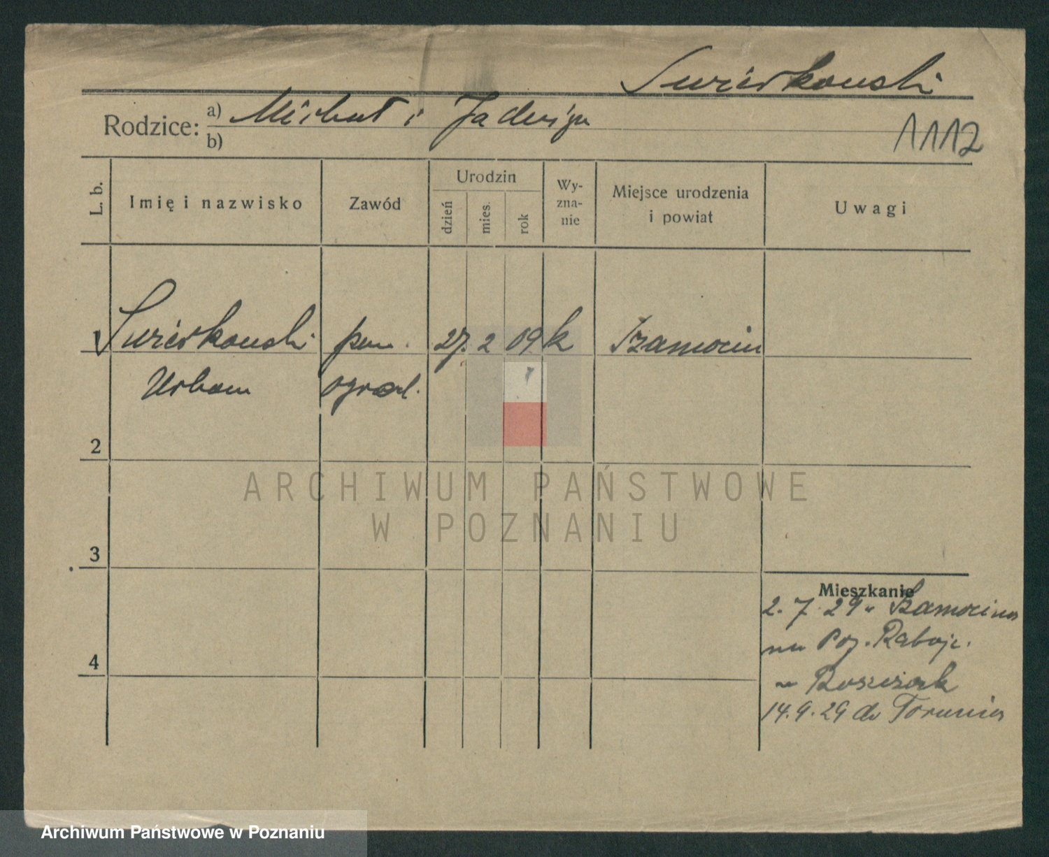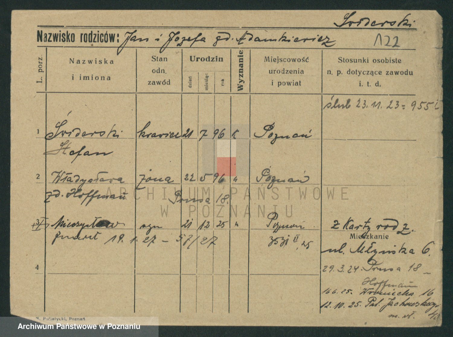 Podgląd karty osobowej dostępny jest po kliknięciu na nazwisko lub ikonkę karty. Można dokonywać powiększenia (ikony na górze) lub przechodzić między kolejnymi skanami (strzałki po bokach).