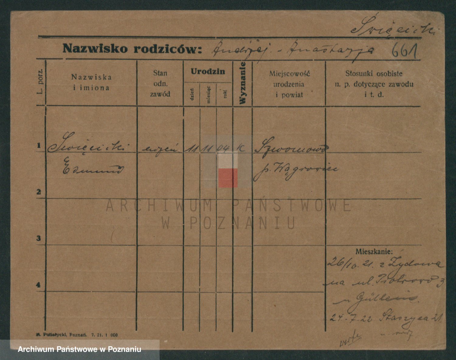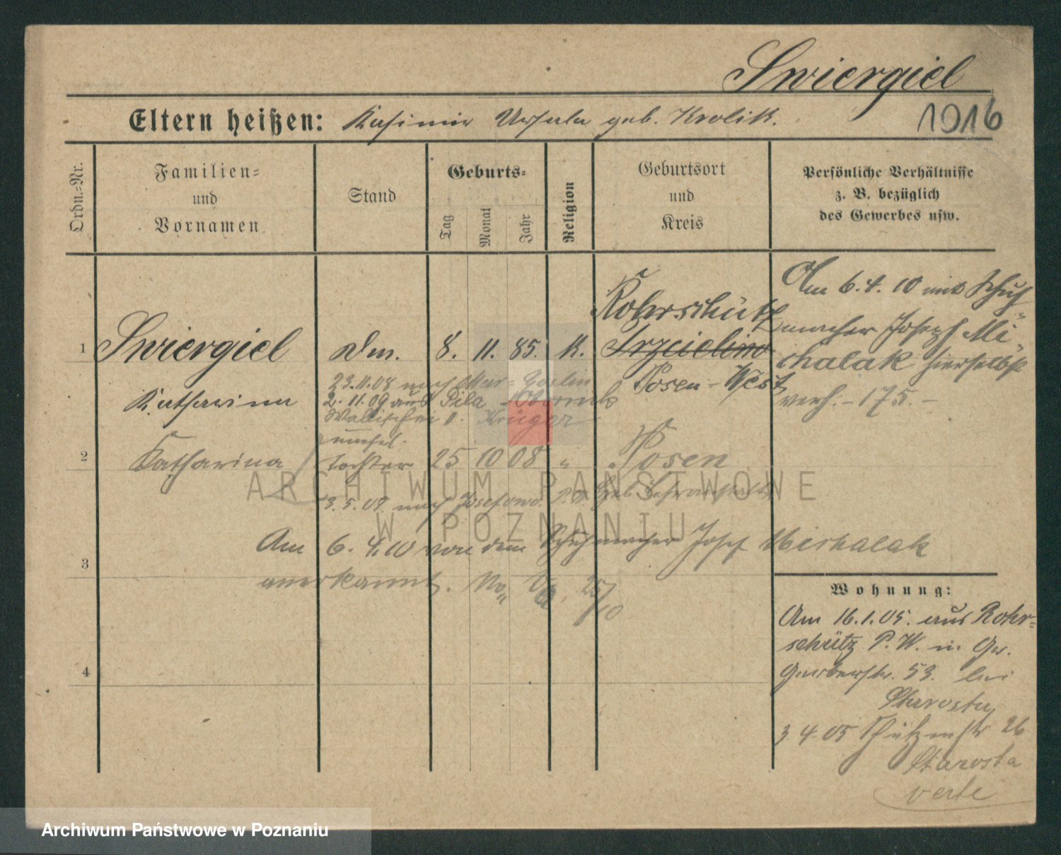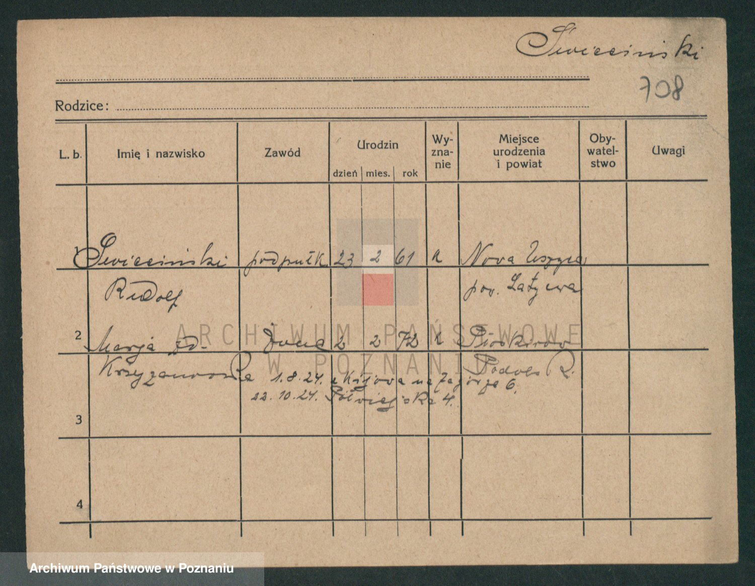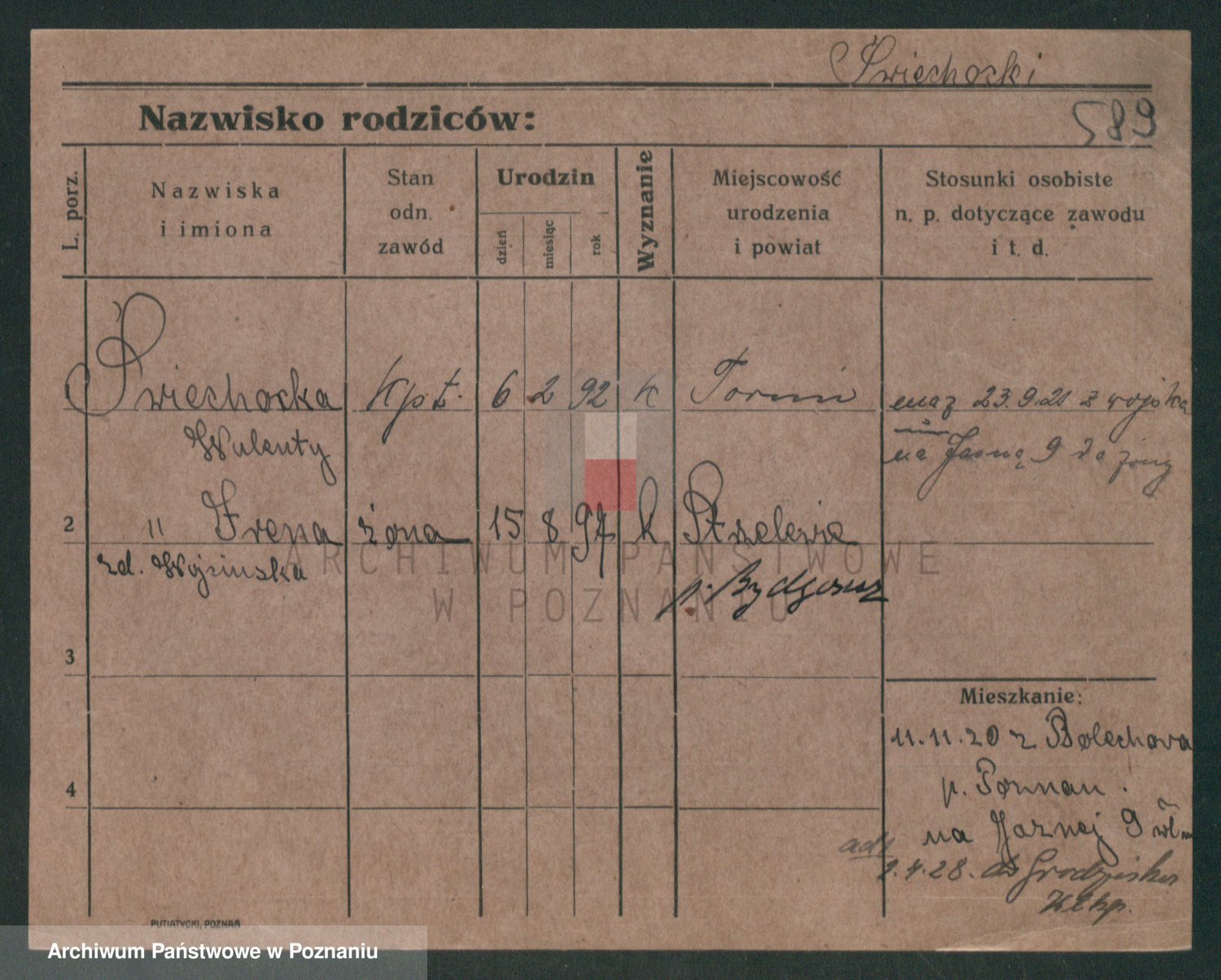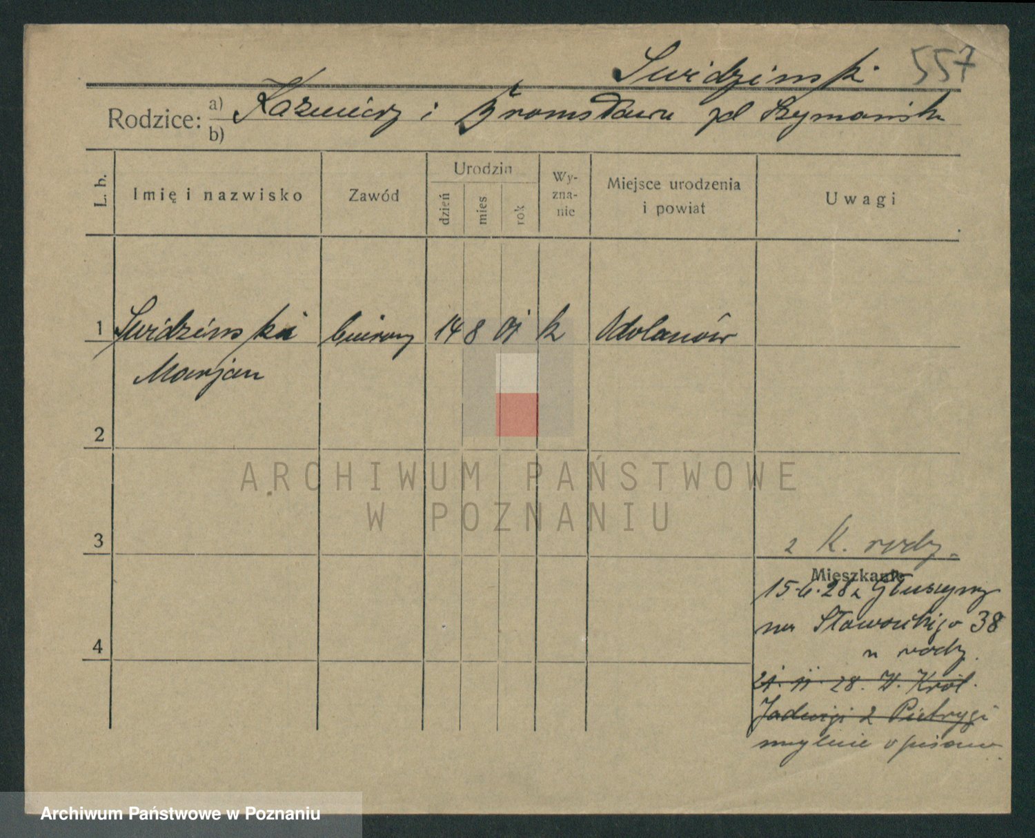 Podgląd karty osobowej dostępny jest po kliknięciu na nazwisko lub ikonkę karty. Można dokonywać powiększenia (ikony na górze) lub przechodzić między kolejnymi skanami (strzałki po bokach).