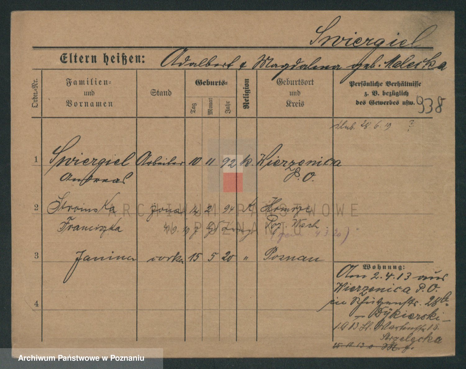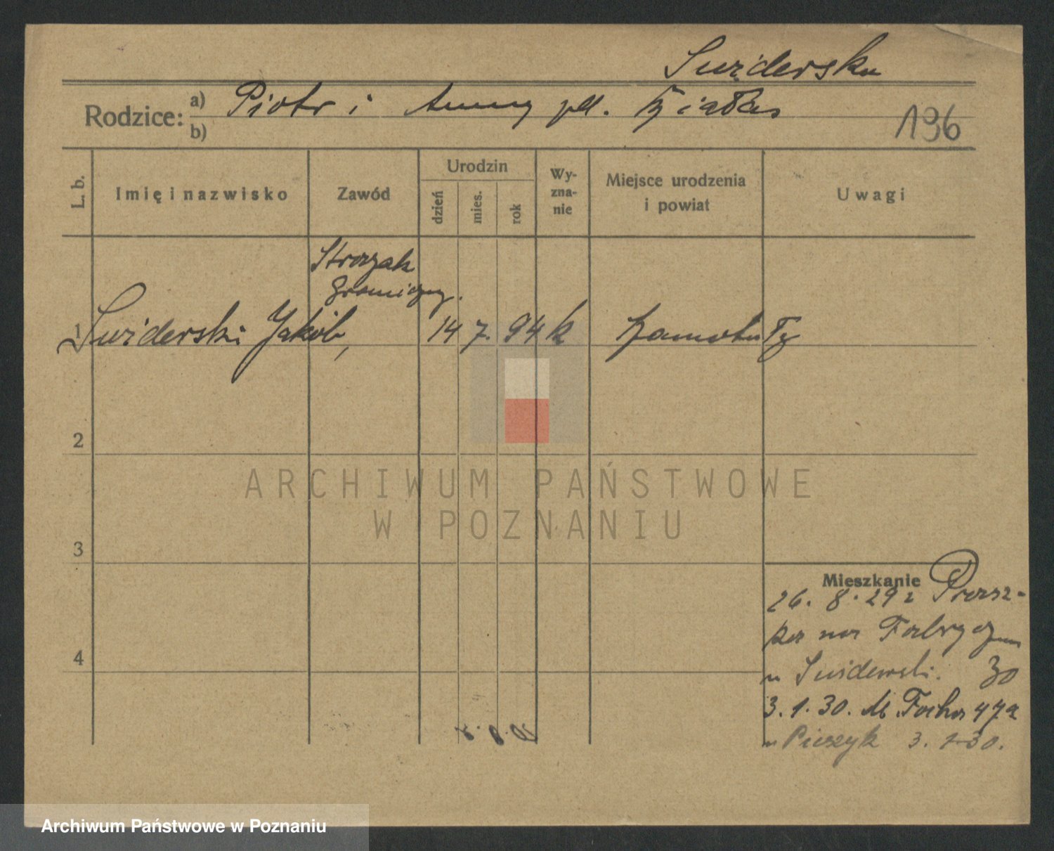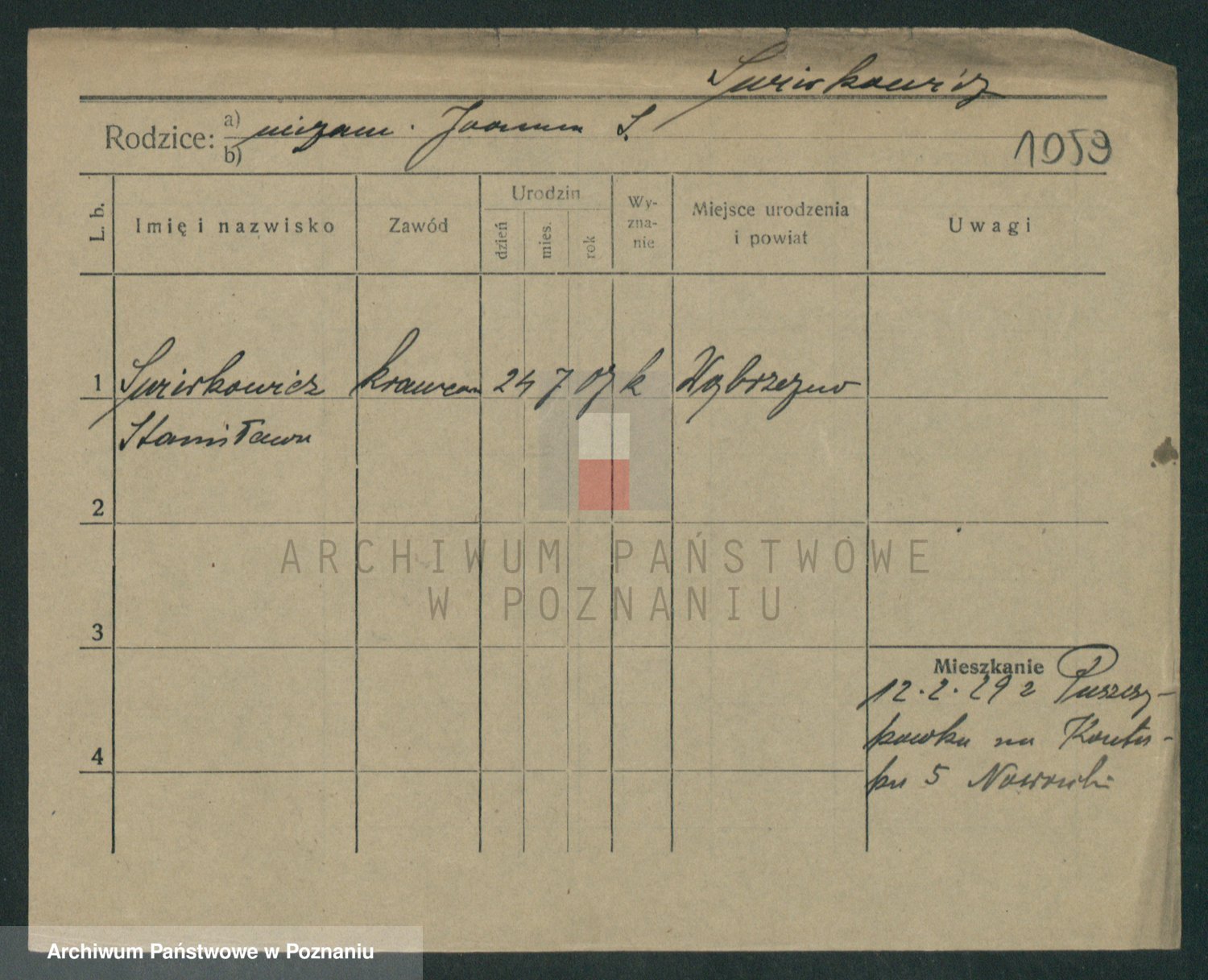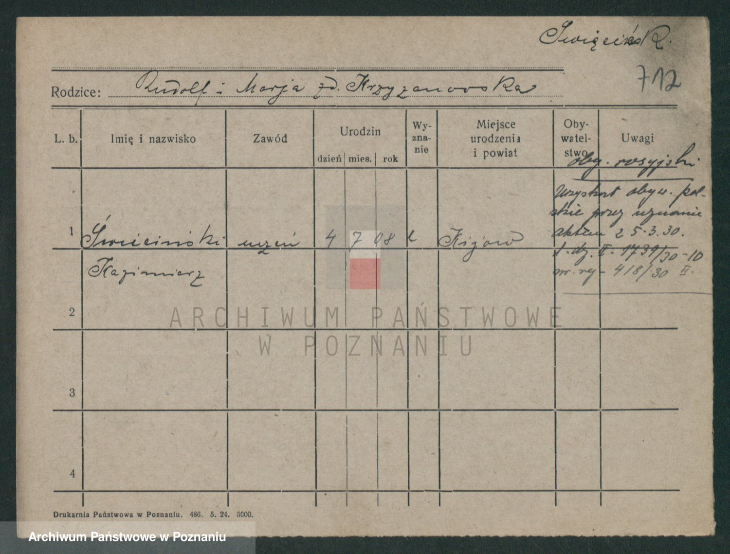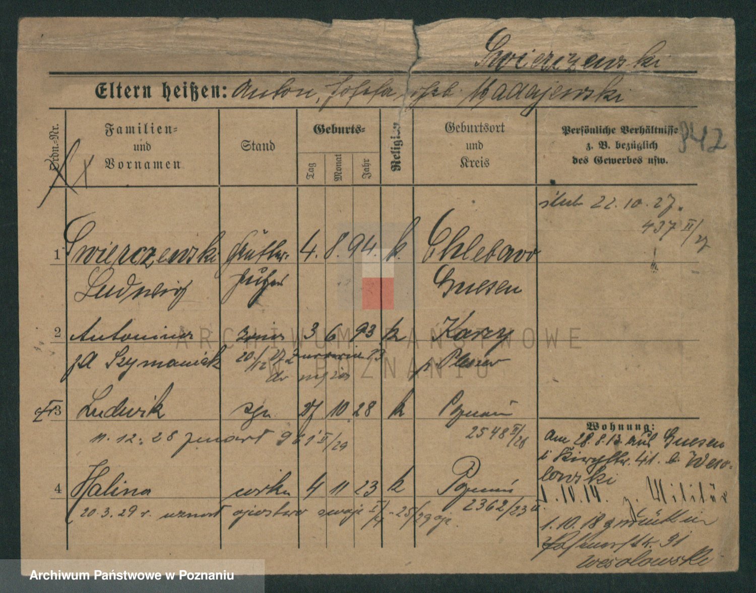 Podgląd karty osobowej dostępny jest po kliknięciu na nazwisko lub ikonkę karty. Można dokonywać powiększenia (ikony na górze) lub przechodzić między kolejnymi skanami (strzałki po bokach).