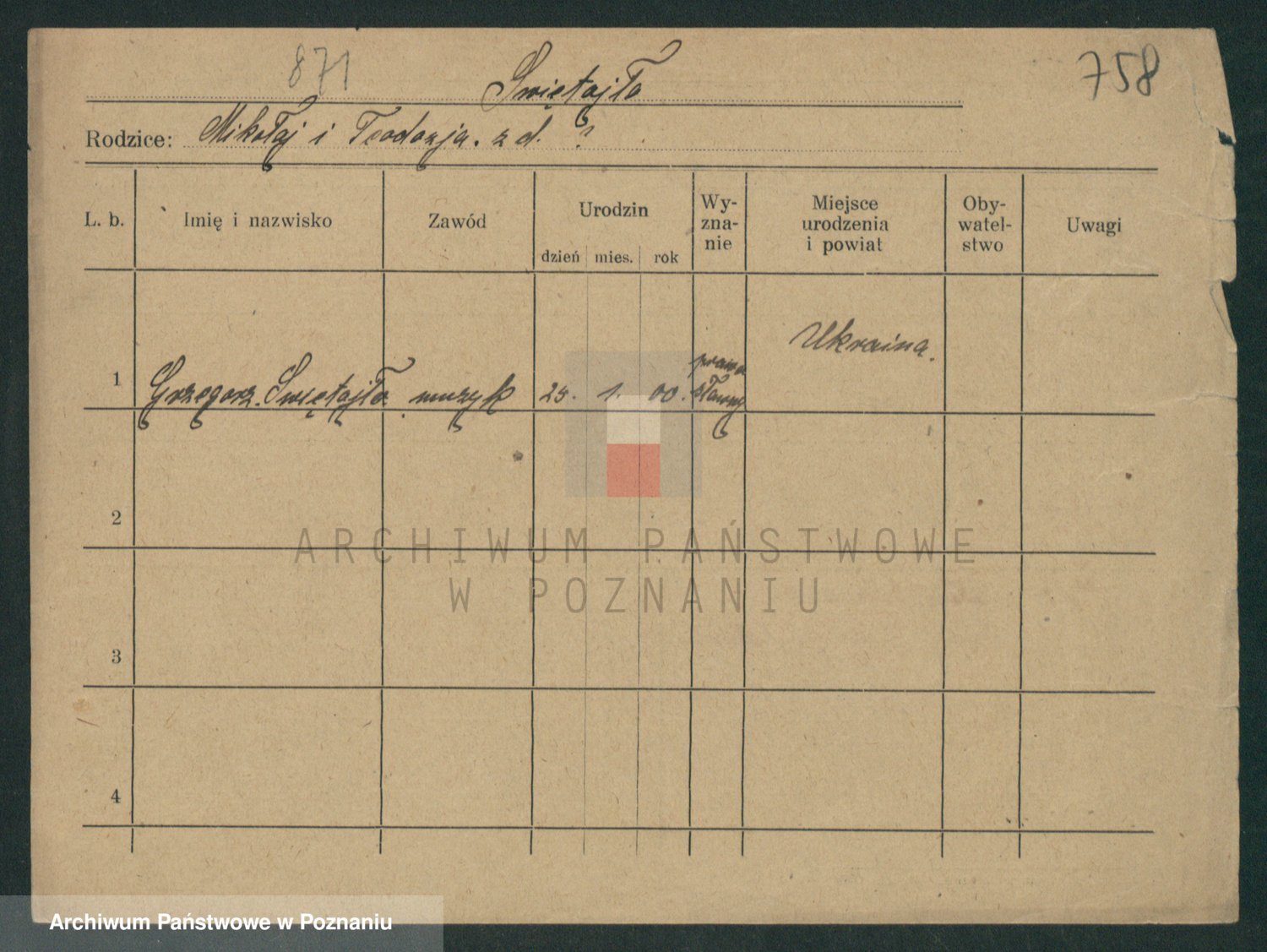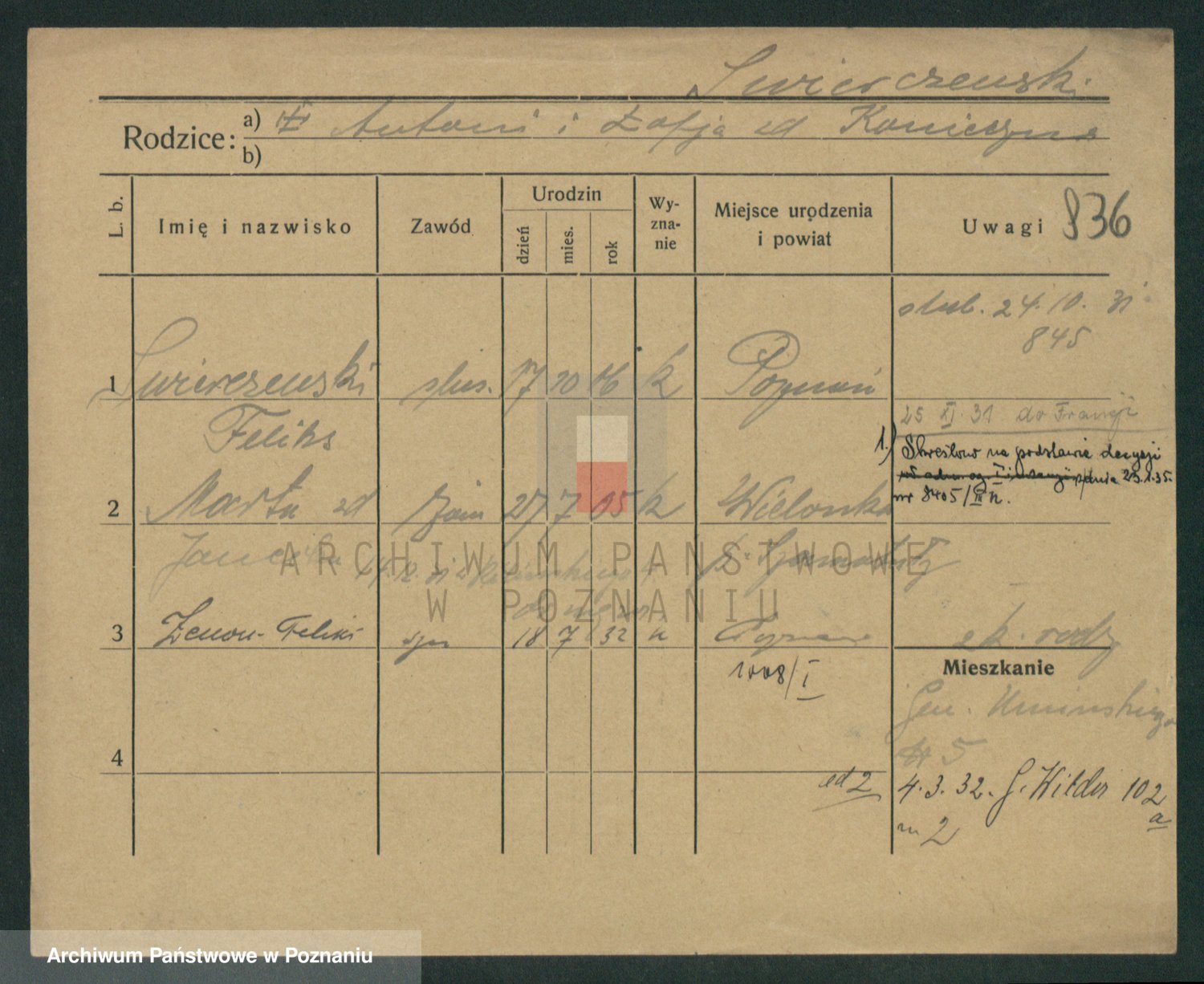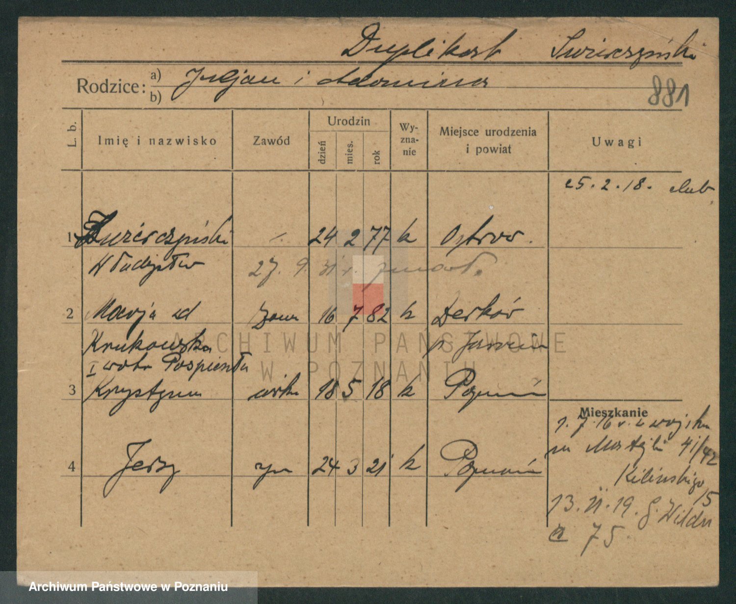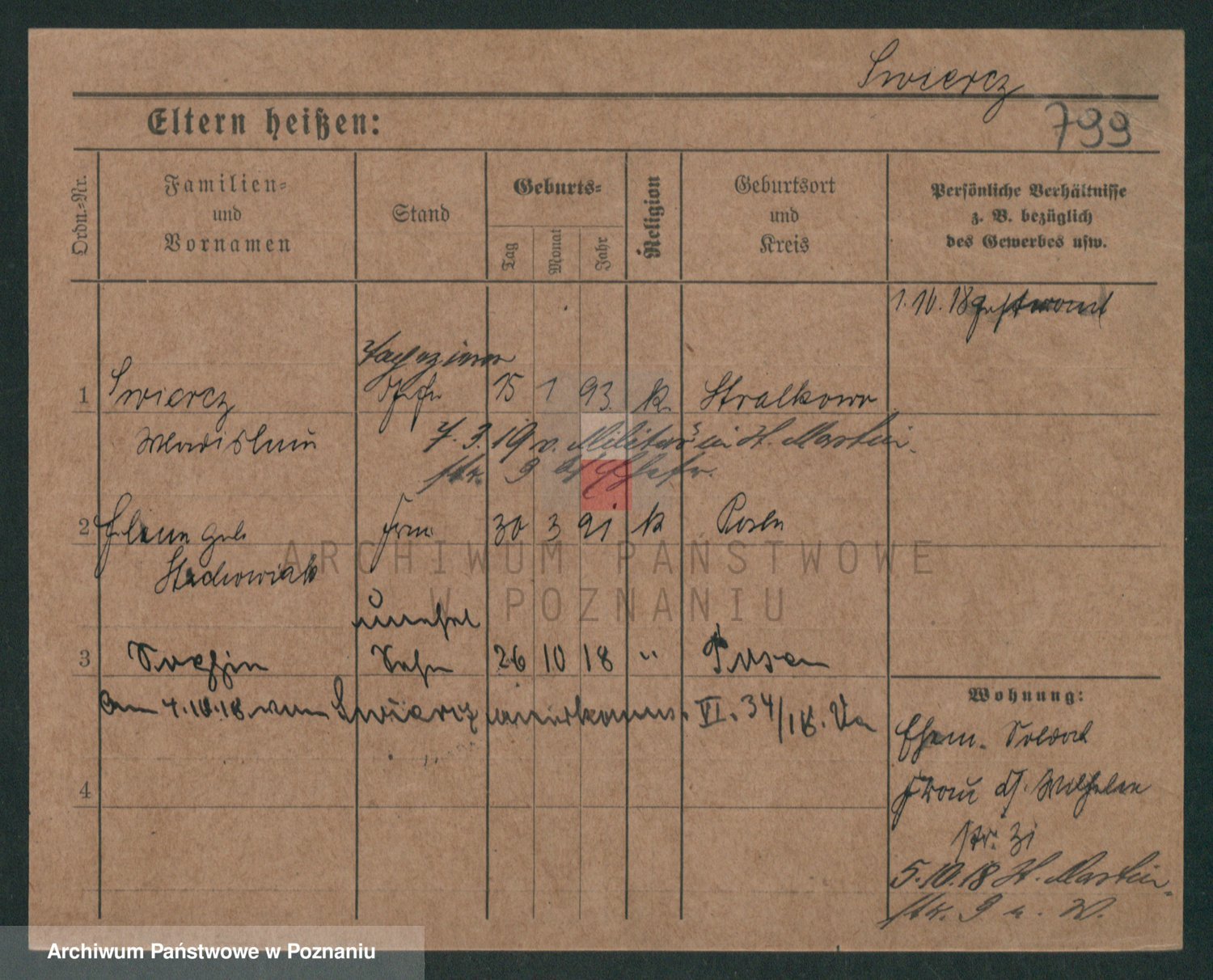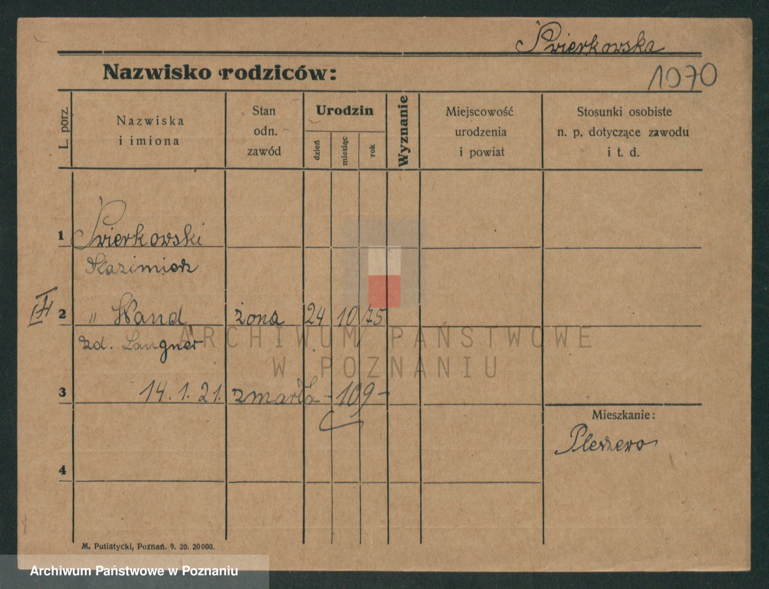 Podgląd karty osobowej dostępny jest po kliknięciu na nazwisko lub ikonkę karty. Można dokonywać powiększenia (ikony na górze) lub przechodzić między kolejnymi skanami (strzałki po bokach).