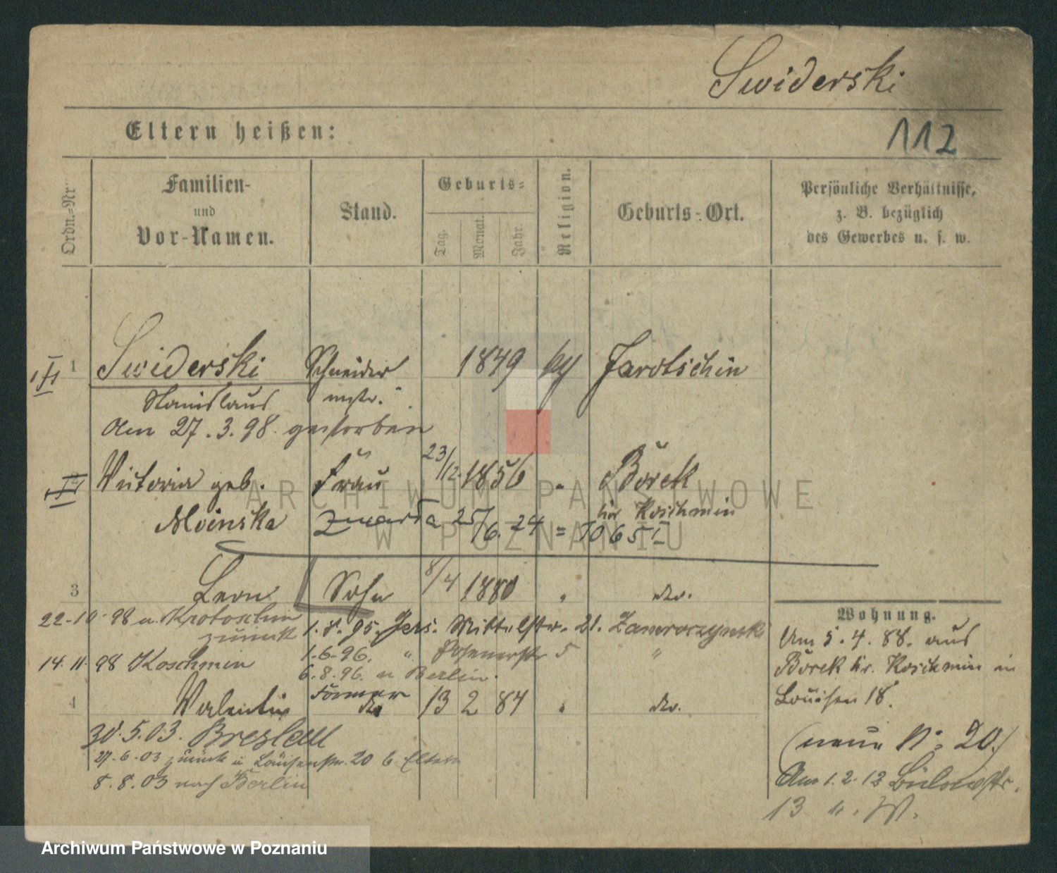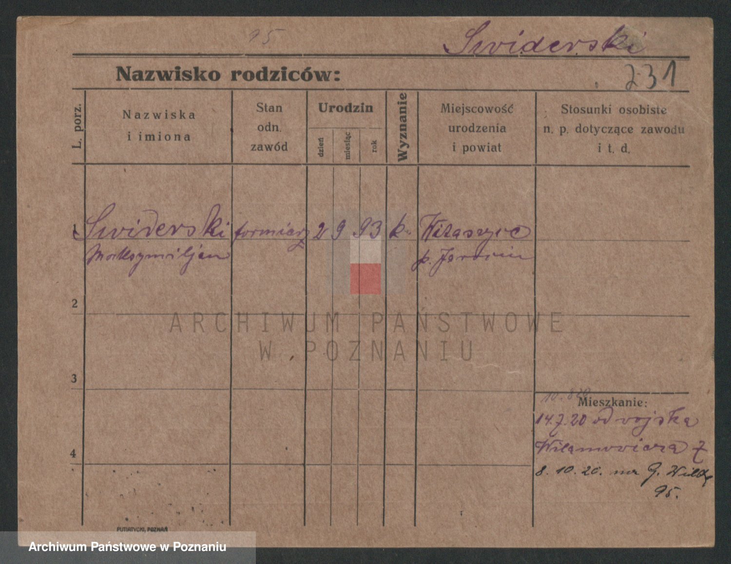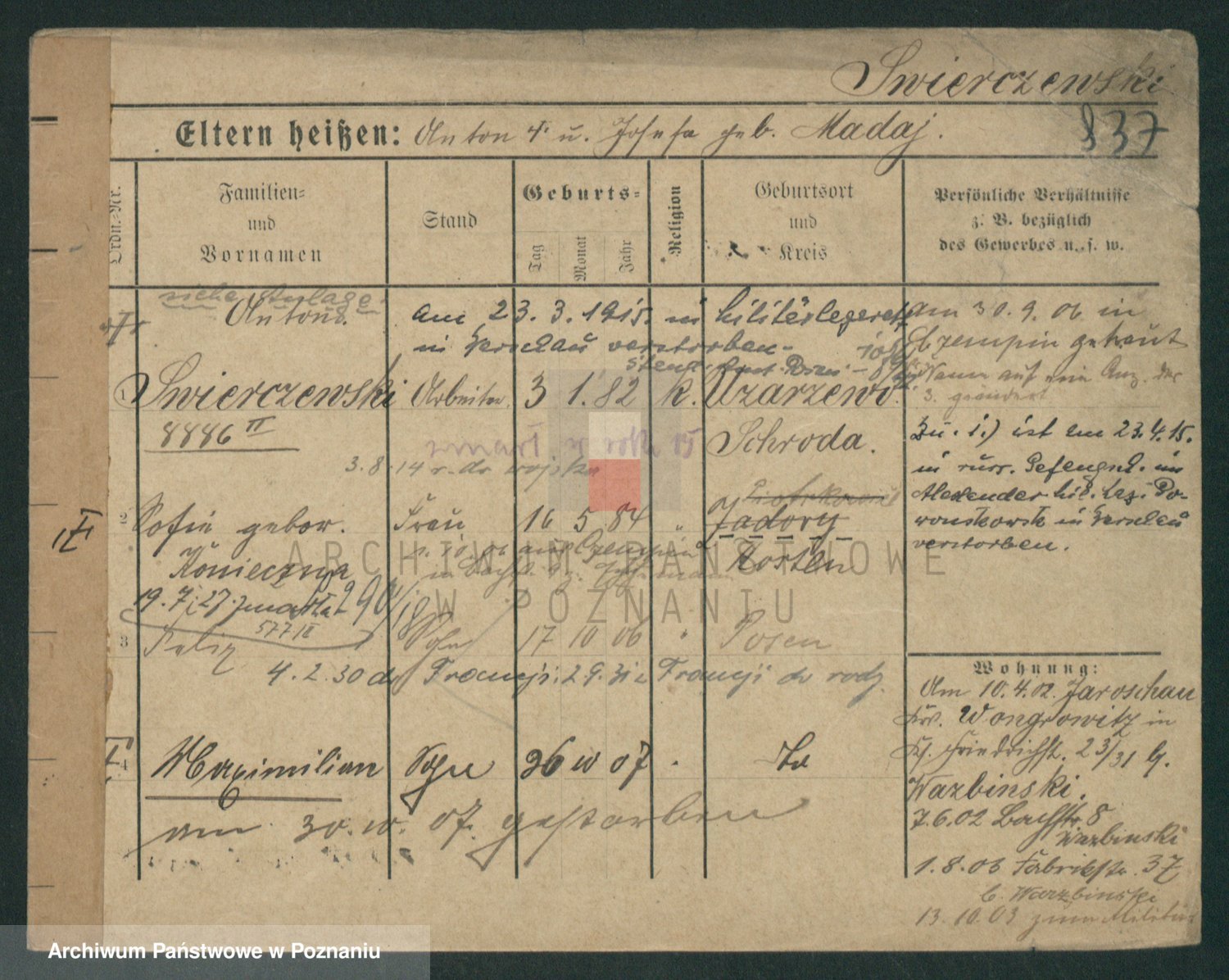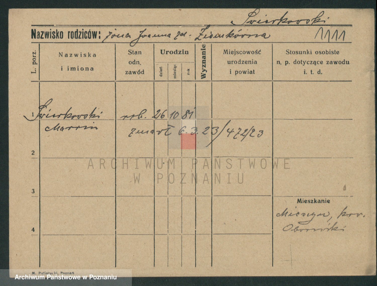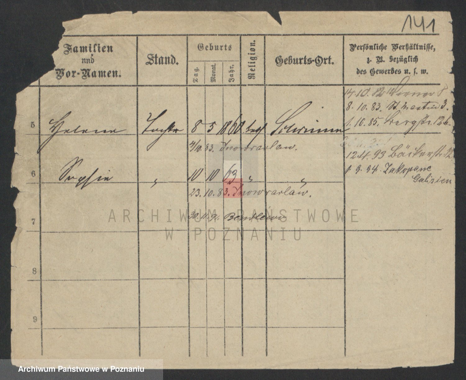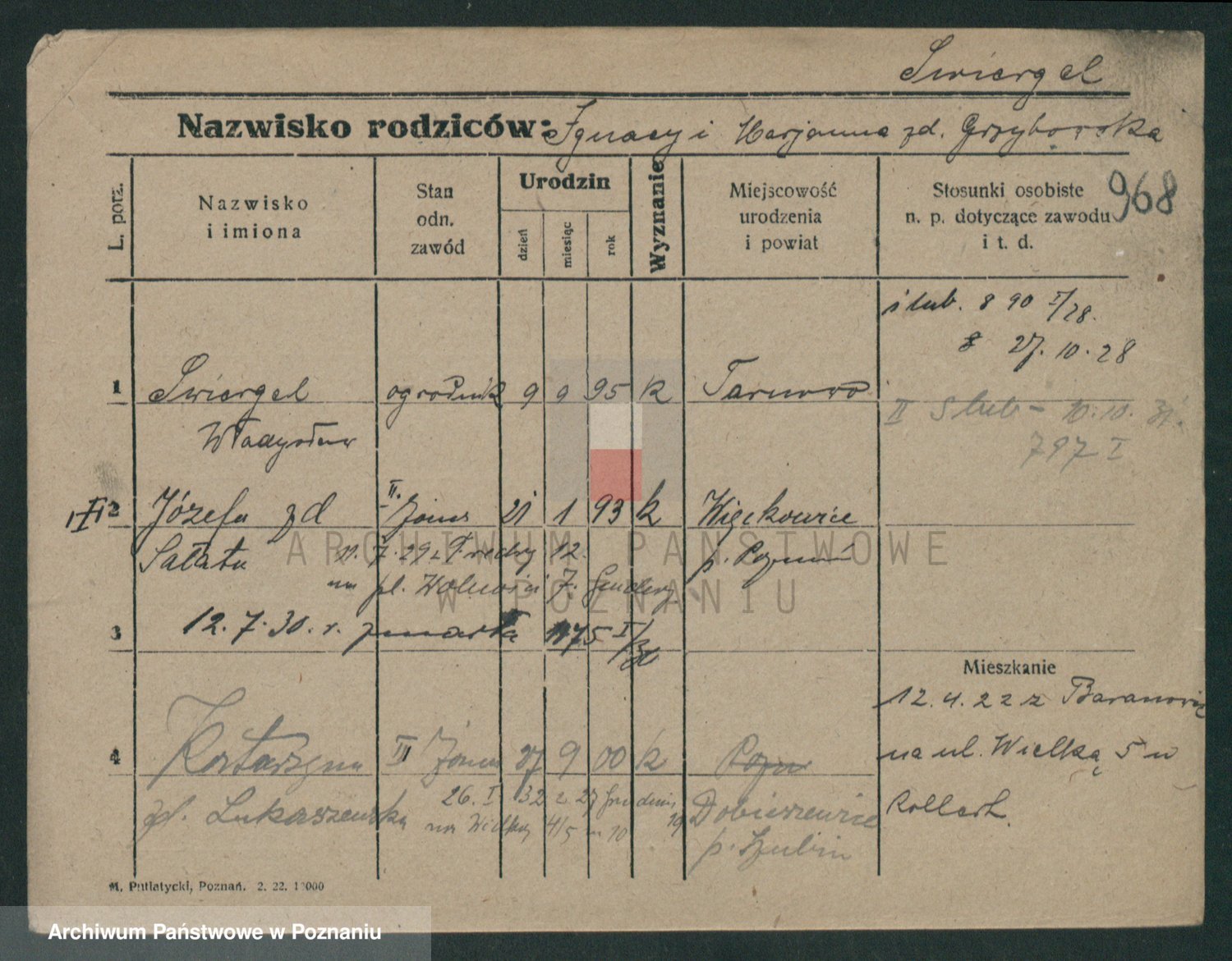 Podgląd karty osobowej dostępny jest po kliknięciu na nazwisko lub ikonkę karty. Można dokonywać powiększenia (ikony na górze) lub przechodzić między kolejnymi skanami (strzałki po bokach).