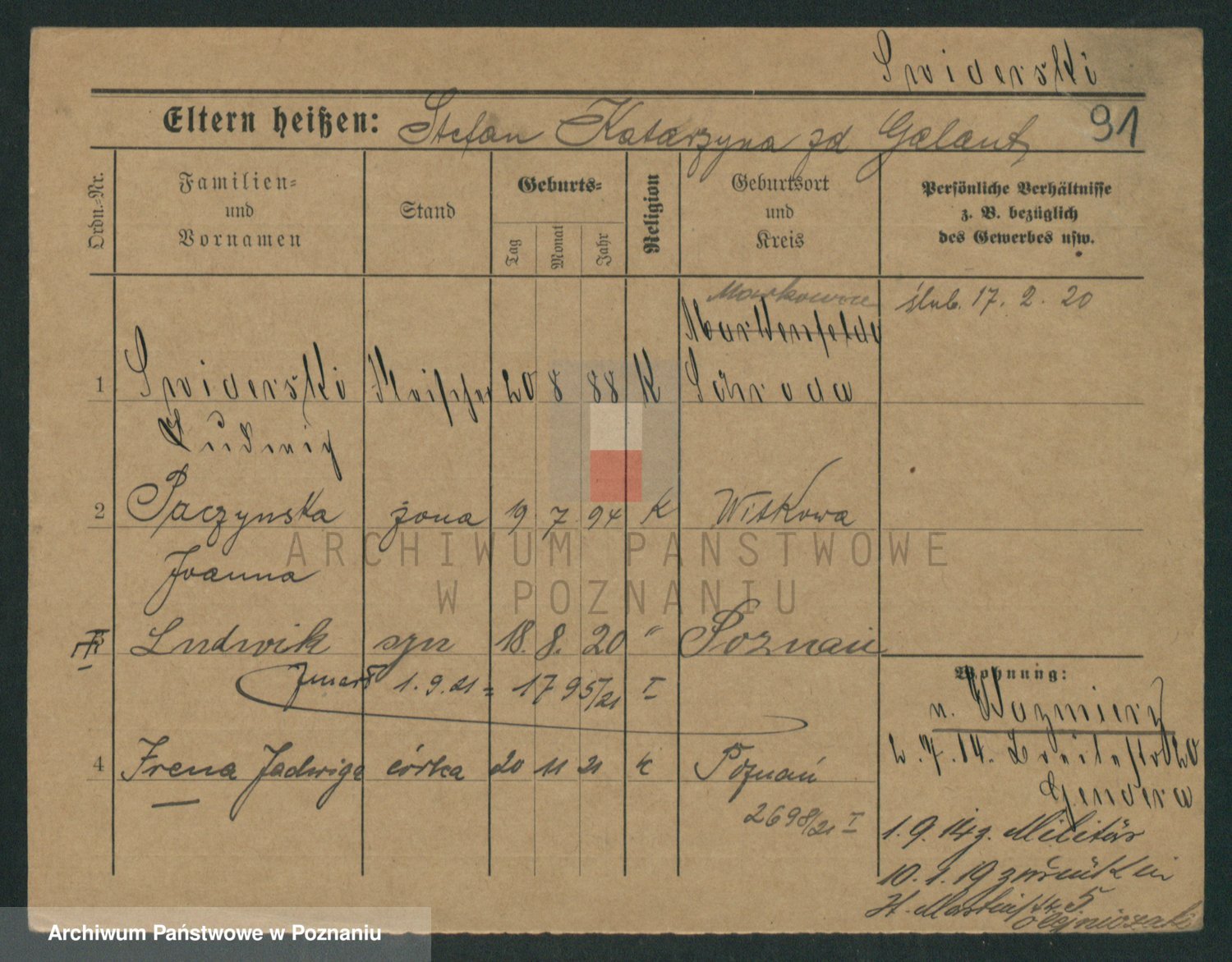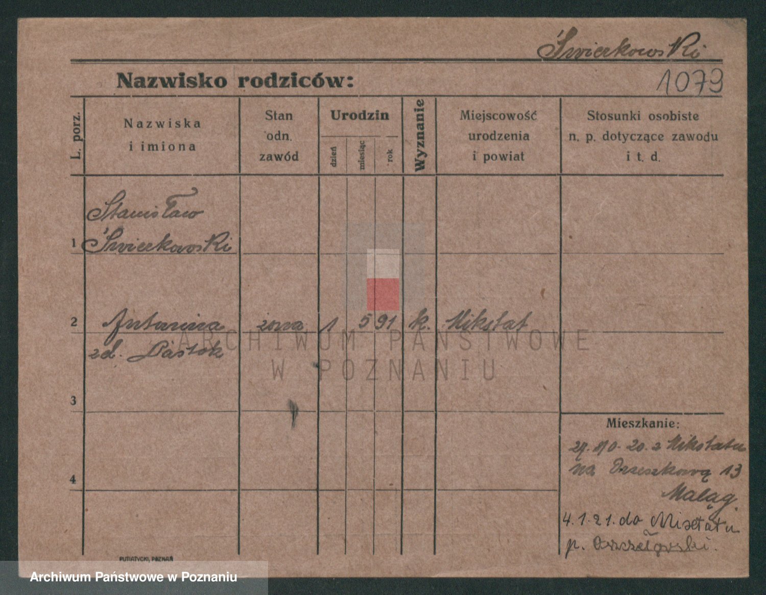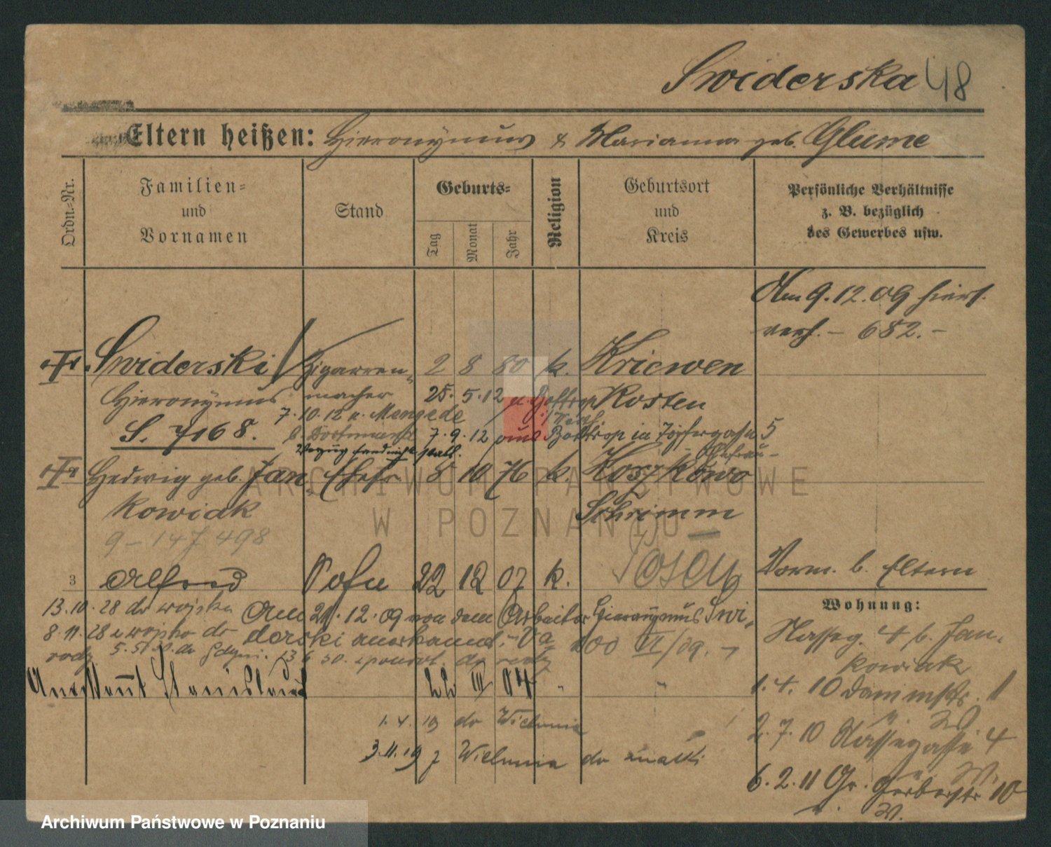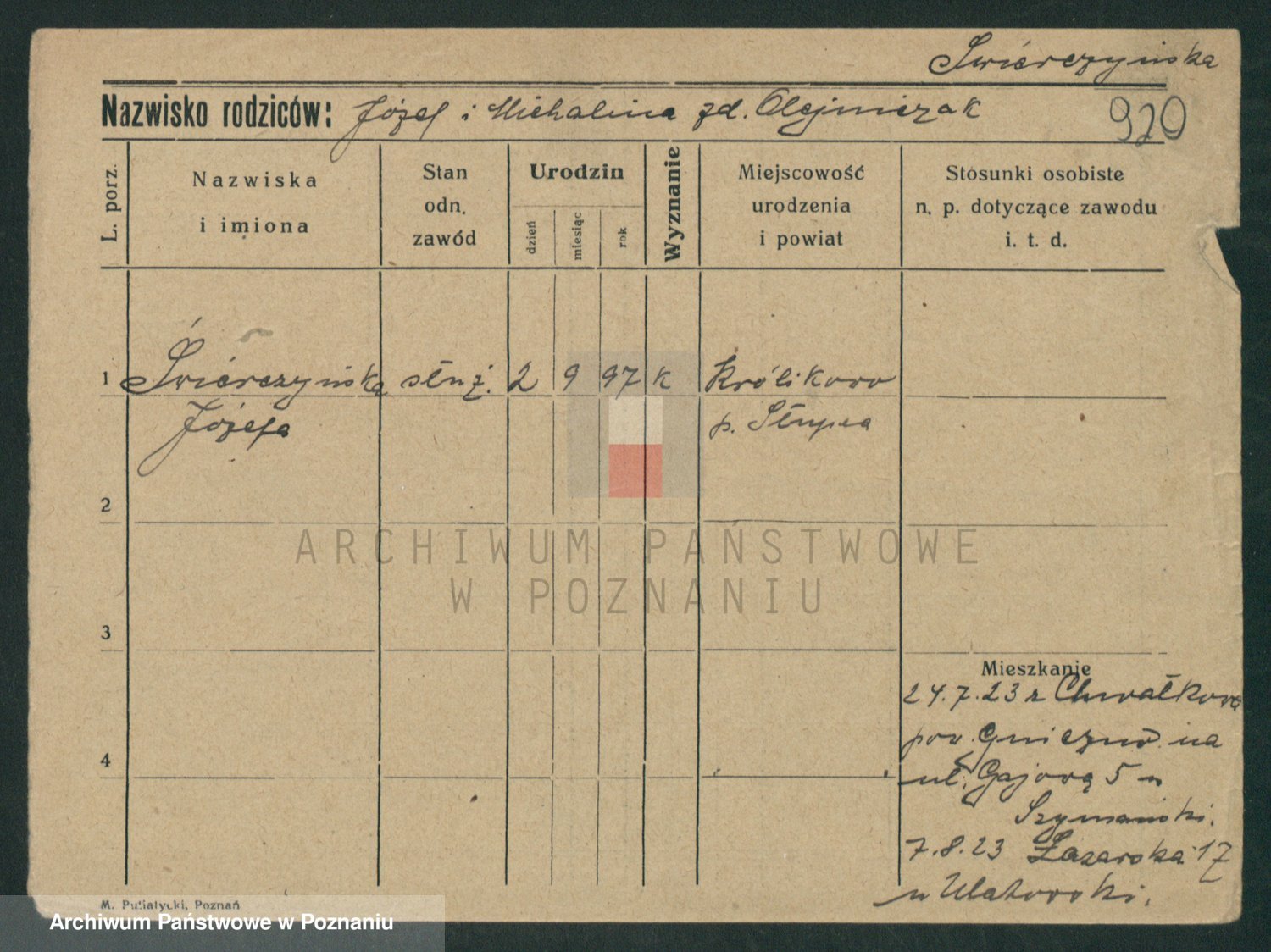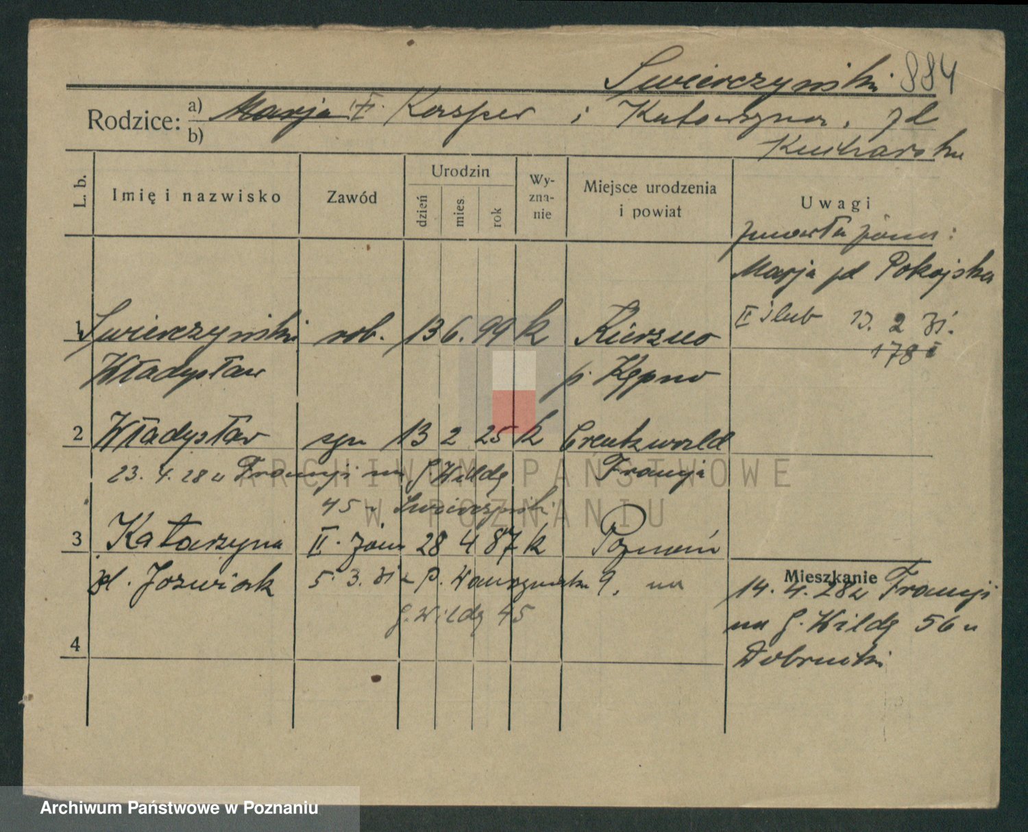 Podgląd karty osobowej dostępny jest po kliknięciu na nazwisko lub ikonkę karty. Można dokonywać powiększenia (ikony na górze) lub przechodzić między kolejnymi skanami (strzałki po bokach).