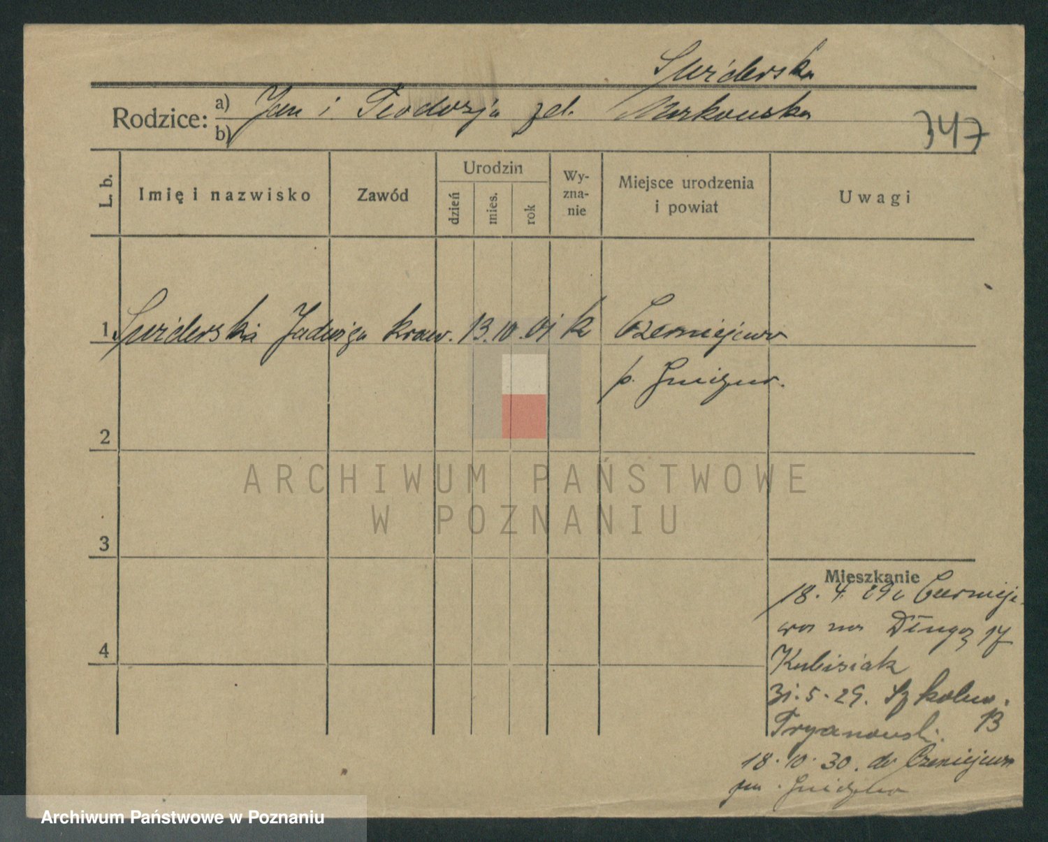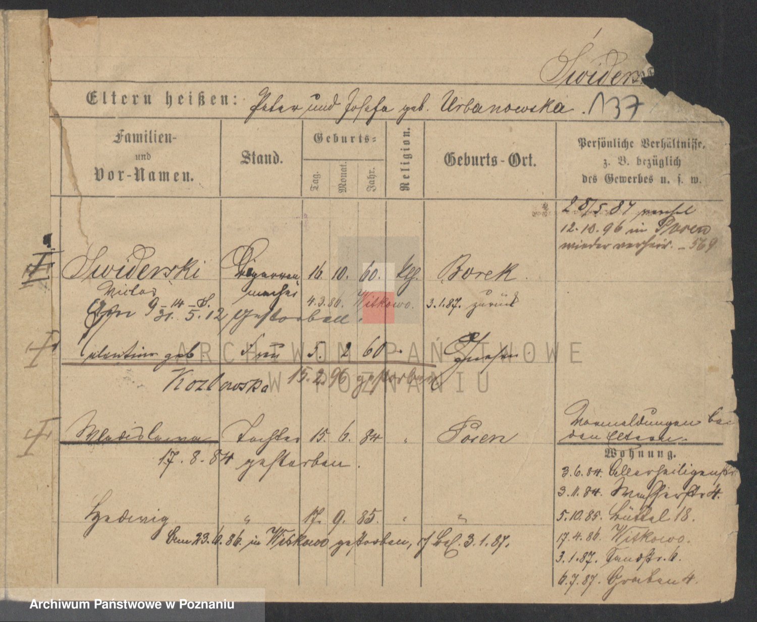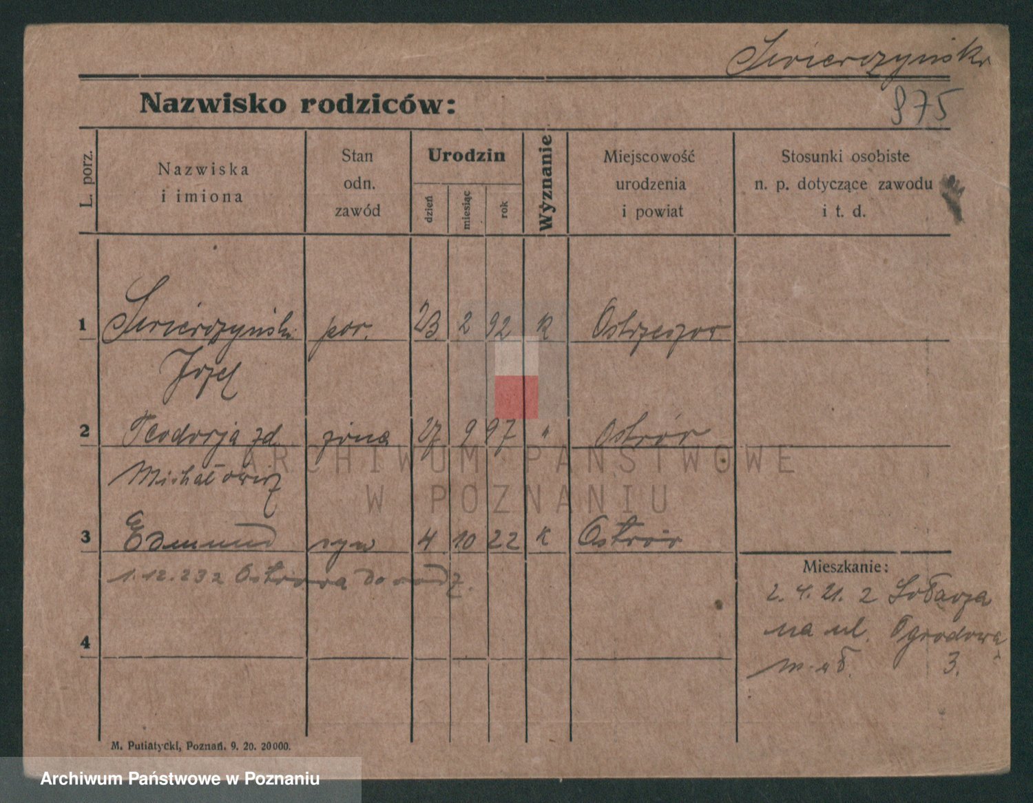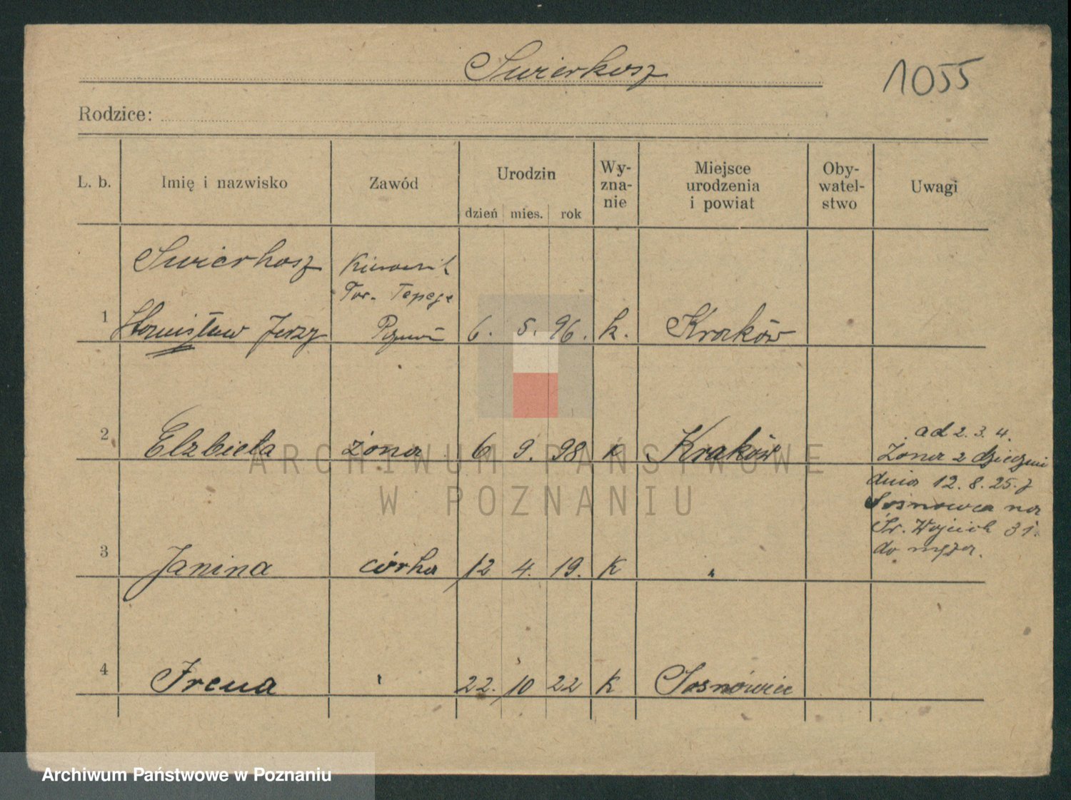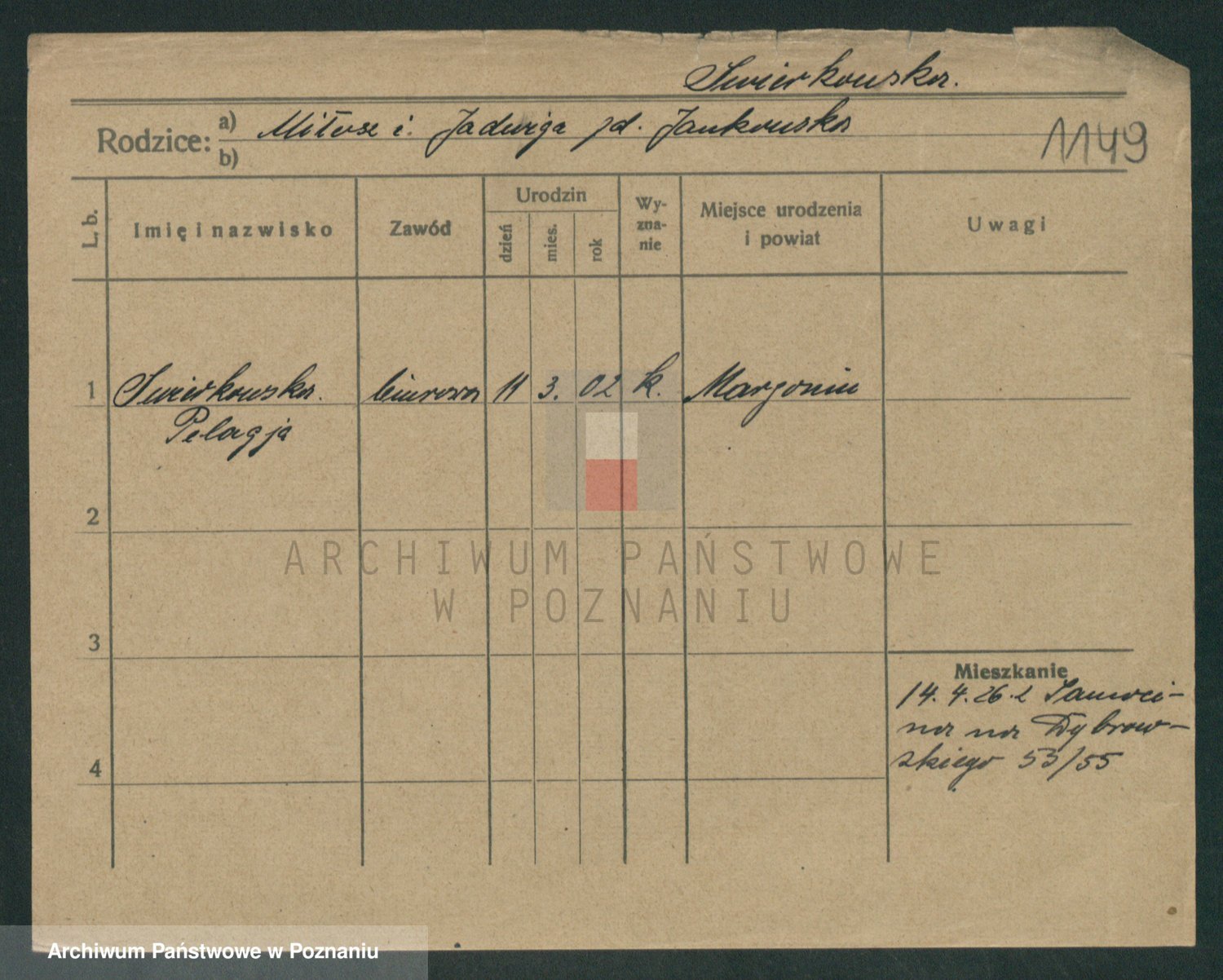 Podgląd karty osobowej dostępny jest po kliknięciu na nazwisko lub ikonkę karty. Można dokonywać powiększenia (ikony na górze) lub przechodzić między kolejnymi skanami (strzałki po bokach).
