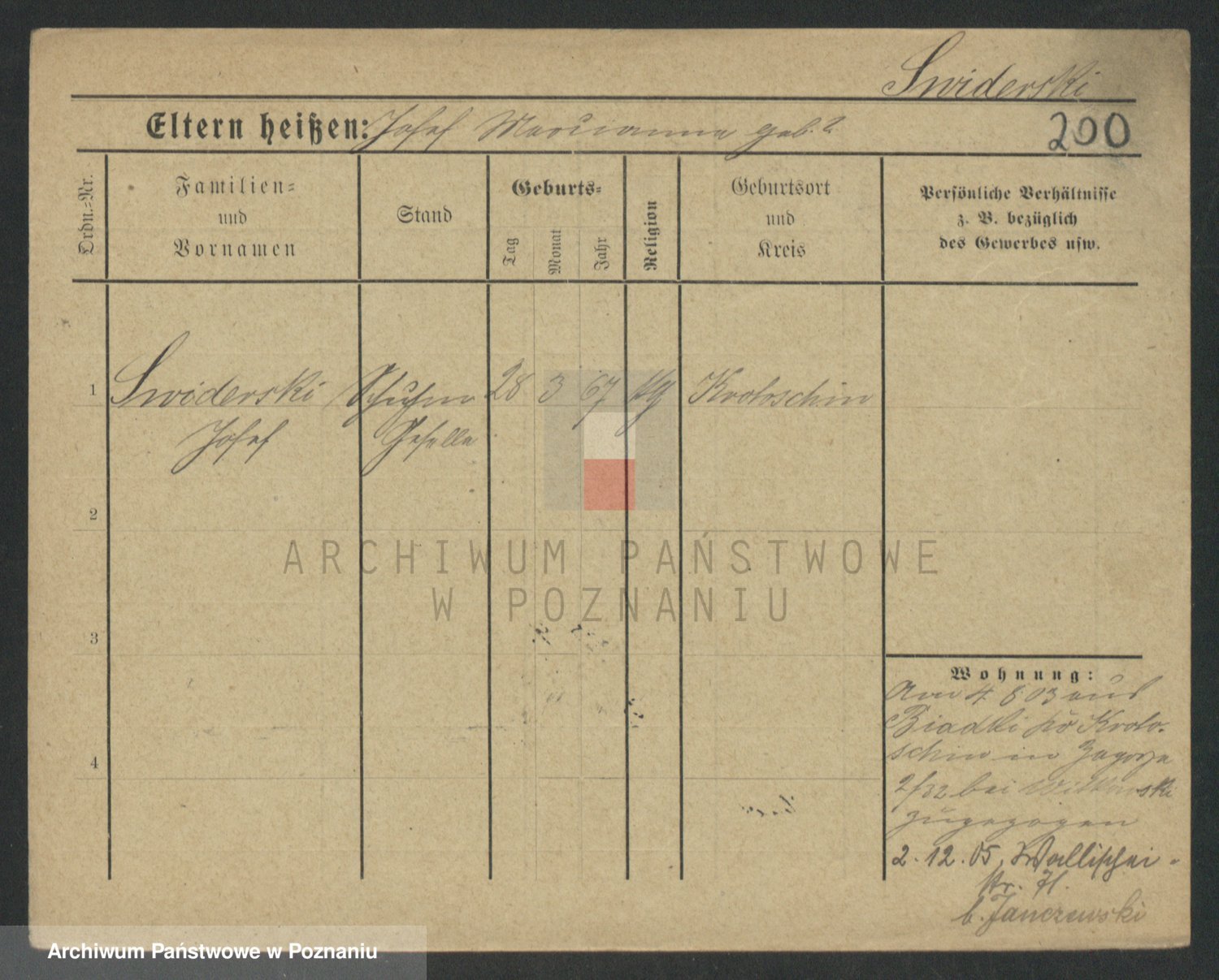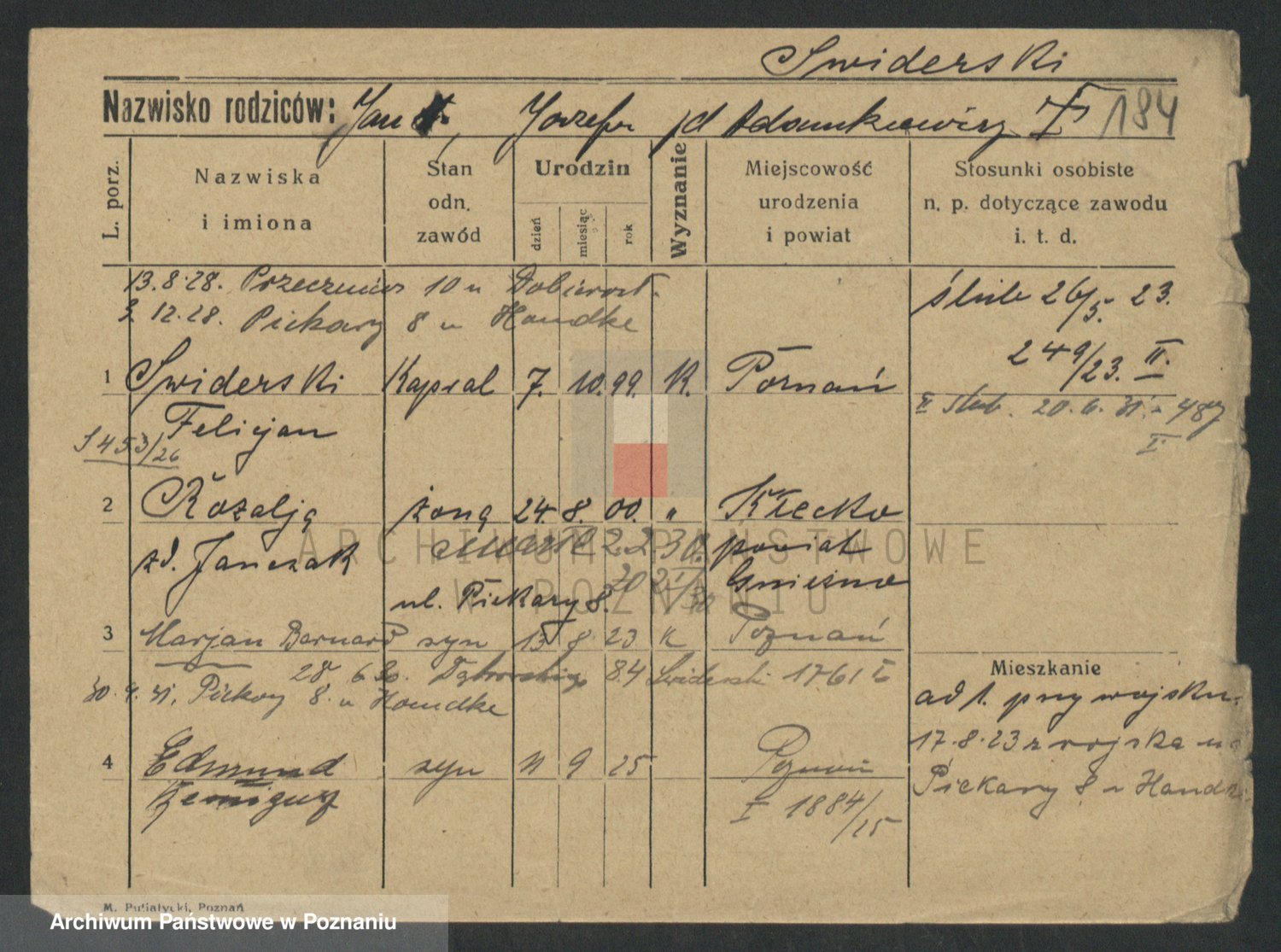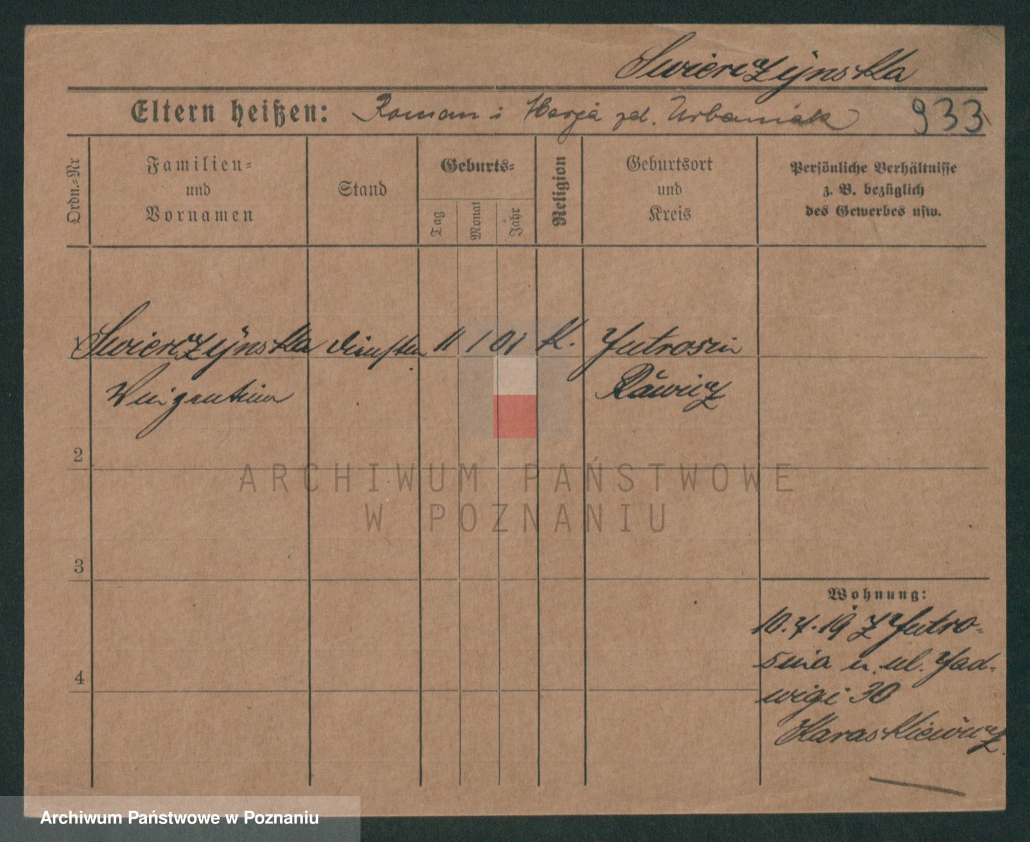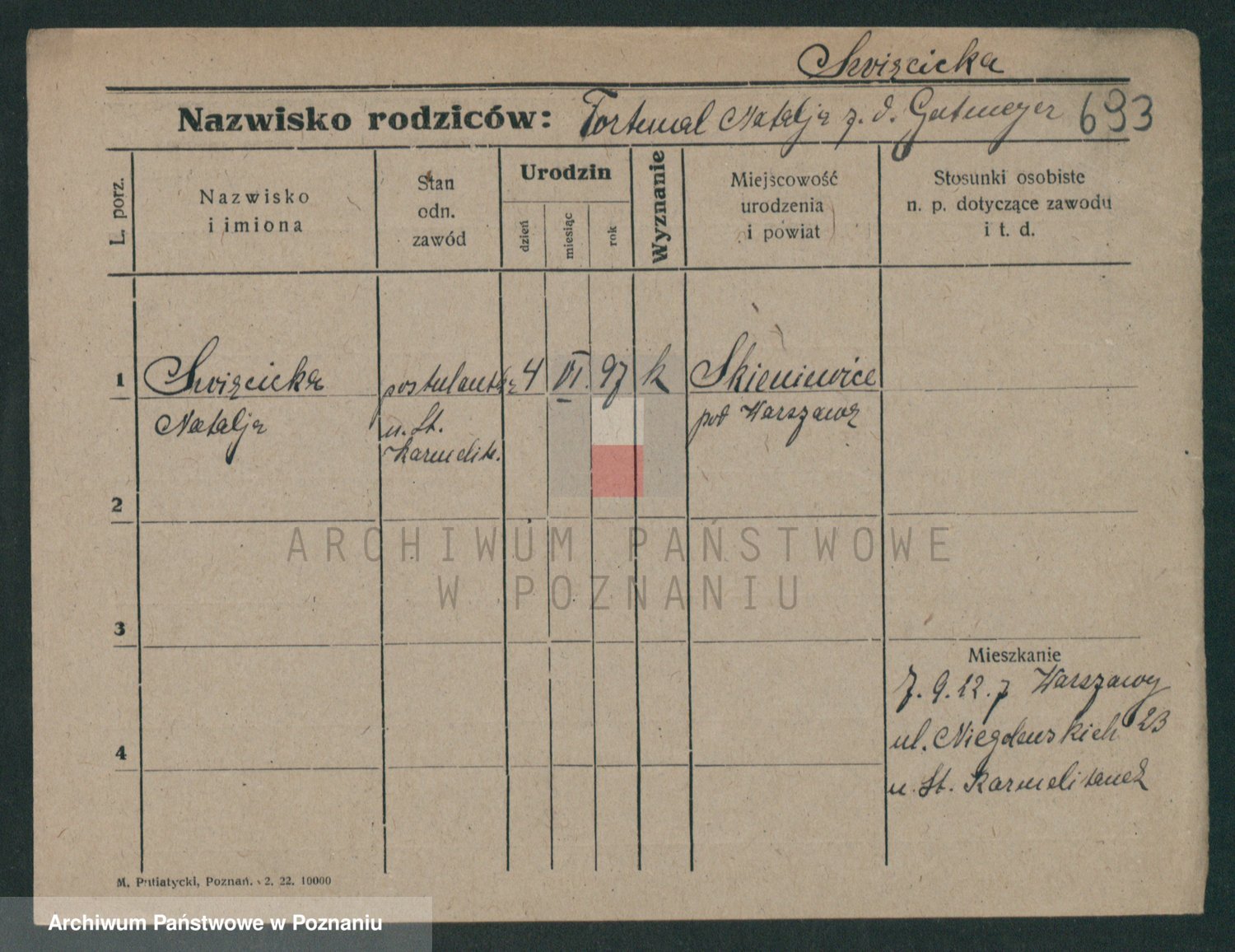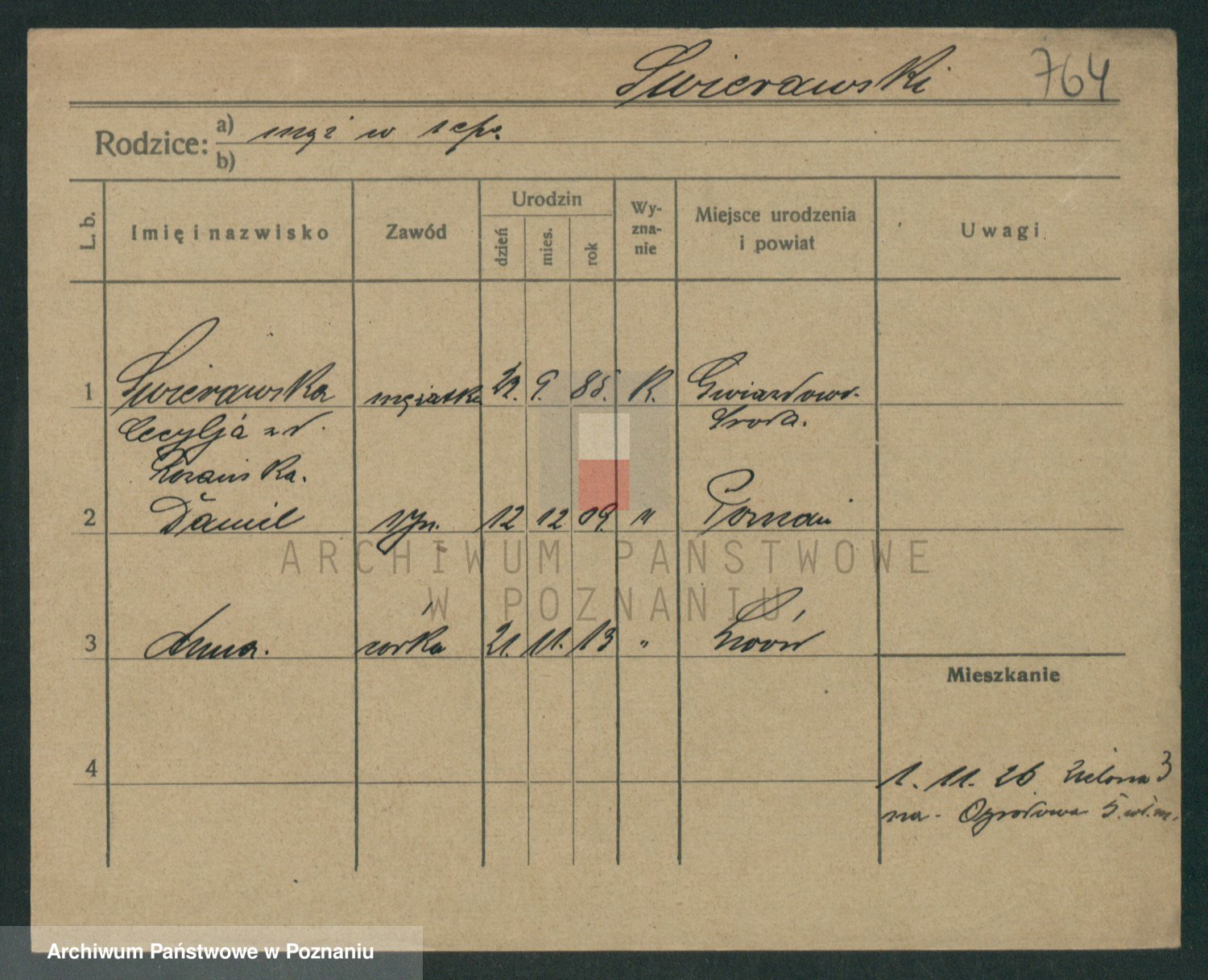 Podgląd karty osobowej dostępny jest po kliknięciu na nazwisko lub ikonkę karty. Można dokonywać powiększenia (ikony na górze) lub przechodzić między kolejnymi skanami (strzałki po bokach).