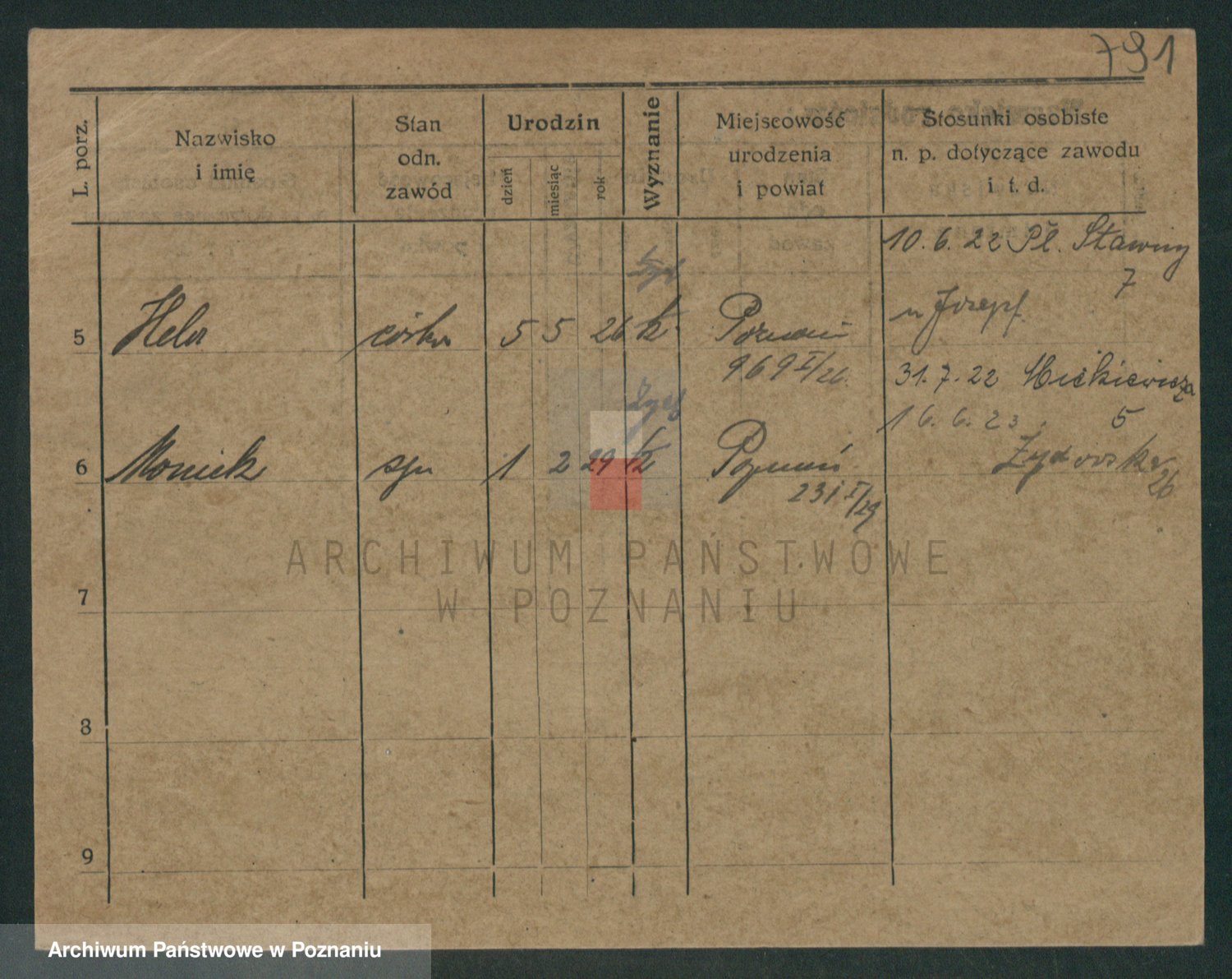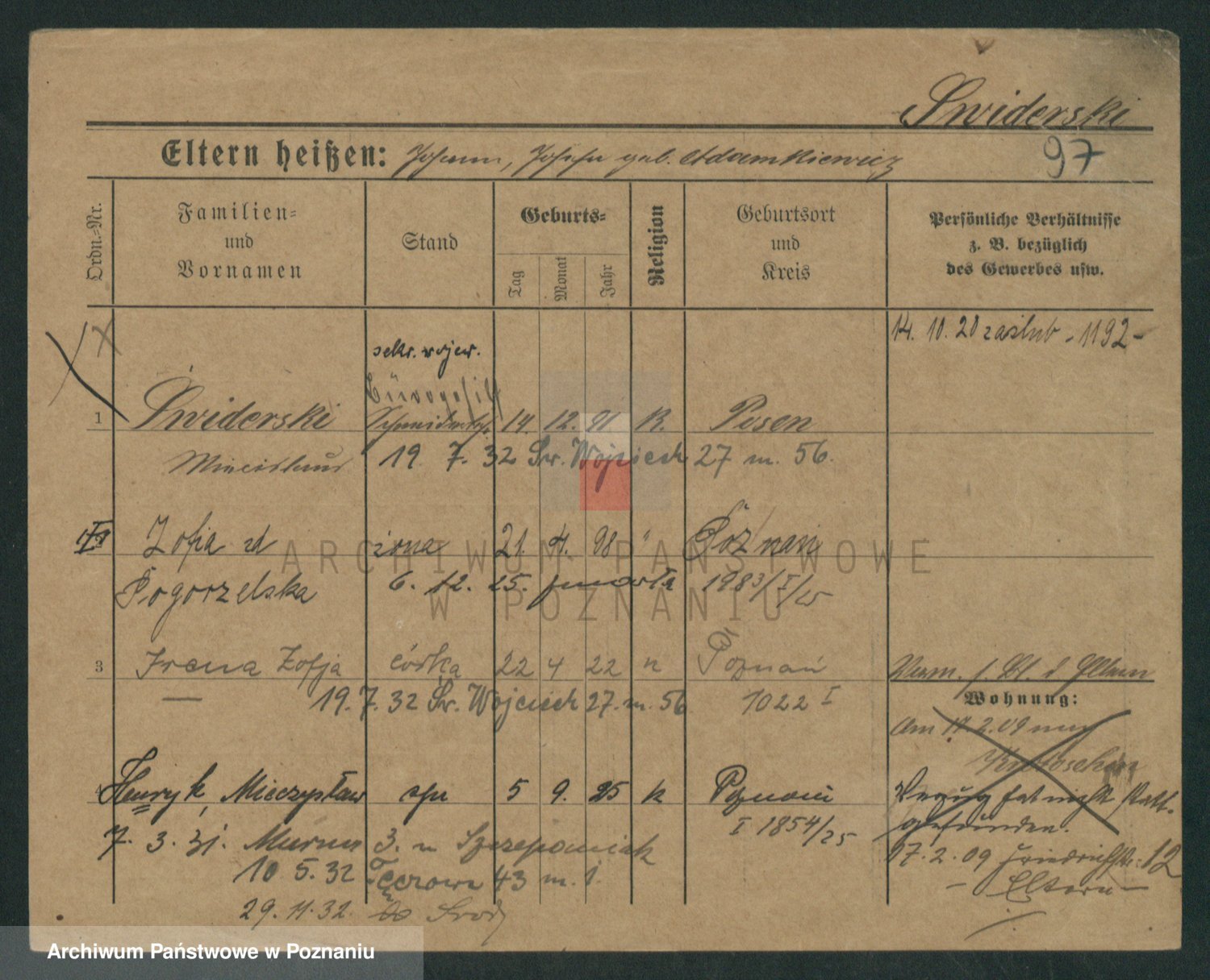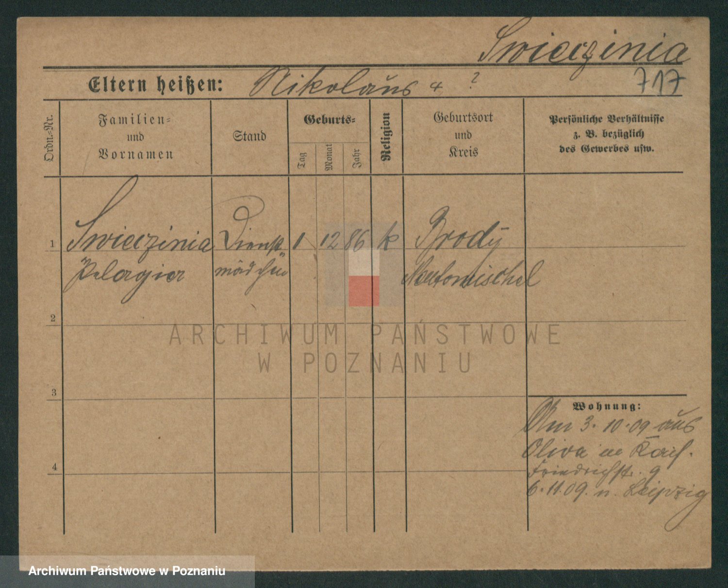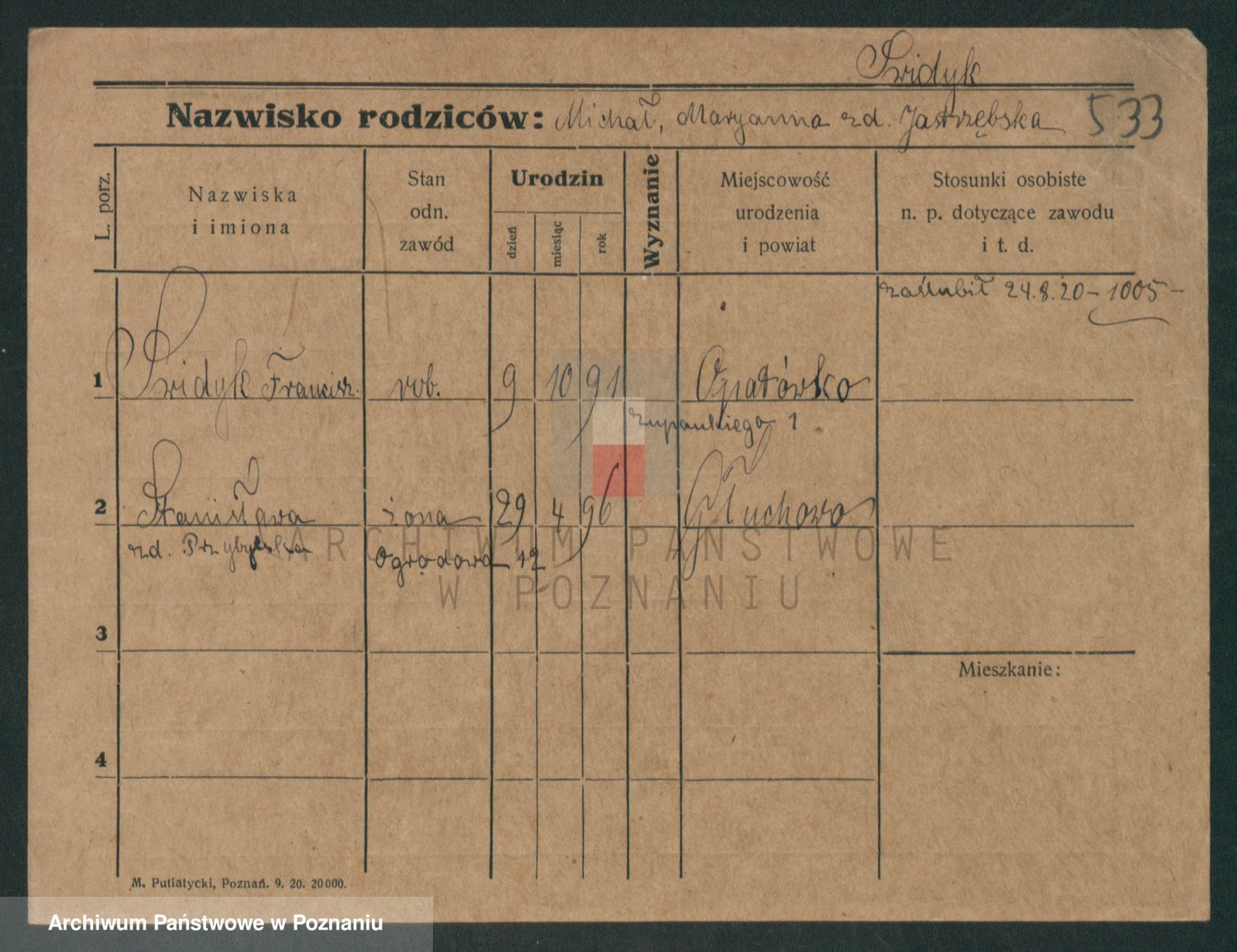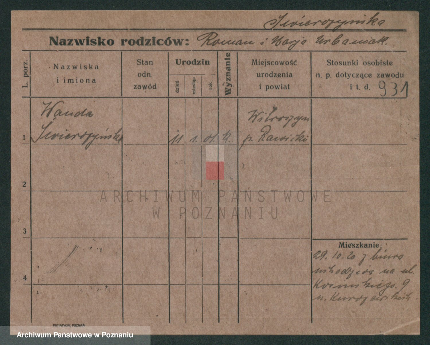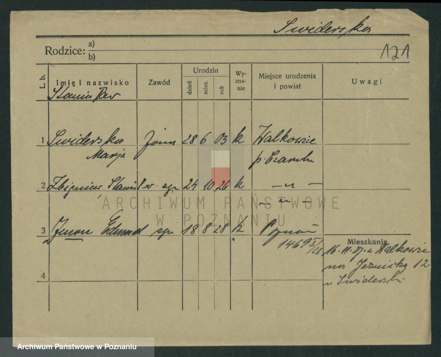 Podgląd karty osobowej dostępny jest po kliknięciu na nazwisko lub ikonkę karty. Można dokonywać powiększenia (ikony na górze) lub przechodzić między kolejnymi skanami (strzałki po bokach).