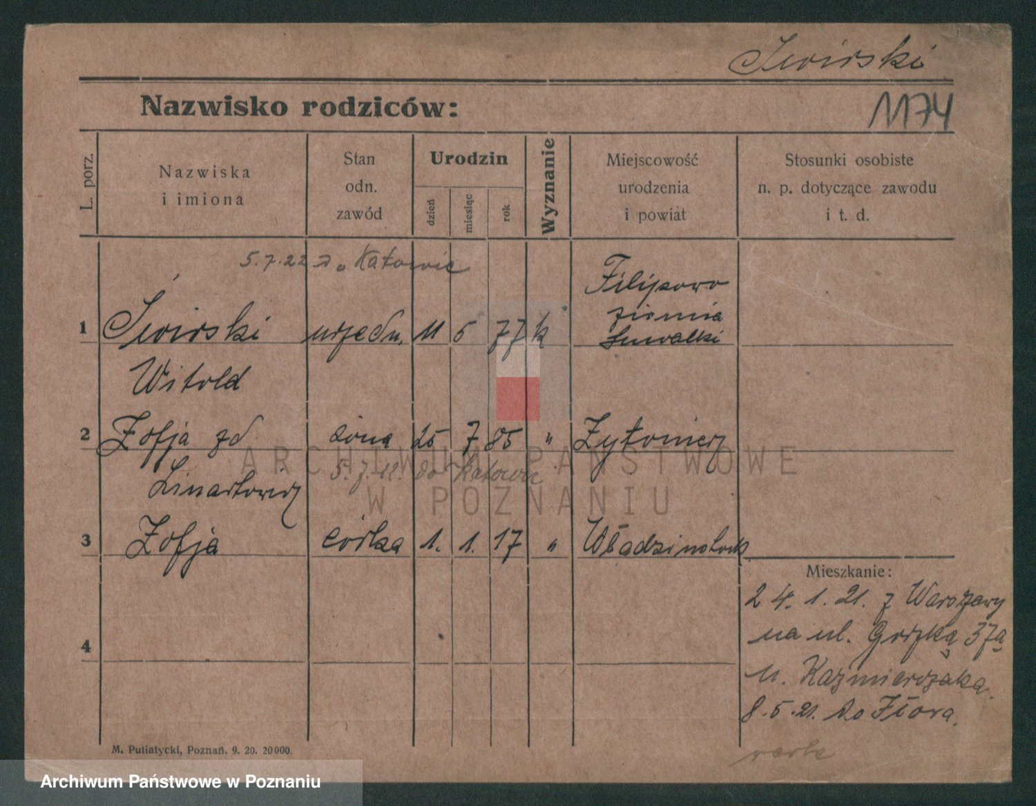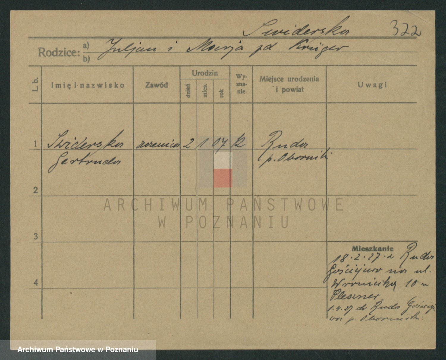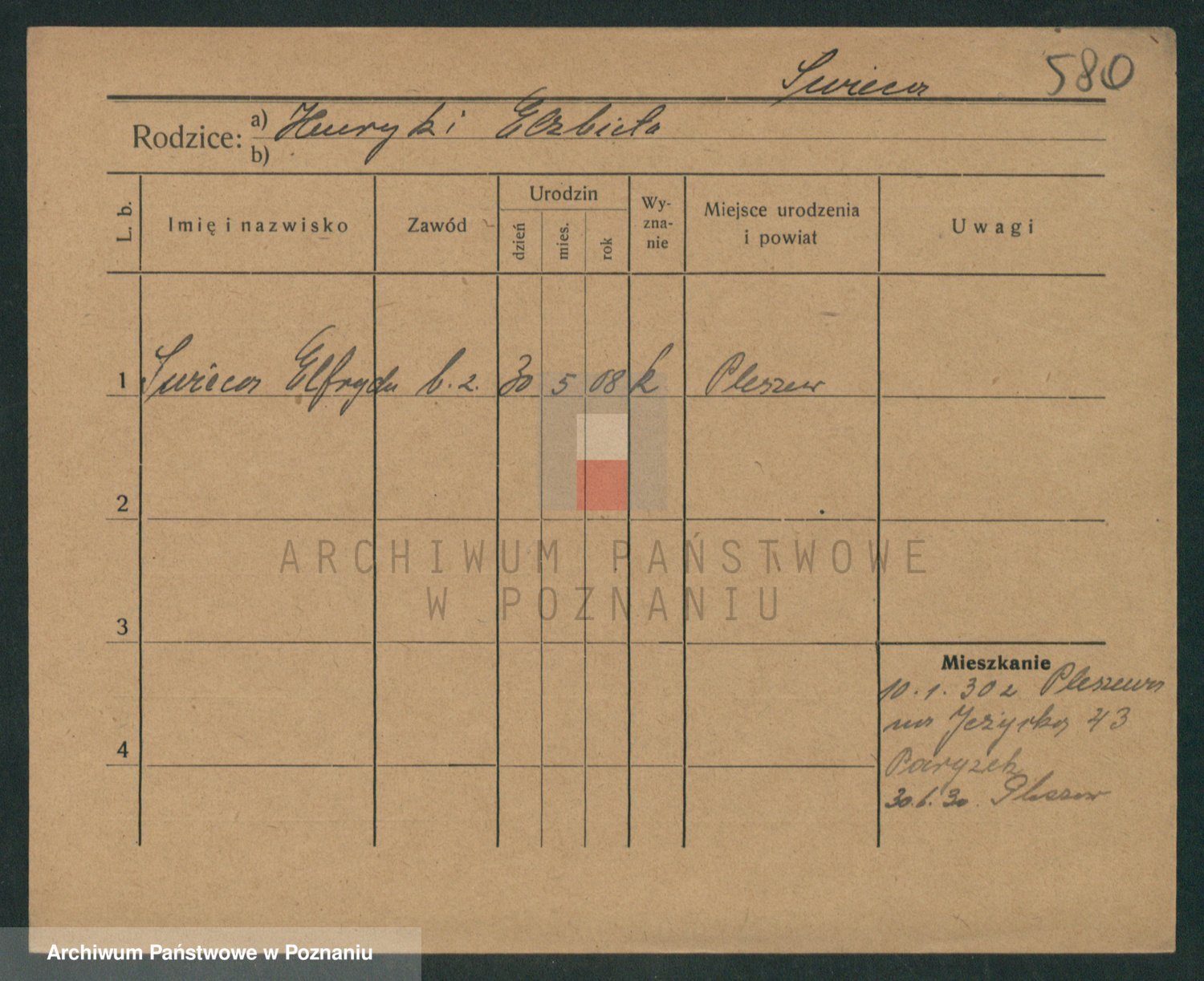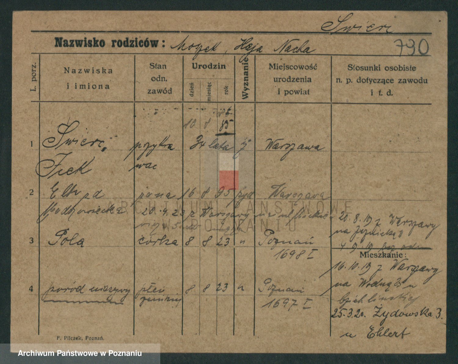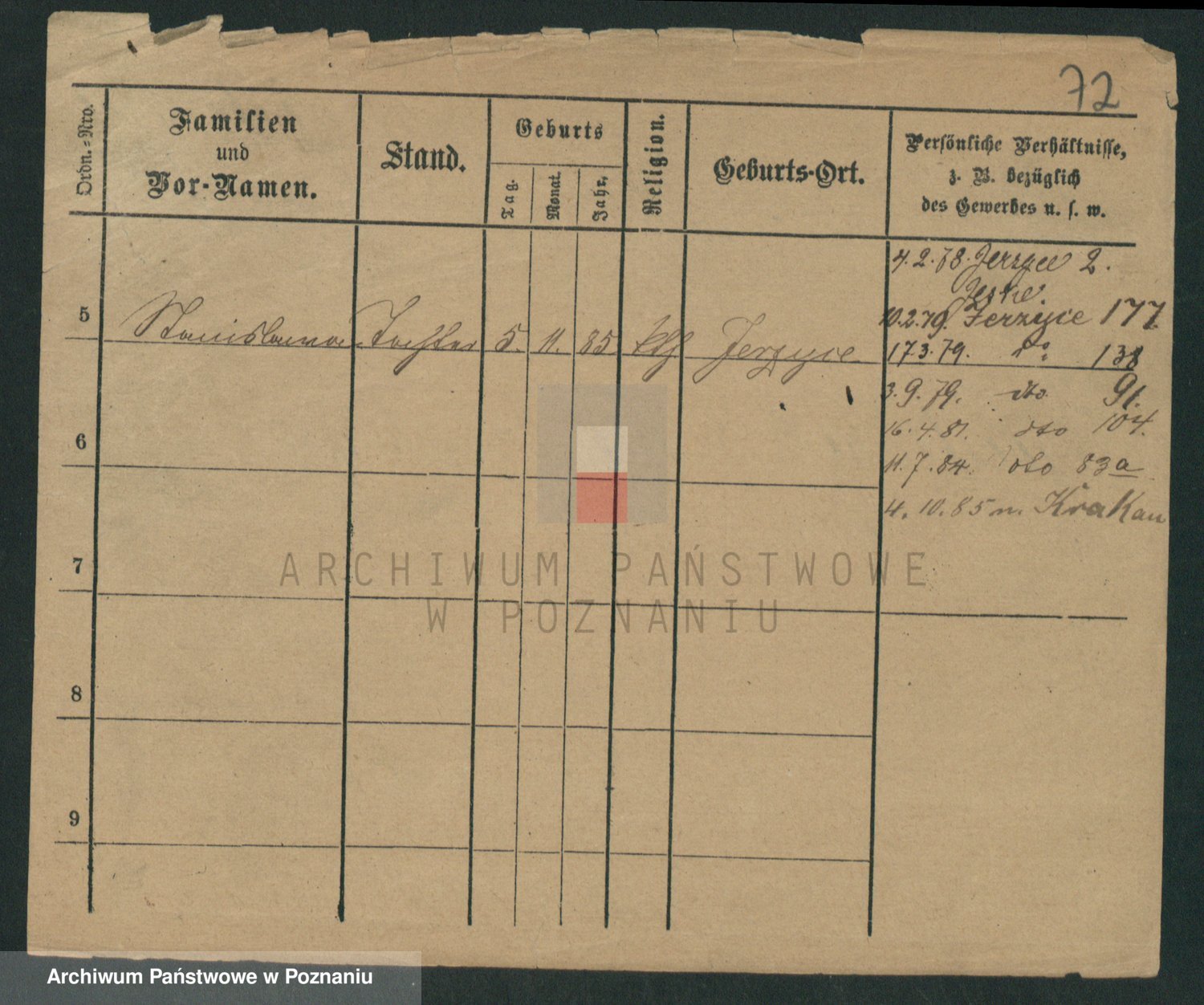 Podgląd karty osobowej dostępny jest po kliknięciu na nazwisko lub ikonkę karty. Można dokonywać powiększenia (ikony na górze) lub przechodzić między kolejnymi skanami (strzałki po bokach).