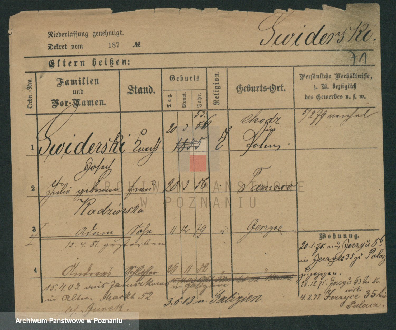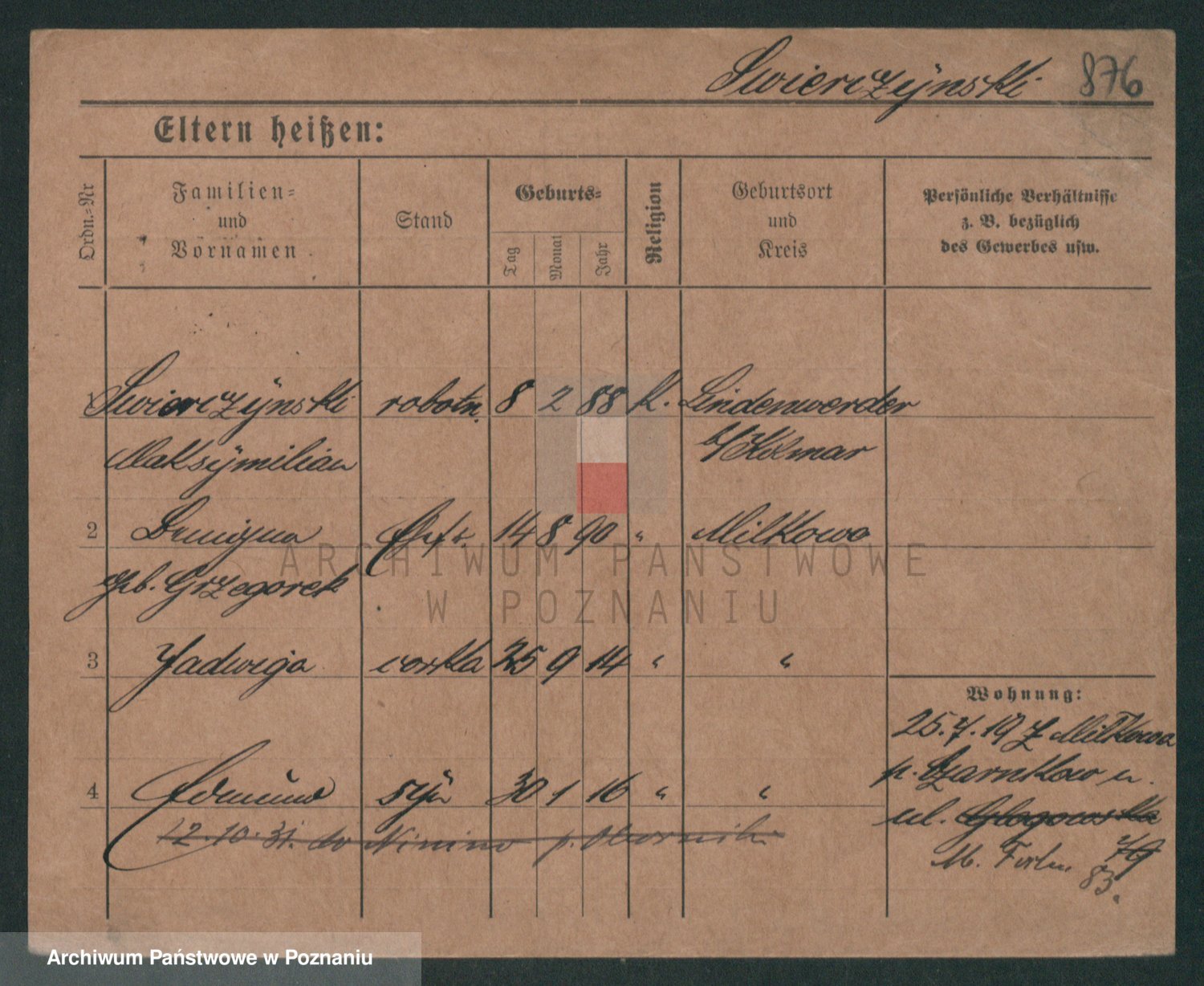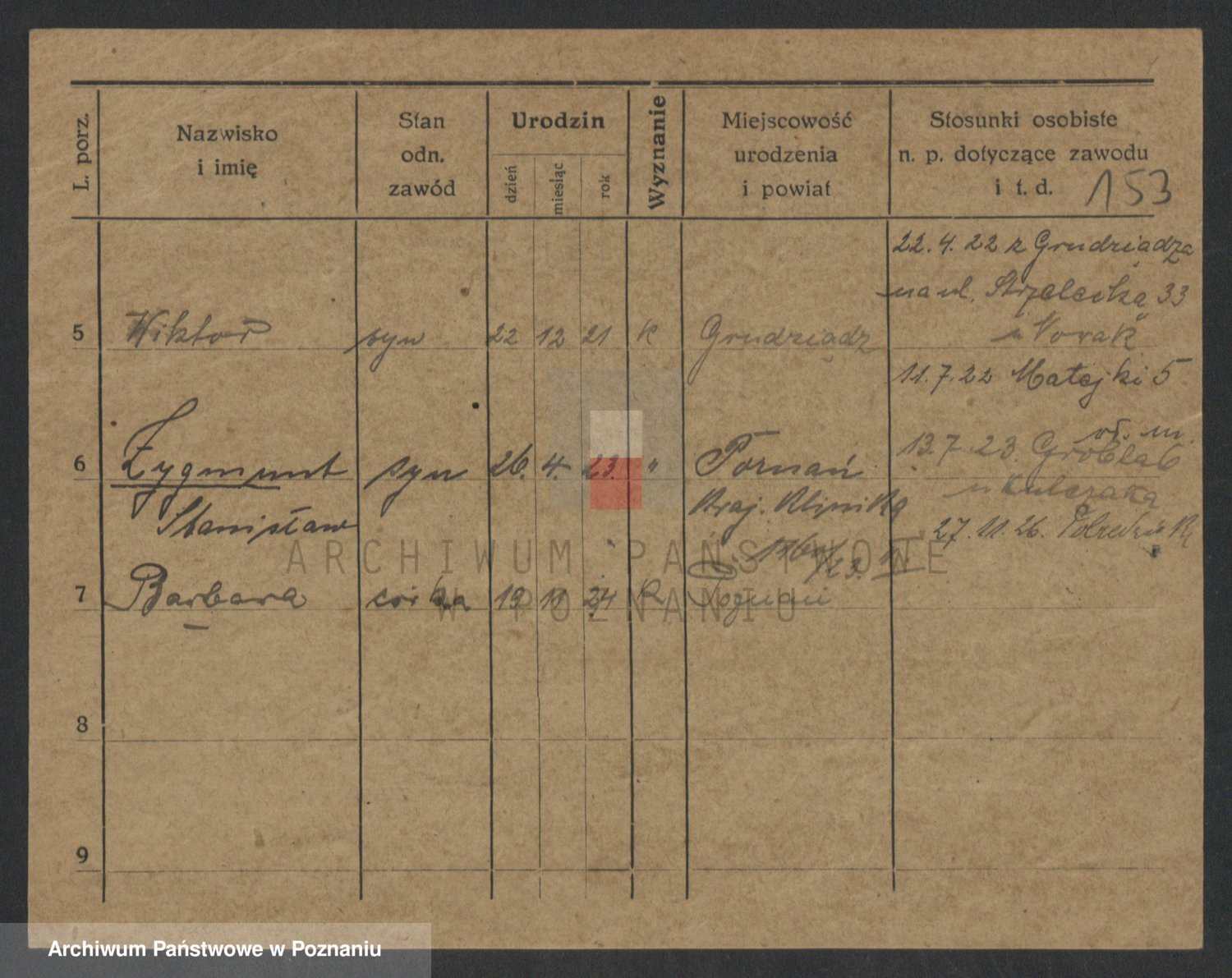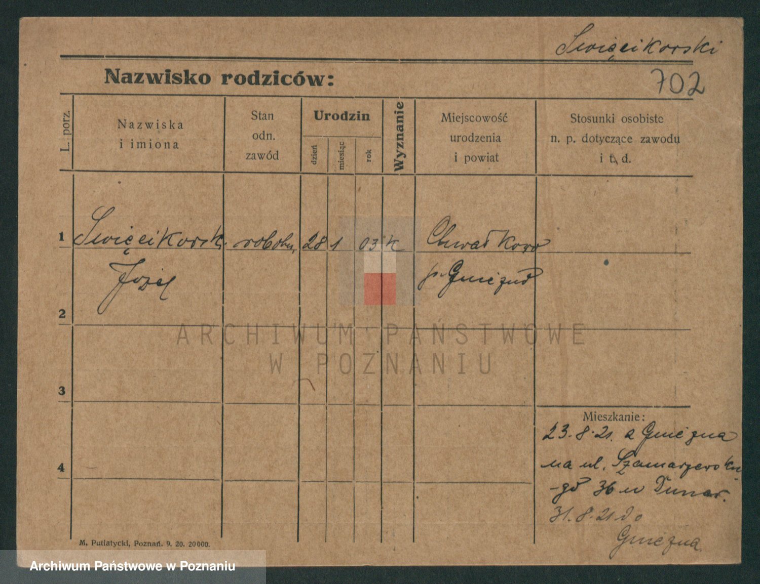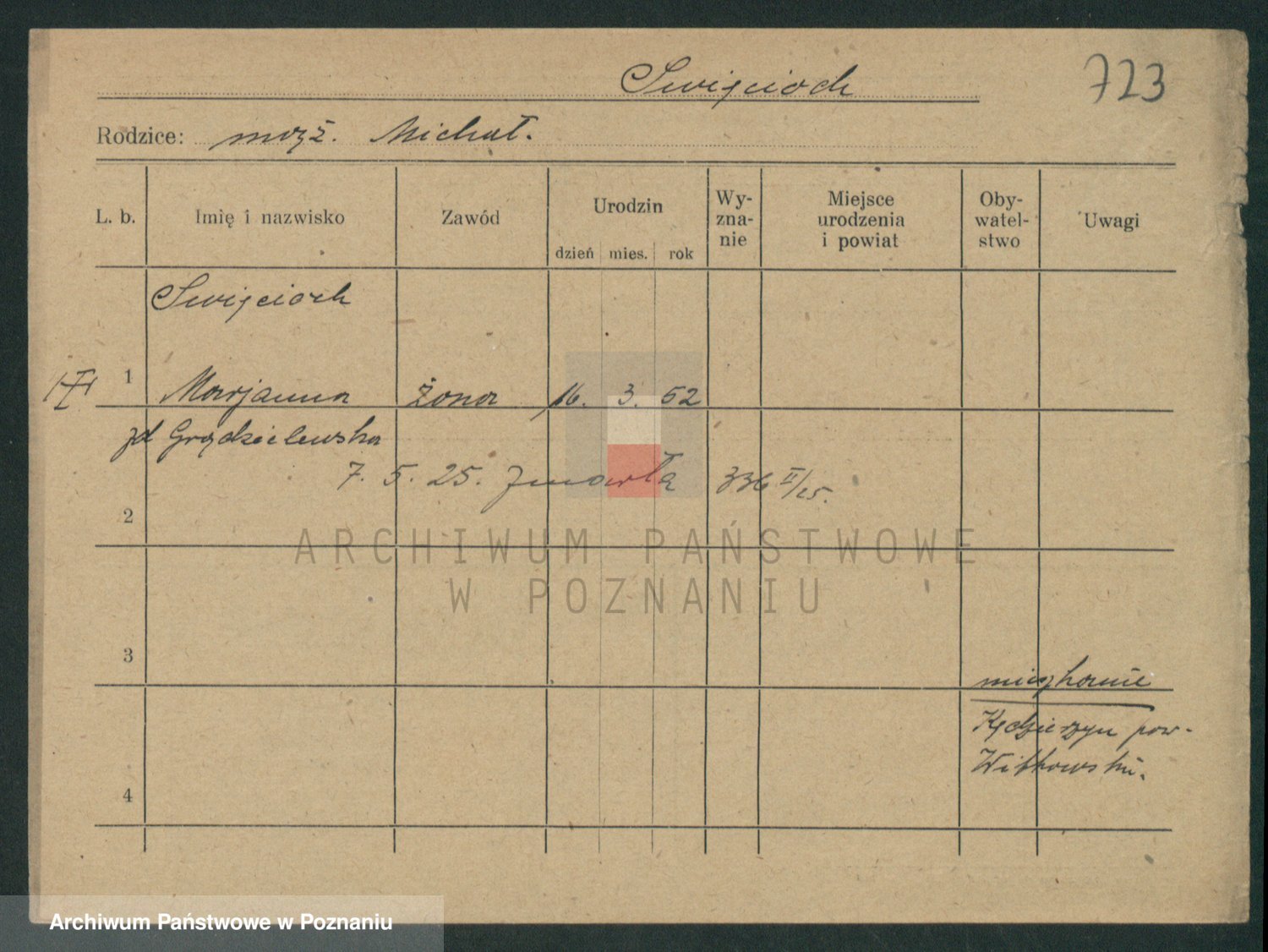 Podgląd karty osobowej dostępny jest po kliknięciu na nazwisko lub ikonkę karty. Można dokonywać powiększenia (ikony na górze) lub przechodzić między kolejnymi skanami (strzałki po bokach).
