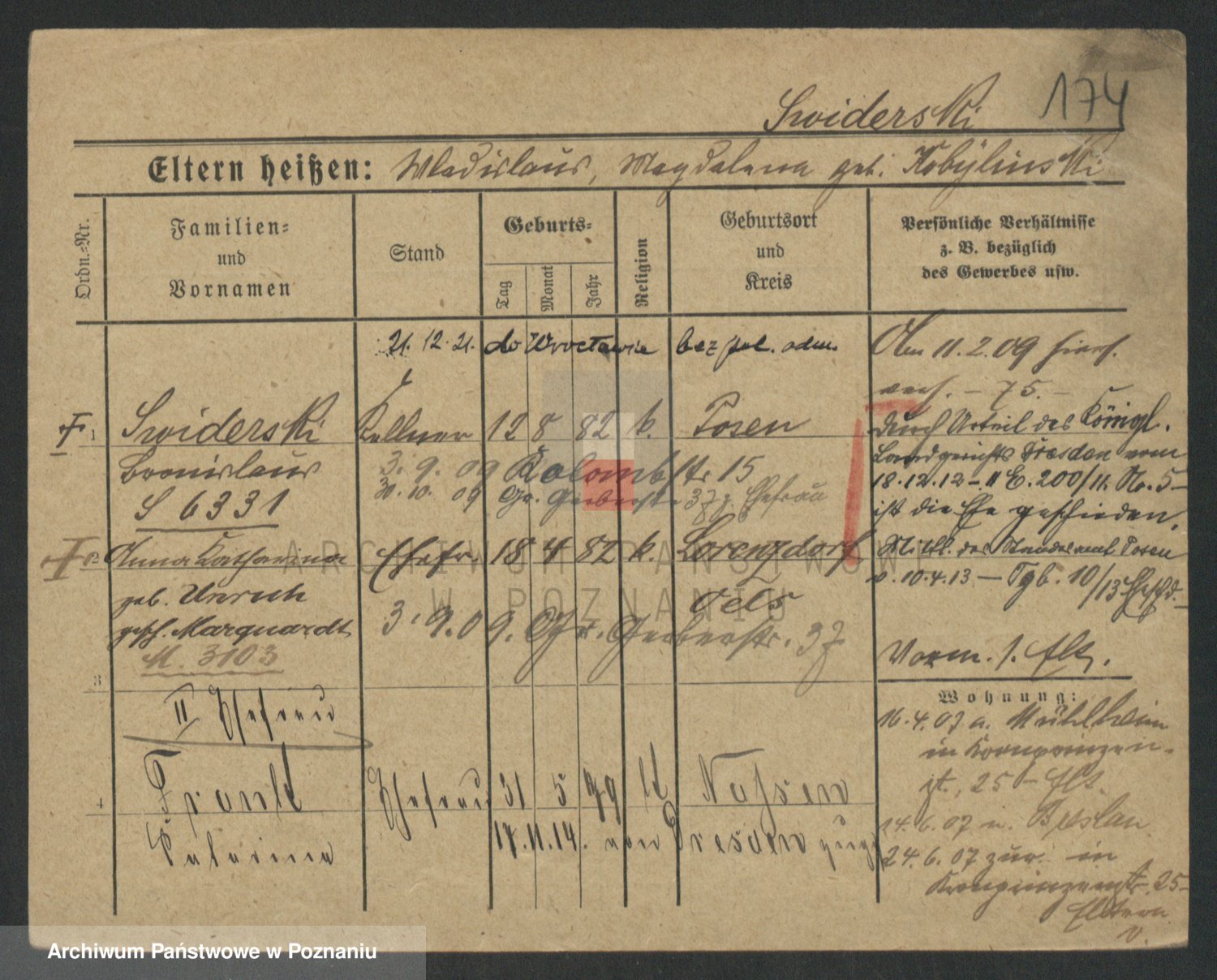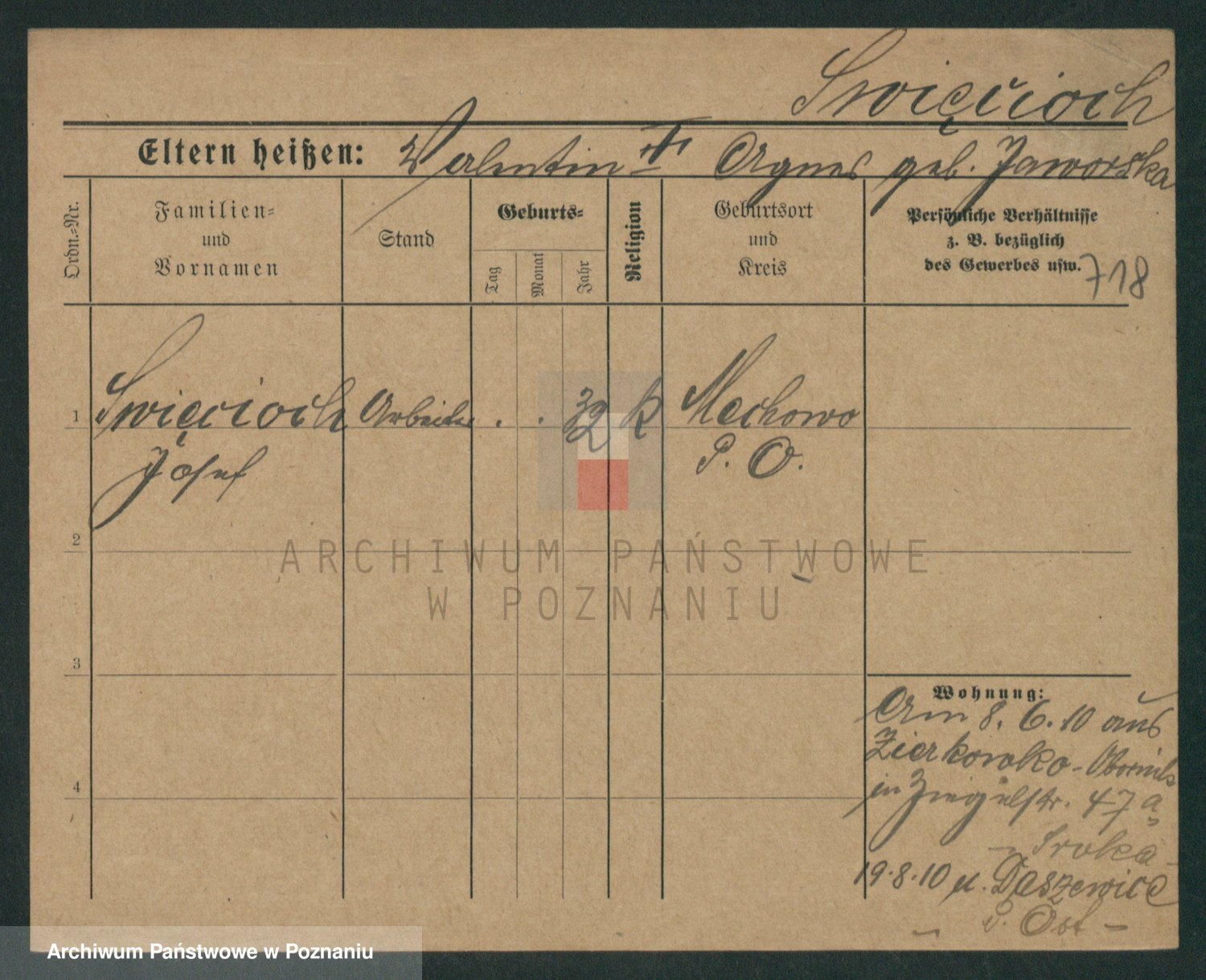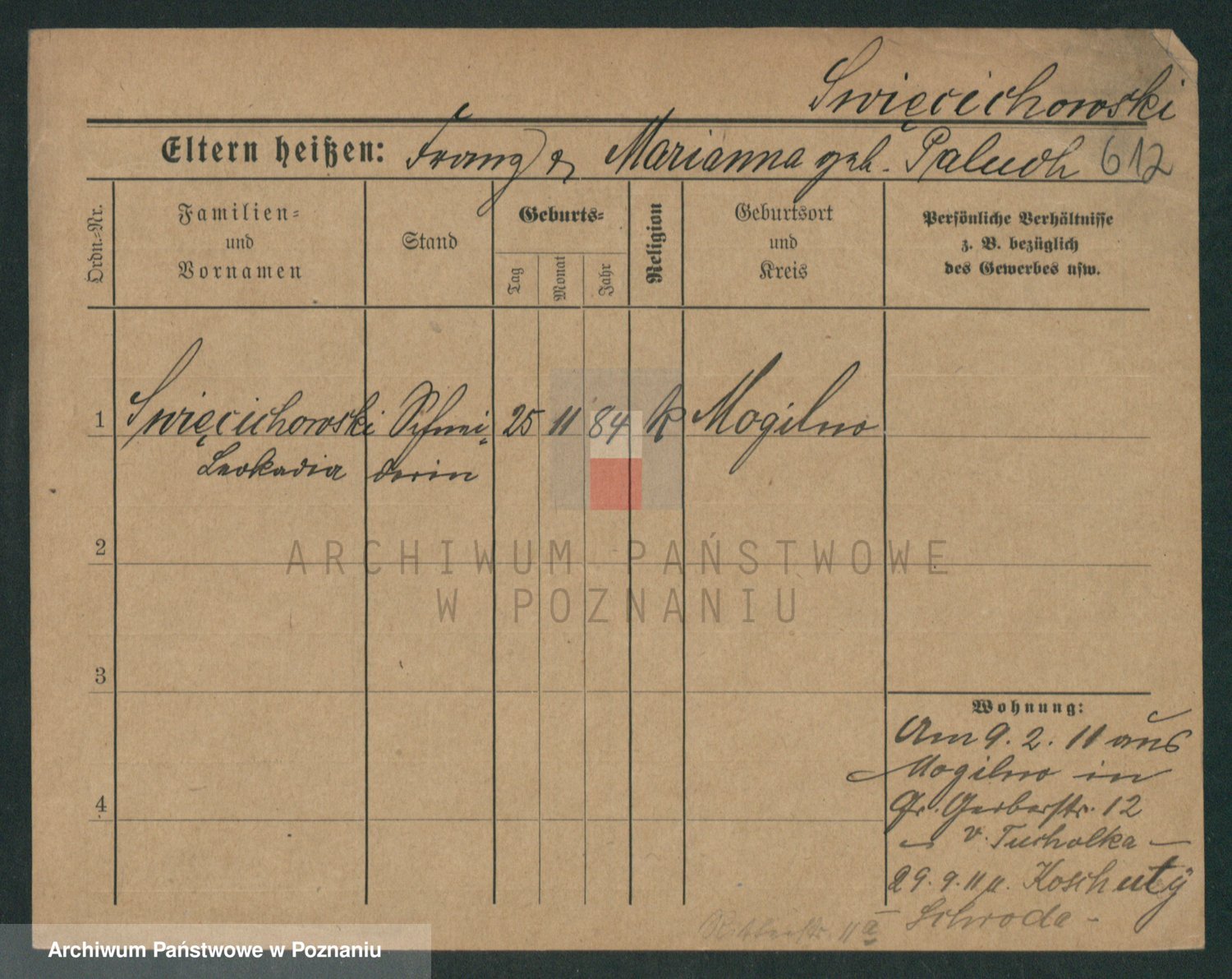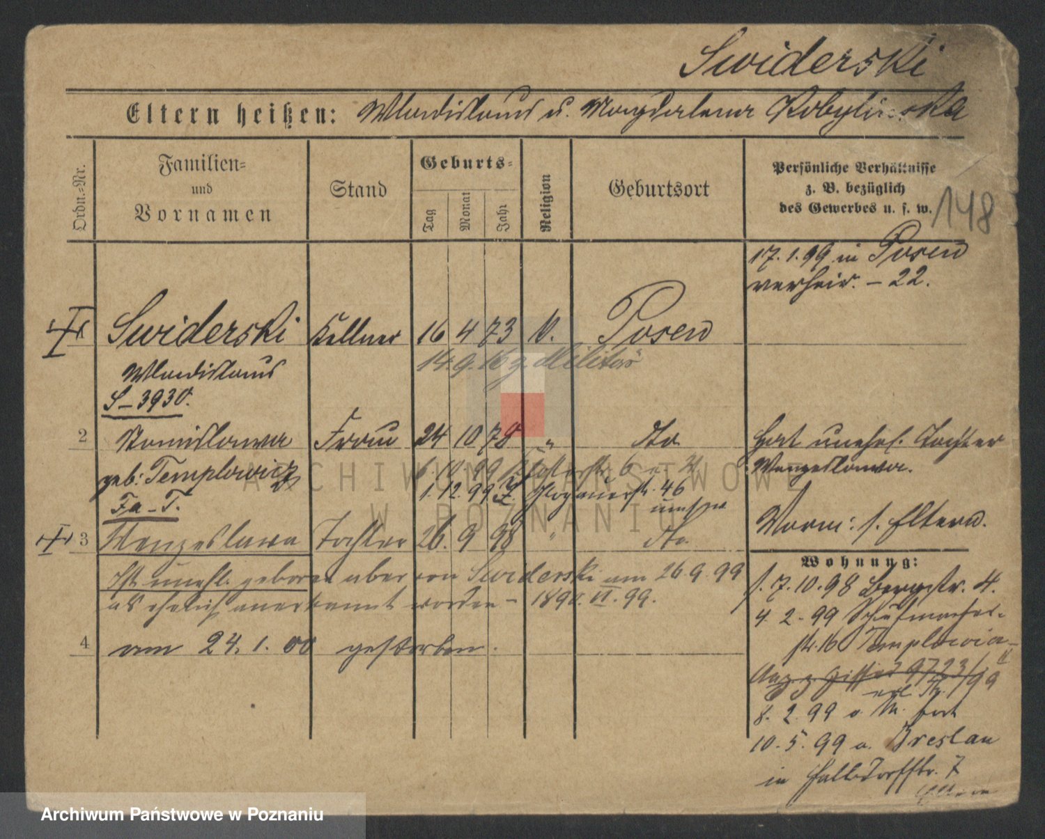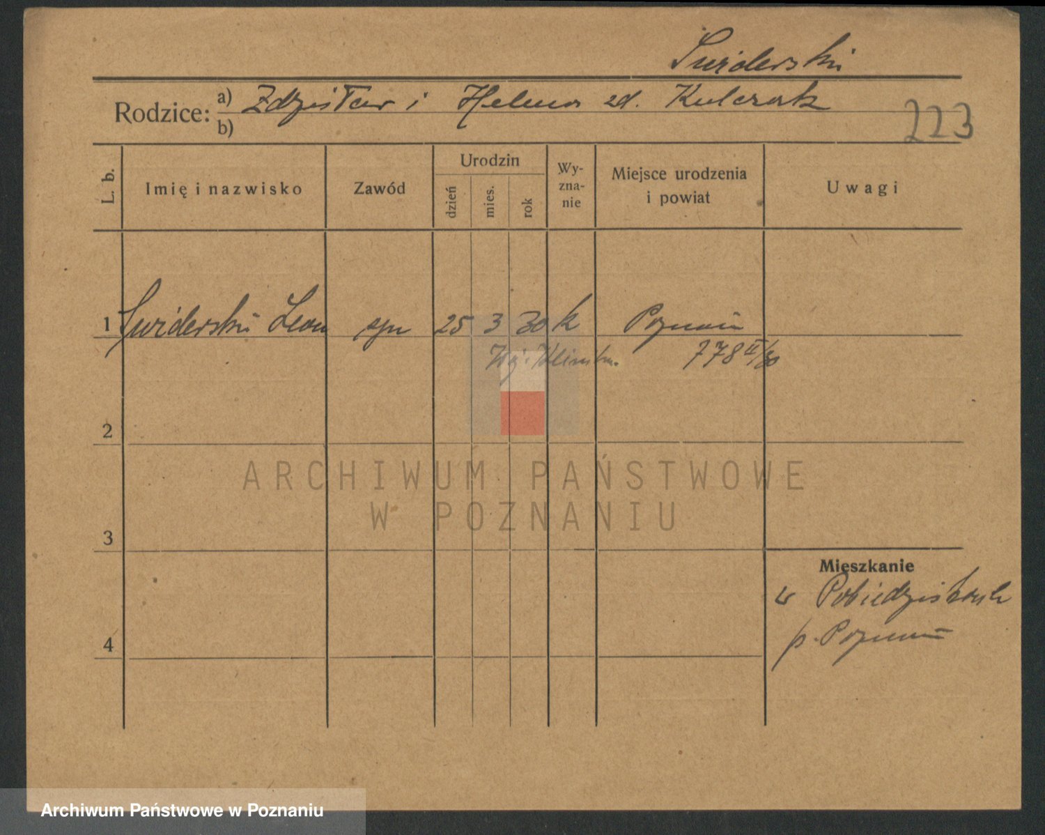 Podgląd karty osobowej dostępny jest po kliknięciu na nazwisko lub ikonkę karty. Można dokonywać powiększenia (ikony na górze) lub przechodzić między kolejnymi skanami (strzałki po bokach).