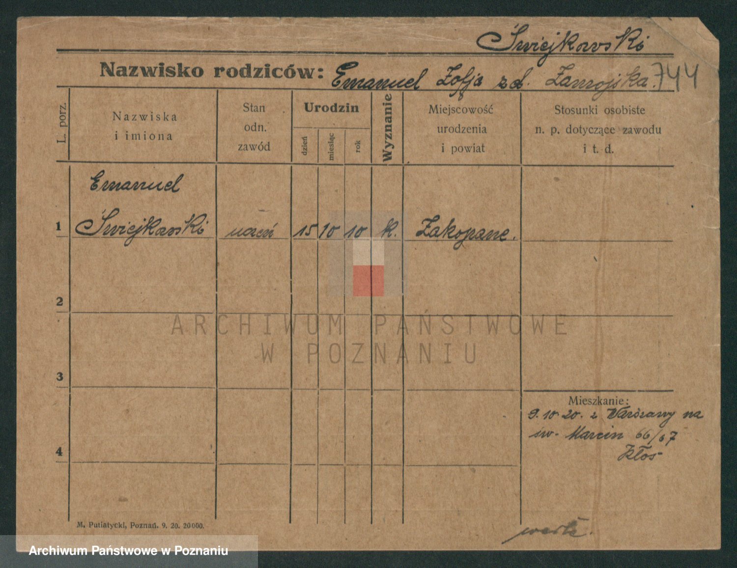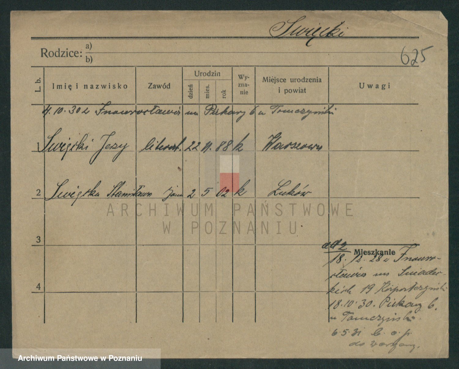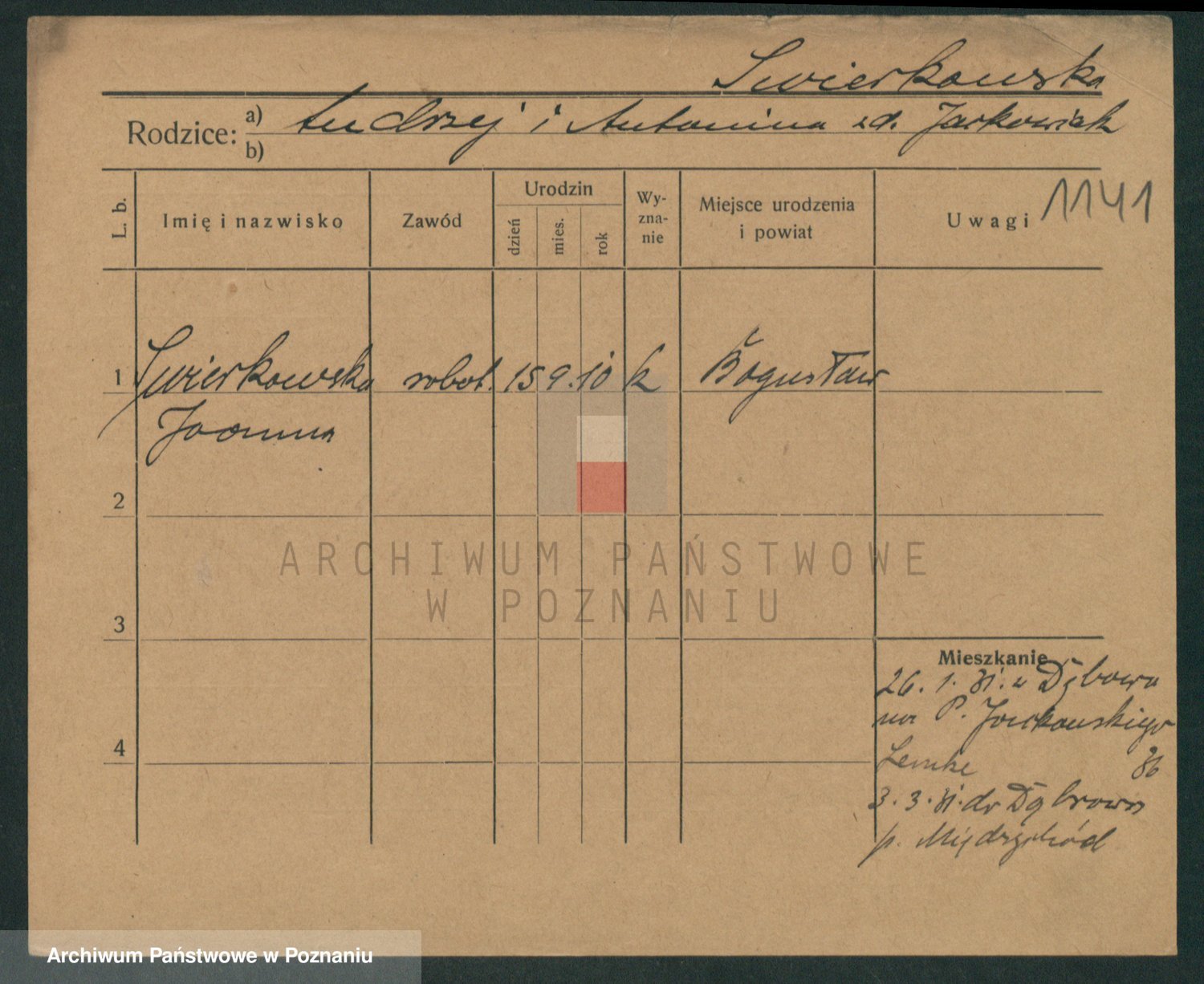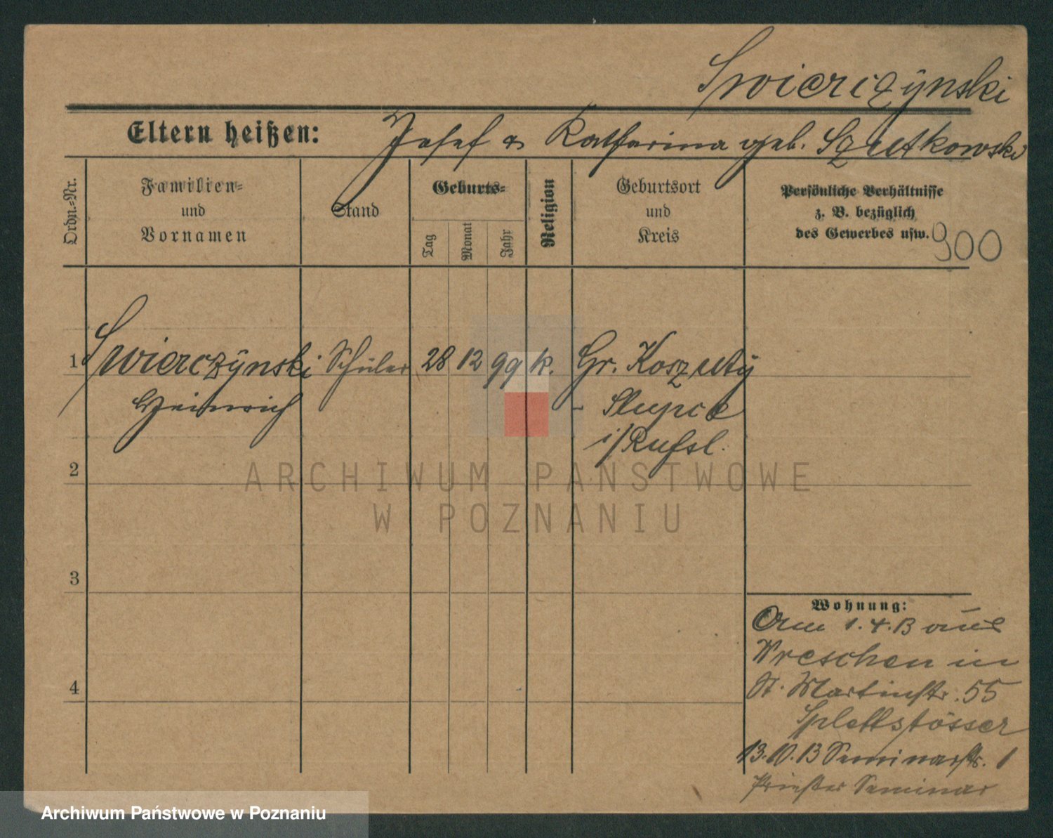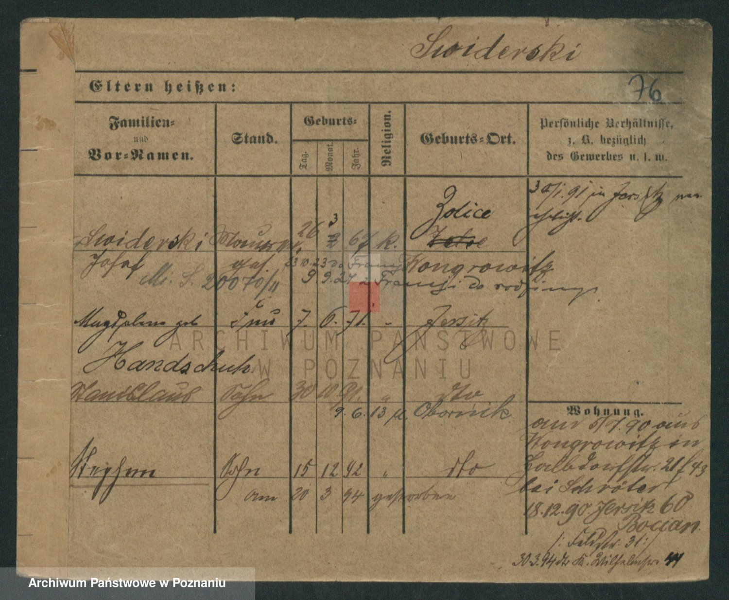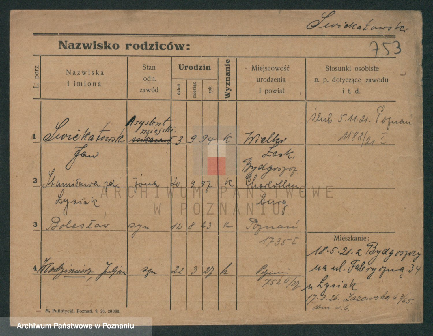 Podgląd karty osobowej dostępny jest po kliknięciu na nazwisko lub ikonkę karty. Można dokonywać powiększenia (ikony na górze) lub przechodzić między kolejnymi skanami (strzałki po bokach).