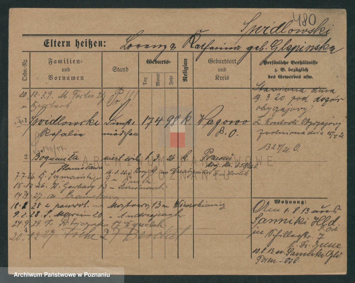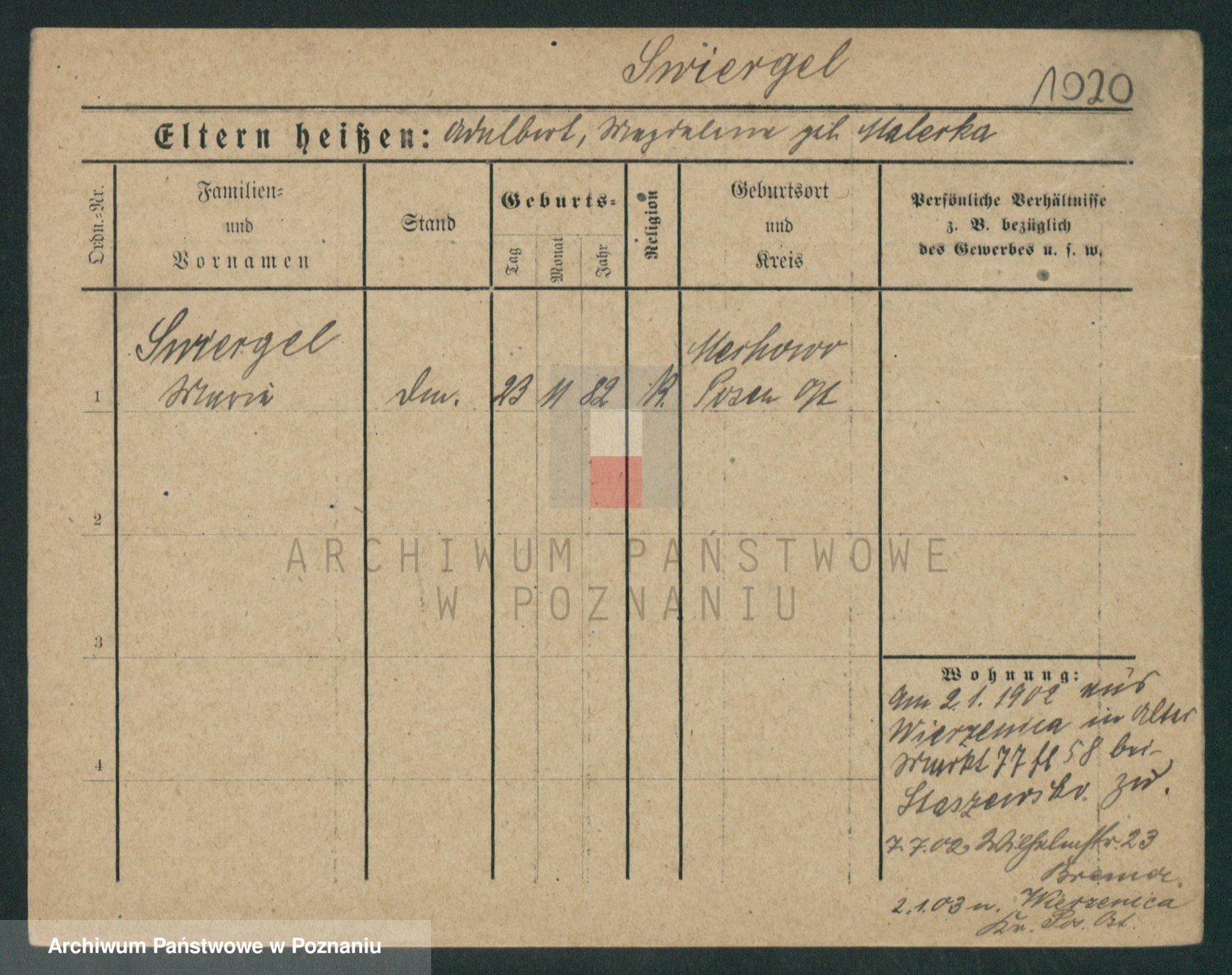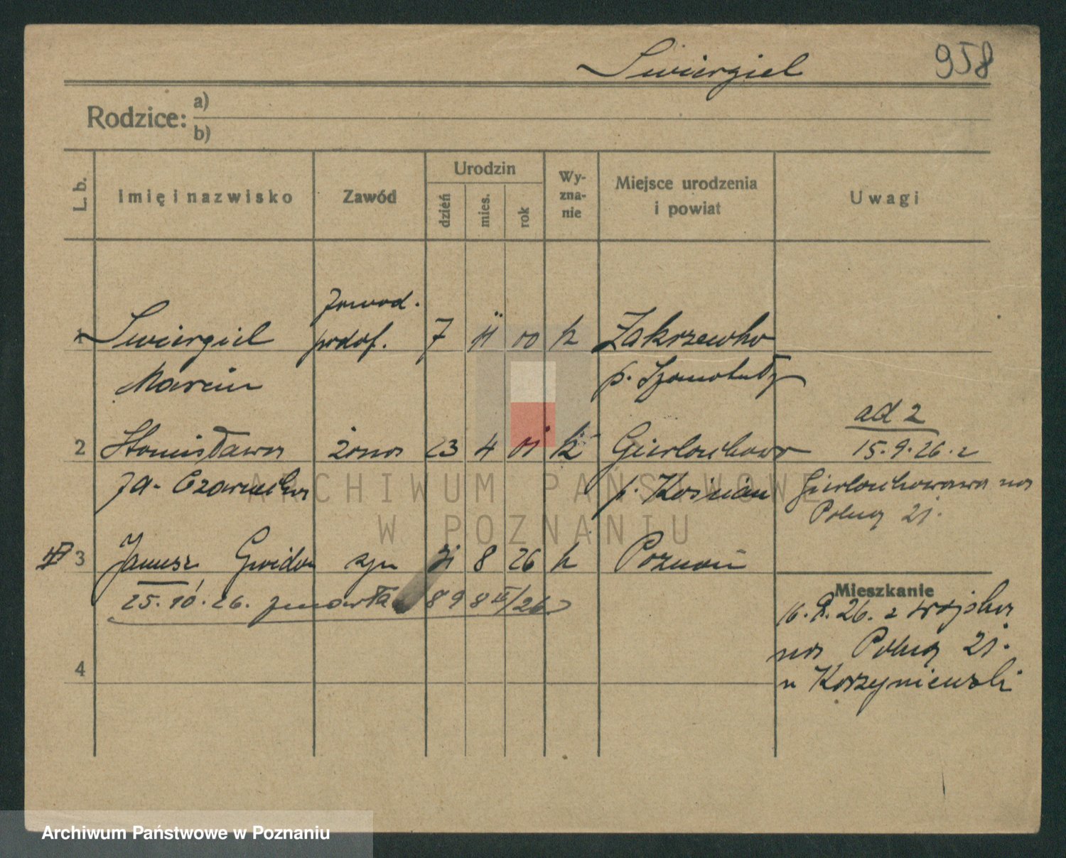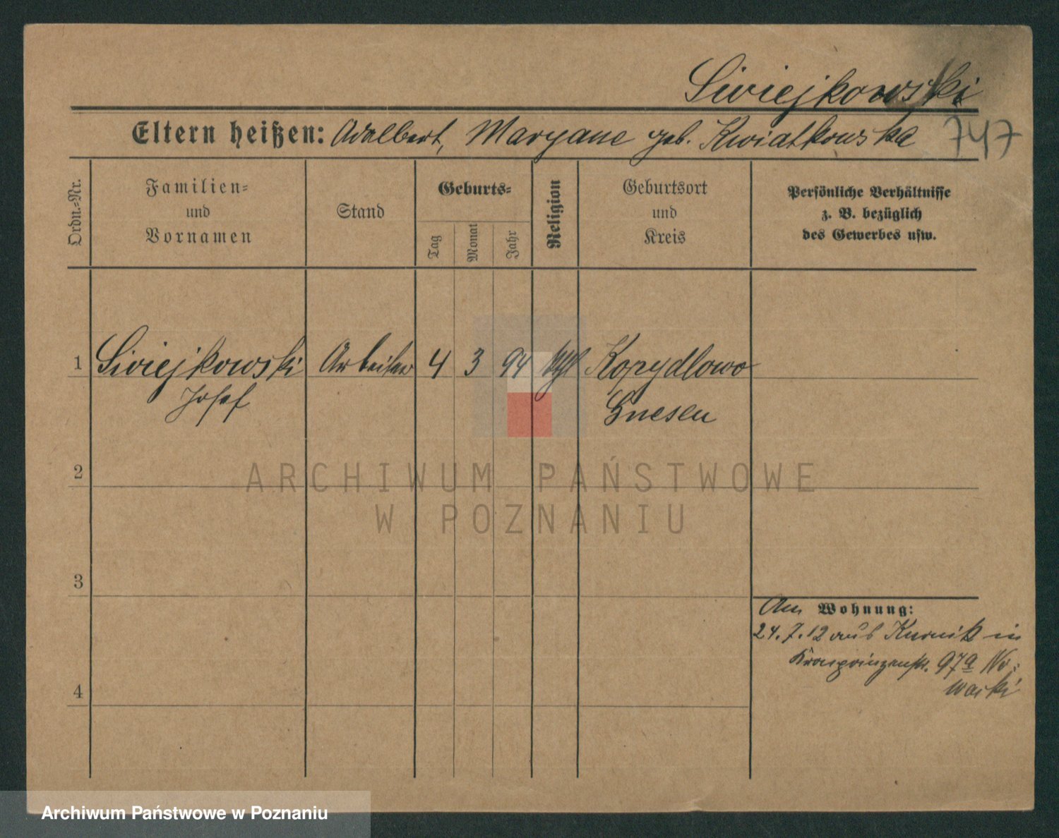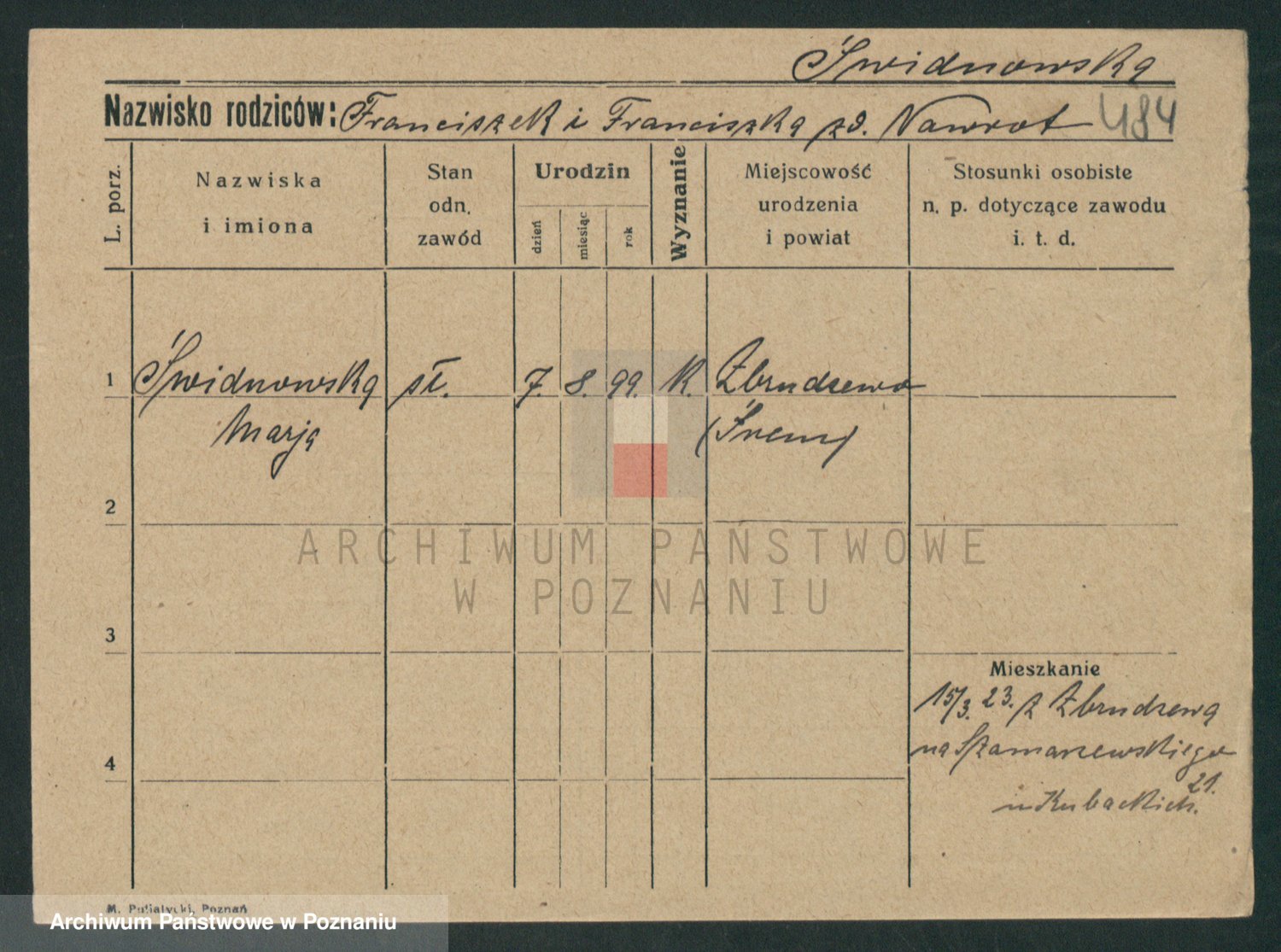 Podgląd karty osobowej dostępny jest po kliknięciu na nazwisko lub ikonkę karty. Można dokonywać powiększenia (ikony na górze) lub przechodzić między kolejnymi skanami (strzałki po bokach).