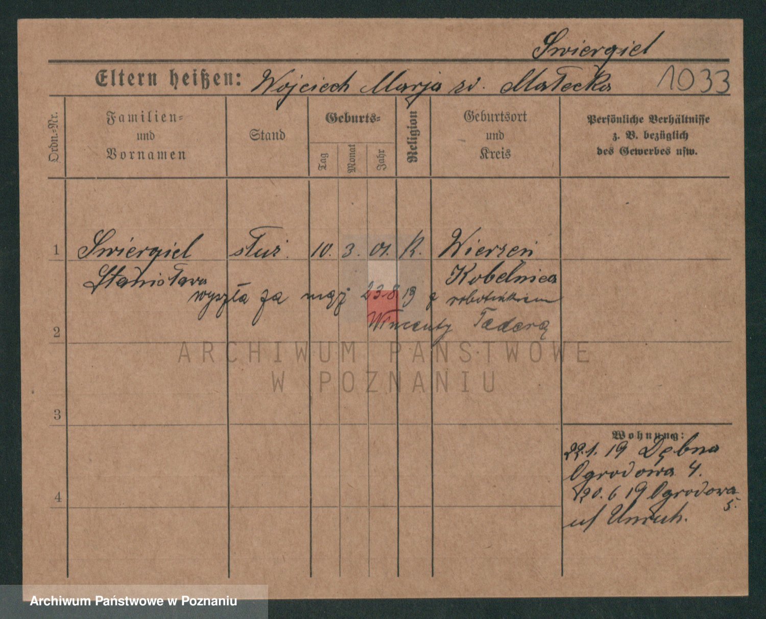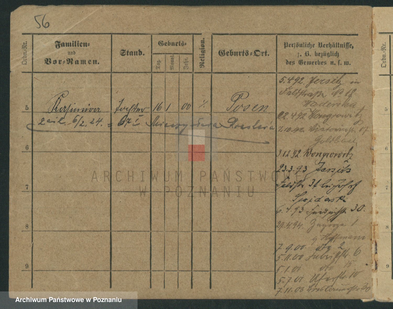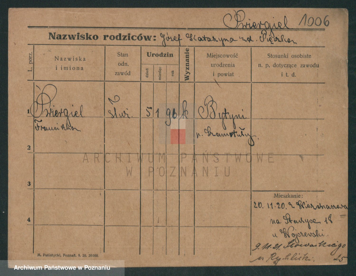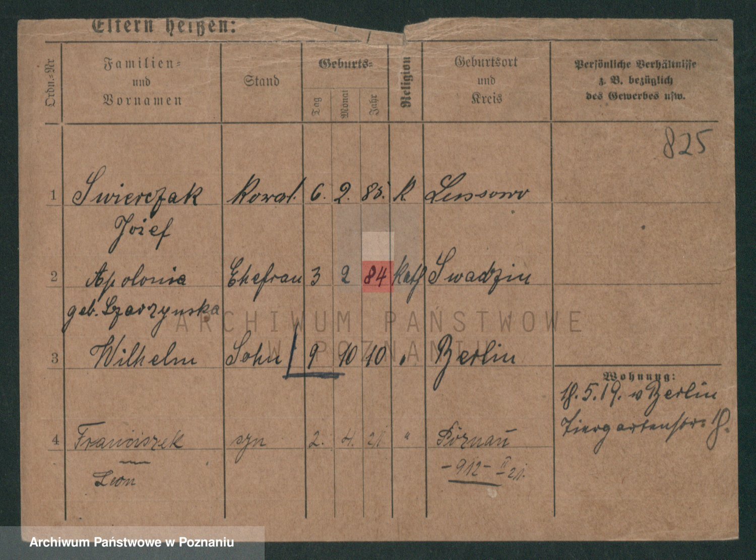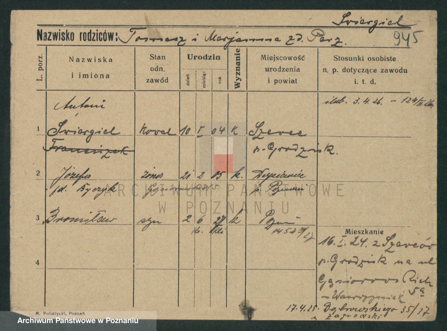 Podgląd karty osobowej dostępny jest po kliknięciu na nazwisko lub ikonkę karty. Można dokonywać powiększenia (ikony na górze) lub przechodzić między kolejnymi skanami (strzałki po bokach).