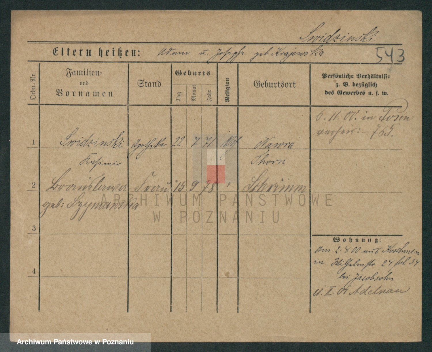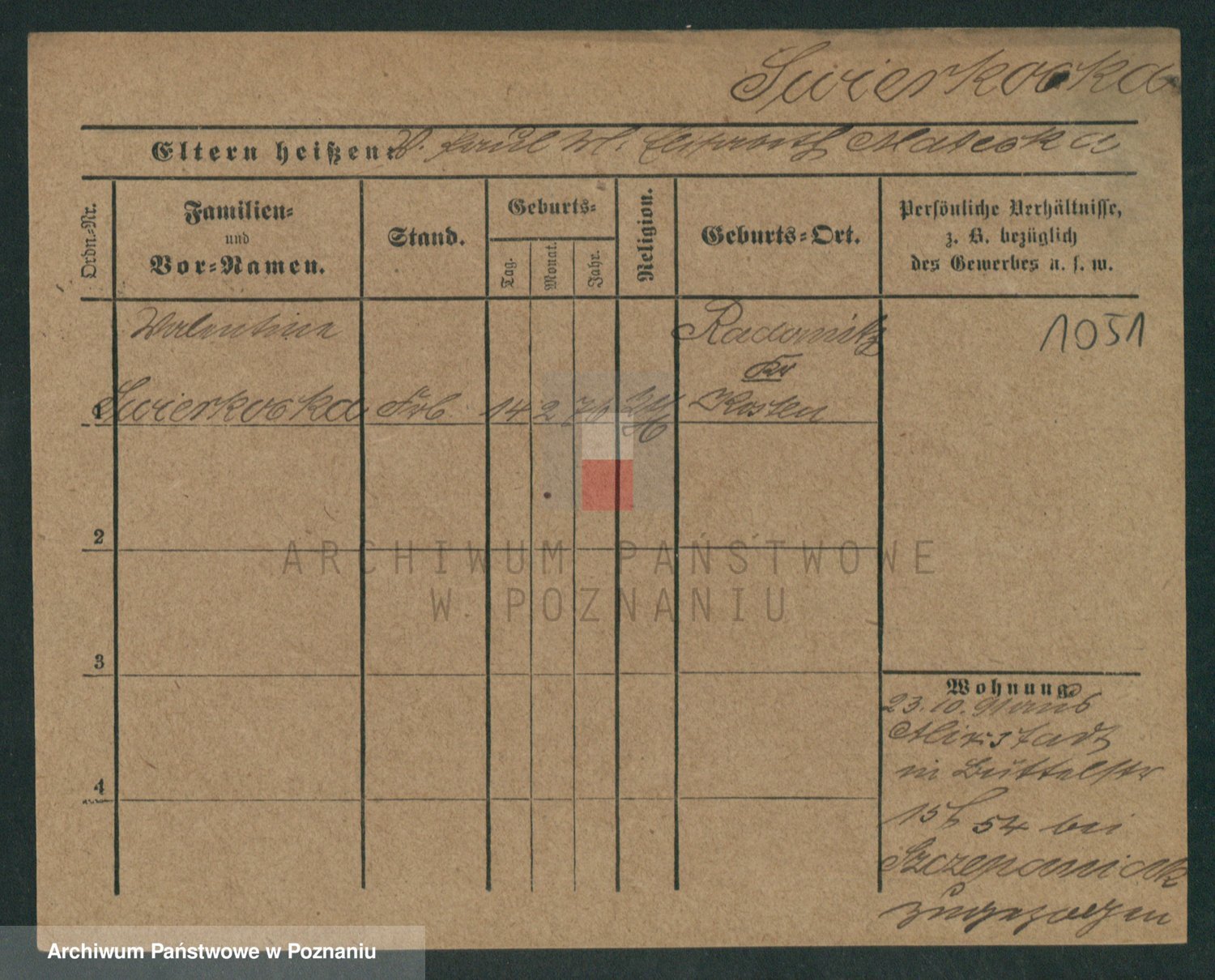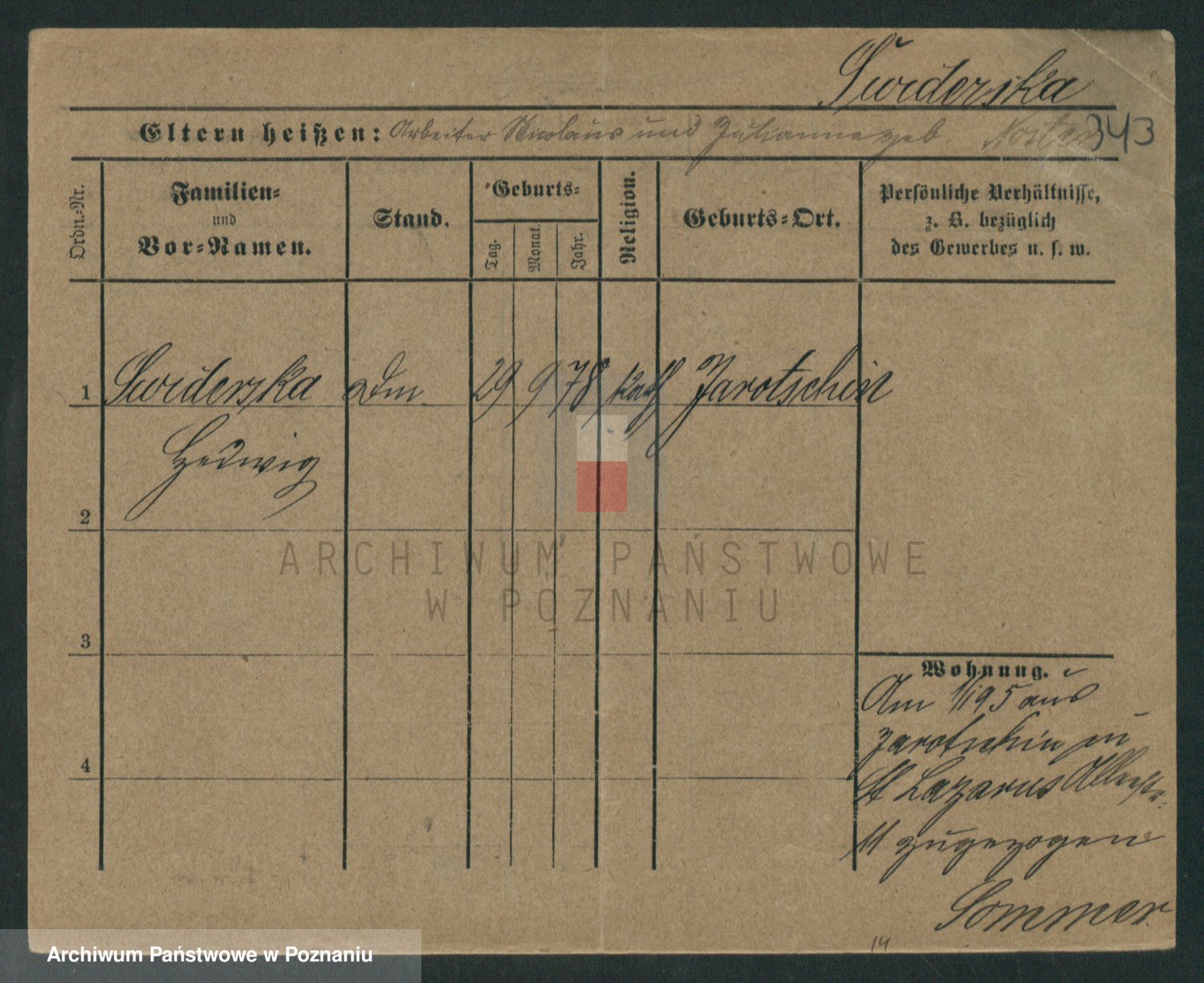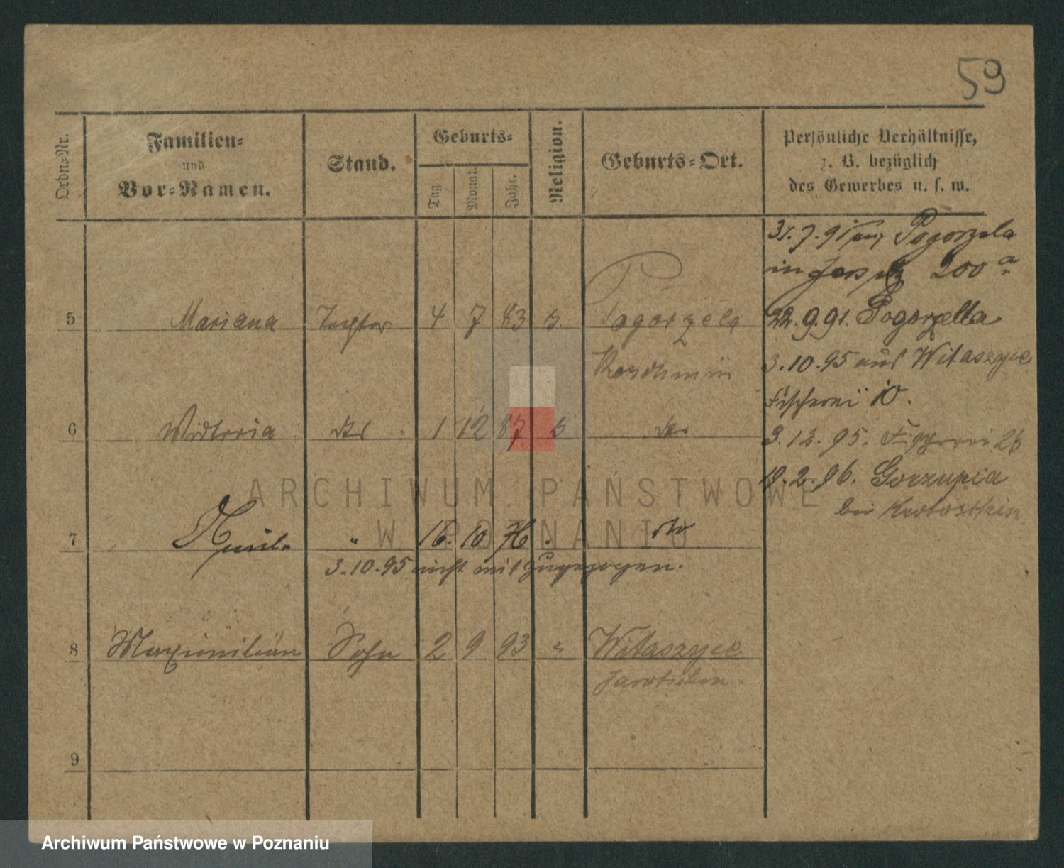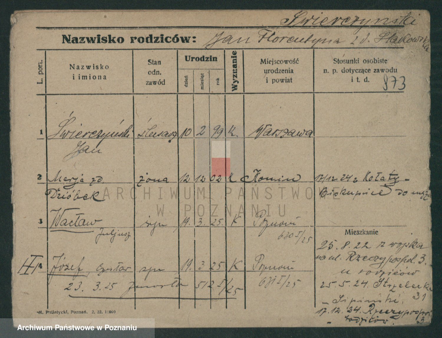Podgląd karty osobowej dostępny jest po kliknięciu na nazwisko lub ikonkę karty. Można dokonywać powiększenia (ikony na górze) lub przechodzić między kolejnymi skanami (strzałki po bokach).