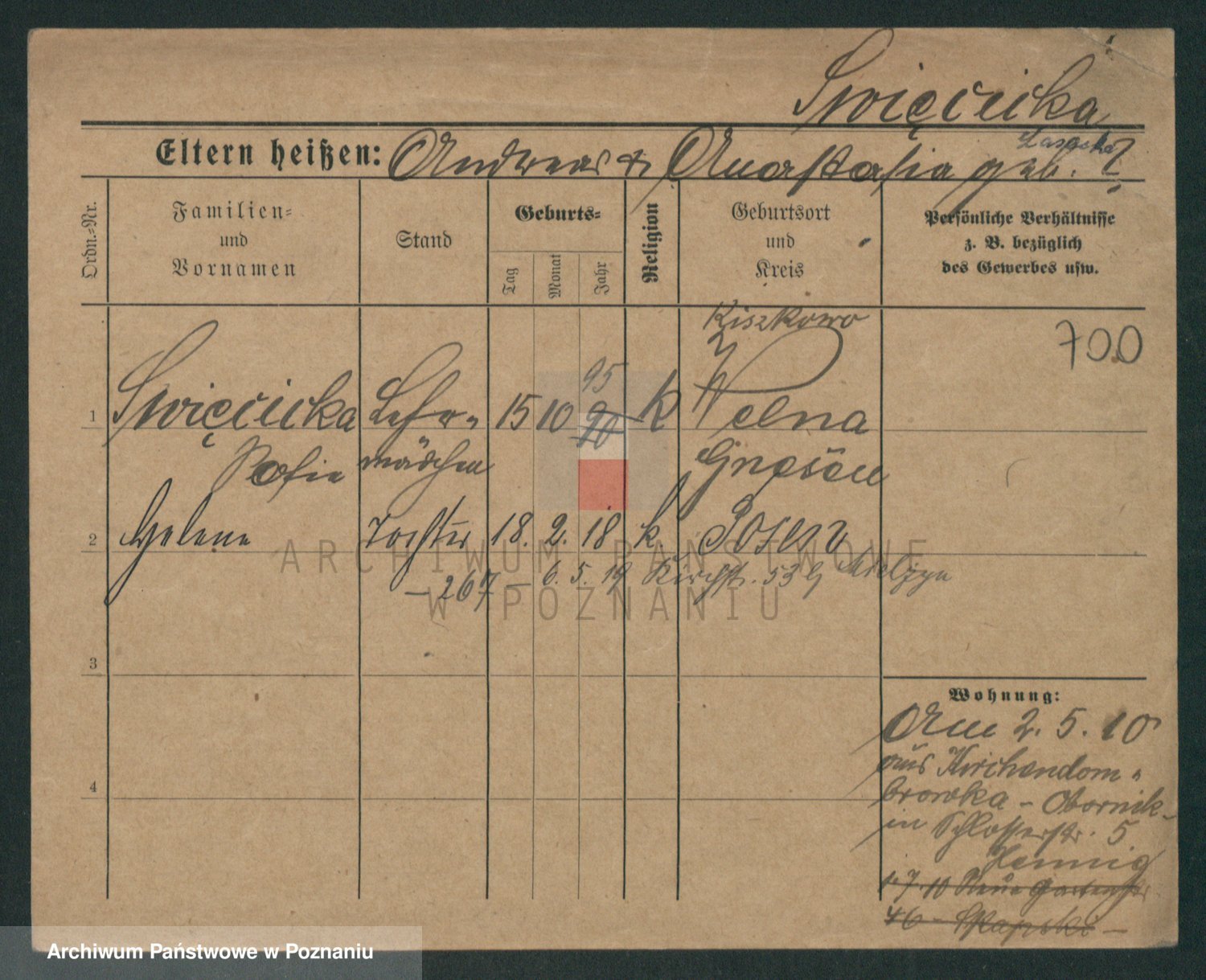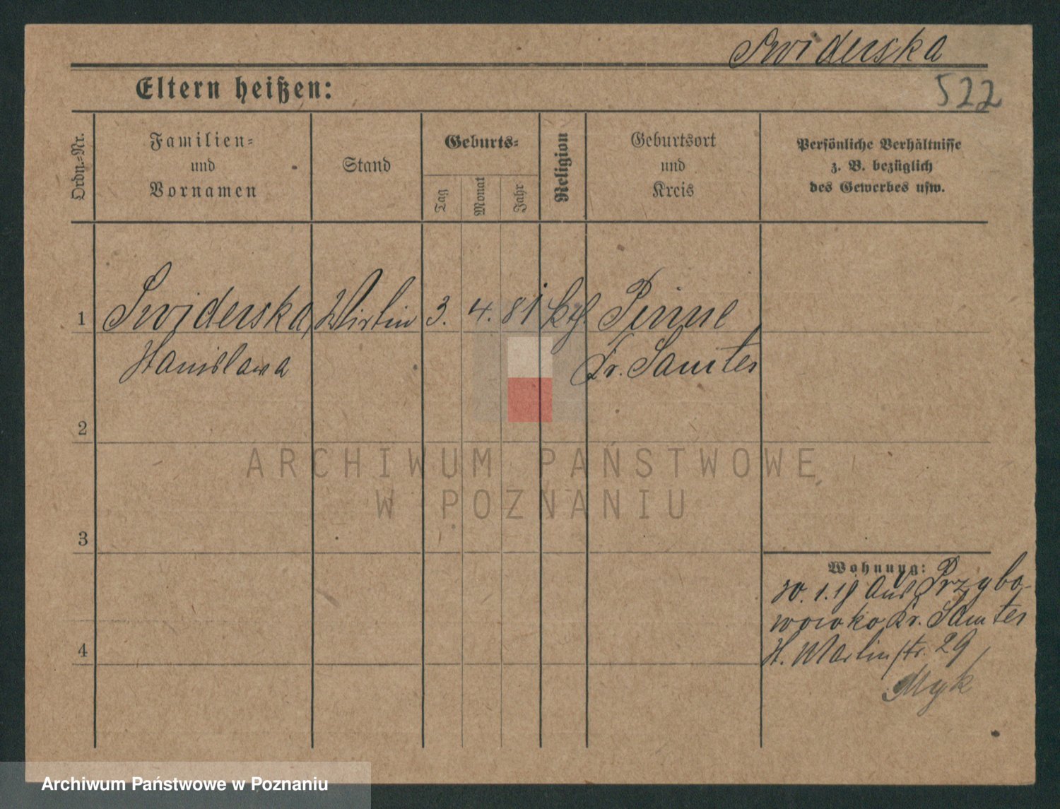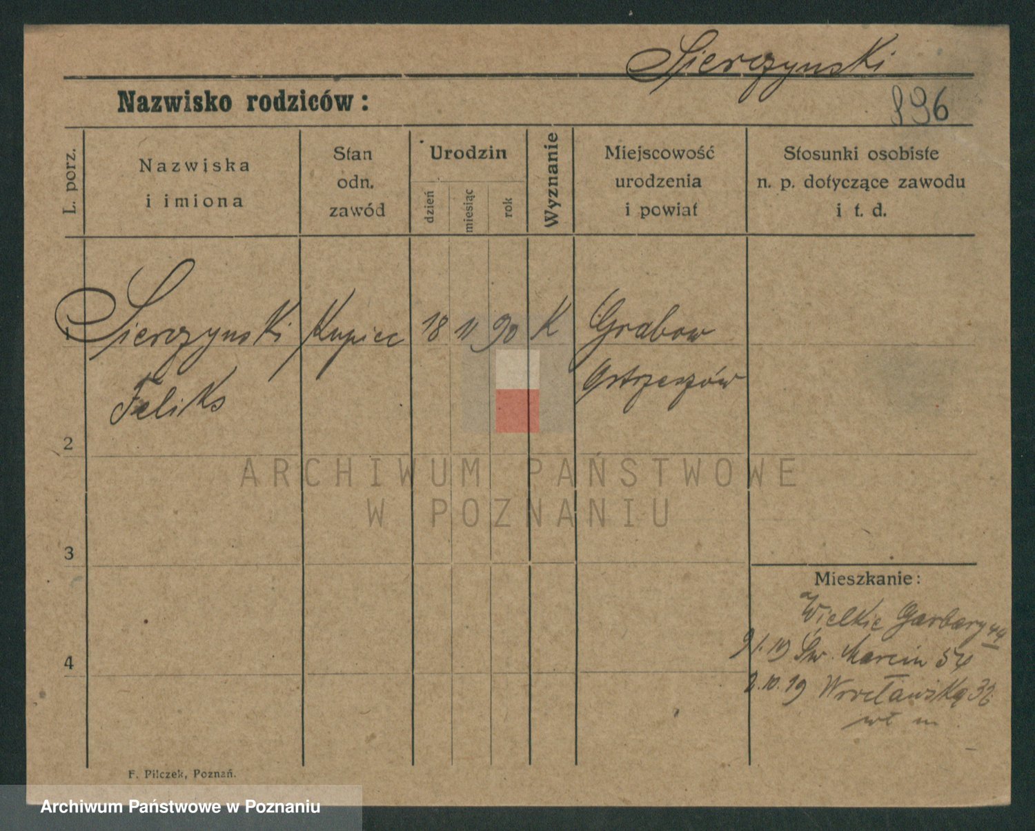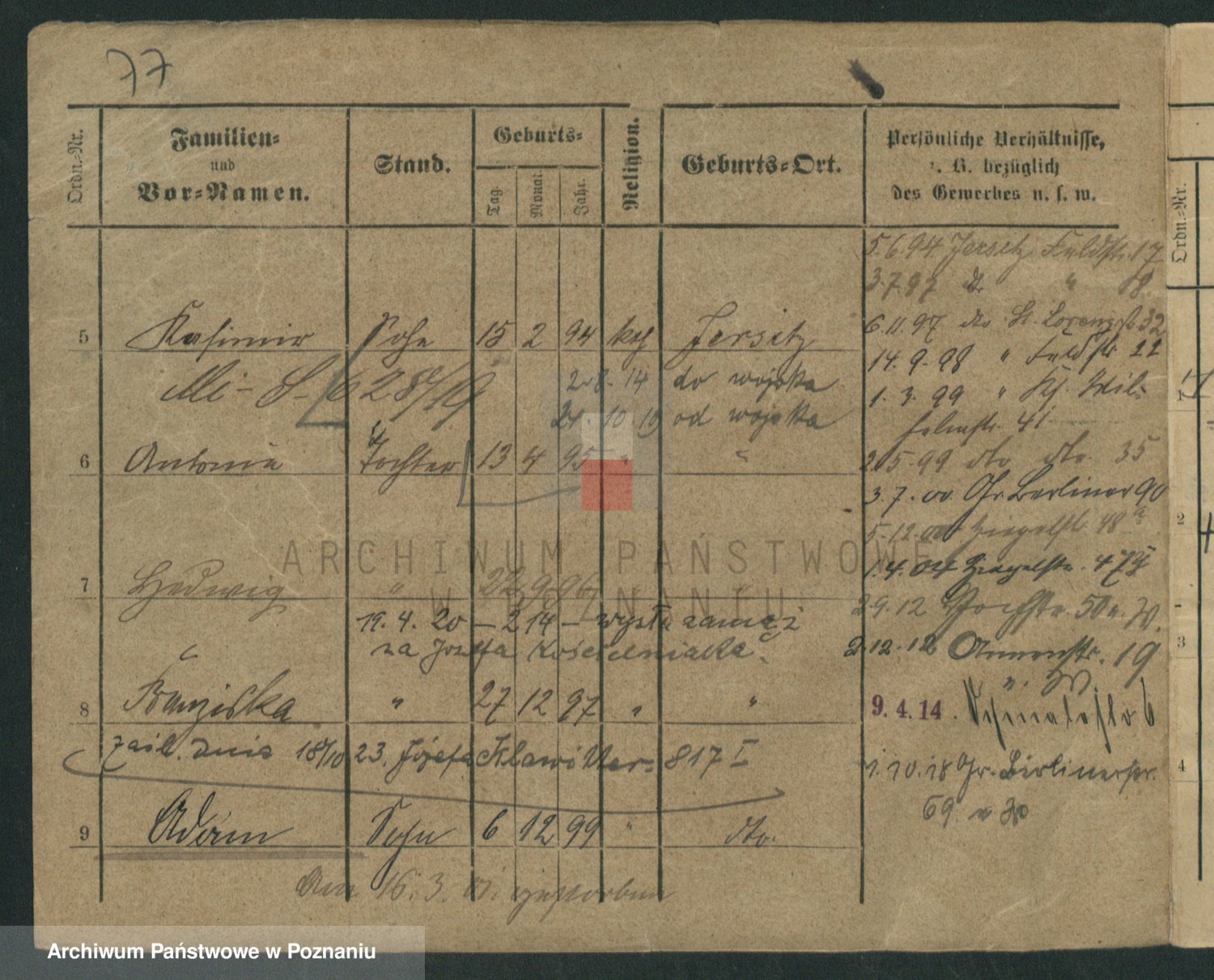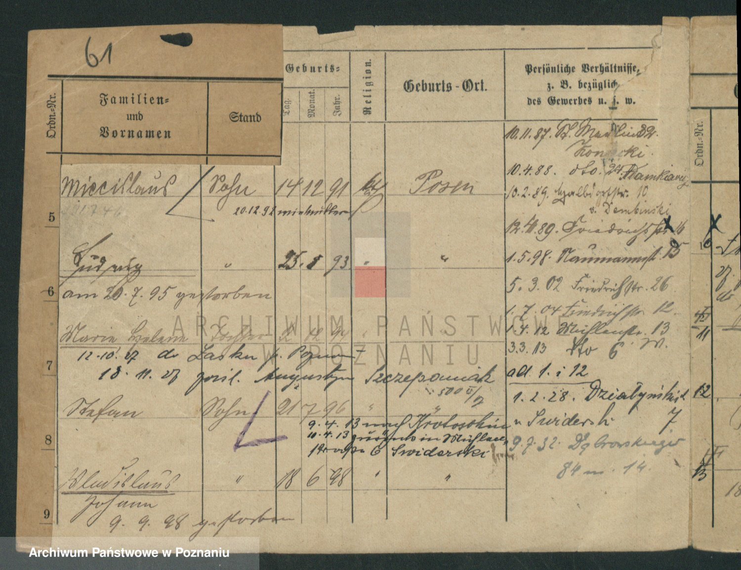 Podgląd karty osobowej dostępny jest po kliknięciu na nazwisko lub ikonkę karty. Można dokonywać powiększenia (ikony na górze) lub przechodzić między kolejnymi skanami (strzałki po bokach).