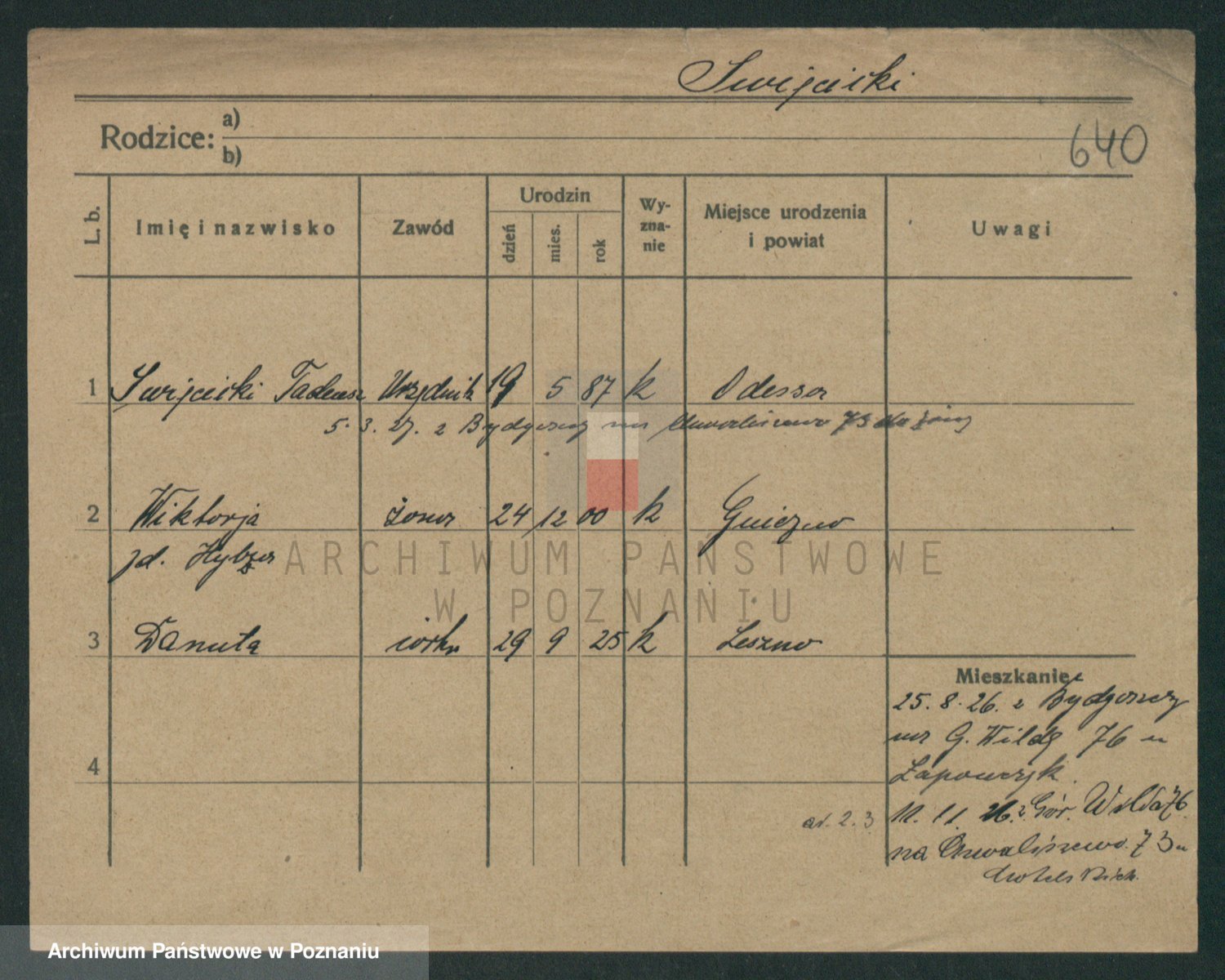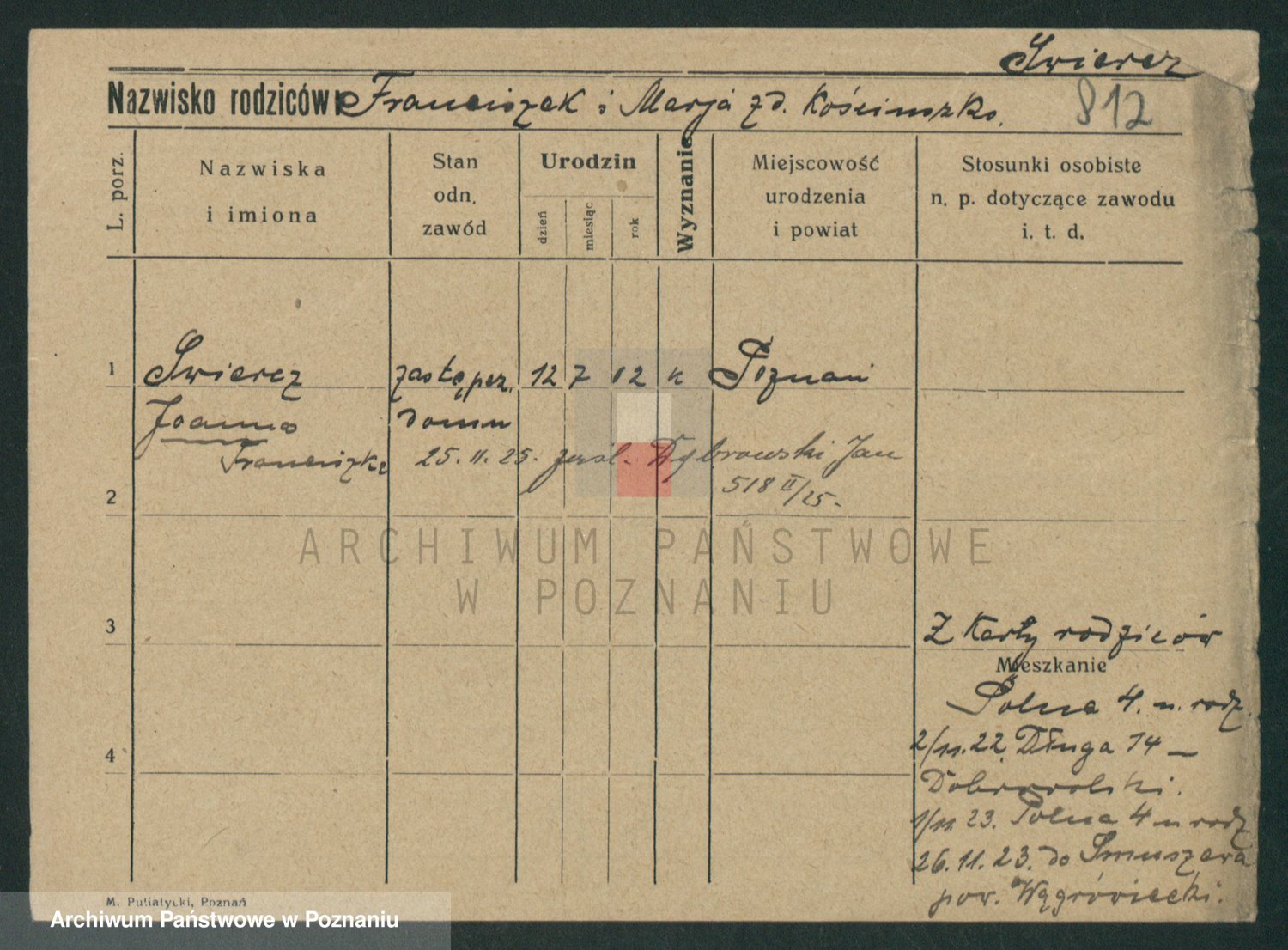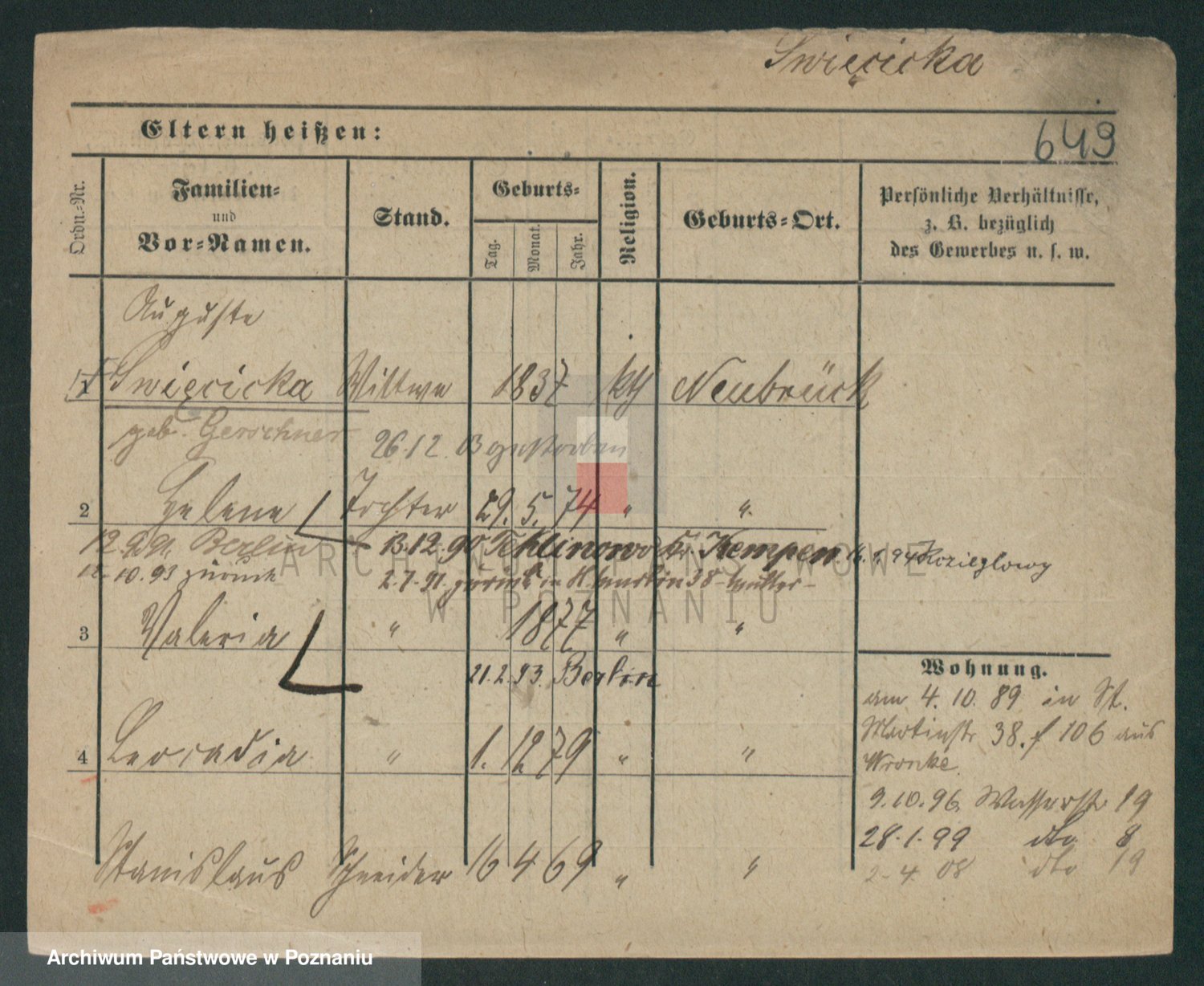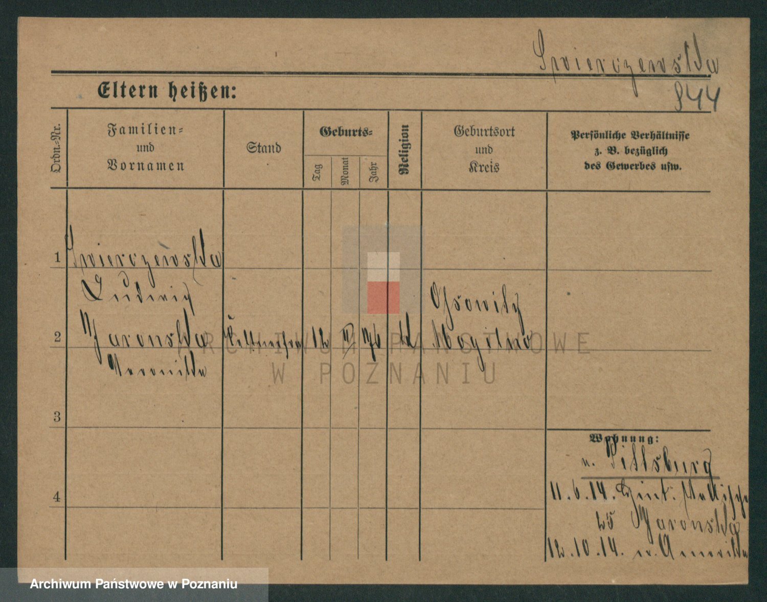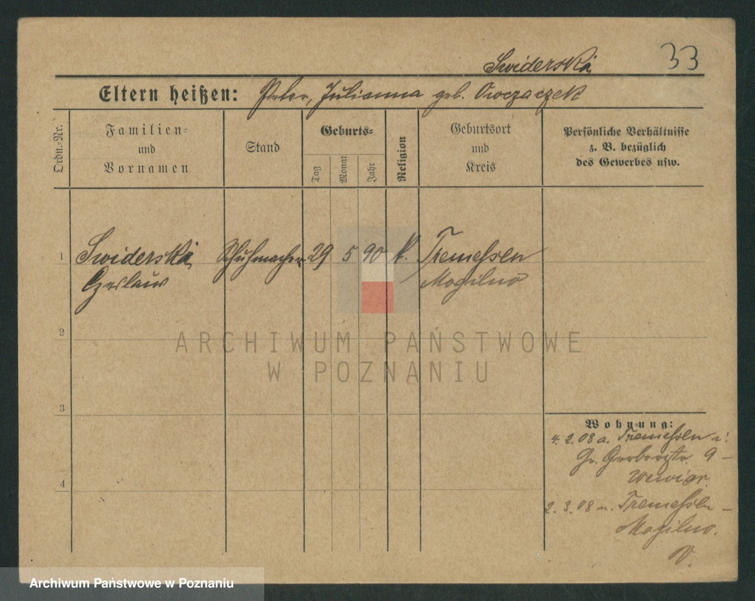 Podgląd karty osobowej dostępny jest po kliknięciu na nazwisko lub ikonkę karty. Można dokonywać powiększenia (ikony na górze) lub przechodzić między kolejnymi skanami (strzałki po bokach).