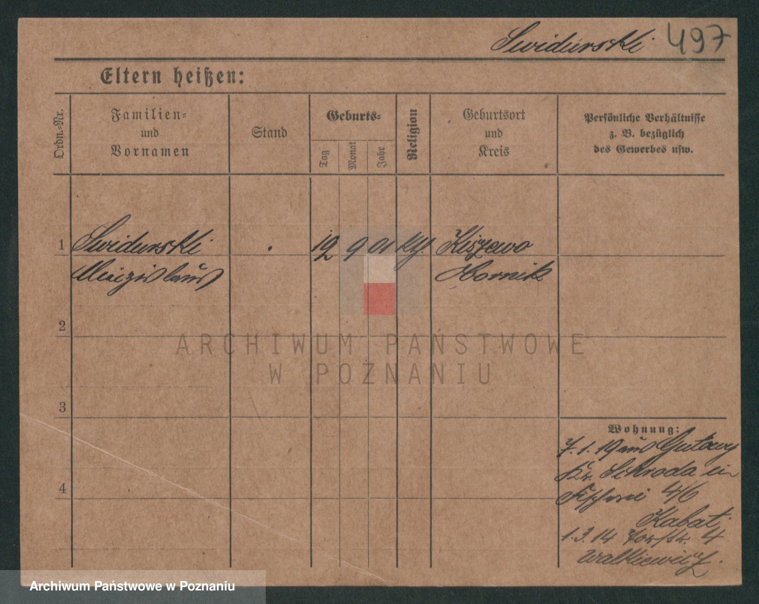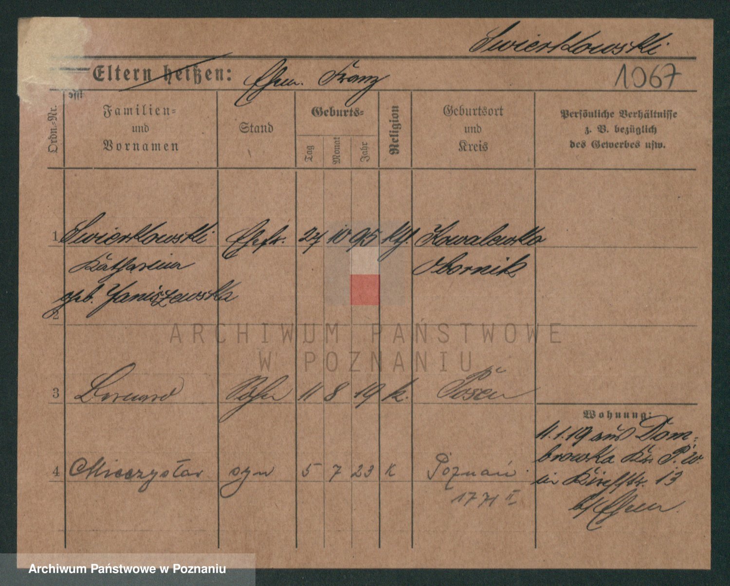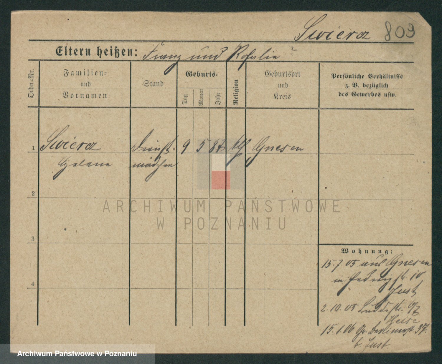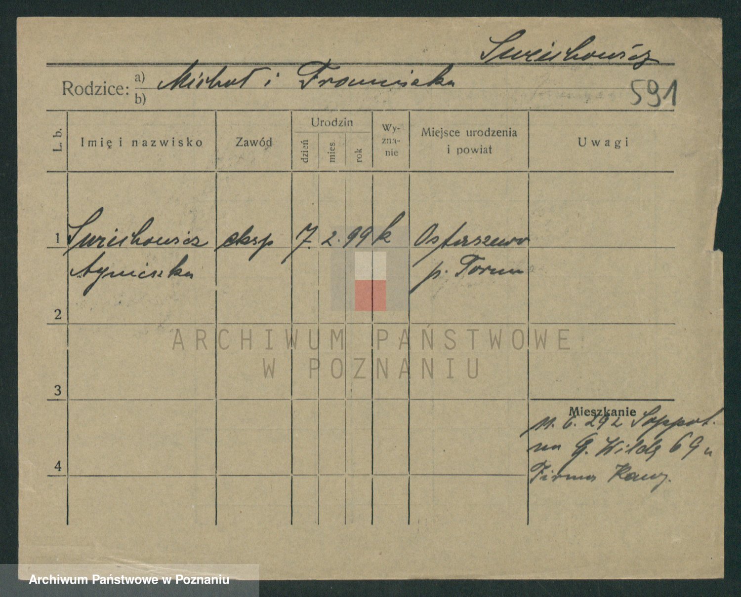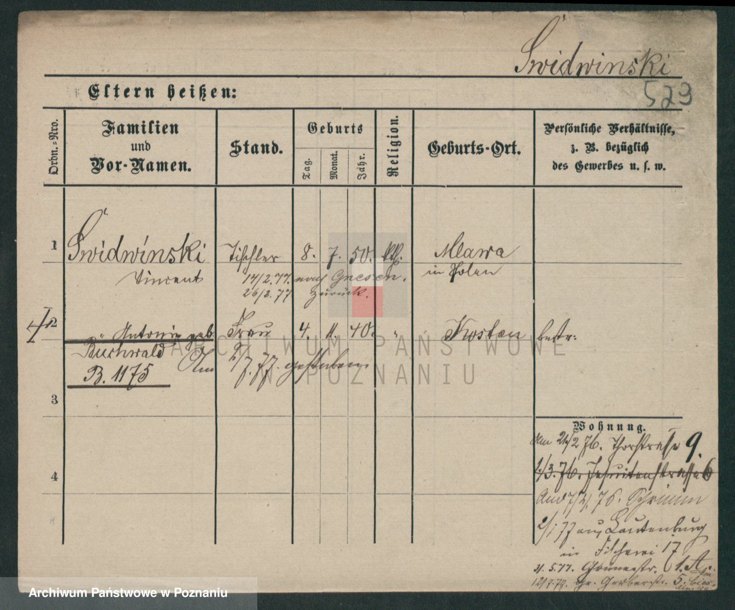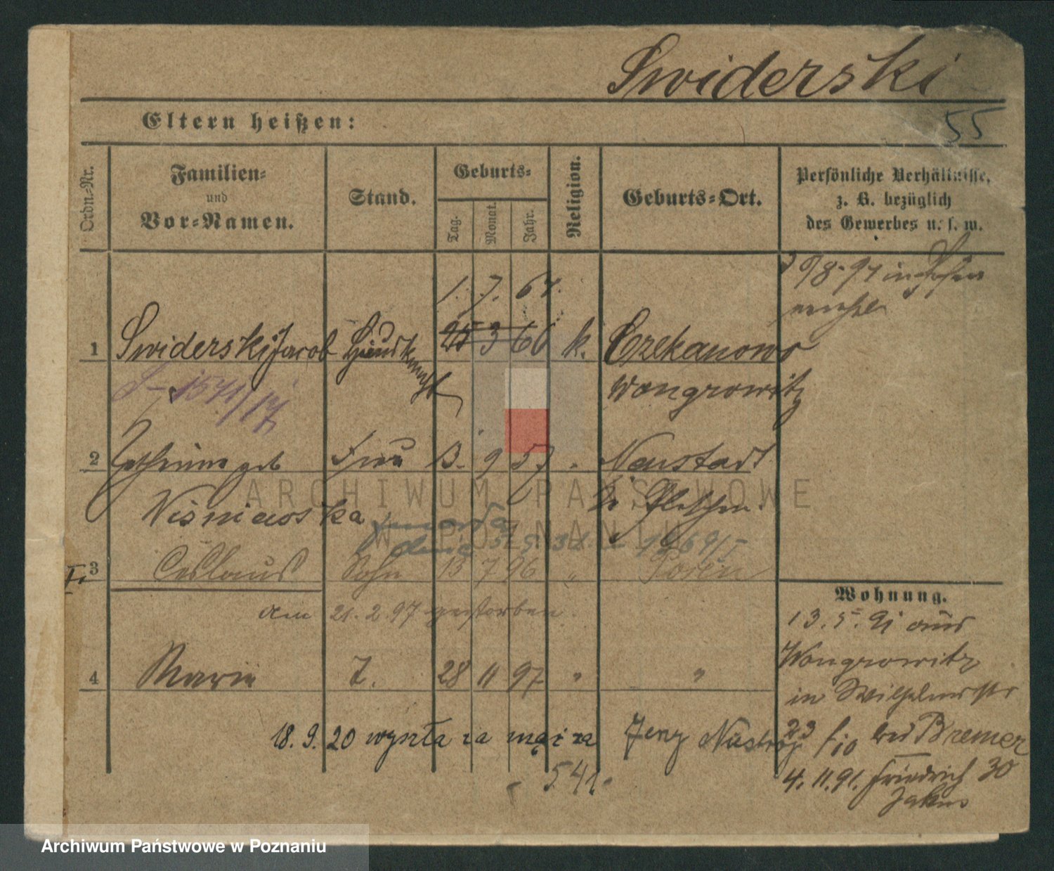 Podgląd karty osobowej dostępny jest po kliknięciu na nazwisko lub ikonkę karty. Można dokonywać powiększenia (ikony na górze) lub przechodzić między kolejnymi skanami (strzałki po bokach).