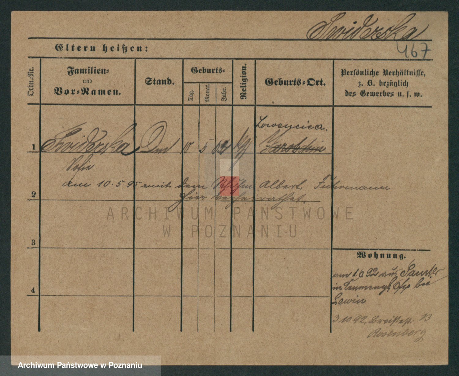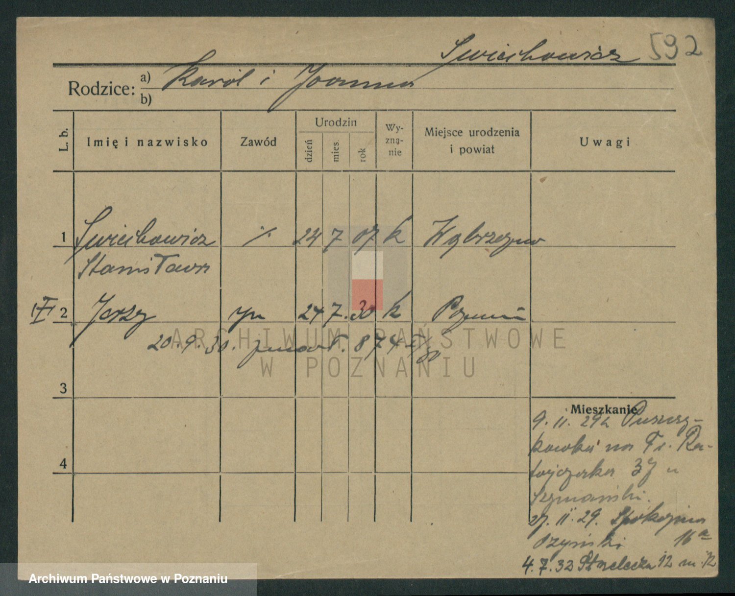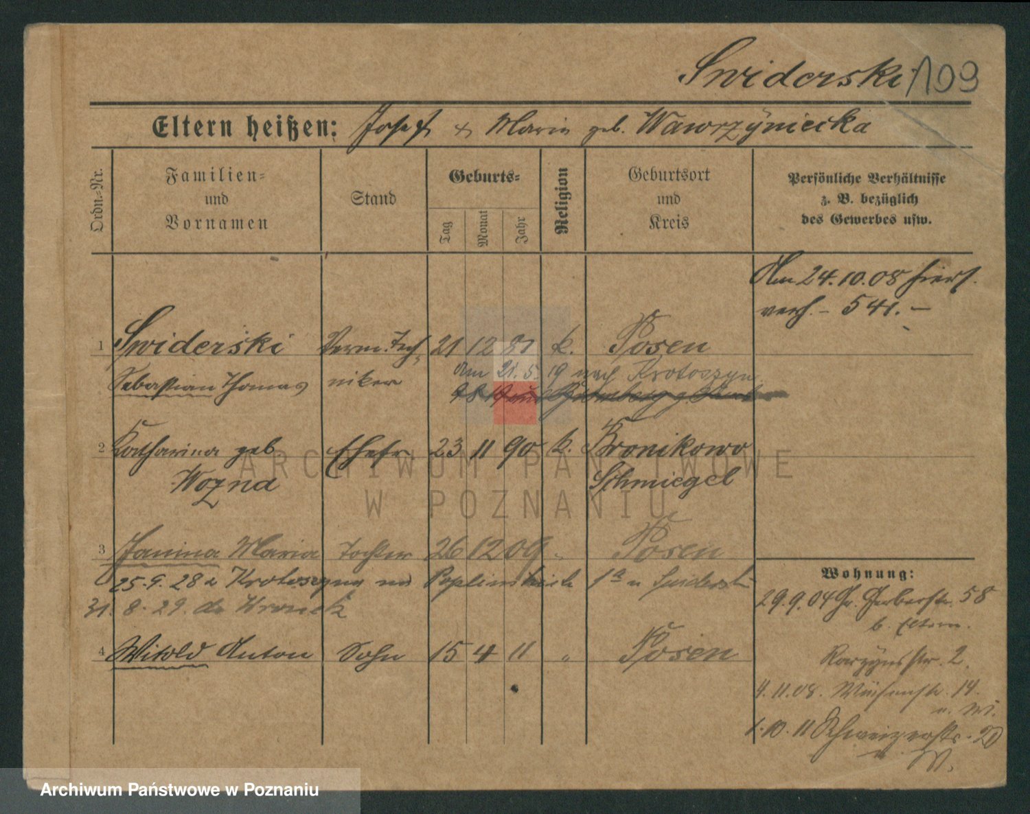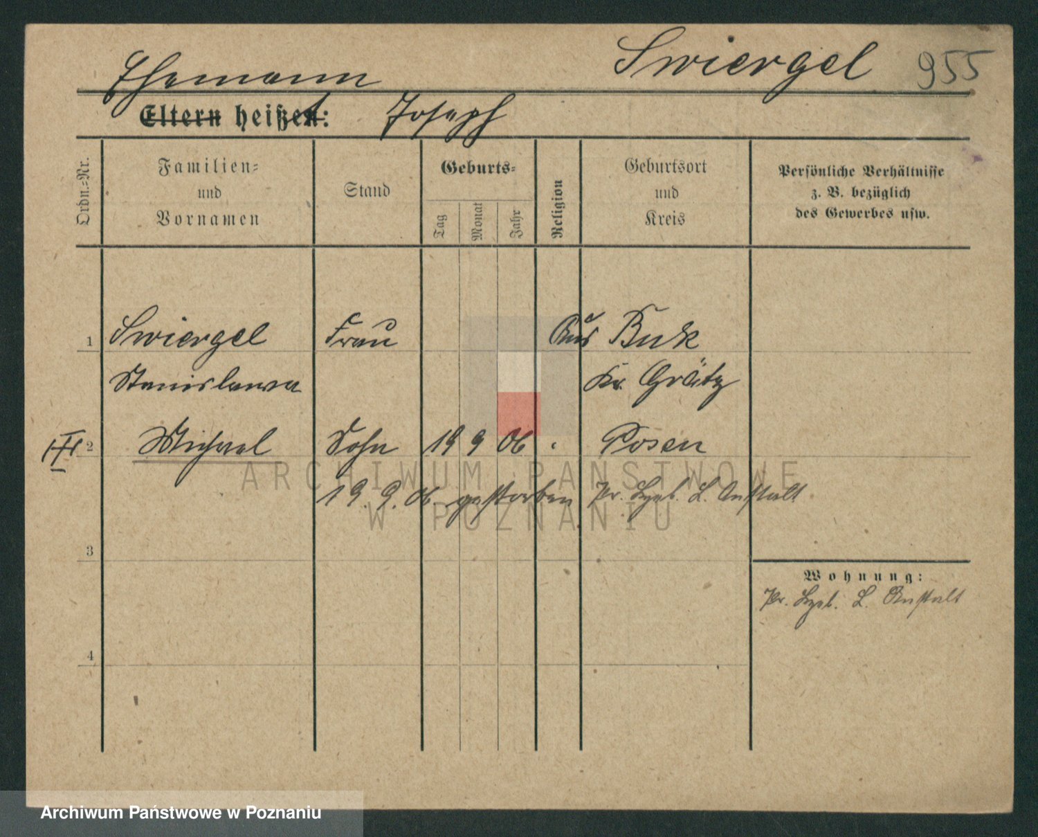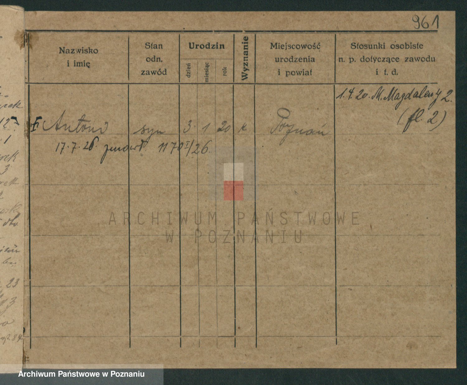 Podgląd karty osobowej dostępny jest po kliknięciu na nazwisko lub ikonkę karty. Można dokonywać powiększenia (ikony na górze) lub przechodzić między kolejnymi skanami (strzałki po bokach).
