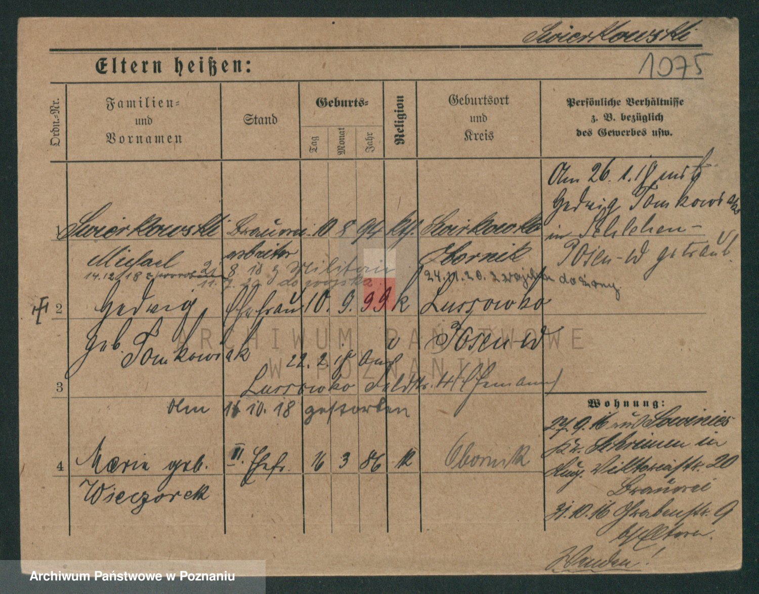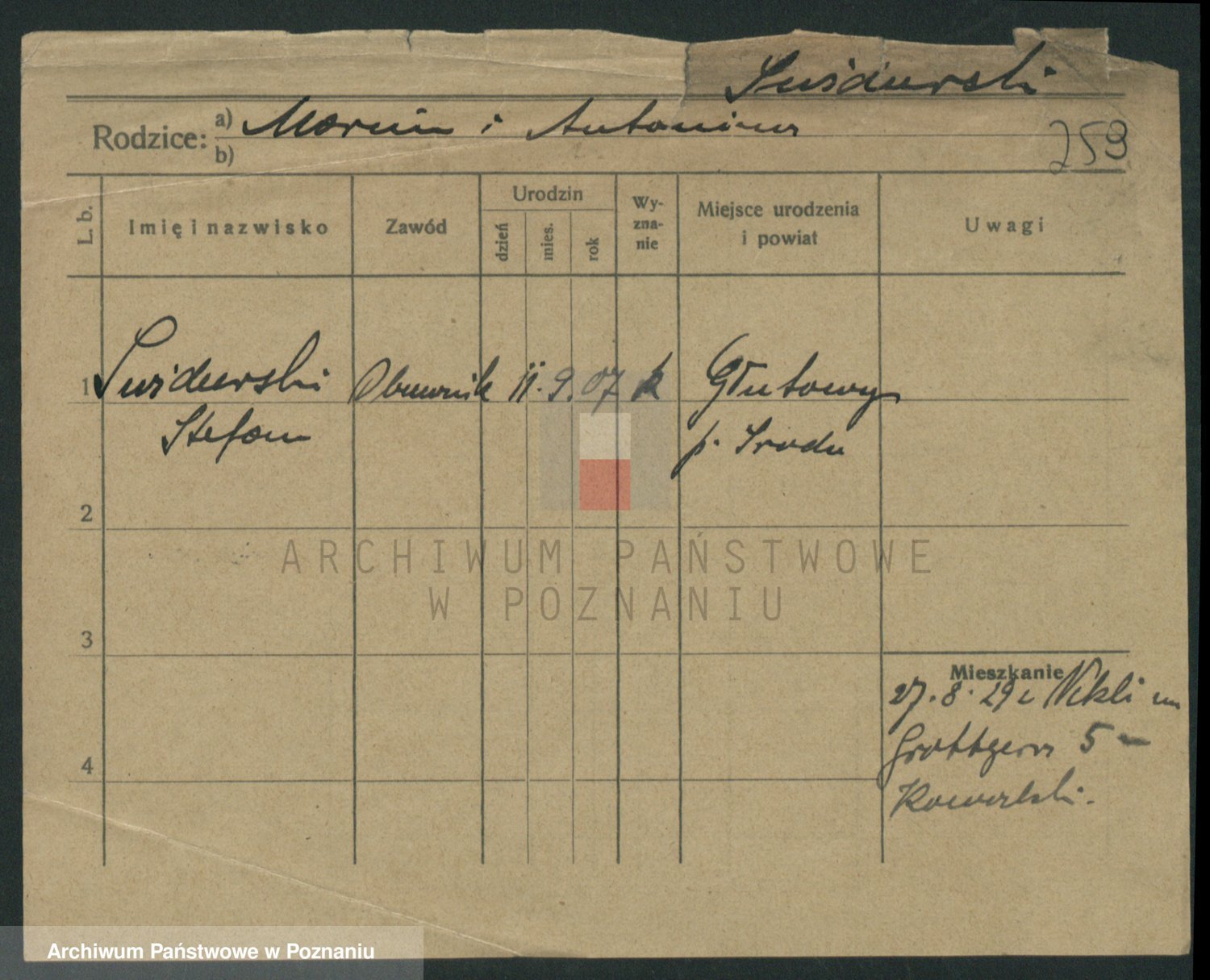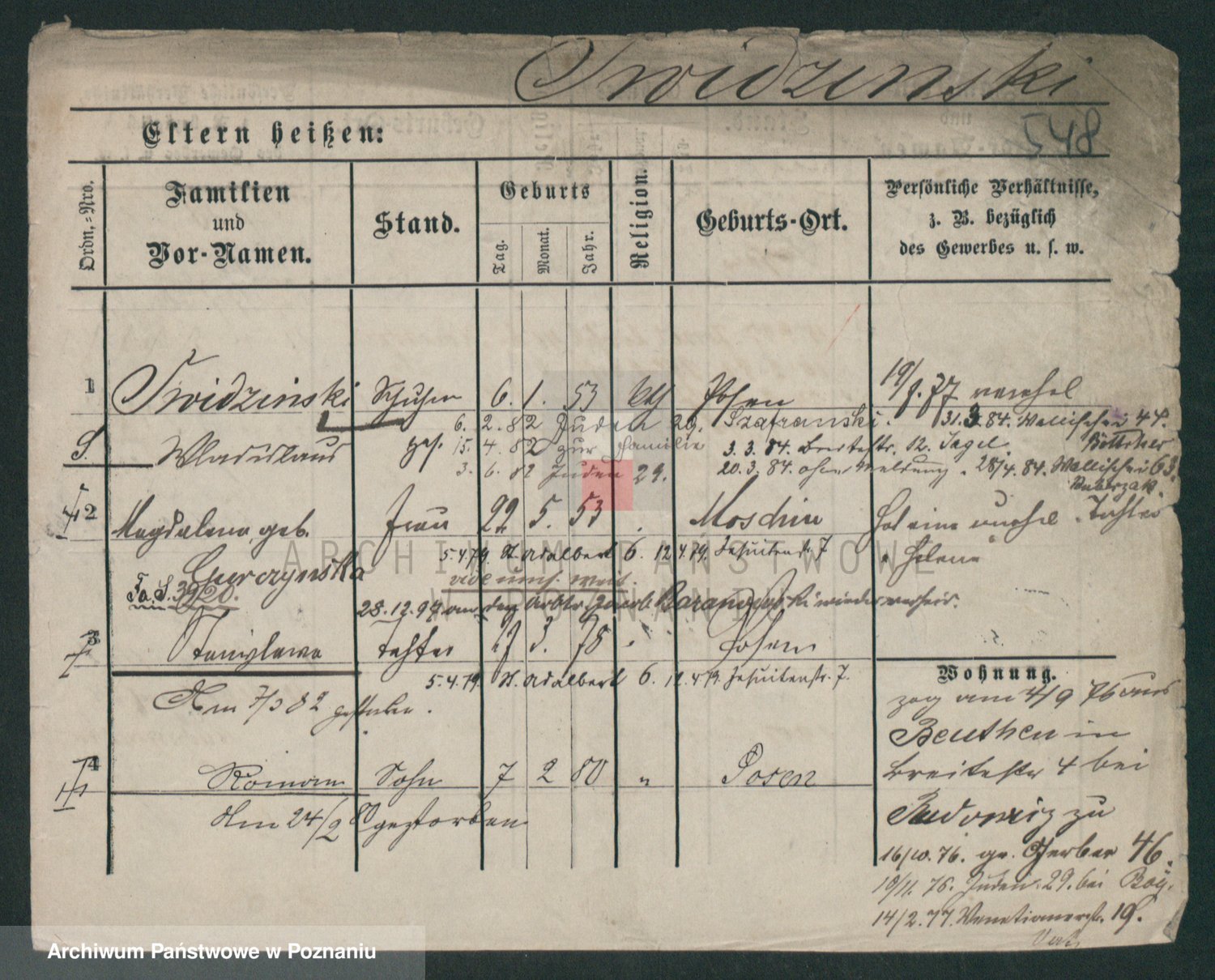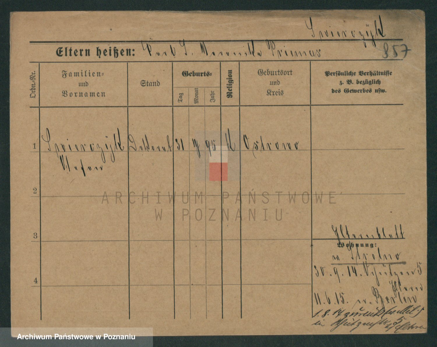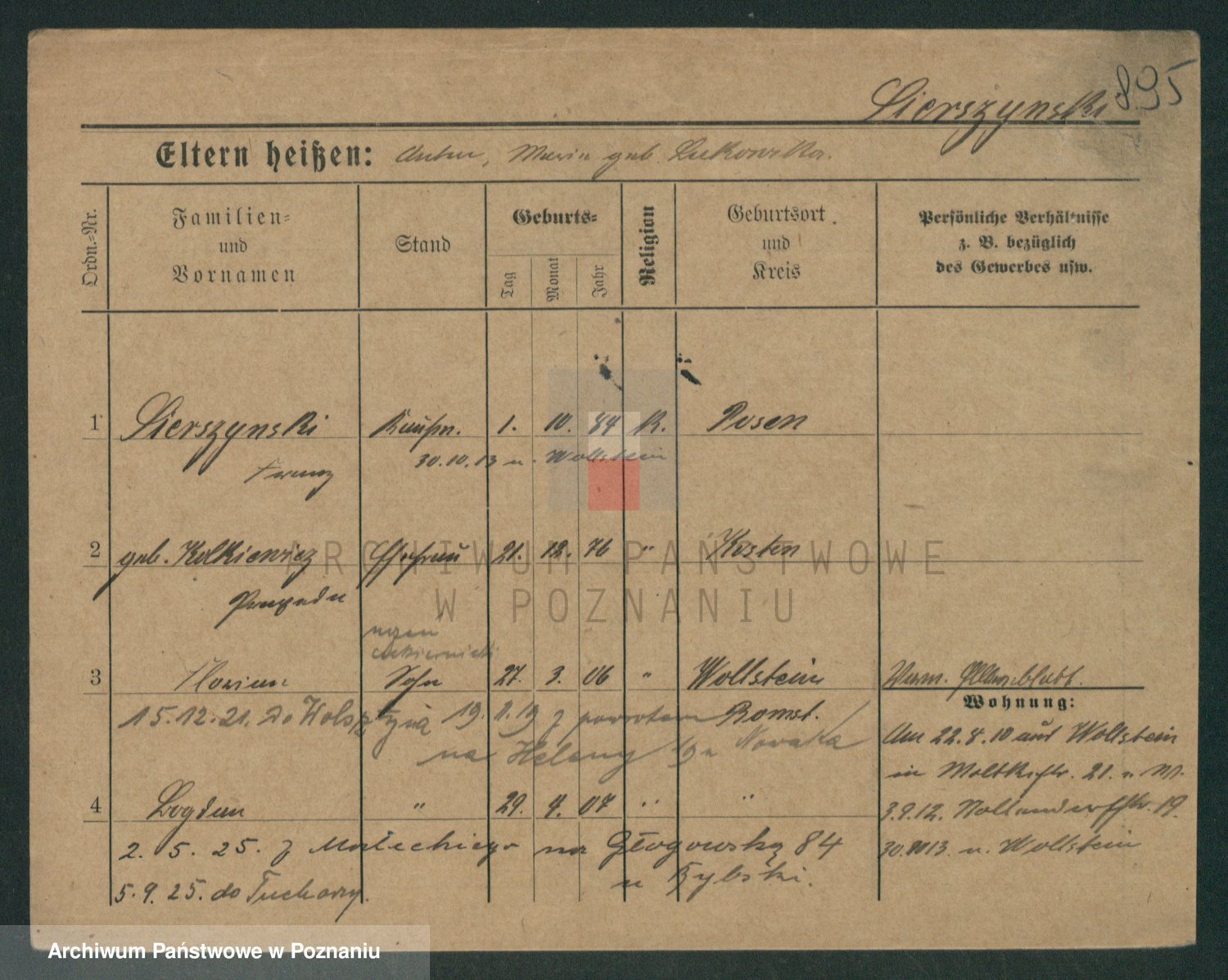 Podgląd karty osobowej dostępny jest po kliknięciu na nazwisko lub ikonkę karty. Można dokonywać powiększenia (ikony na górze) lub przechodzić między kolejnymi skanami (strzałki po bokach).