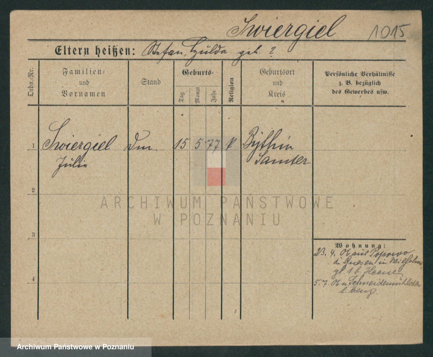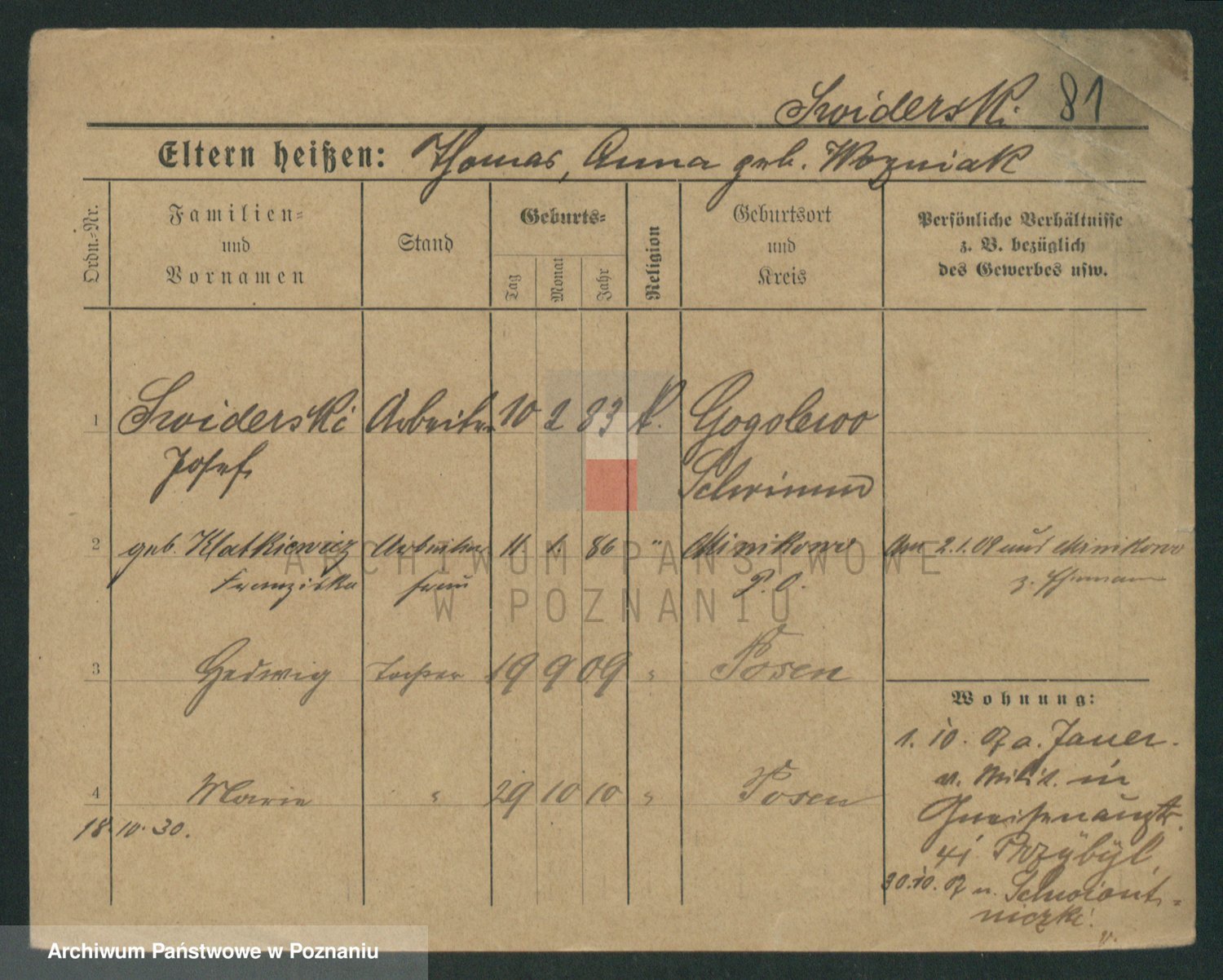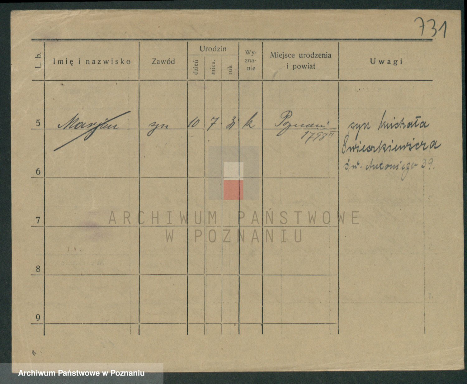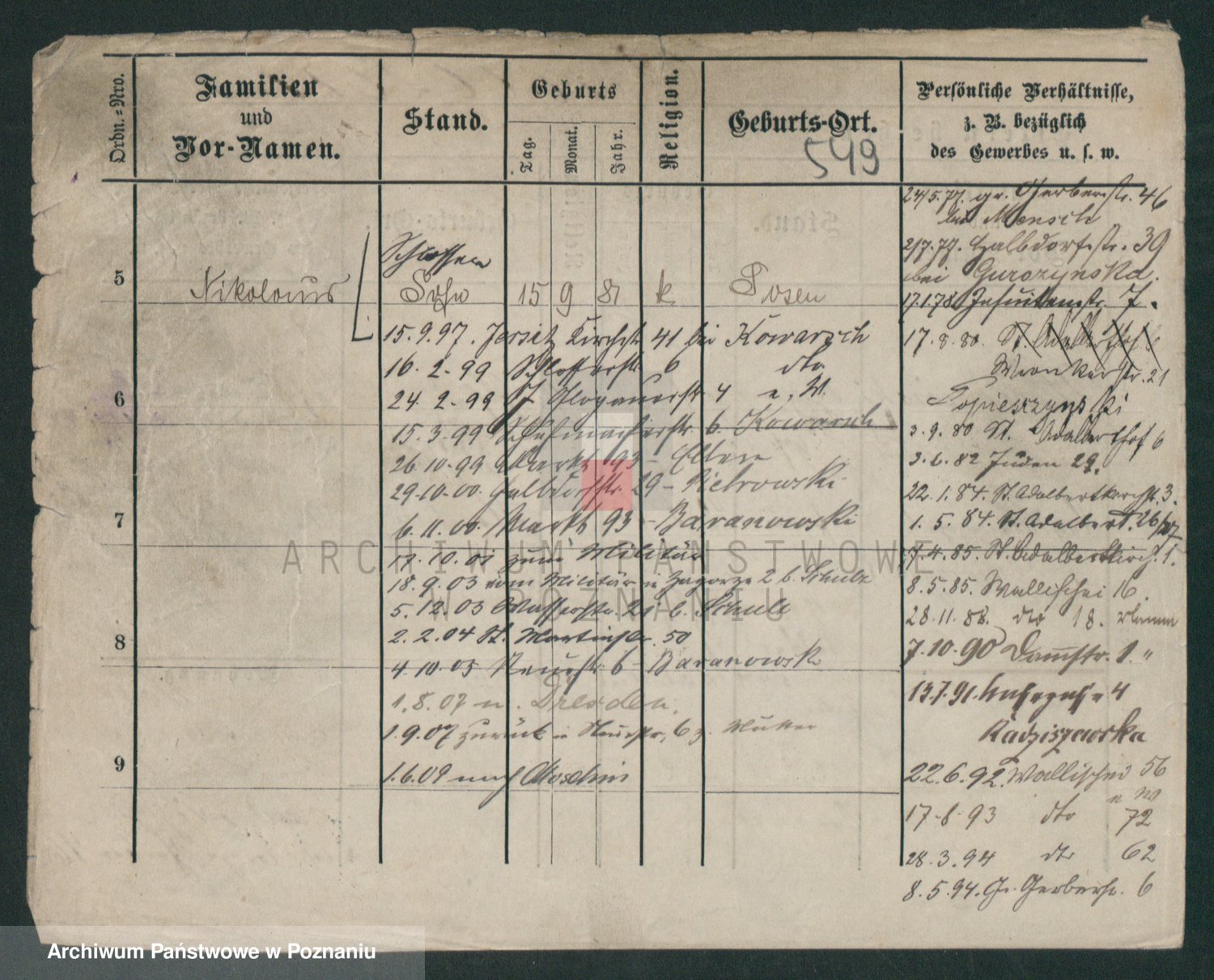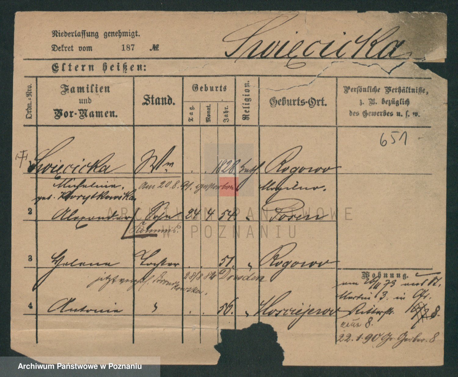 Podgląd karty osobowej dostępny jest po kliknięciu na nazwisko lub ikonkę karty. Można dokonywać powiększenia (ikony na górze) lub przechodzić między kolejnymi skanami (strzałki po bokach).