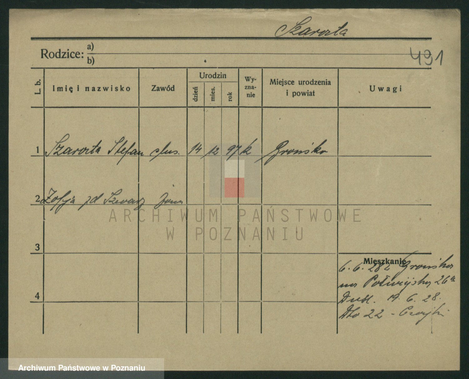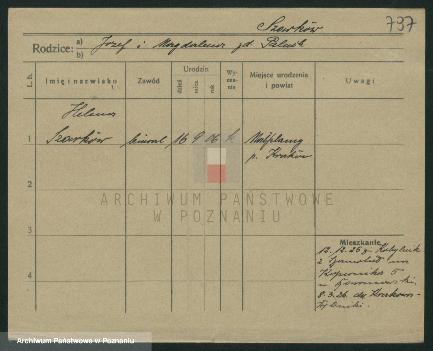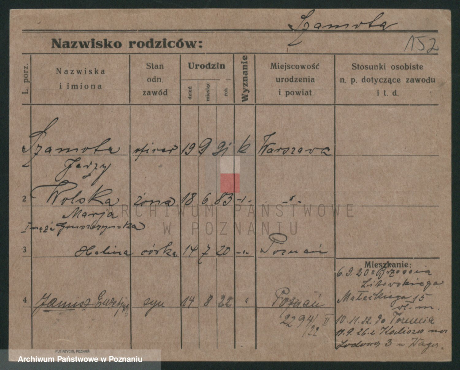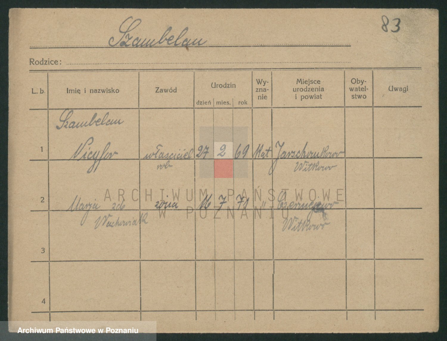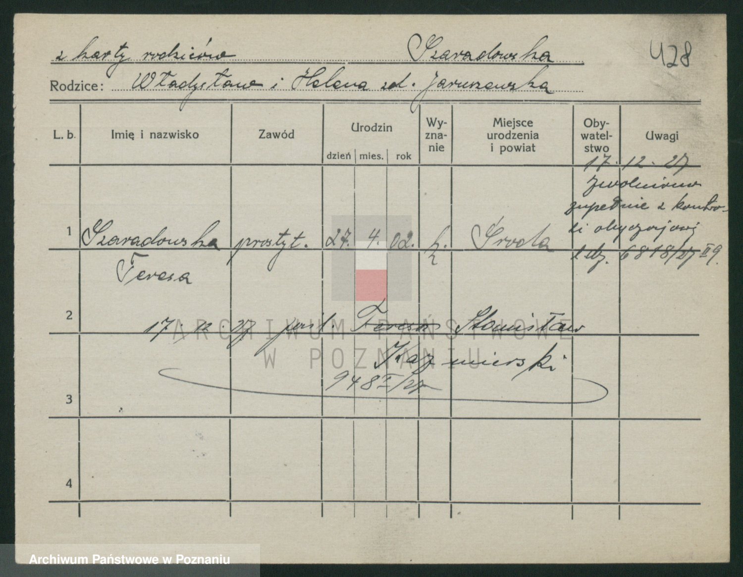 Podgląd karty osobowej dostępny jest po kliknięciu na nazwisko lub ikonkę karty. Można dokonywać powiększenia (ikony na górze) lub przechodzić między kolejnymi skanami (strzałki po bokach).