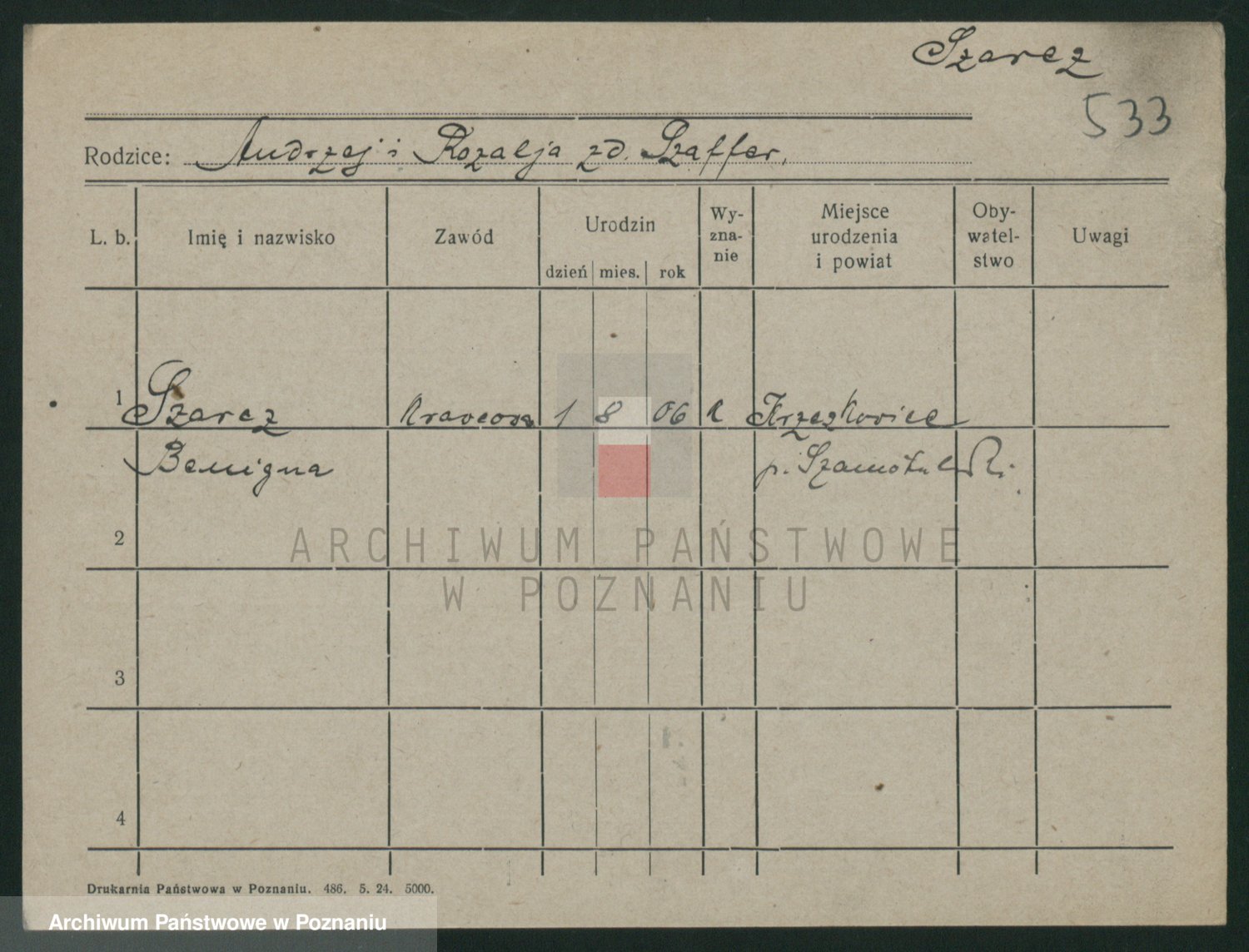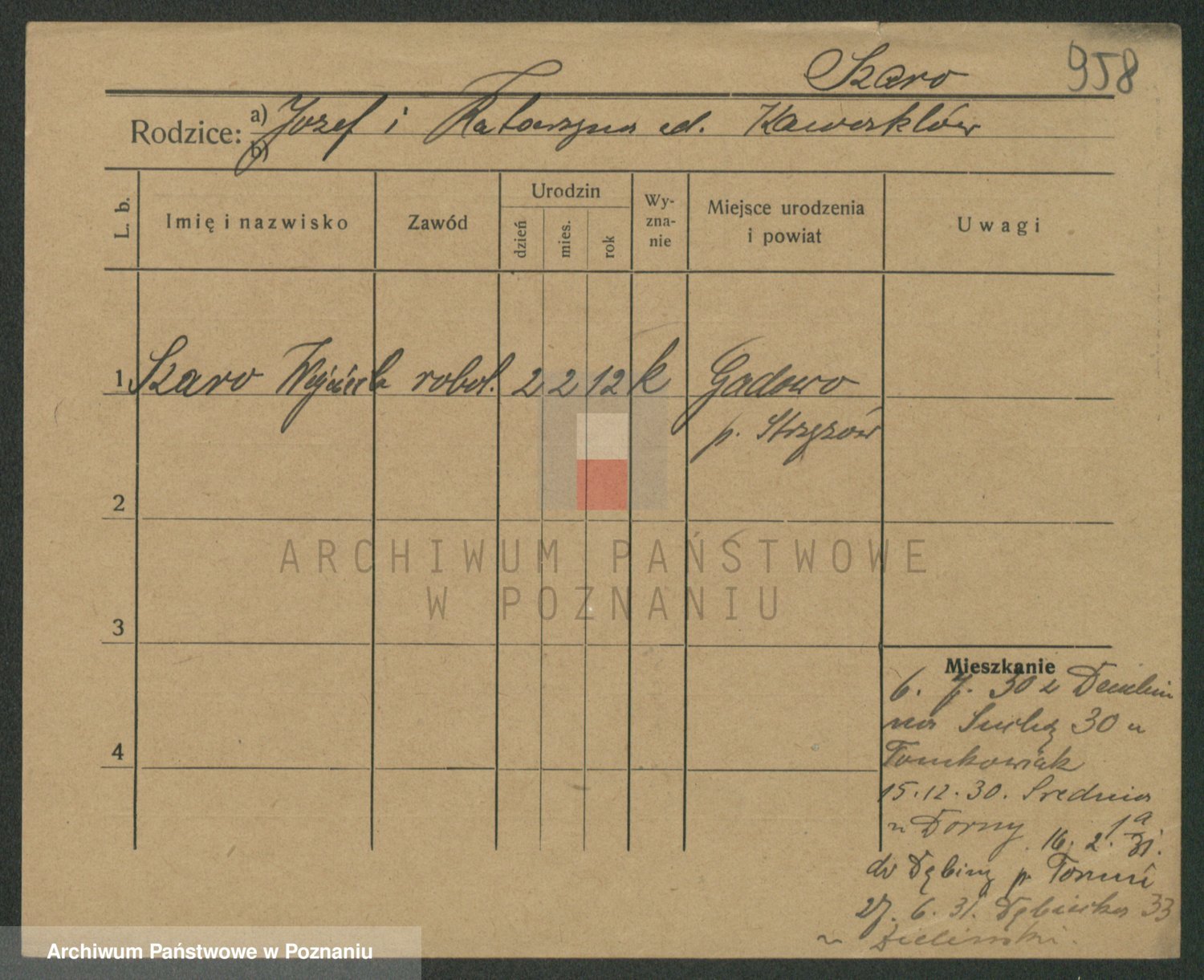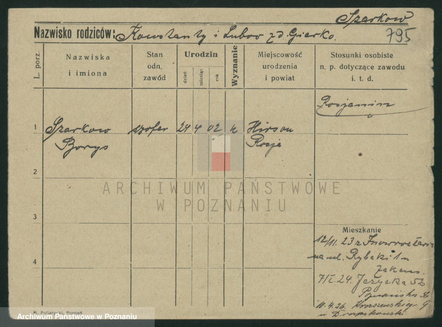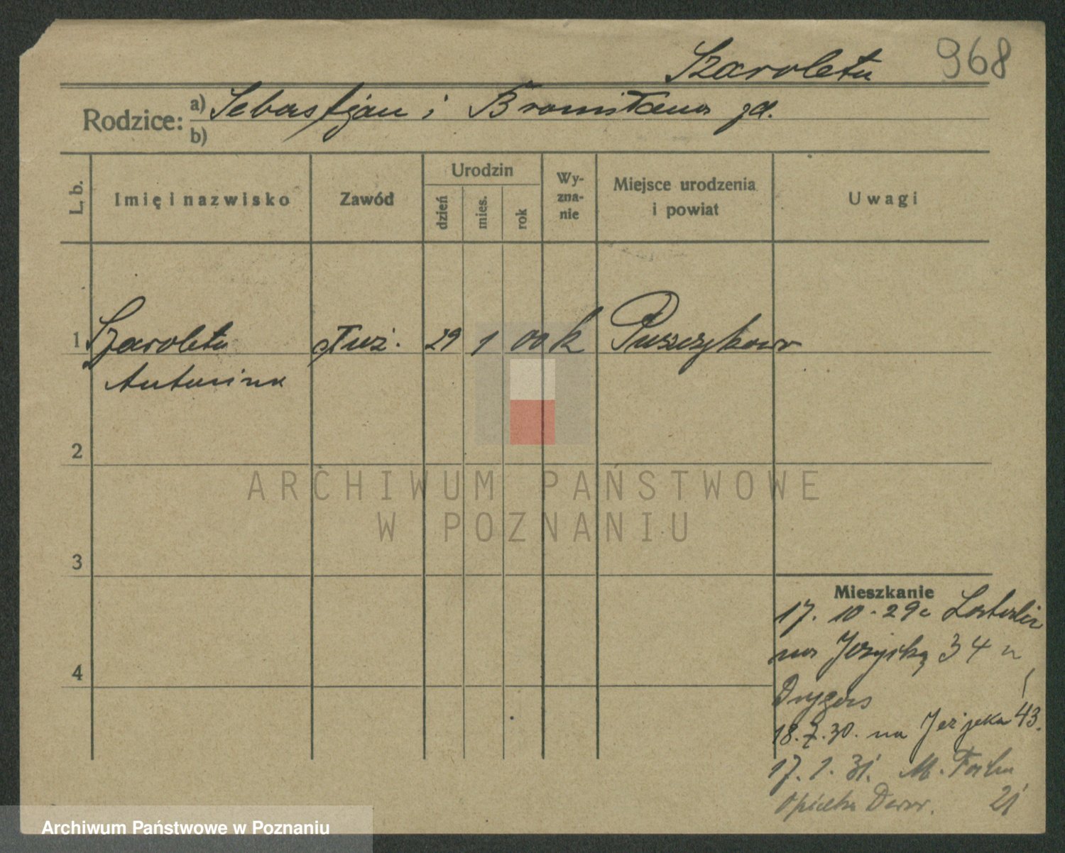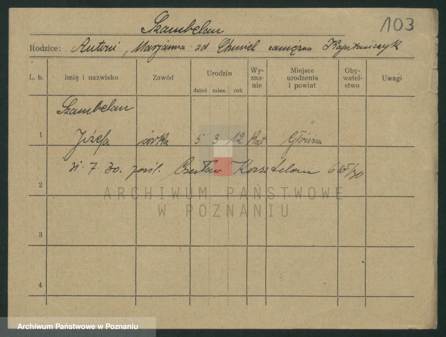 Podgląd karty osobowej dostępny jest po kliknięciu na nazwisko lub ikonkę karty. Można dokonywać powiększenia (ikony na górze) lub przechodzić między kolejnymi skanami (strzałki po bokach).
