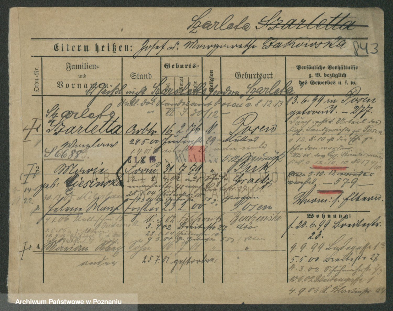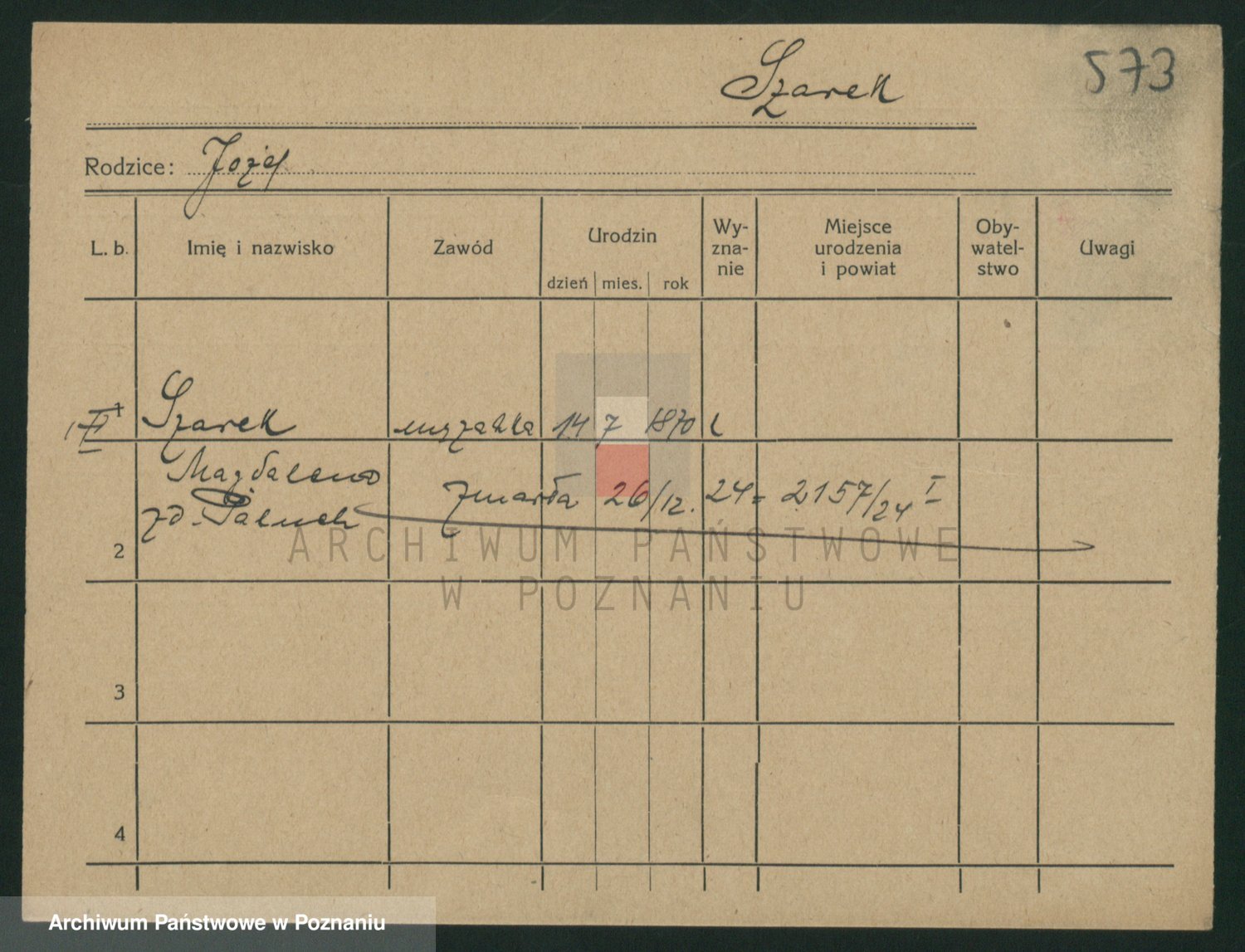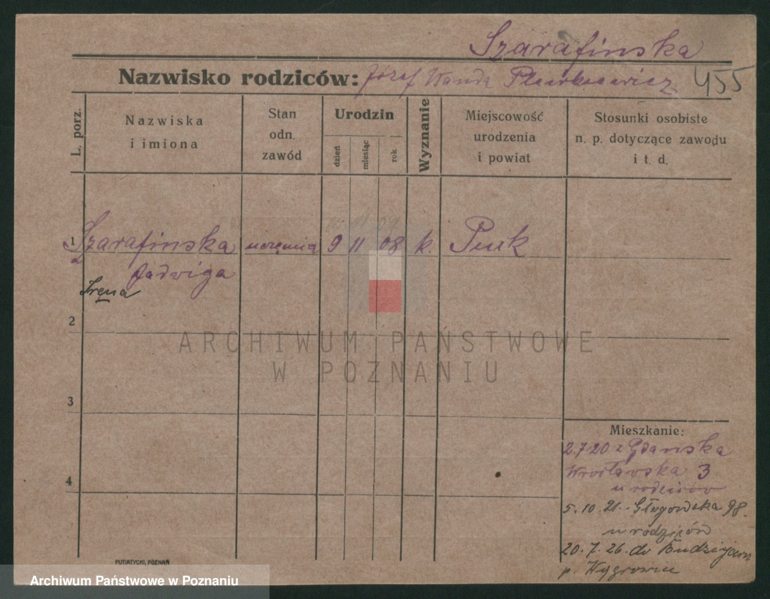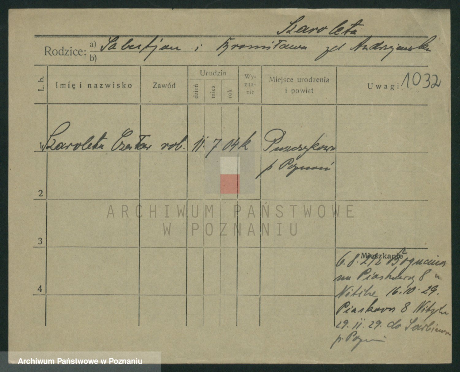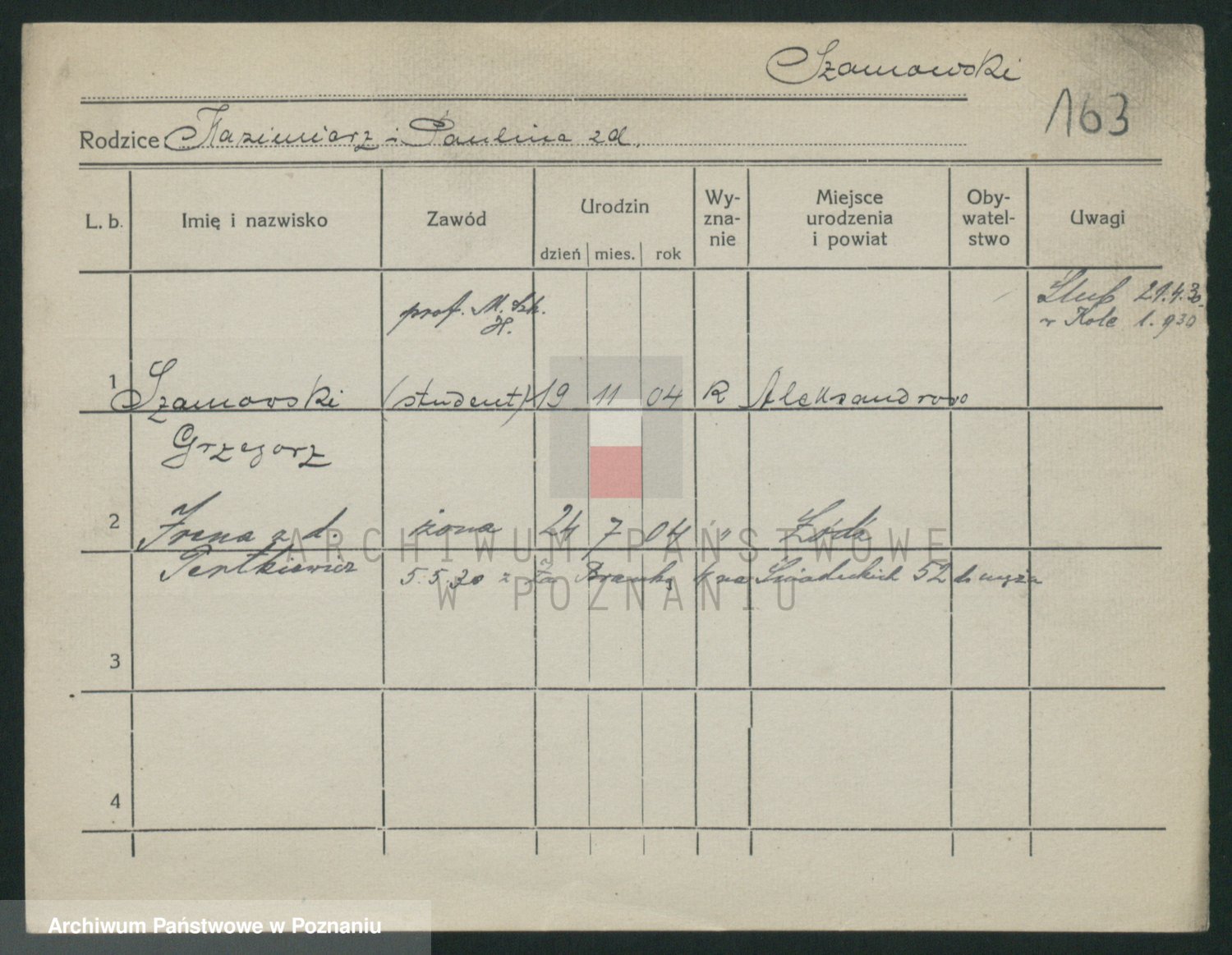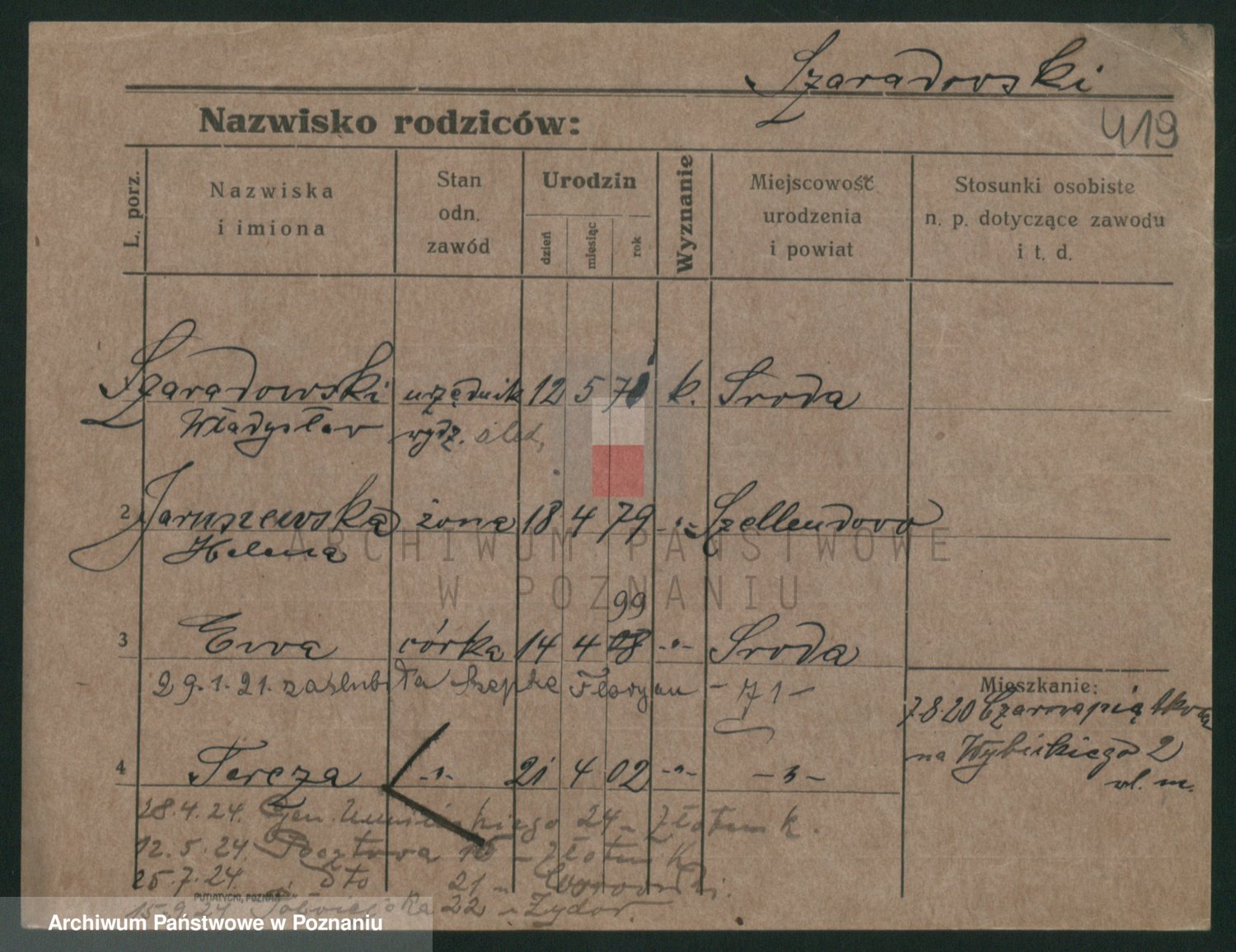 Podgląd karty osobowej dostępny jest po kliknięciu na nazwisko lub ikonkę karty. Można dokonywać powiększenia (ikony na górze) lub przechodzić między kolejnymi skanami (strzałki po bokach).