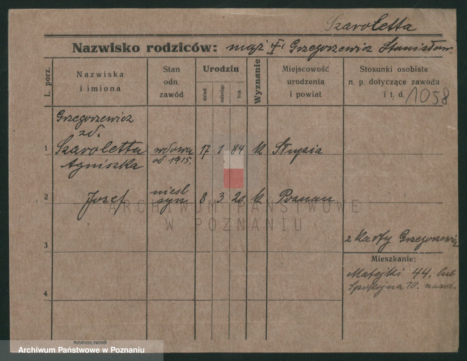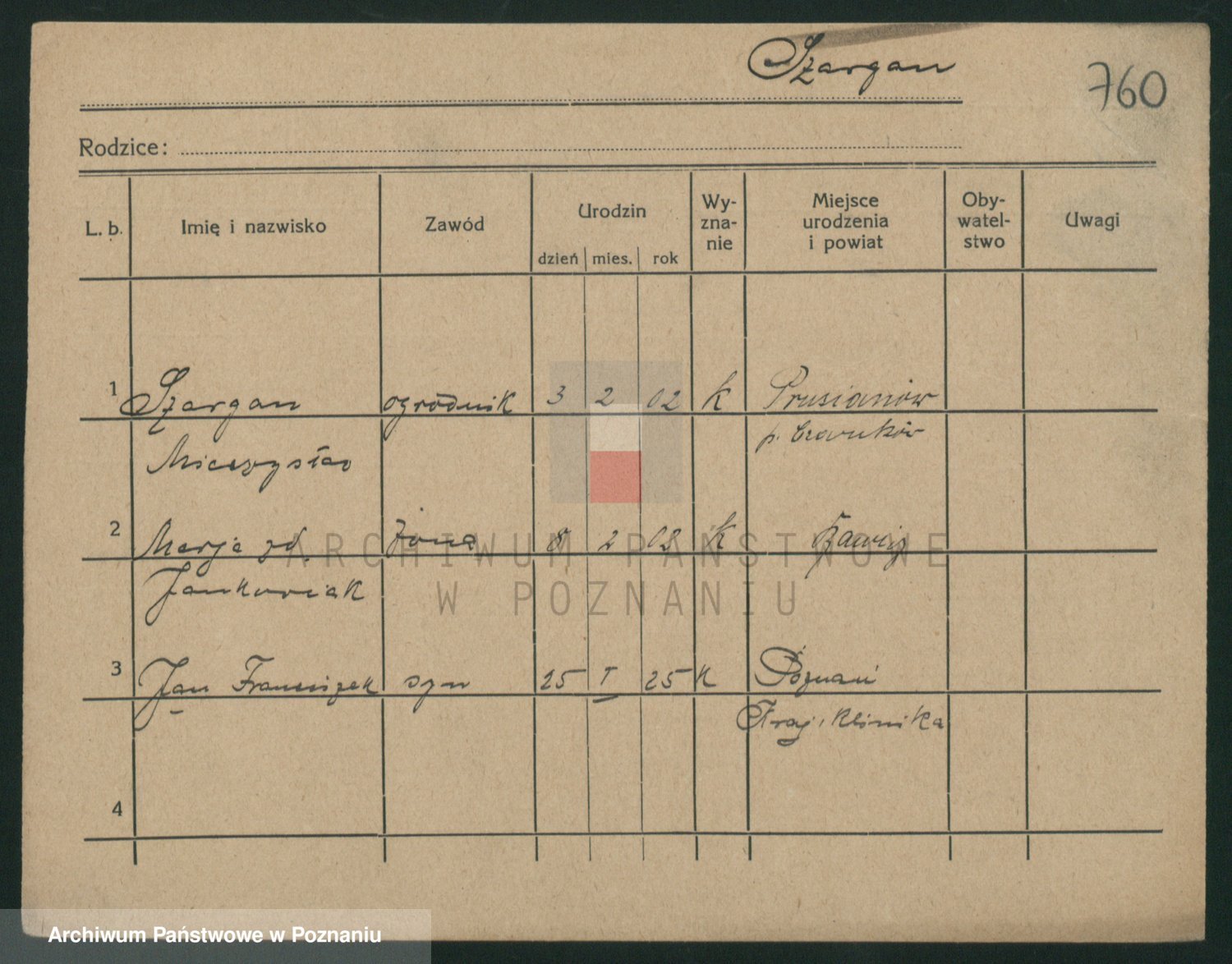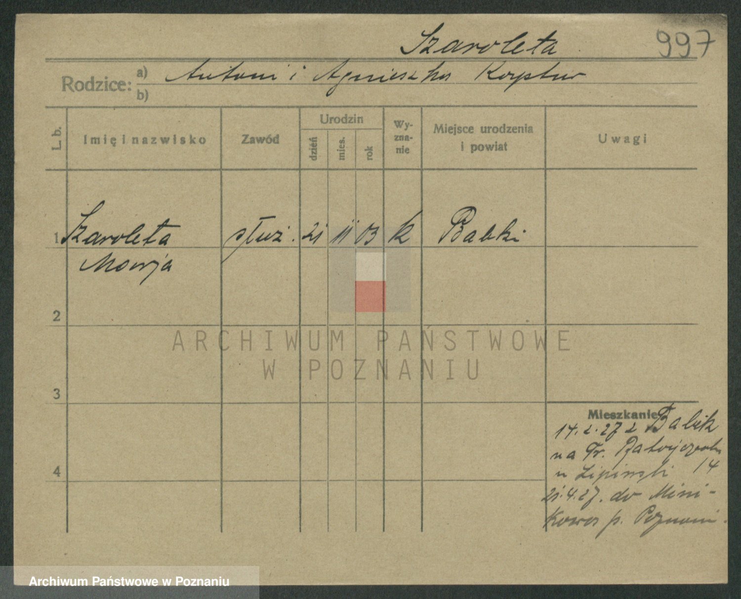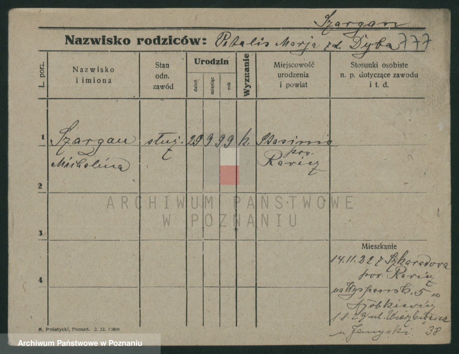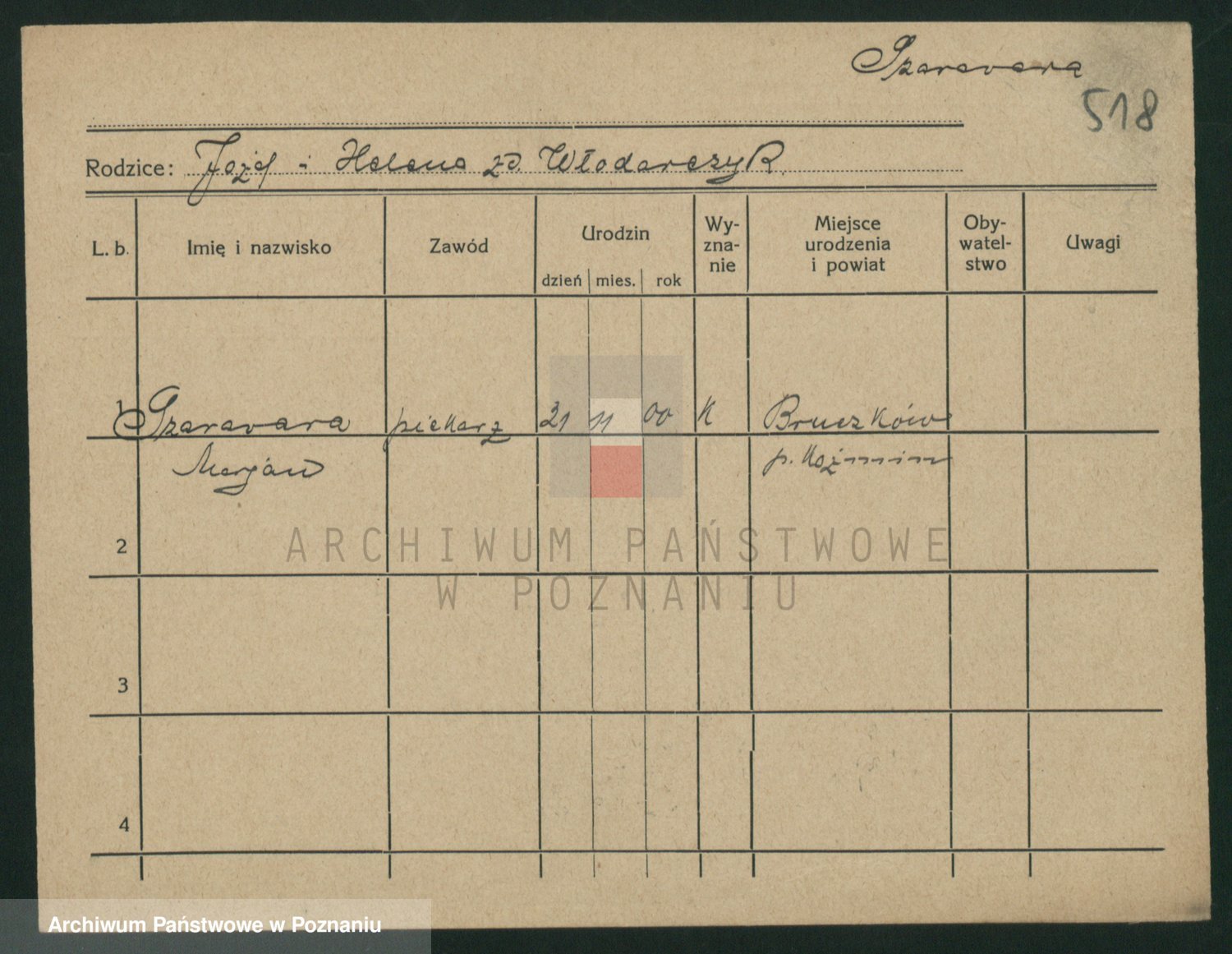 Podgląd karty osobowej dostępny jest po kliknięciu na nazwisko lub ikonkę karty. Można dokonywać powiększenia (ikony na górze) lub przechodzić między kolejnymi skanami (strzałki po bokach).