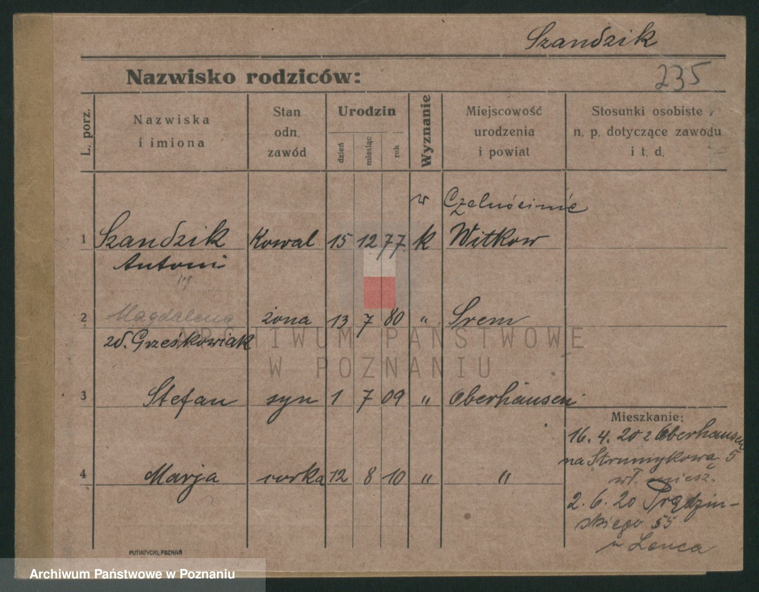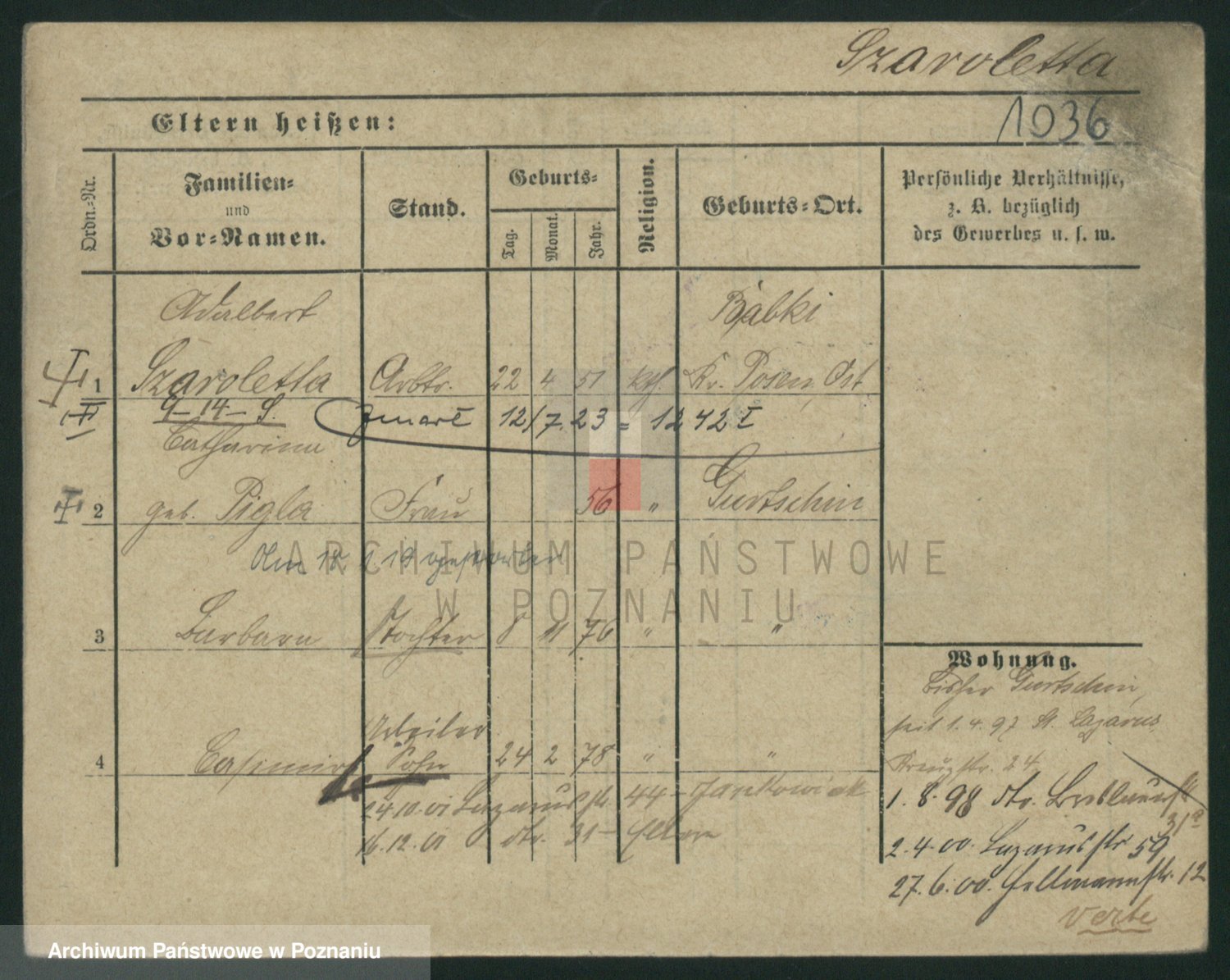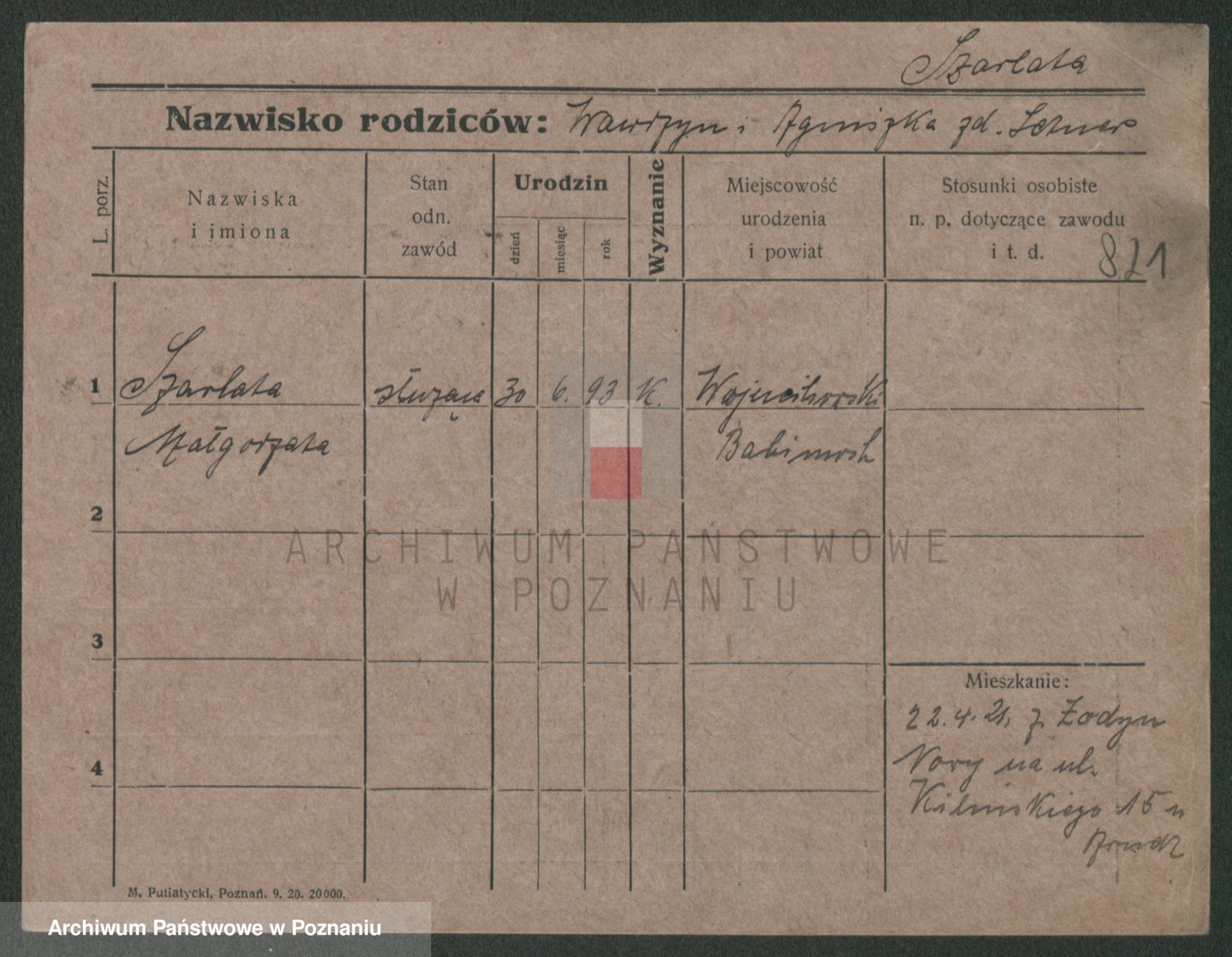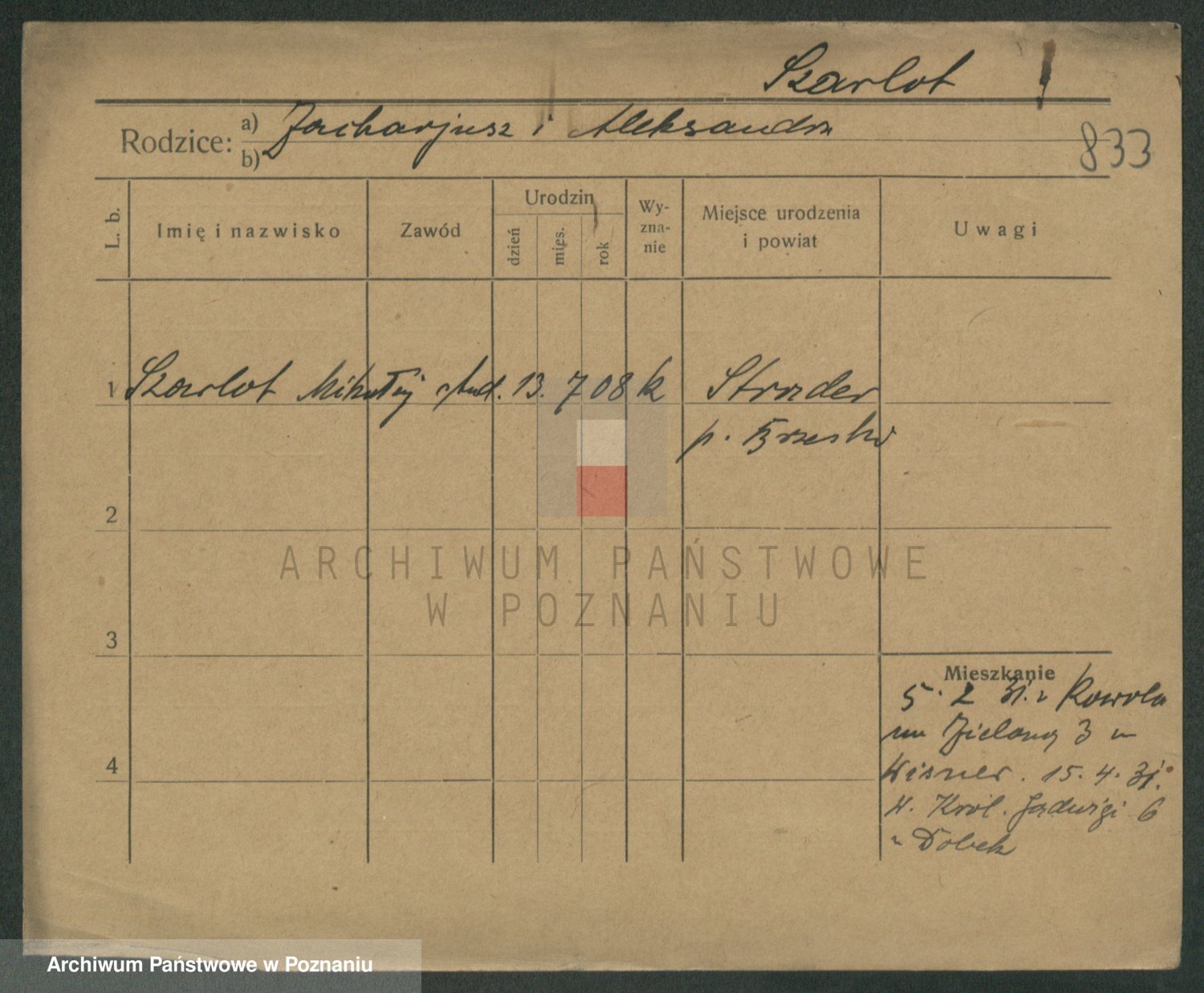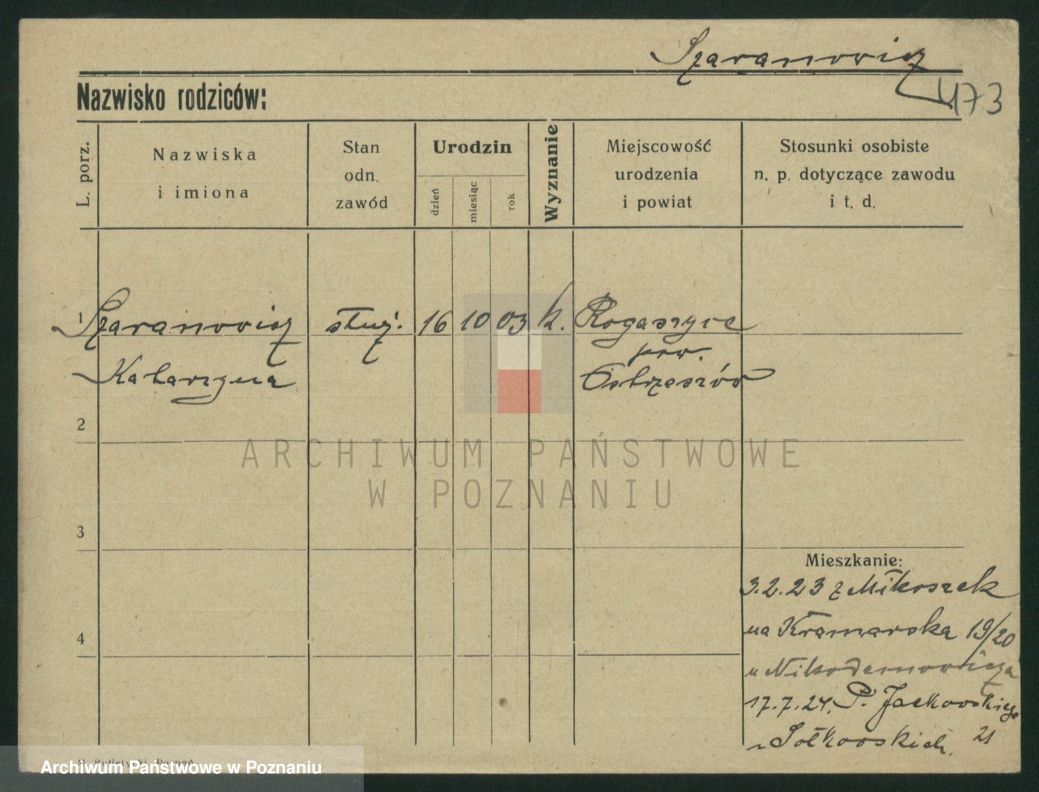 Podgląd karty osobowej dostępny jest po kliknięciu na nazwisko lub ikonkę karty. Można dokonywać powiększenia (ikony na górze) lub przechodzić między kolejnymi skanami (strzałki po bokach).