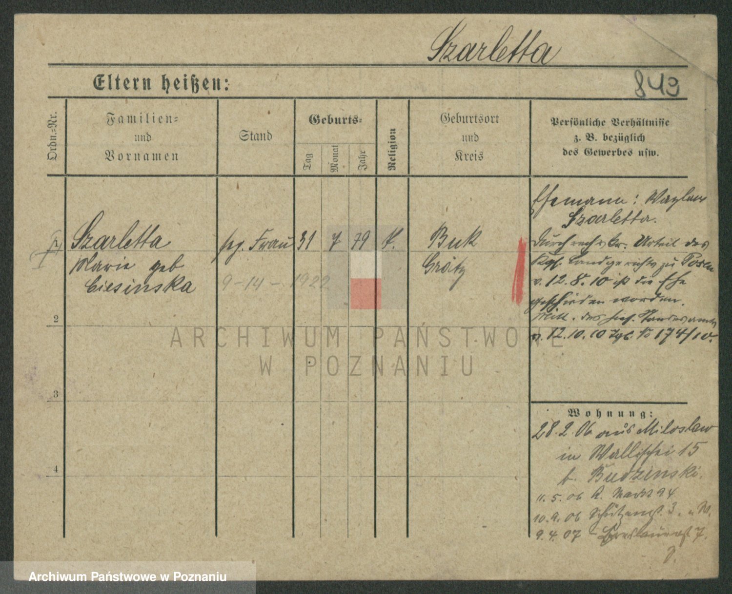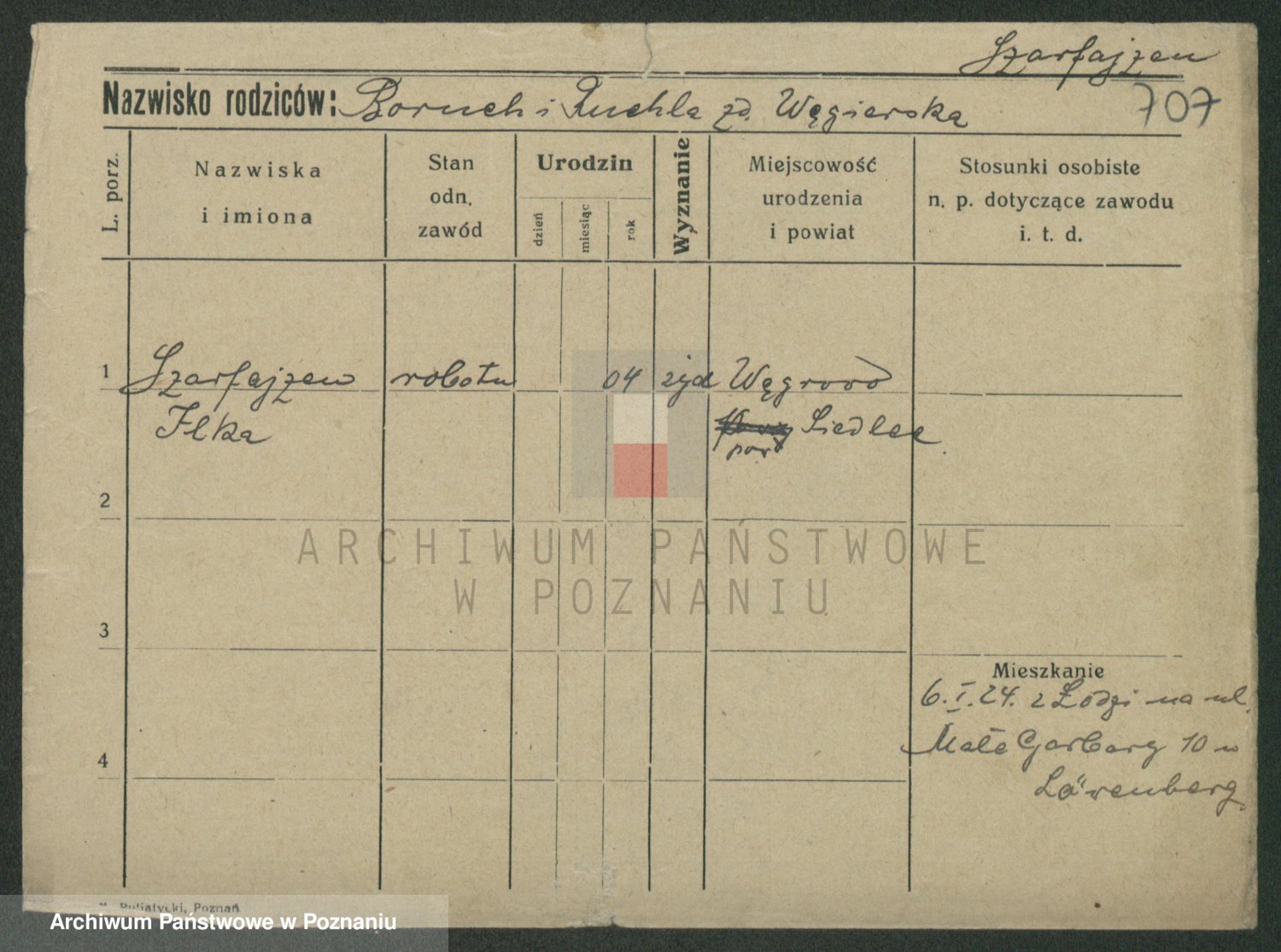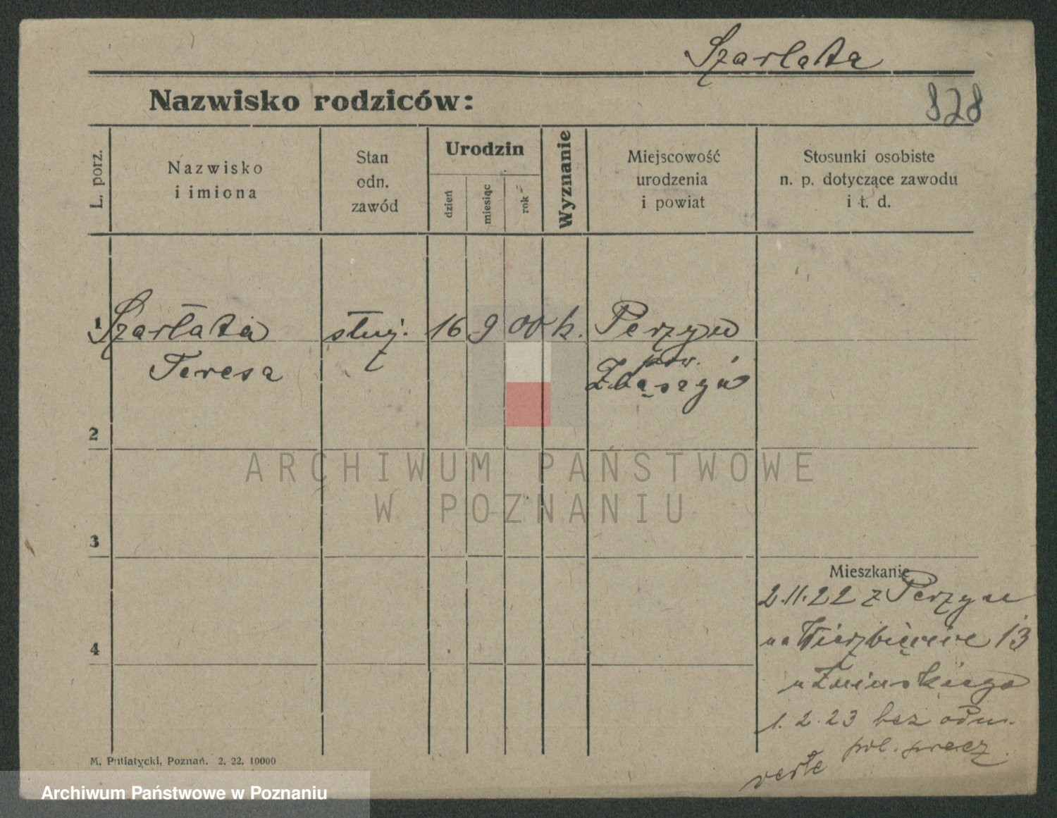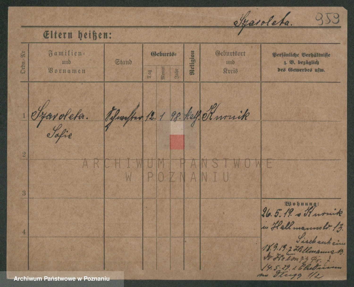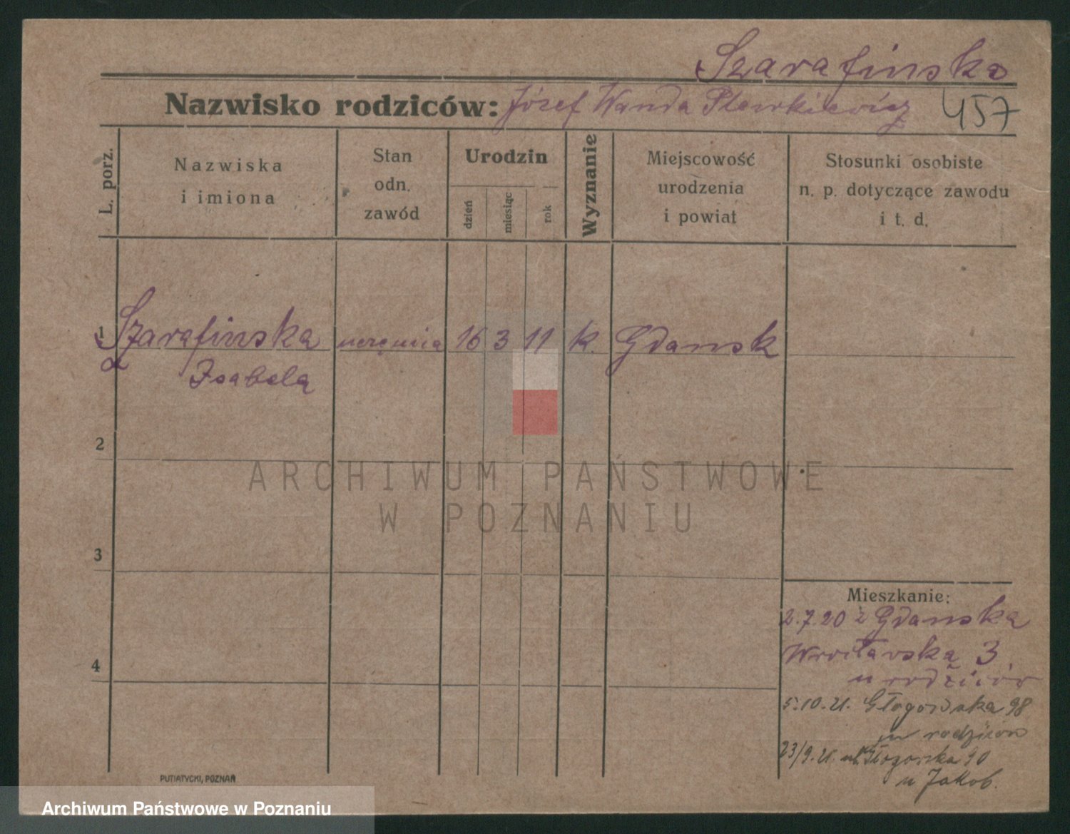 Podgląd karty osobowej dostępny jest po kliknięciu na nazwisko lub ikonkę karty. Można dokonywać powiększenia (ikony na górze) lub przechodzić między kolejnymi skanami (strzałki po bokach).