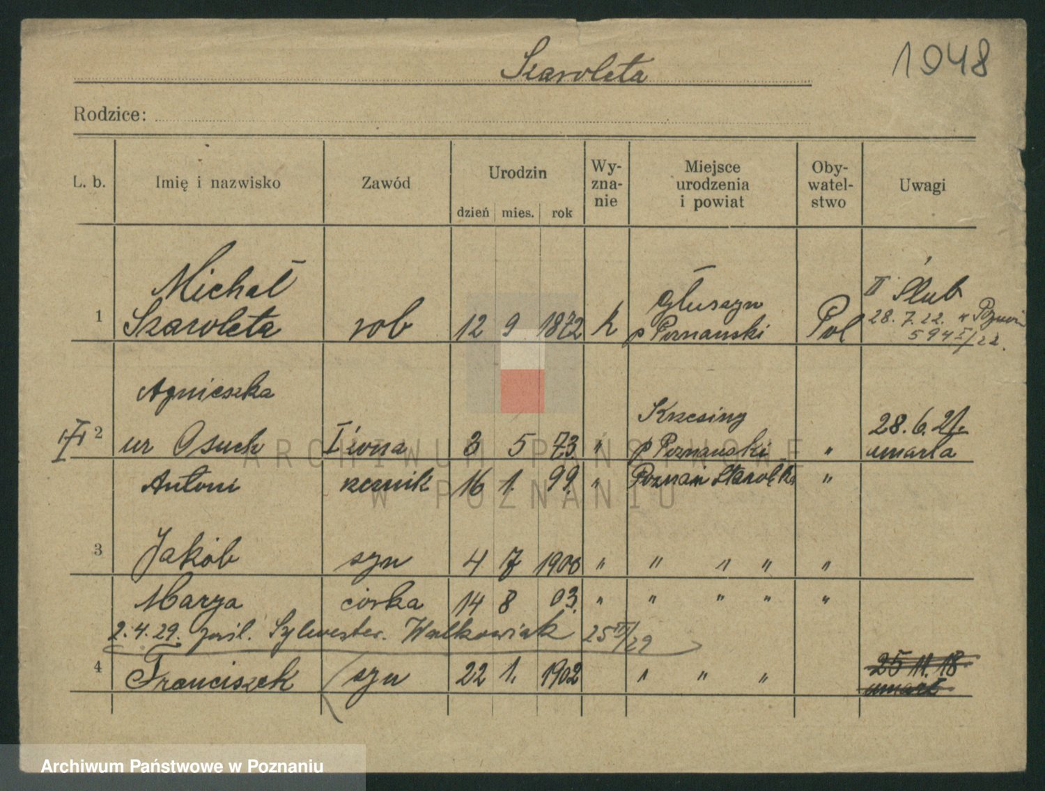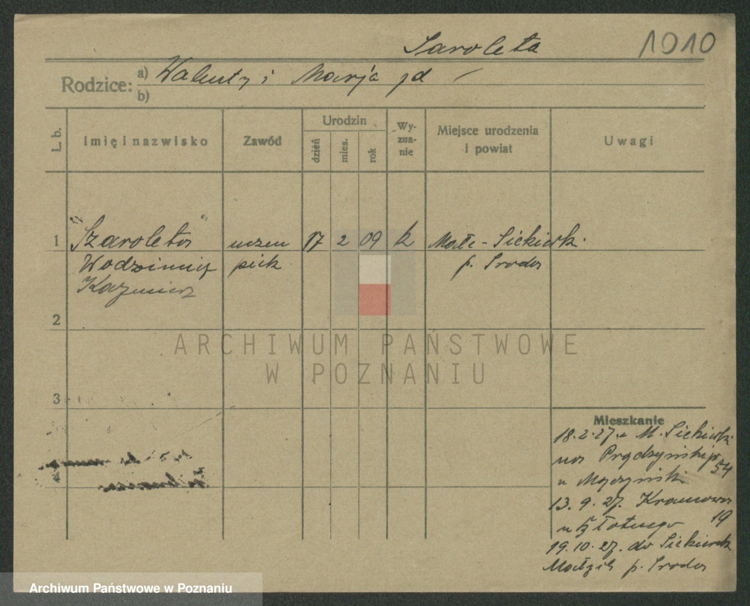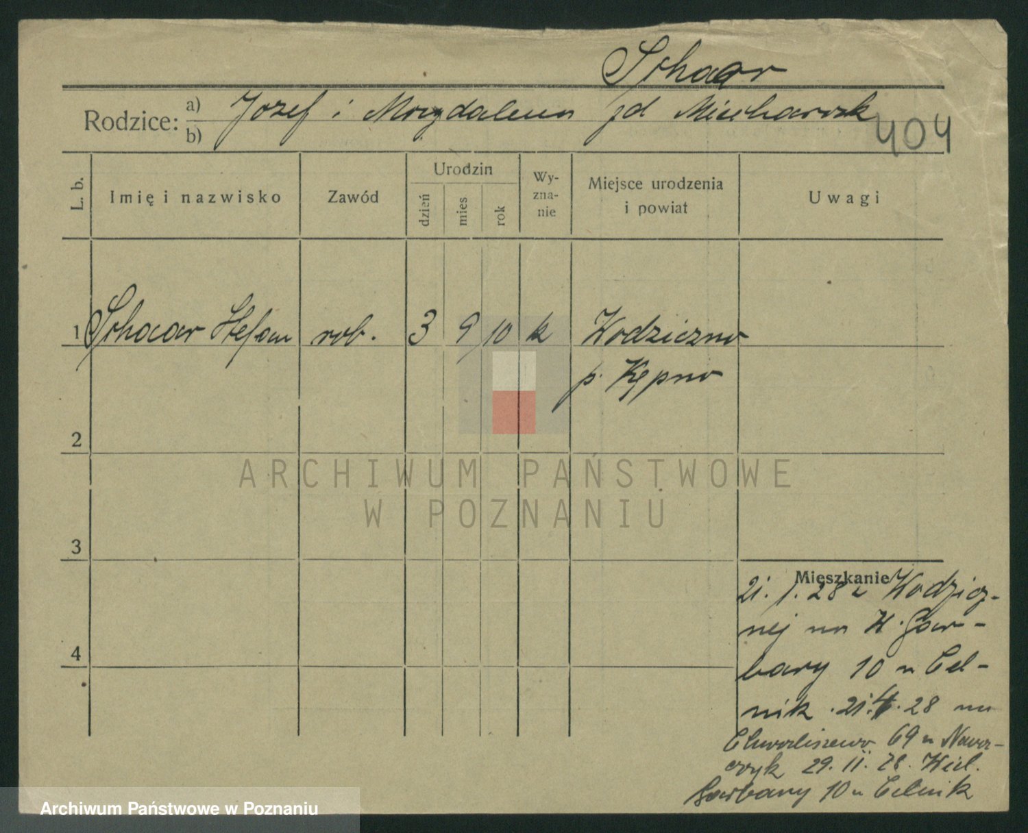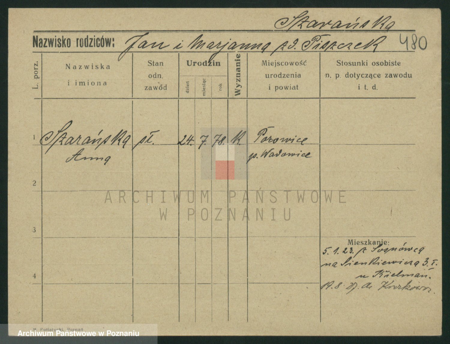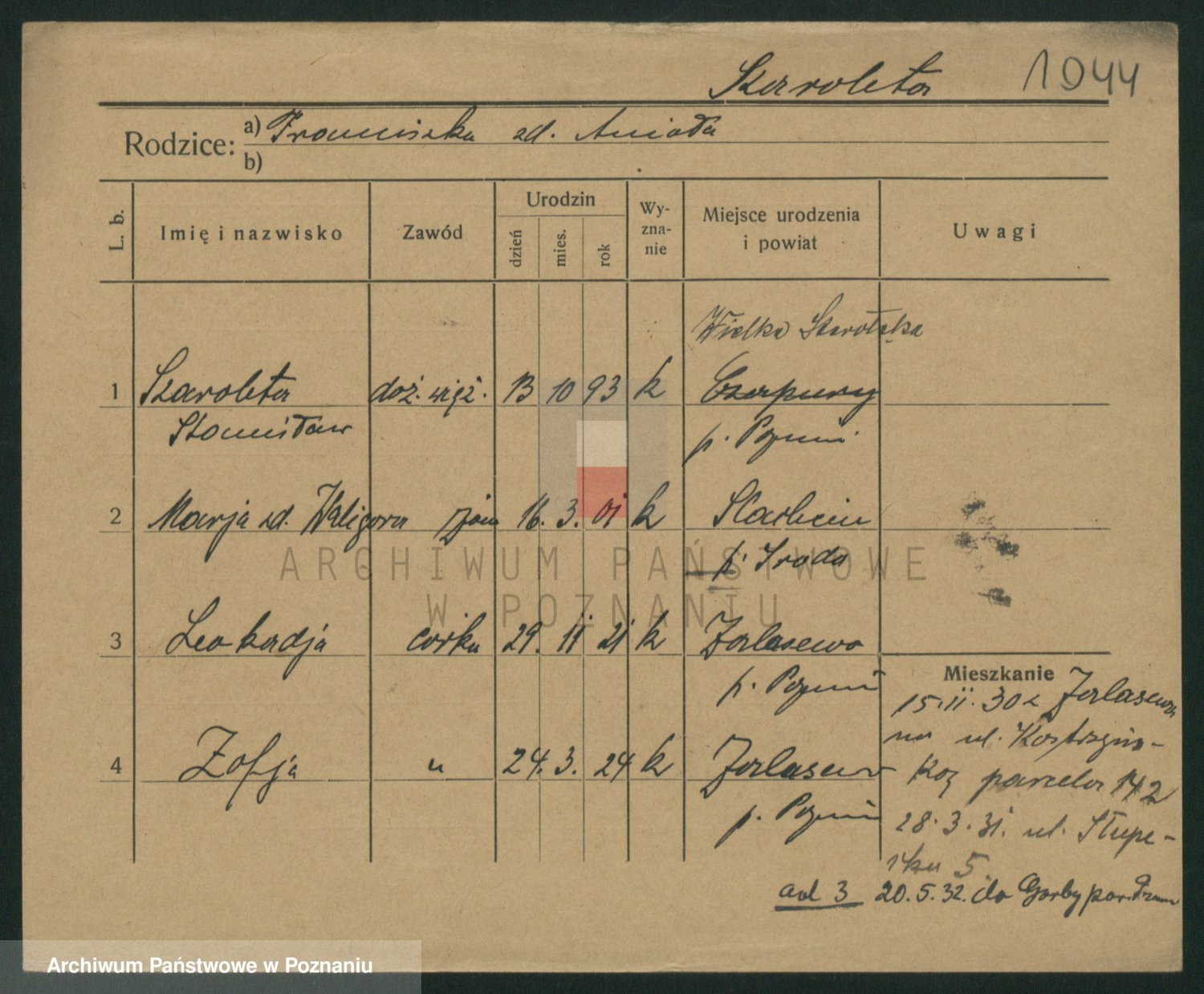 Podgląd karty osobowej dostępny jest po kliknięciu na nazwisko lub ikonkę karty. Można dokonywać powiększenia (ikony na górze) lub przechodzić między kolejnymi skanami (strzałki po bokach).