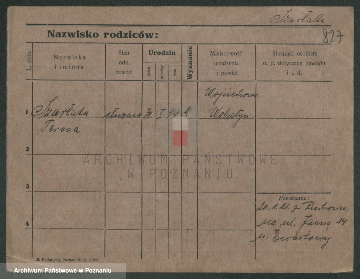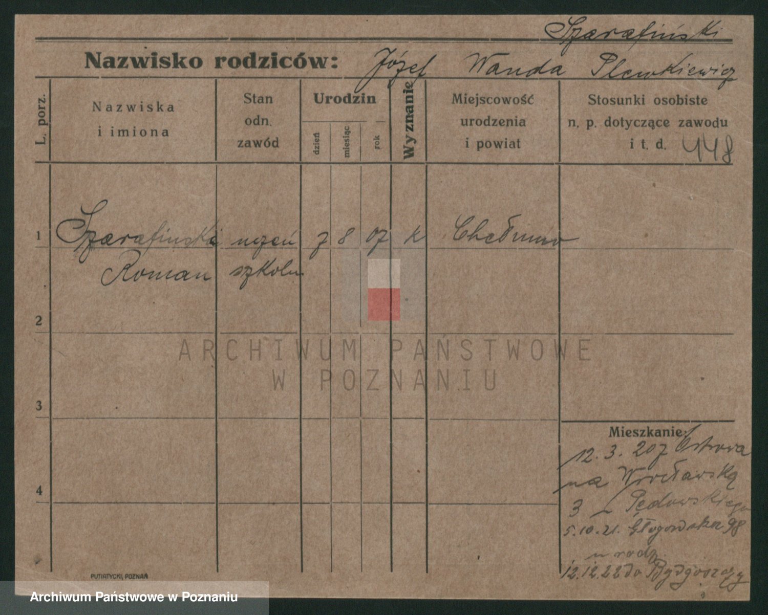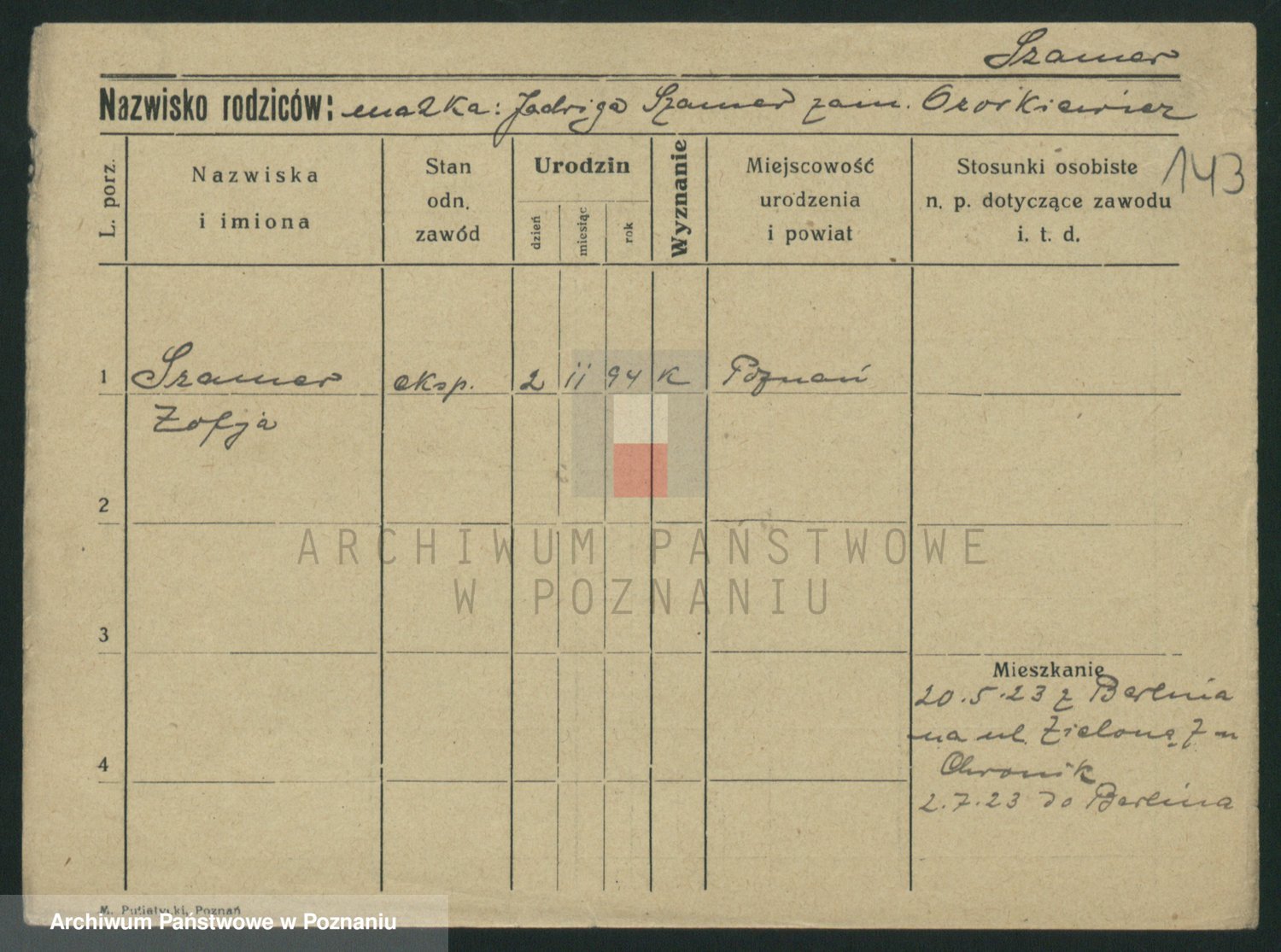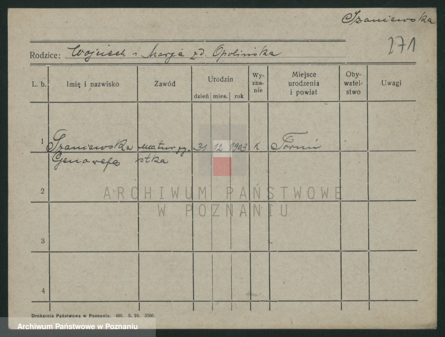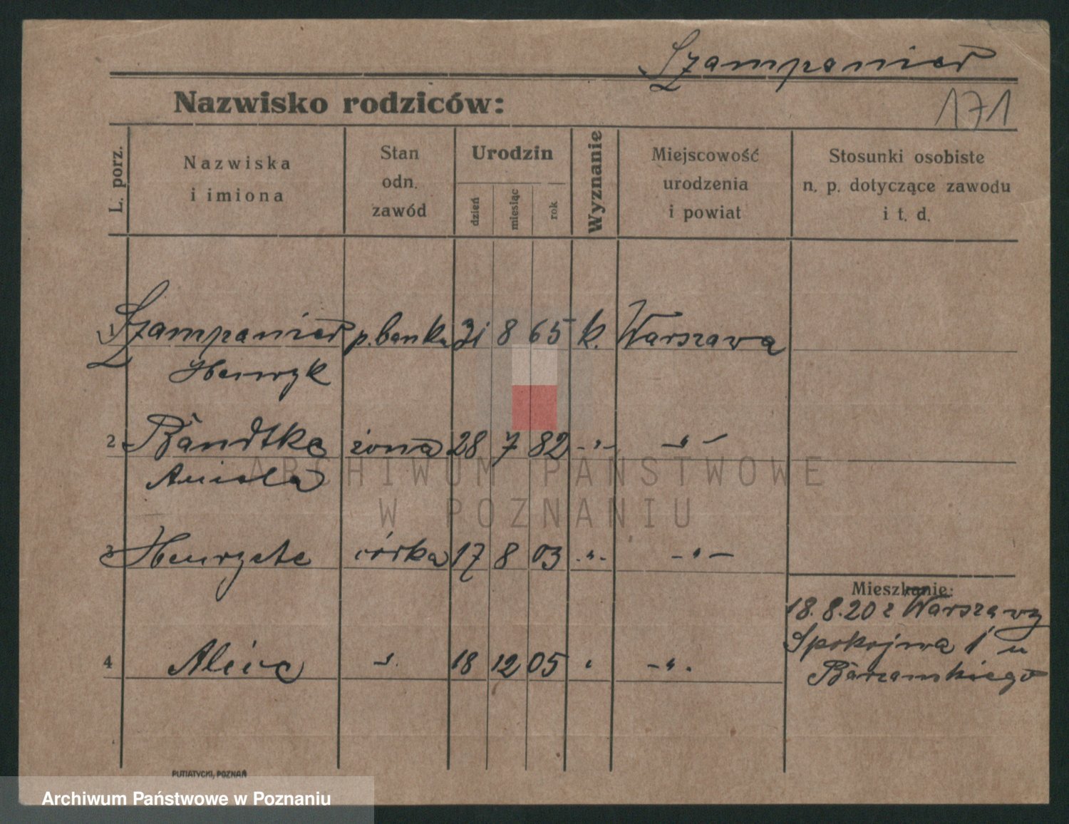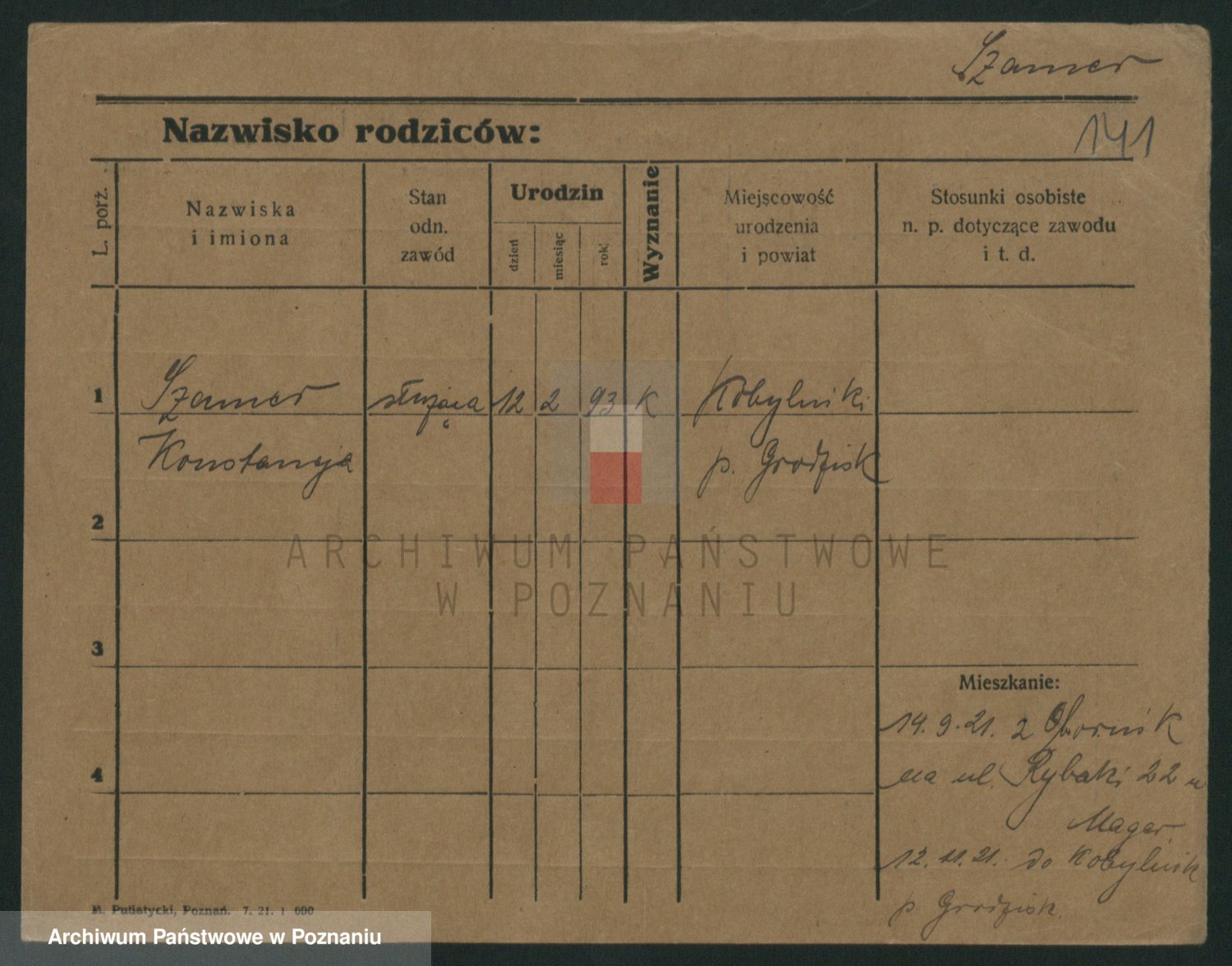 Podgląd karty osobowej dostępny jest po kliknięciu na nazwisko lub ikonkę karty. Można dokonywać powiększenia (ikony na górze) lub przechodzić między kolejnymi skanami (strzałki po bokach).