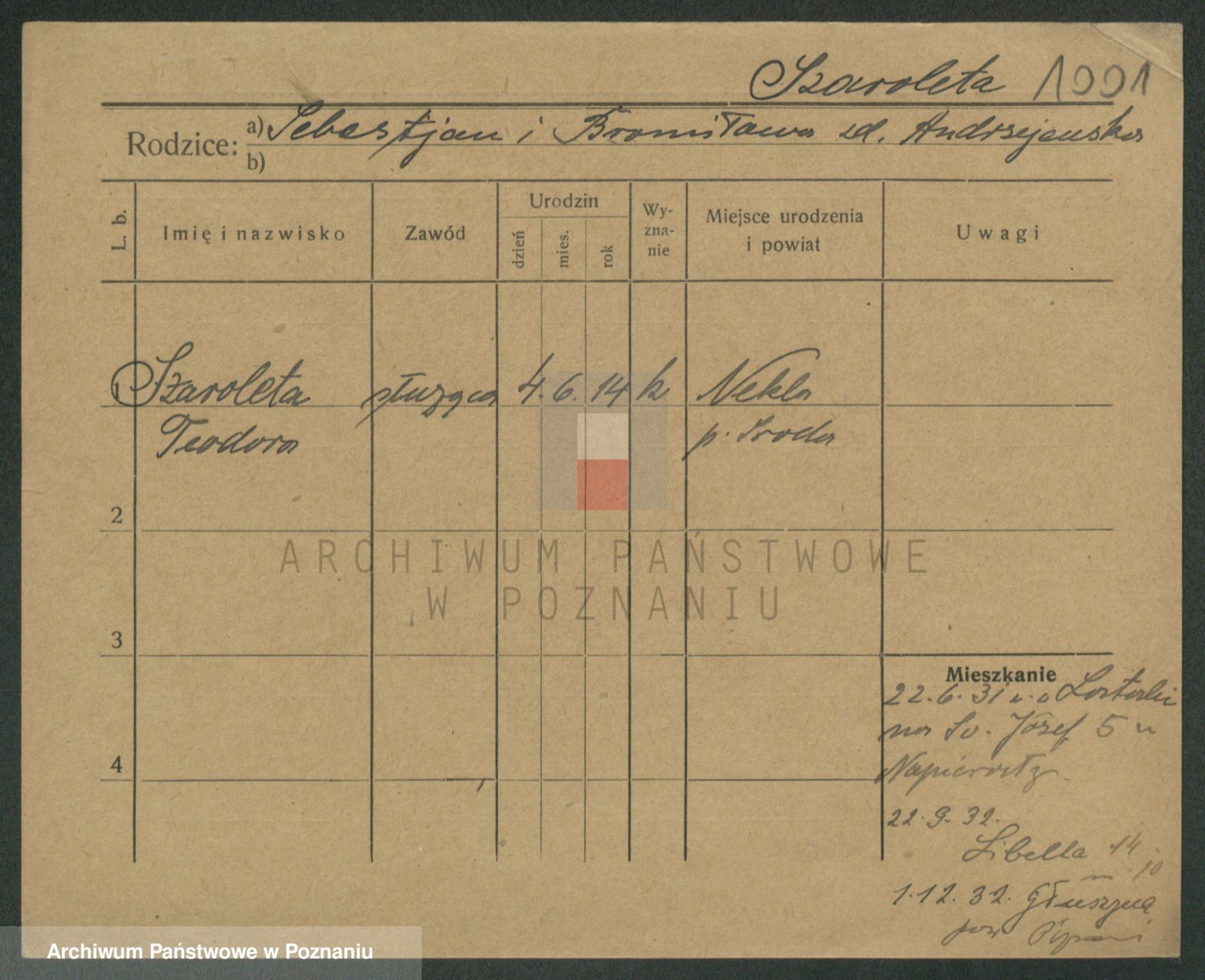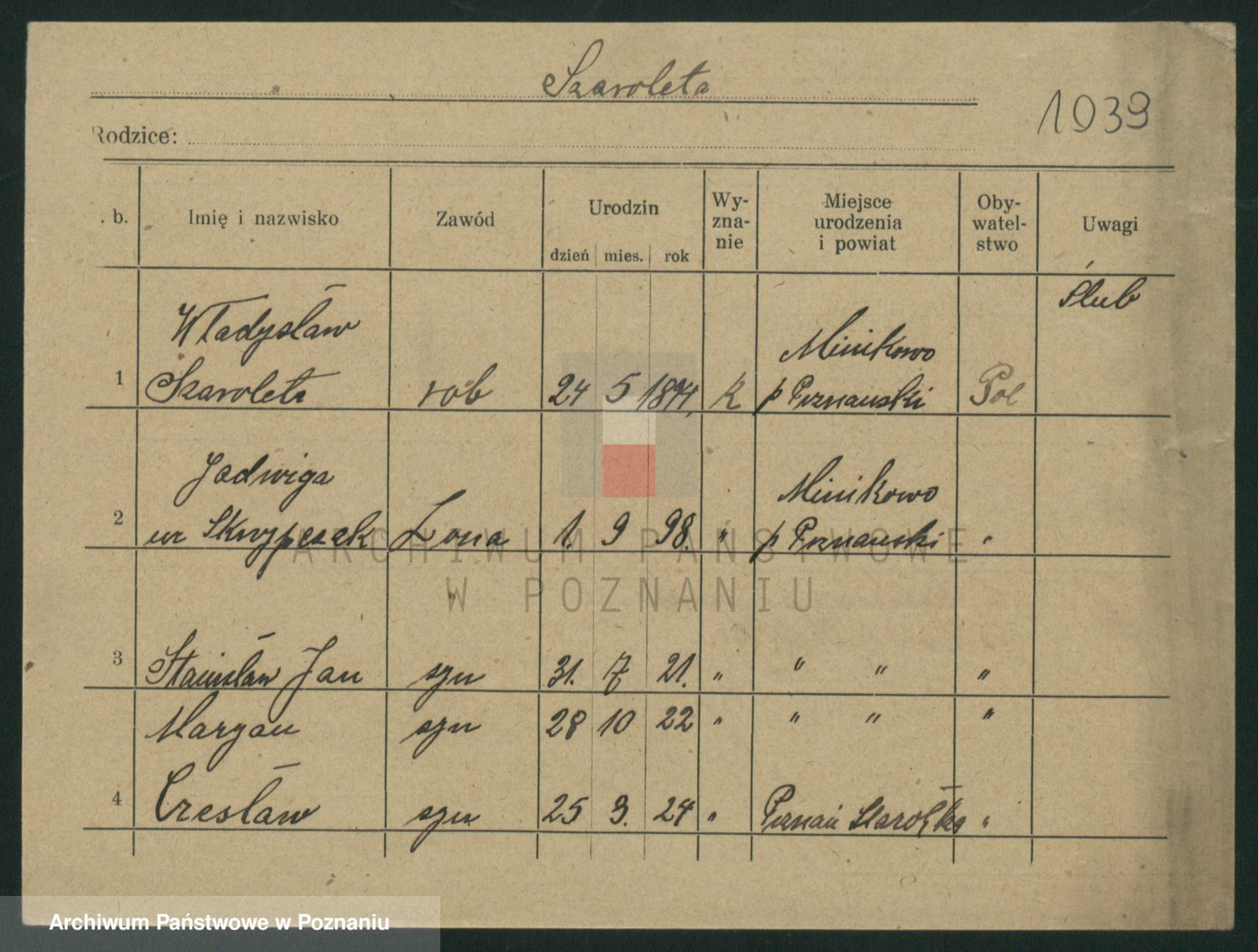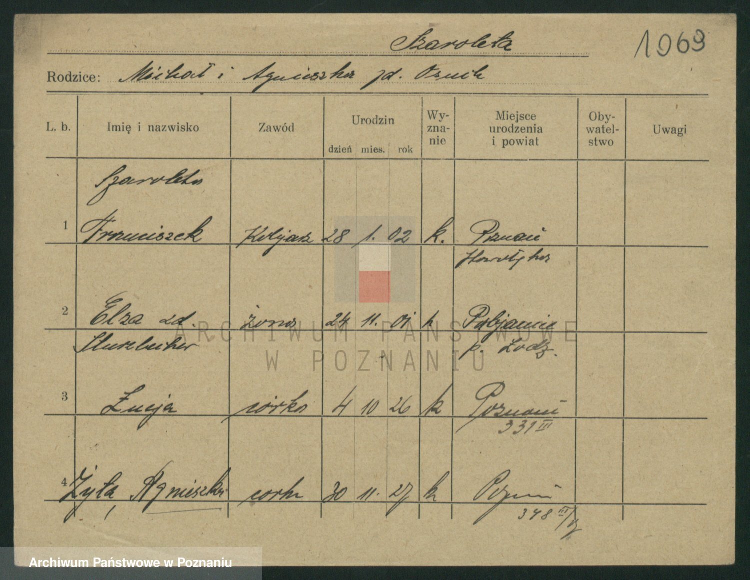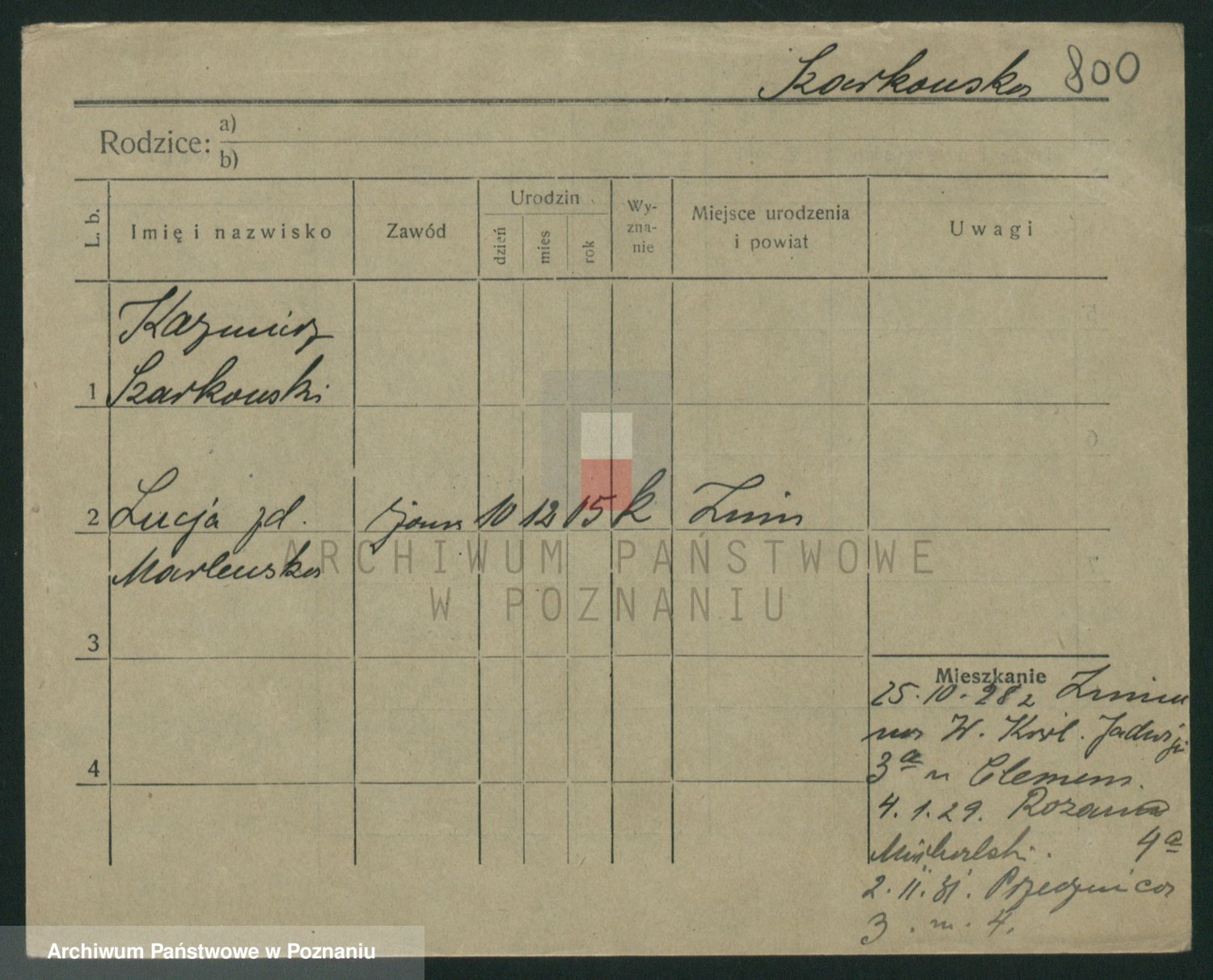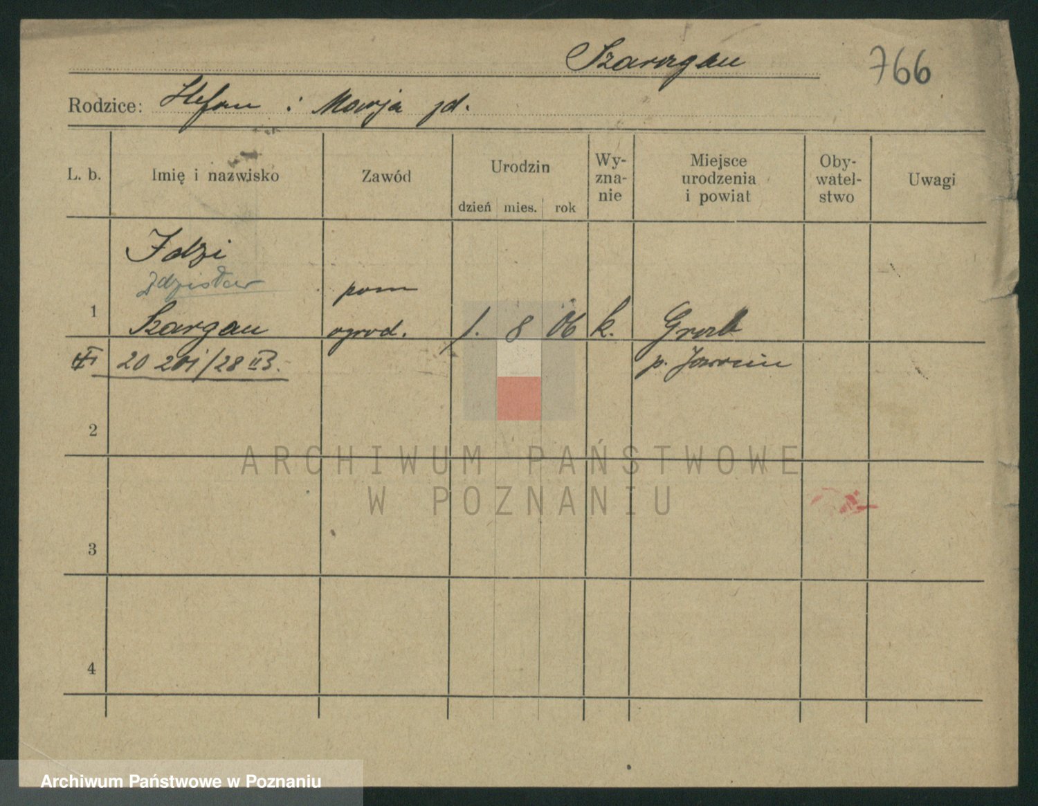 Podgląd karty osobowej dostępny jest po kliknięciu na nazwisko lub ikonkę karty. Można dokonywać powiększenia (ikony na górze) lub przechodzić między kolejnymi skanami (strzałki po bokach).