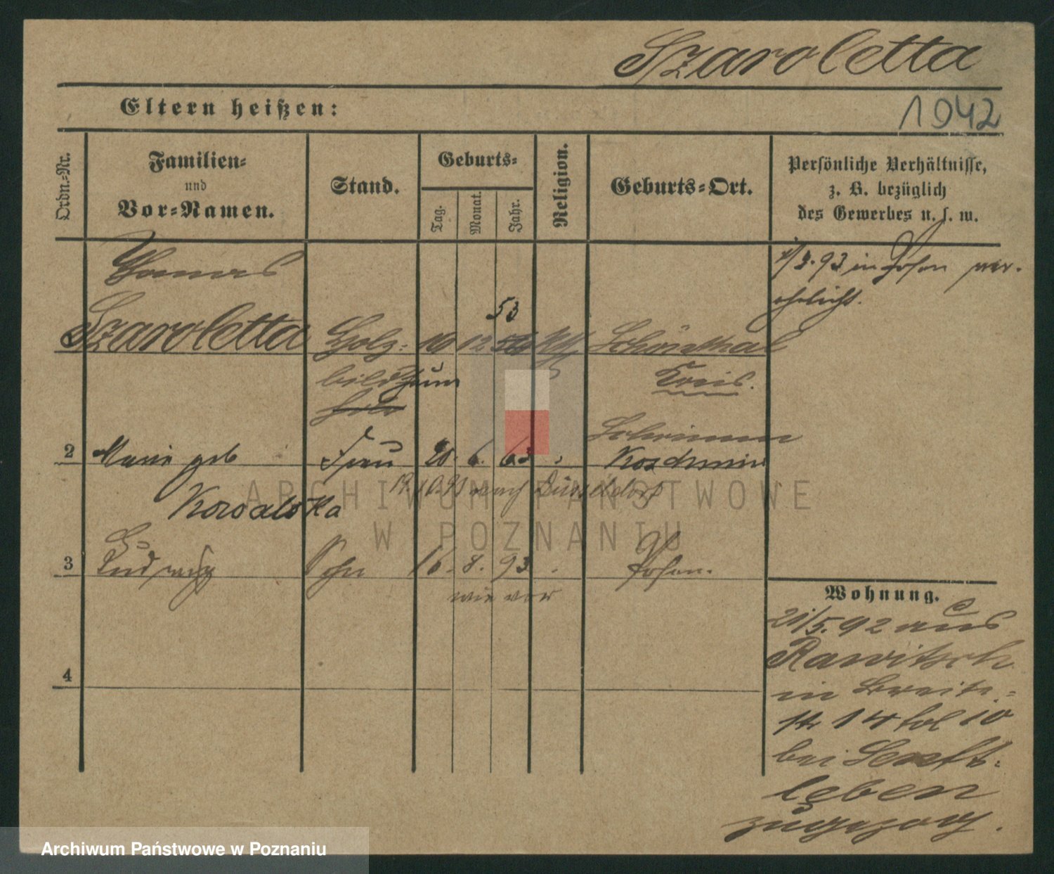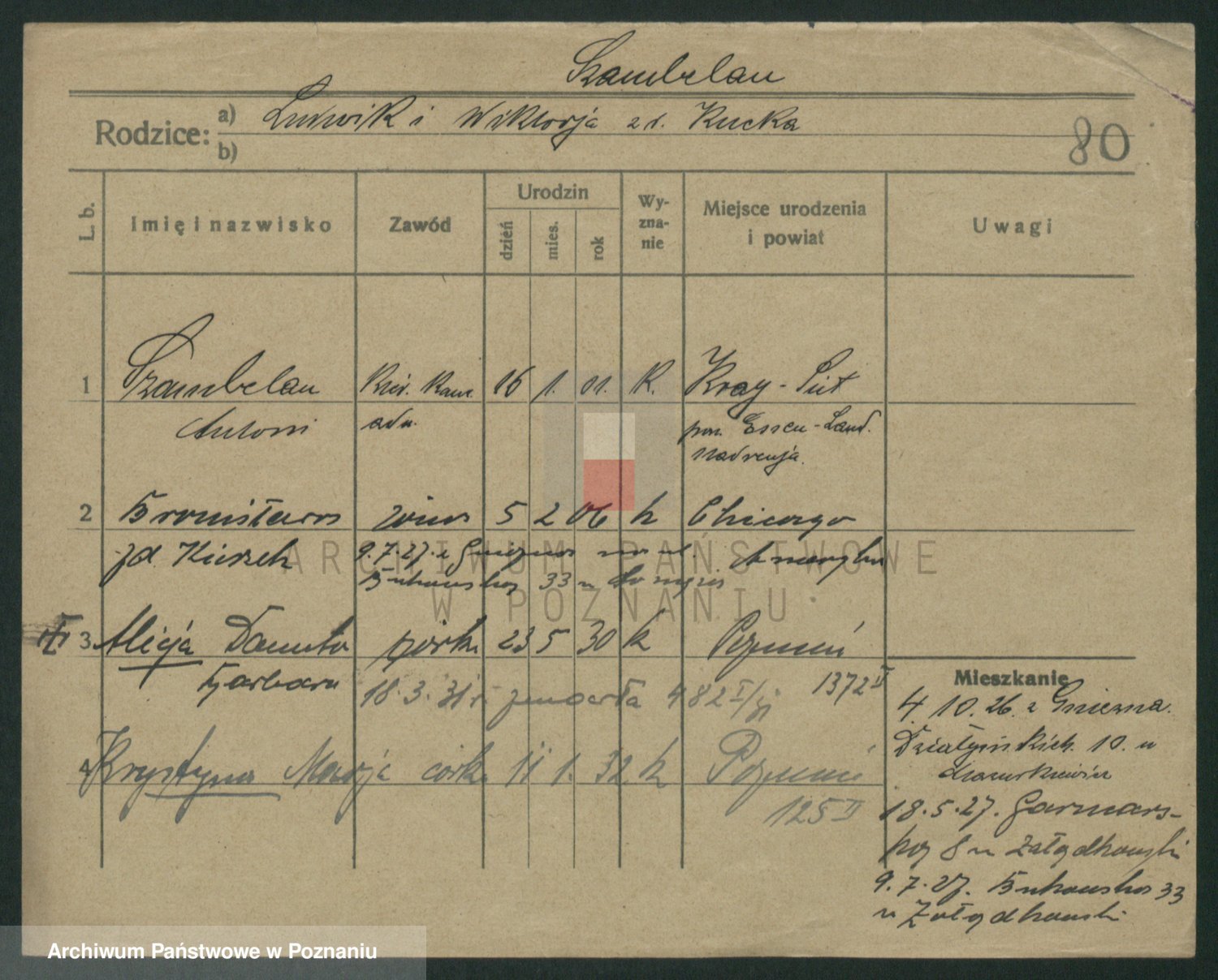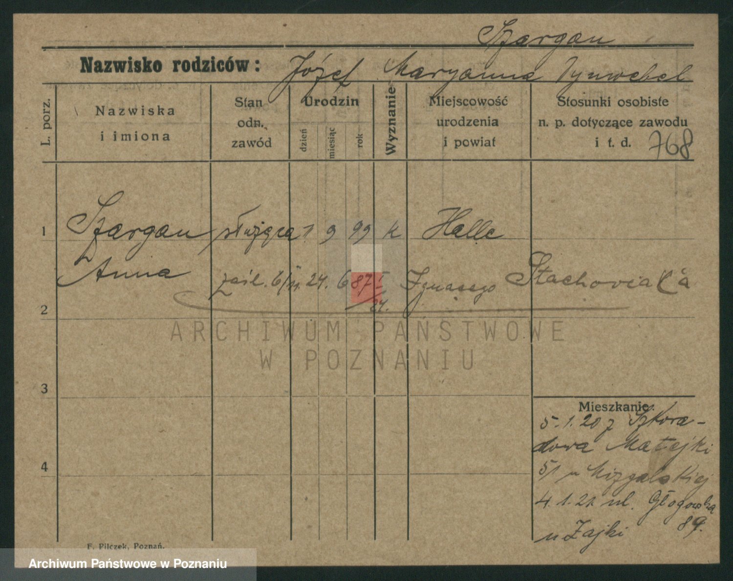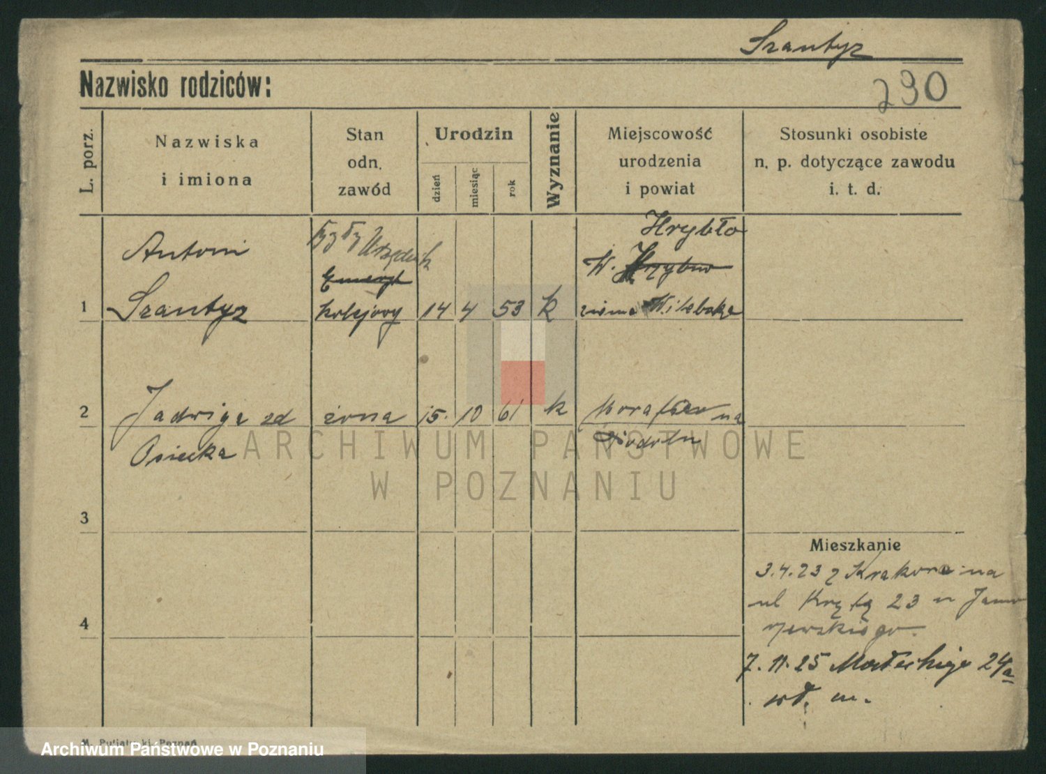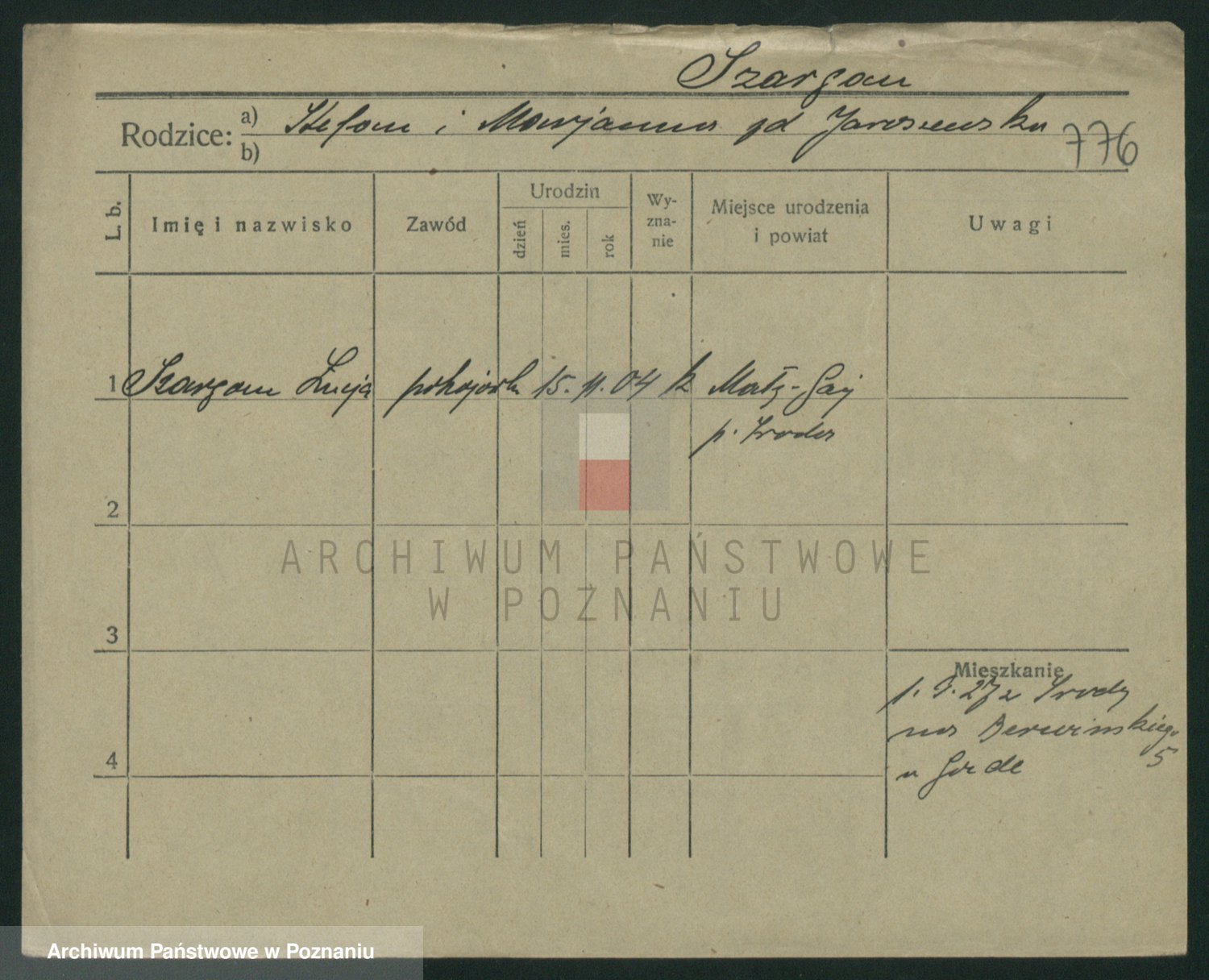 Podgląd karty osobowej dostępny jest po kliknięciu na nazwisko lub ikonkę karty. Można dokonywać powiększenia (ikony na górze) lub przechodzić między kolejnymi skanami (strzałki po bokach).