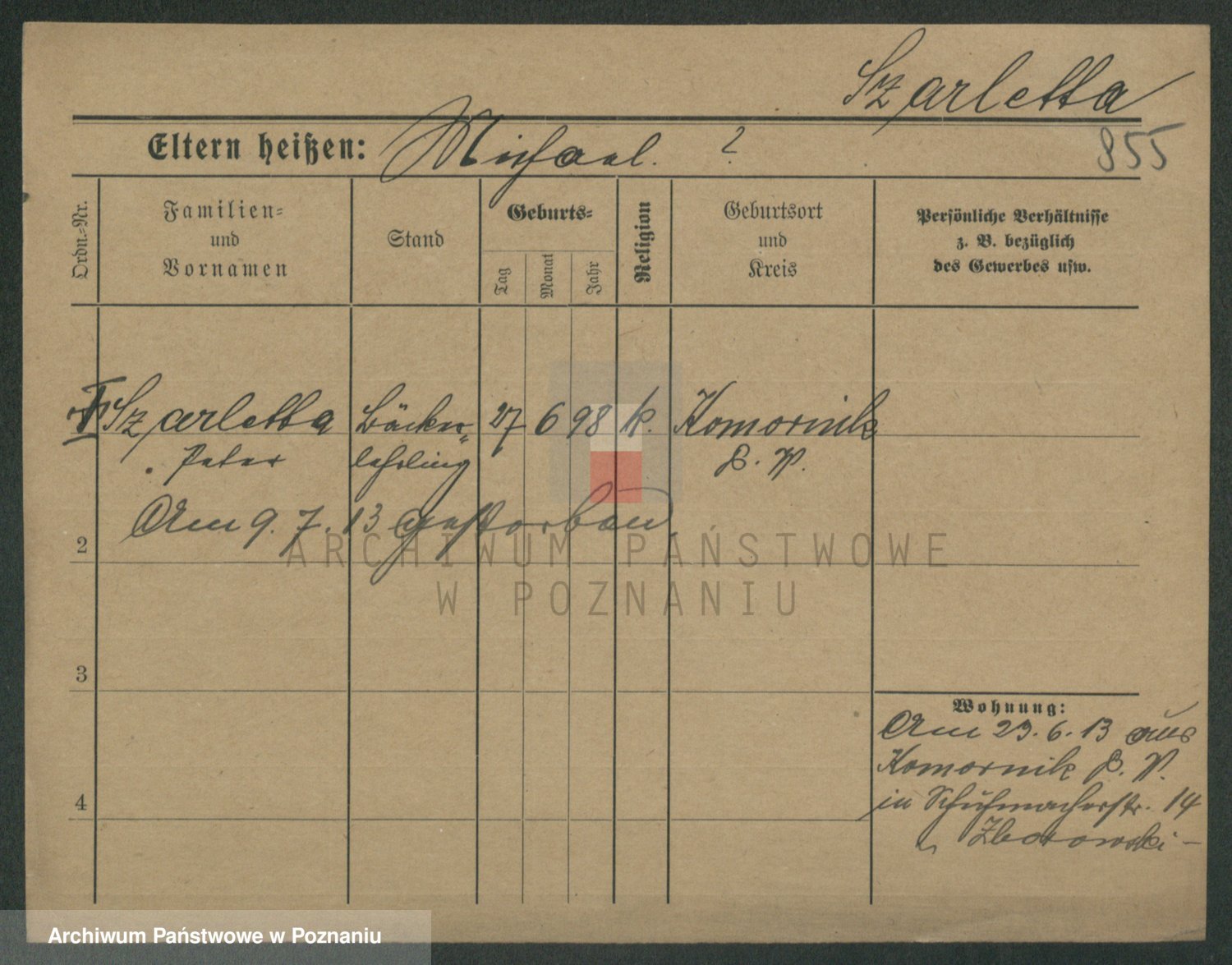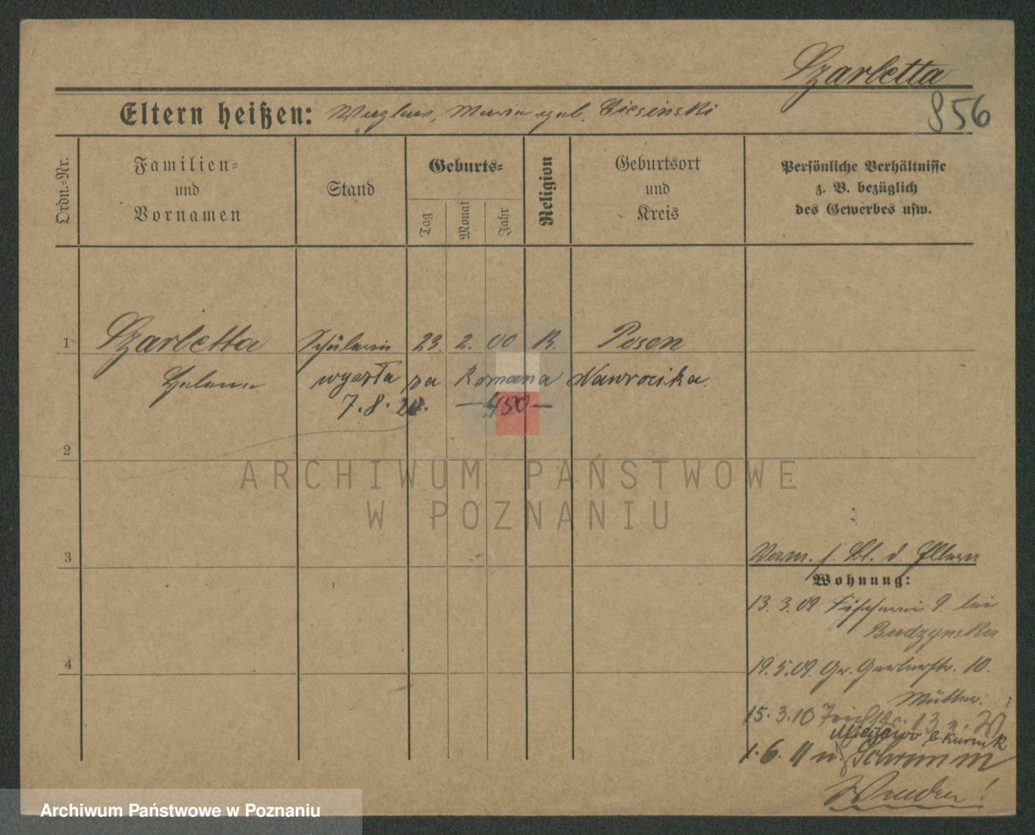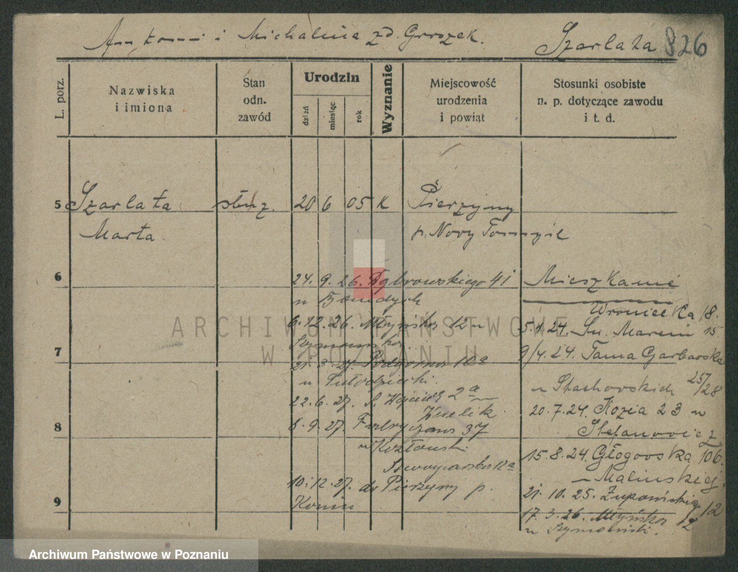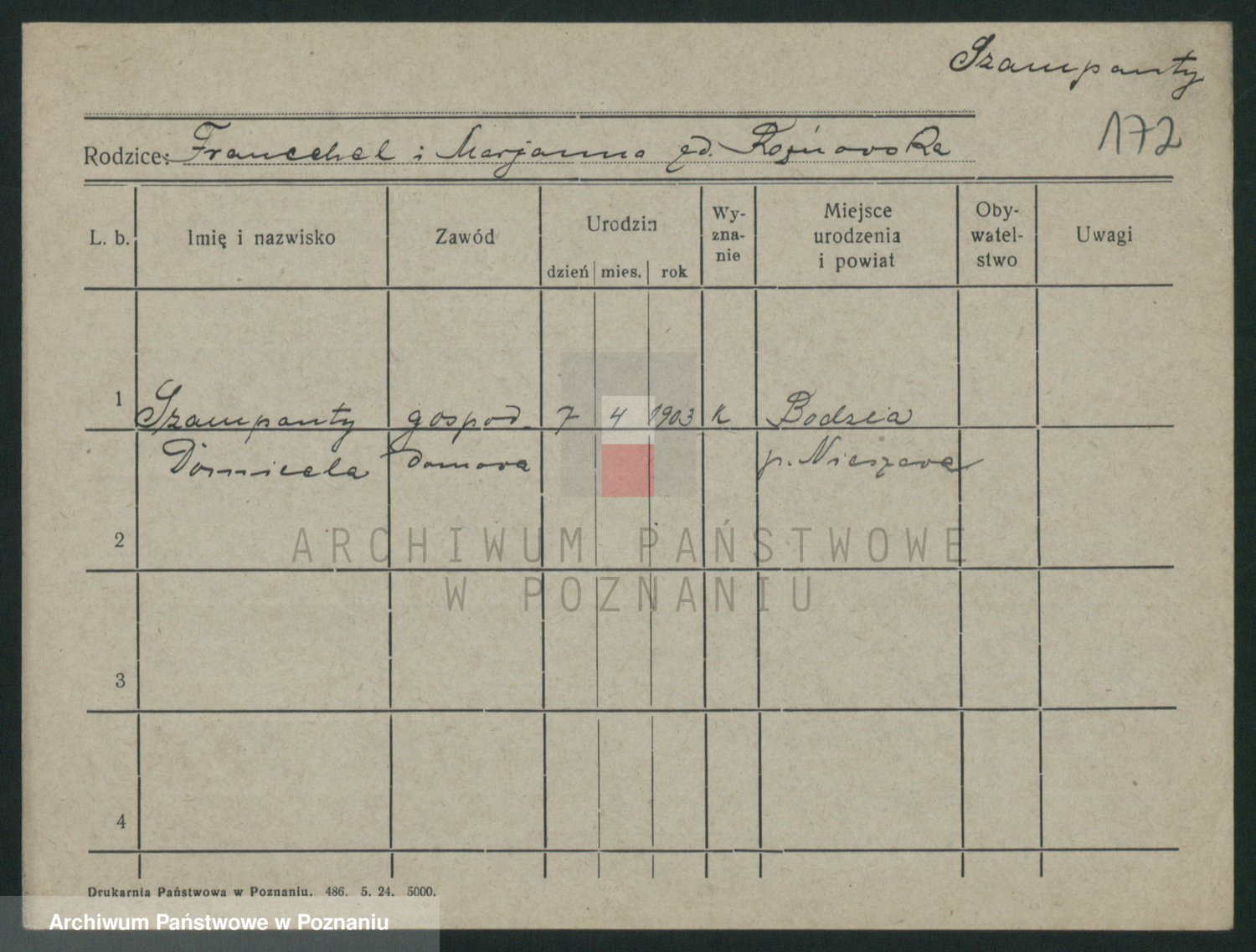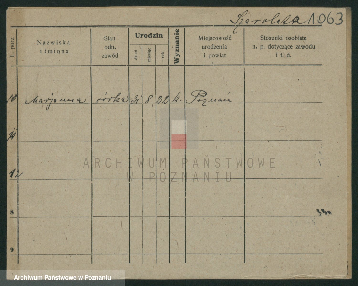 Podgląd karty osobowej dostępny jest po kliknięciu na nazwisko lub ikonkę karty. Można dokonywać powiększenia (ikony na górze) lub przechodzić między kolejnymi skanami (strzałki po bokach).