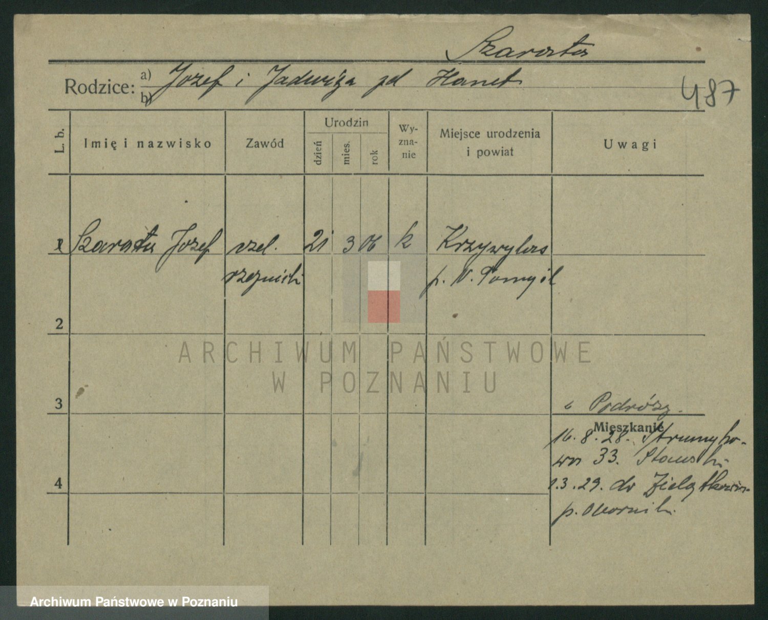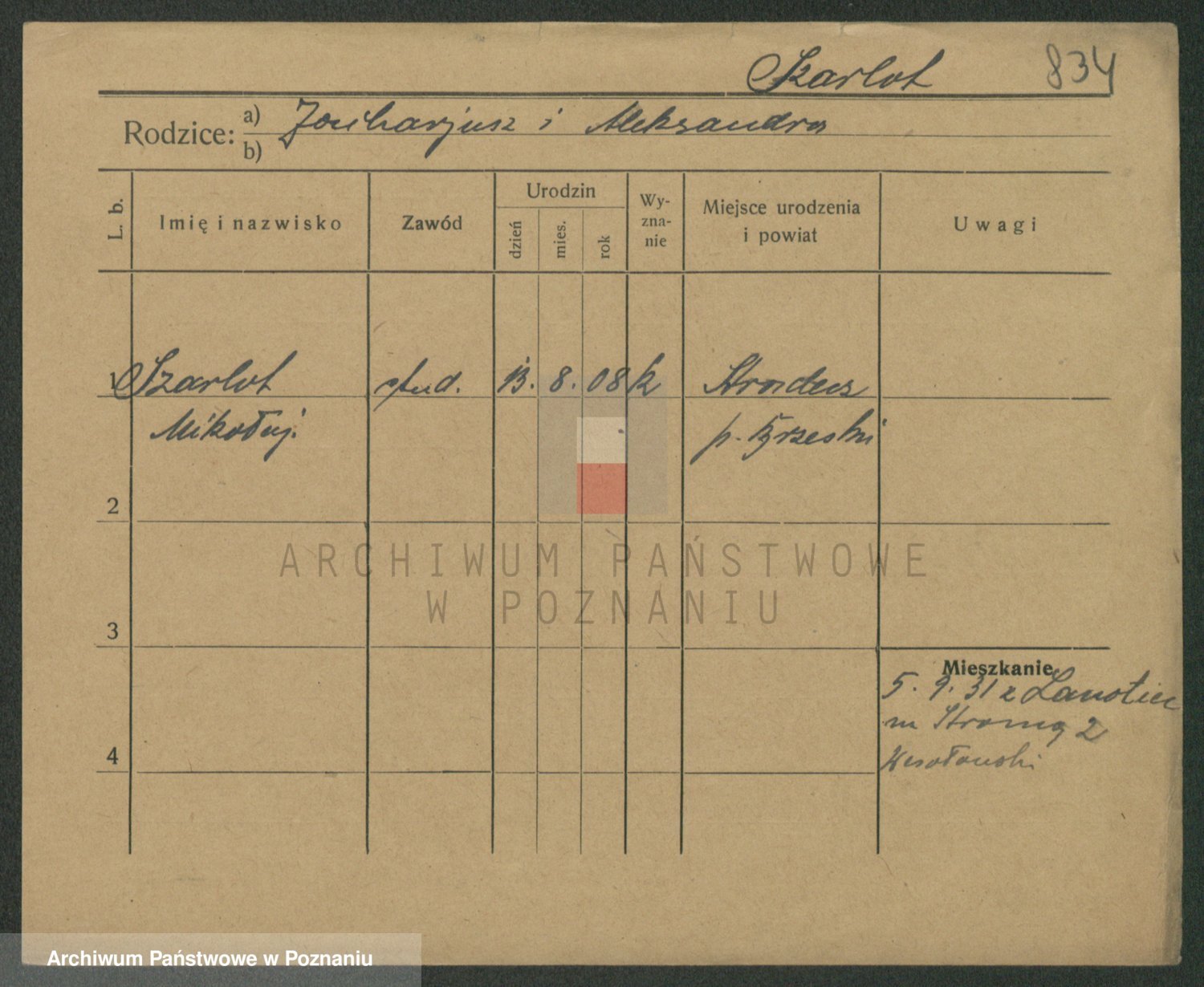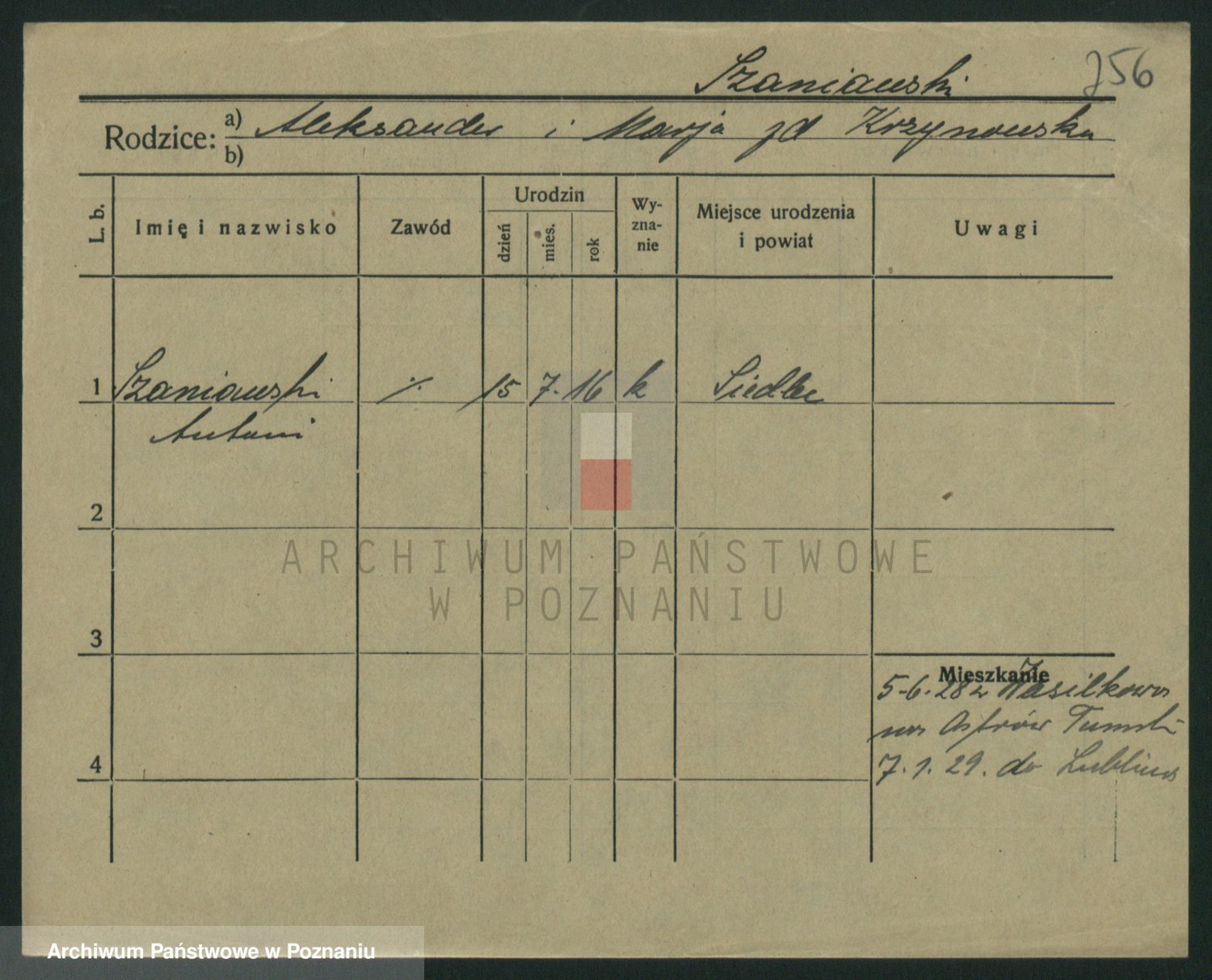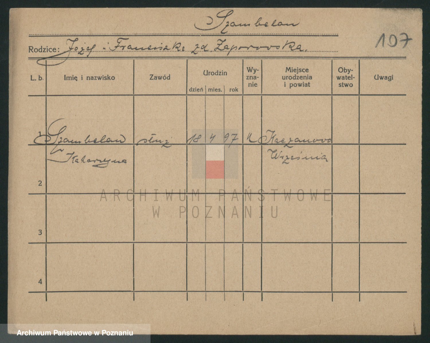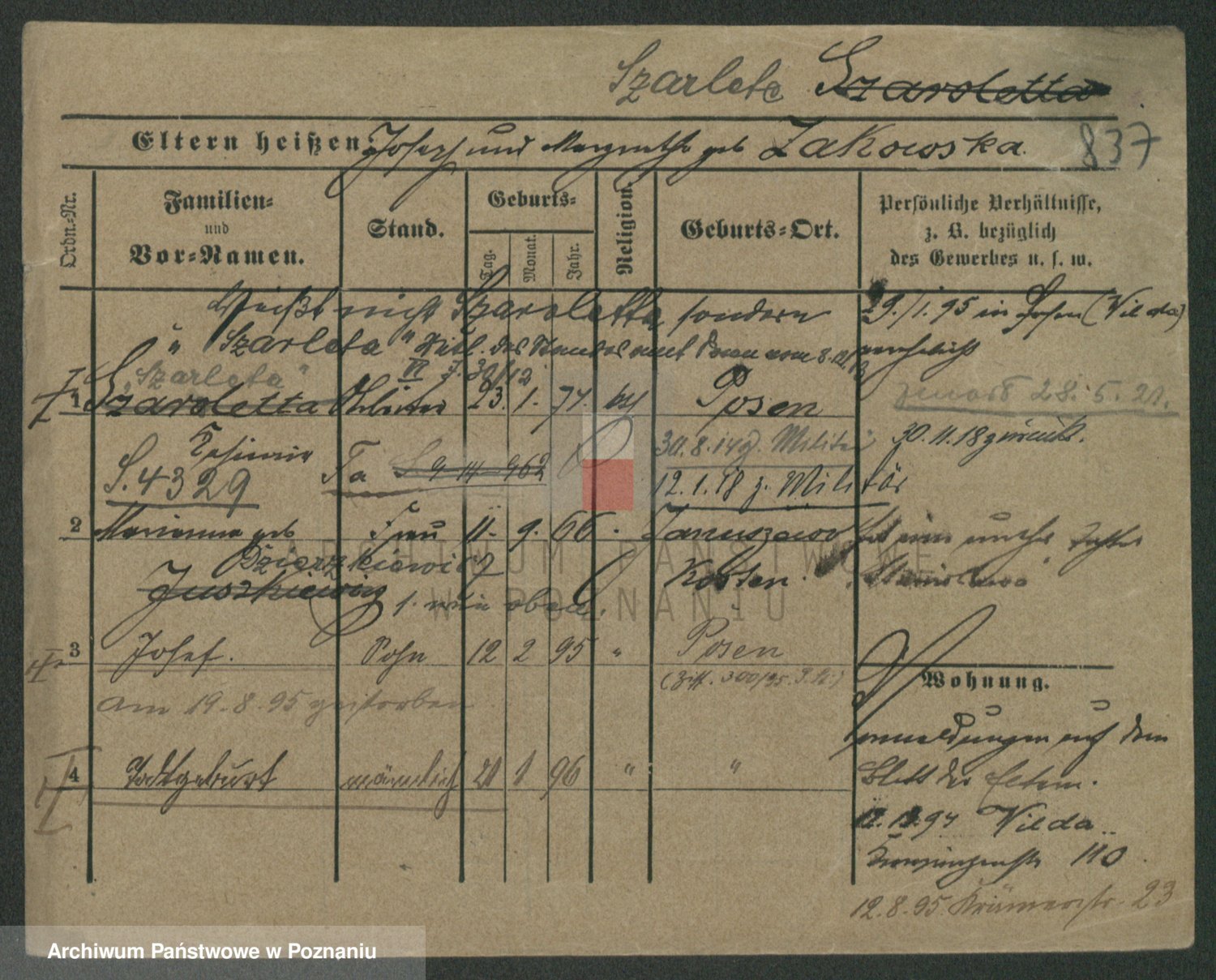 Podgląd karty osobowej dostępny jest po kliknięciu na nazwisko lub ikonkę karty. Można dokonywać powiększenia (ikony na górze) lub przechodzić między kolejnymi skanami (strzałki po bokach).
