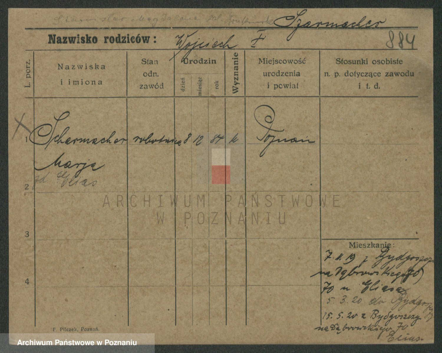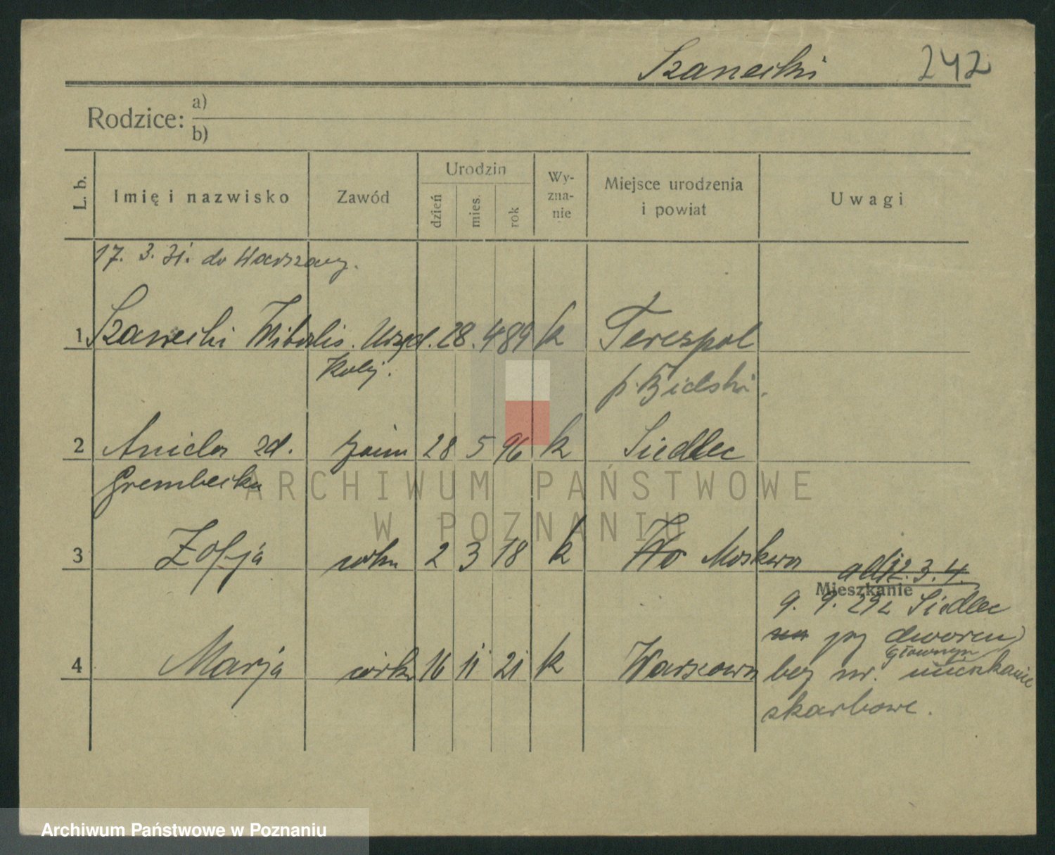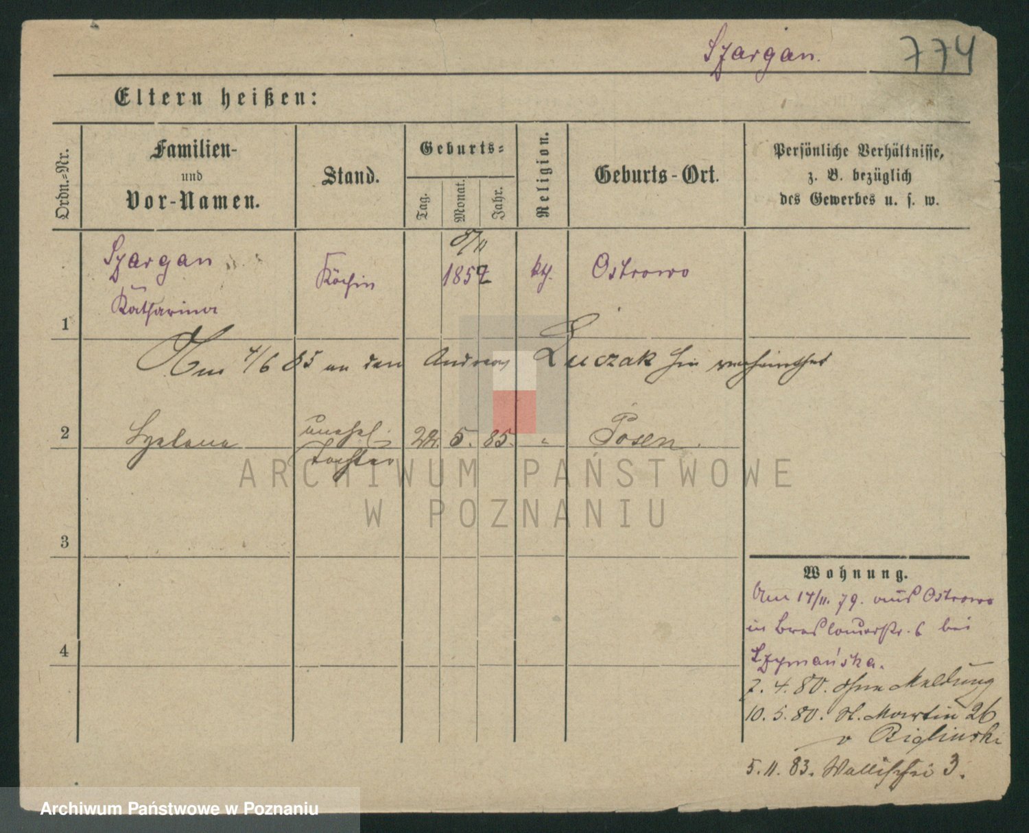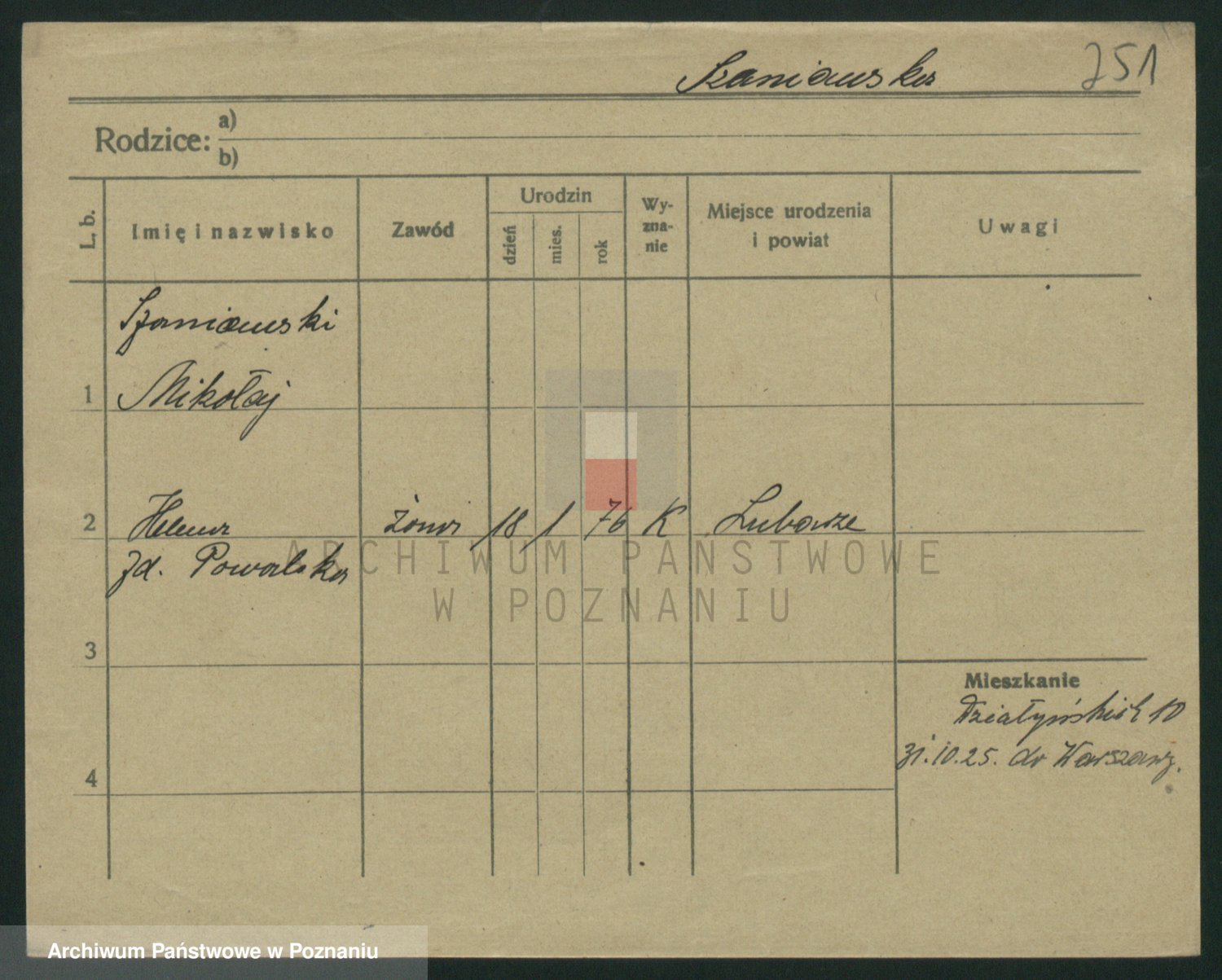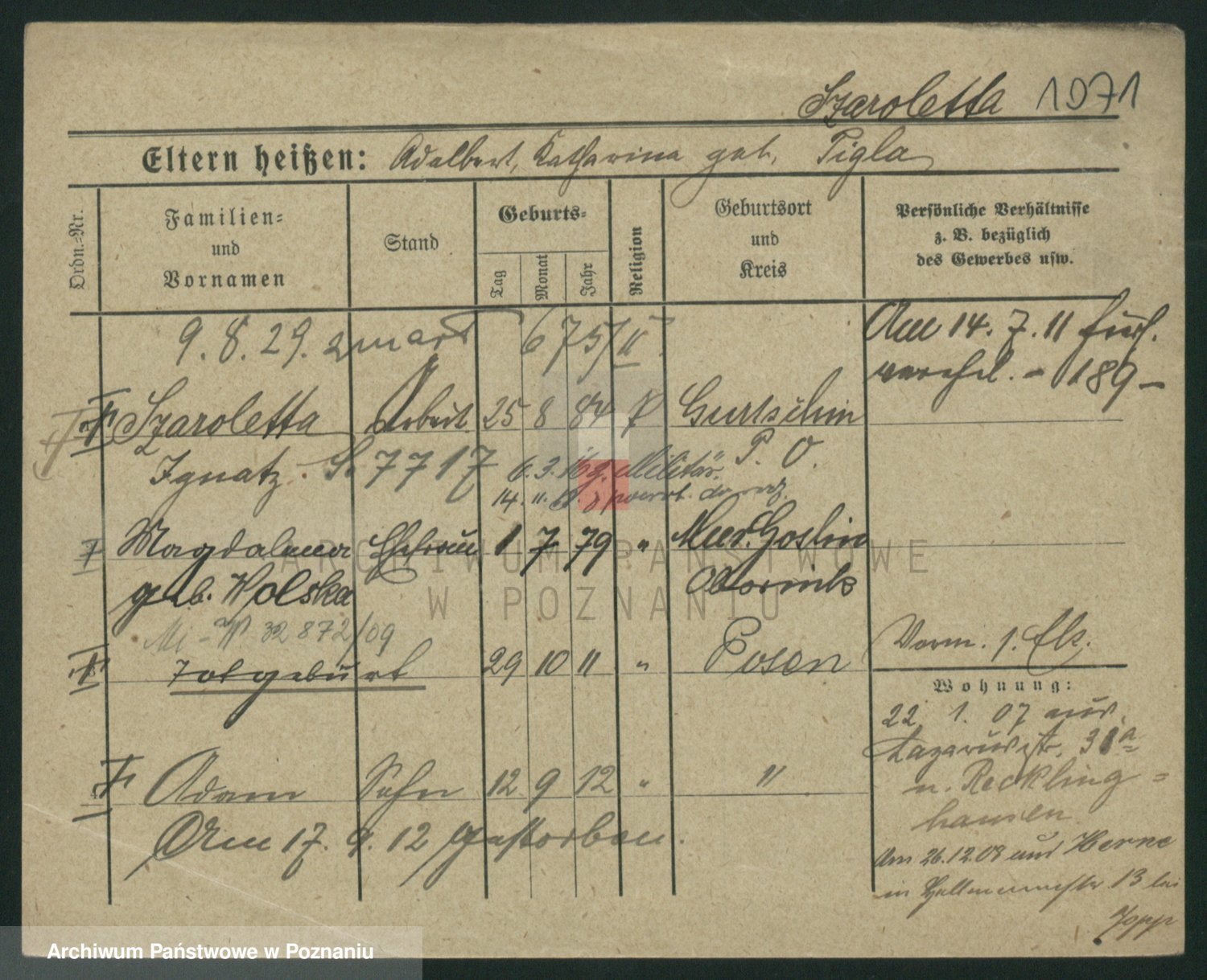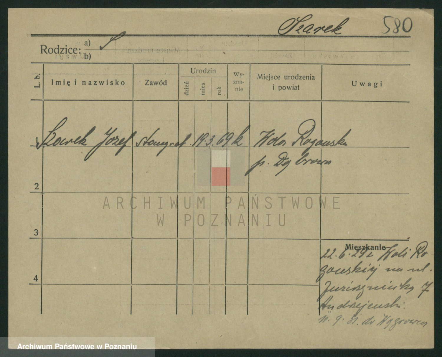 Podgląd karty osobowej dostępny jest po kliknięciu na nazwisko lub ikonkę karty. Można dokonywać powiększenia (ikony na górze) lub przechodzić między kolejnymi skanami (strzałki po bokach).