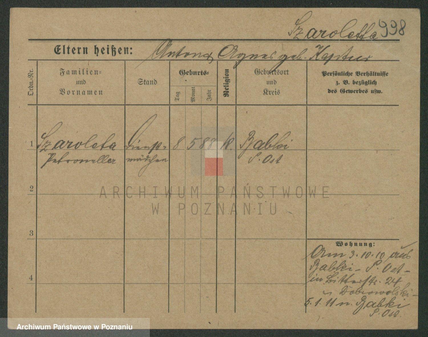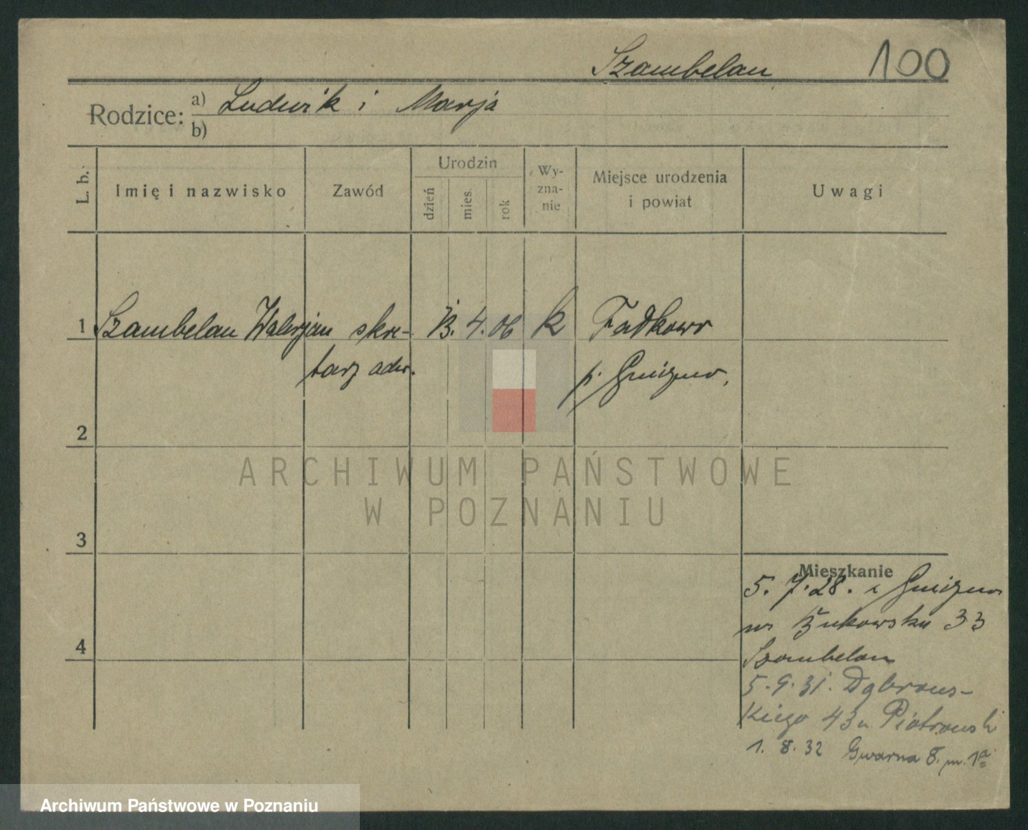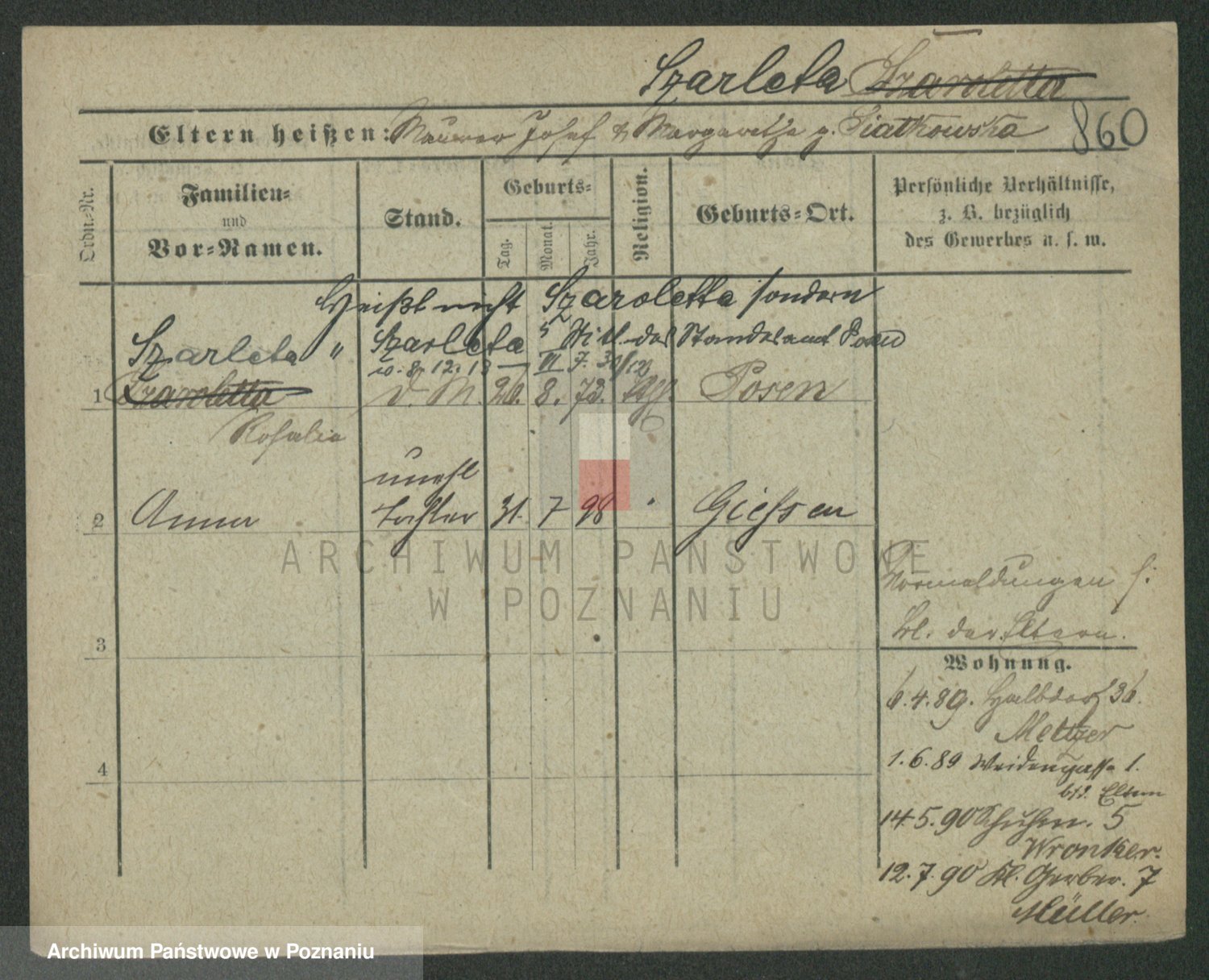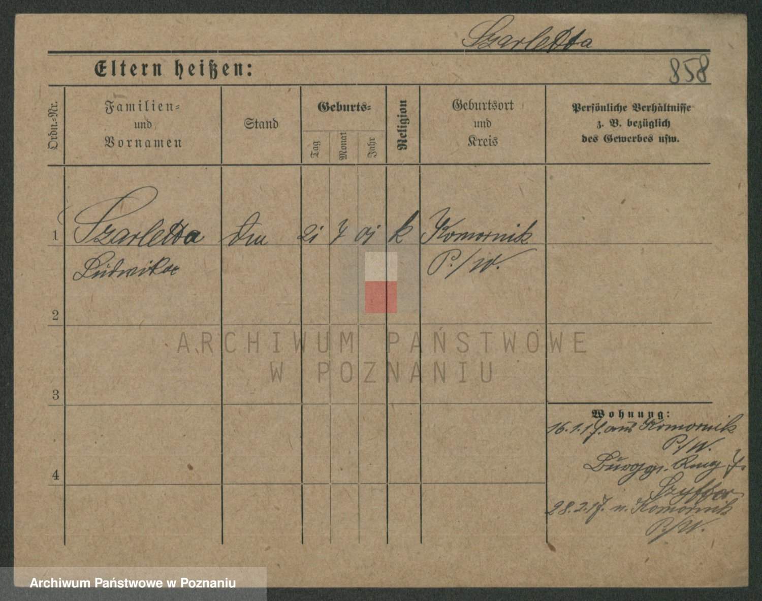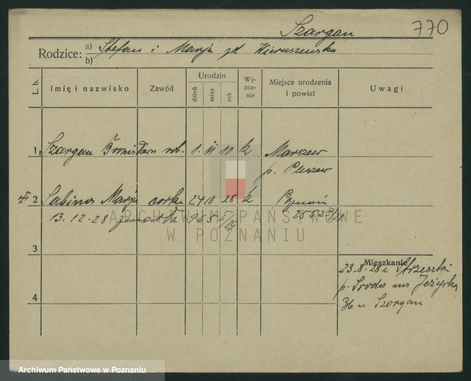 Podgląd karty osobowej dostępny jest po kliknięciu na nazwisko lub ikonkę karty. Można dokonywać powiększenia (ikony na górze) lub przechodzić między kolejnymi skanami (strzałki po bokach).