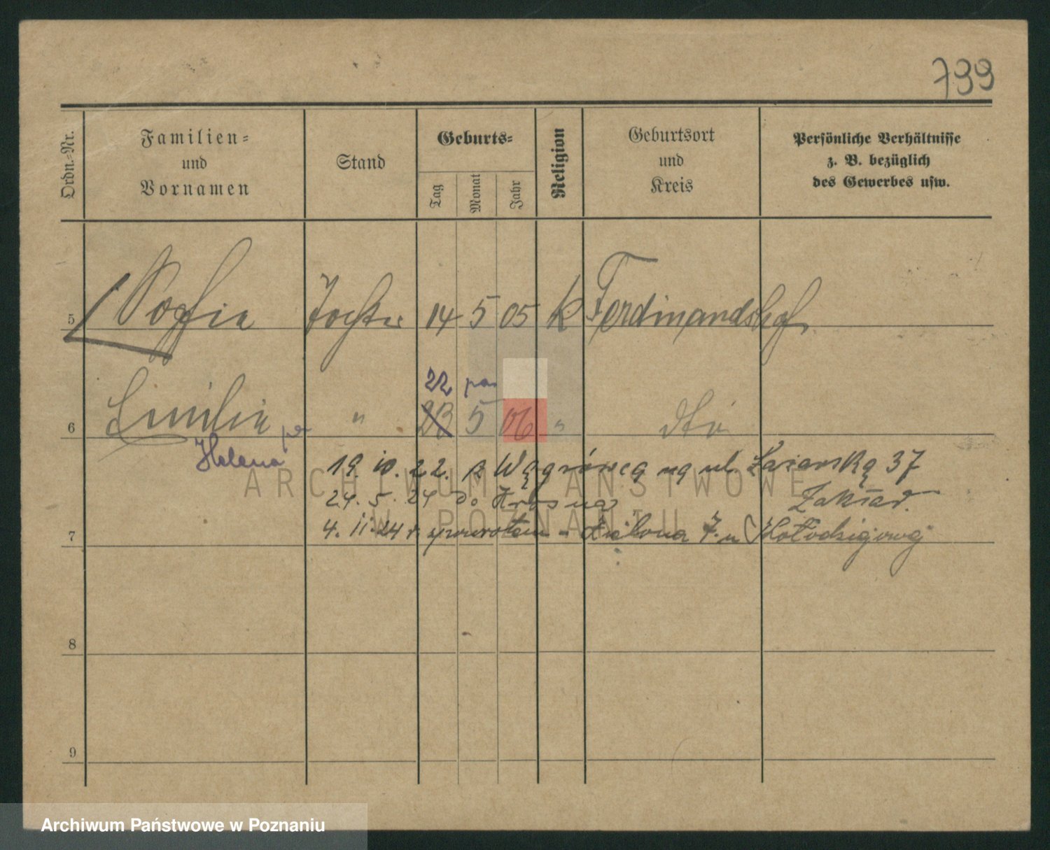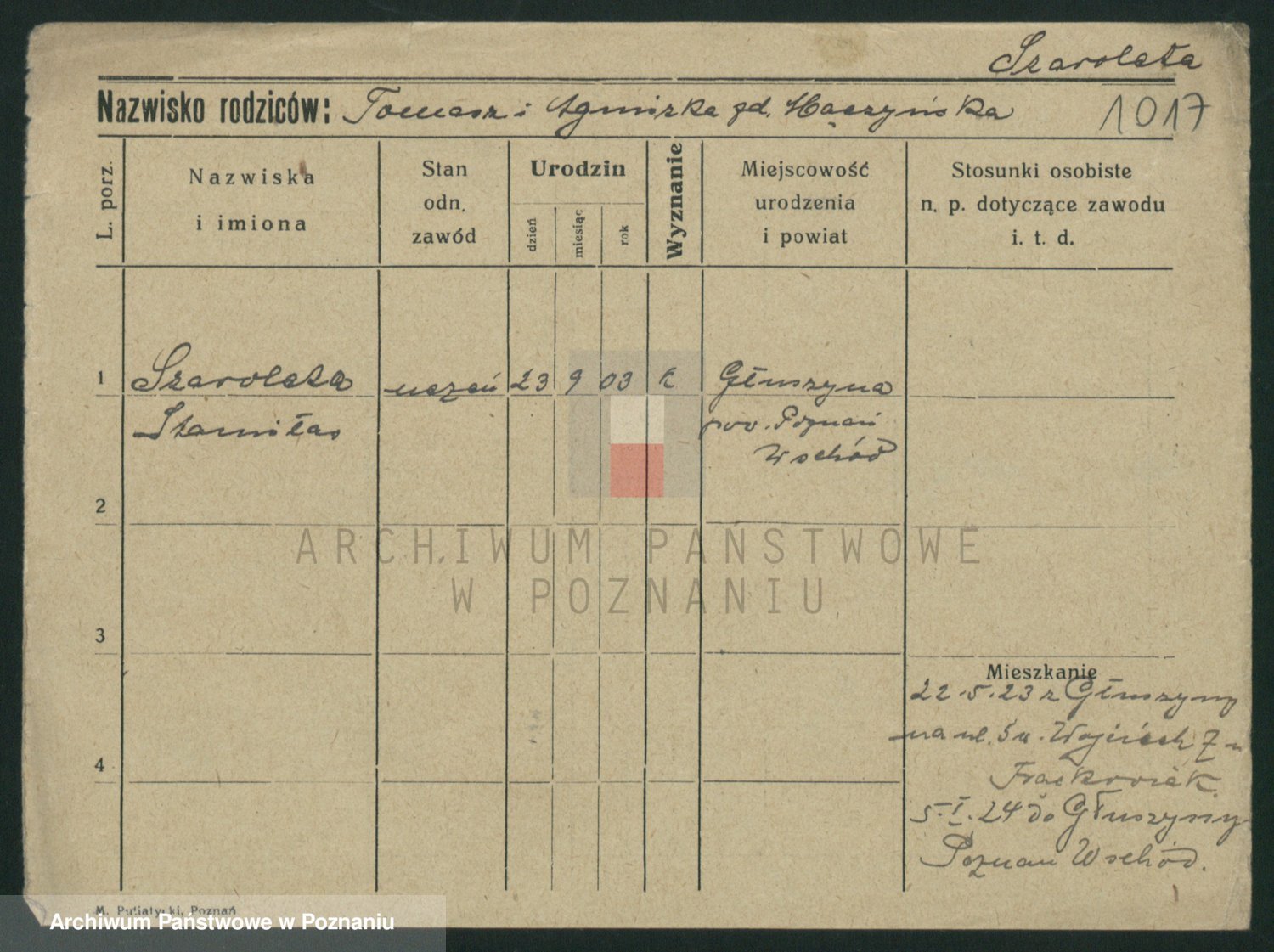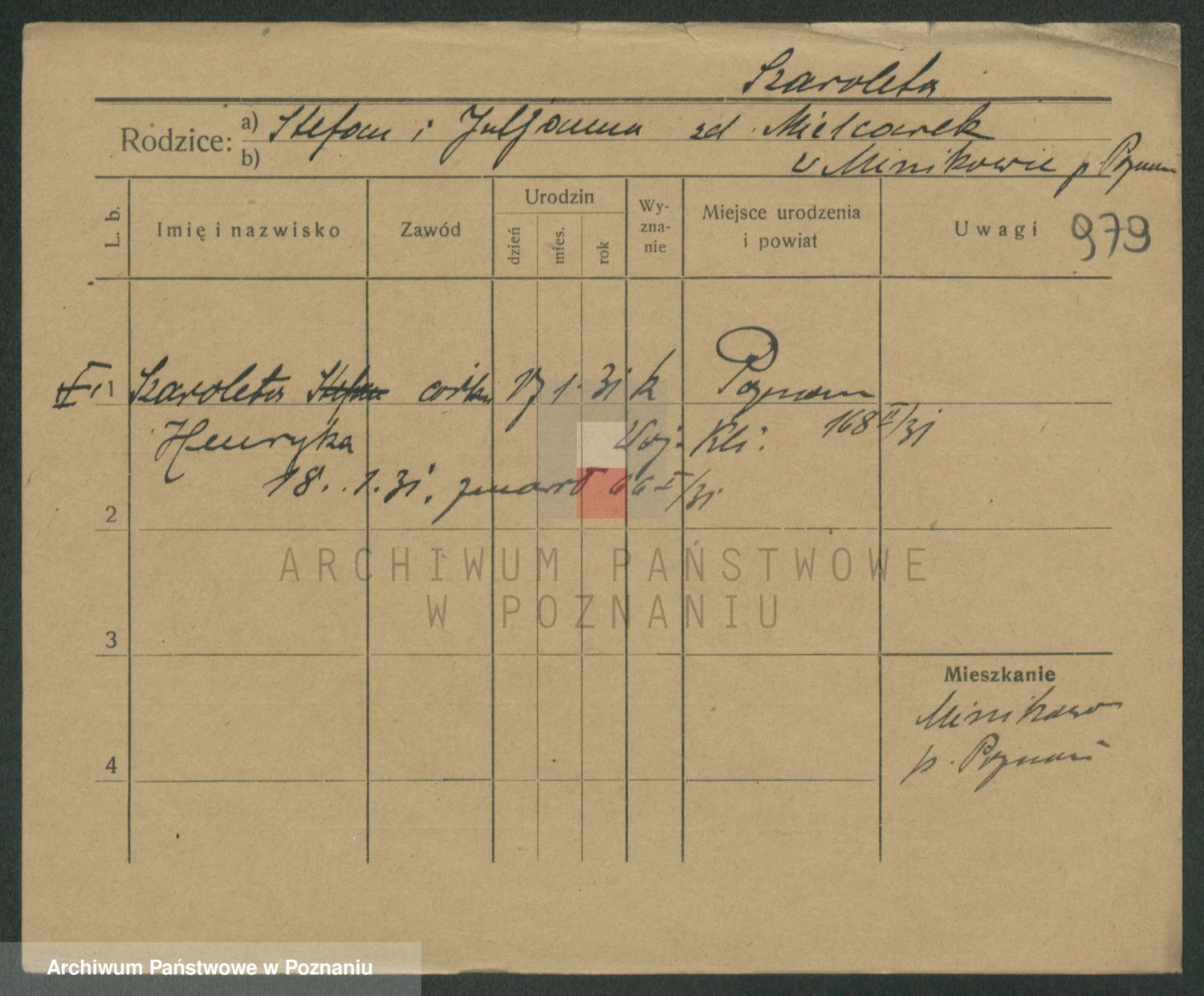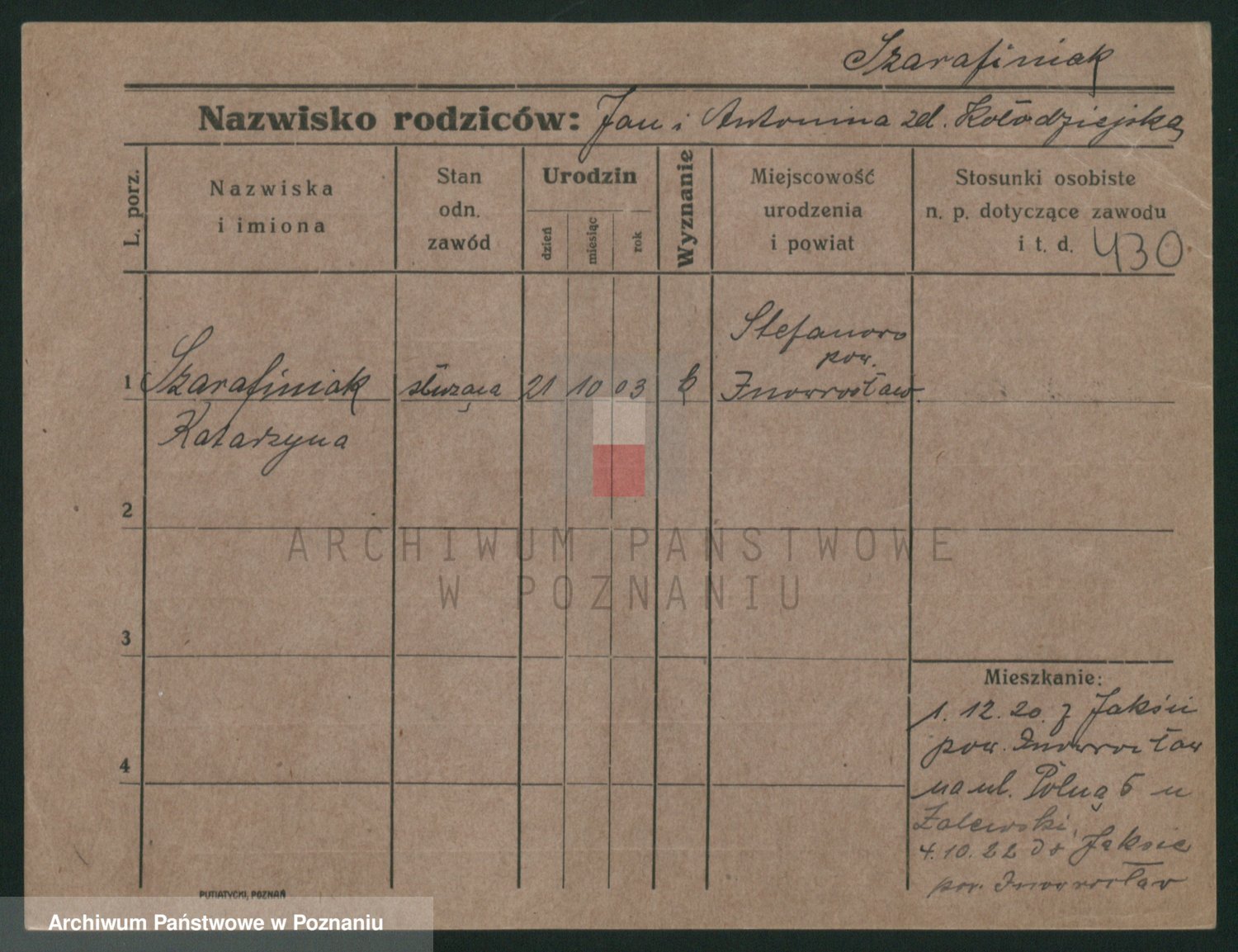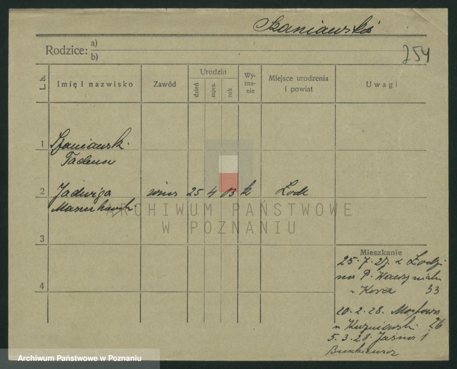 Podgląd karty osobowej dostępny jest po kliknięciu na nazwisko lub ikonkę karty. Można dokonywać powiększenia (ikony na górze) lub przechodzić między kolejnymi skanami (strzałki po bokach).