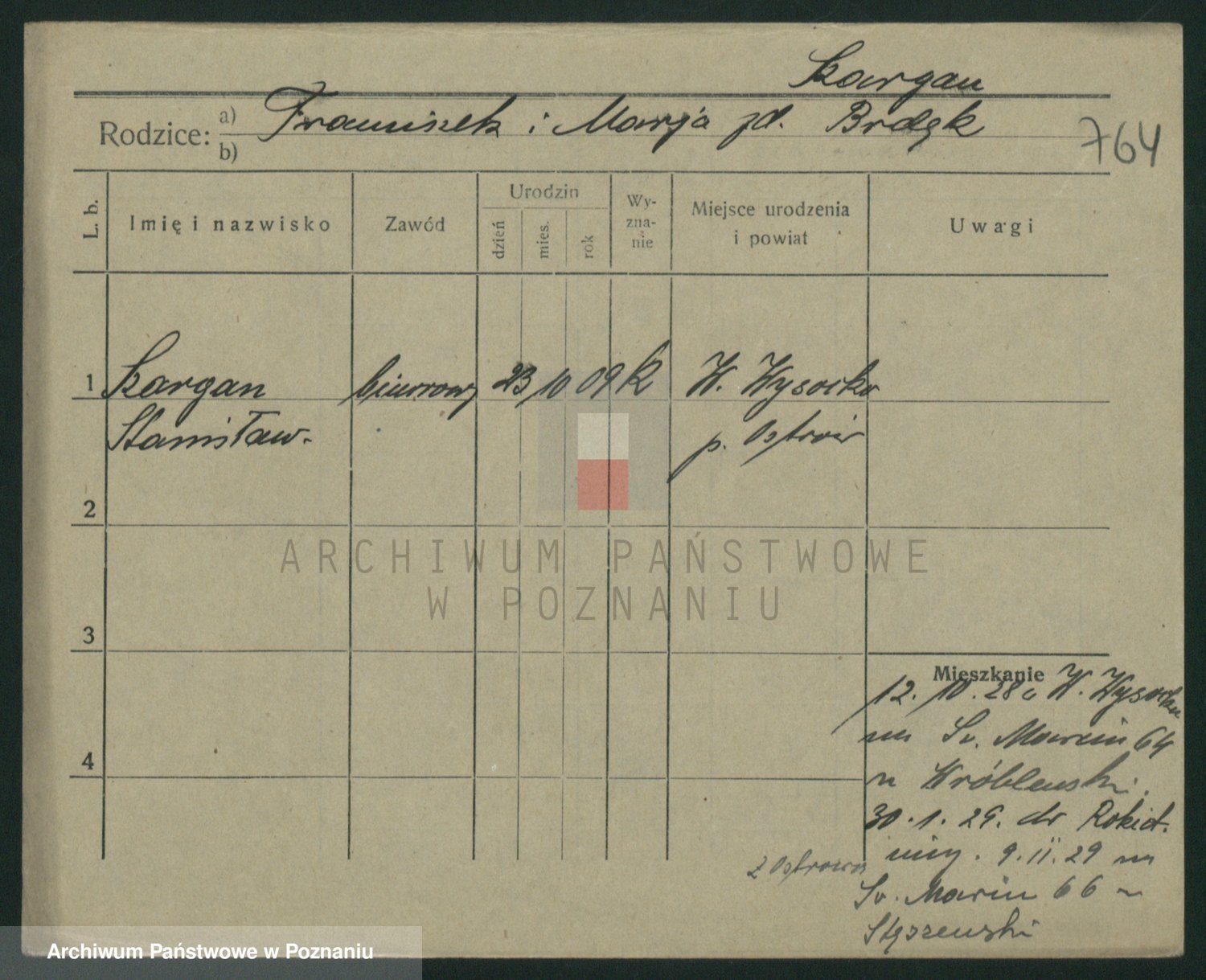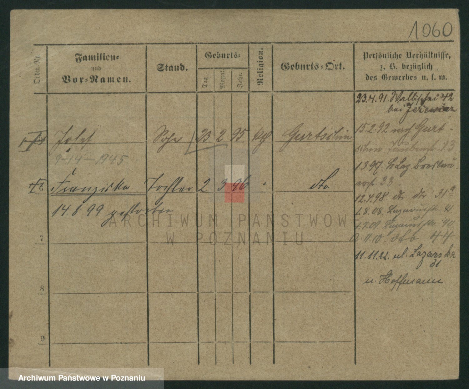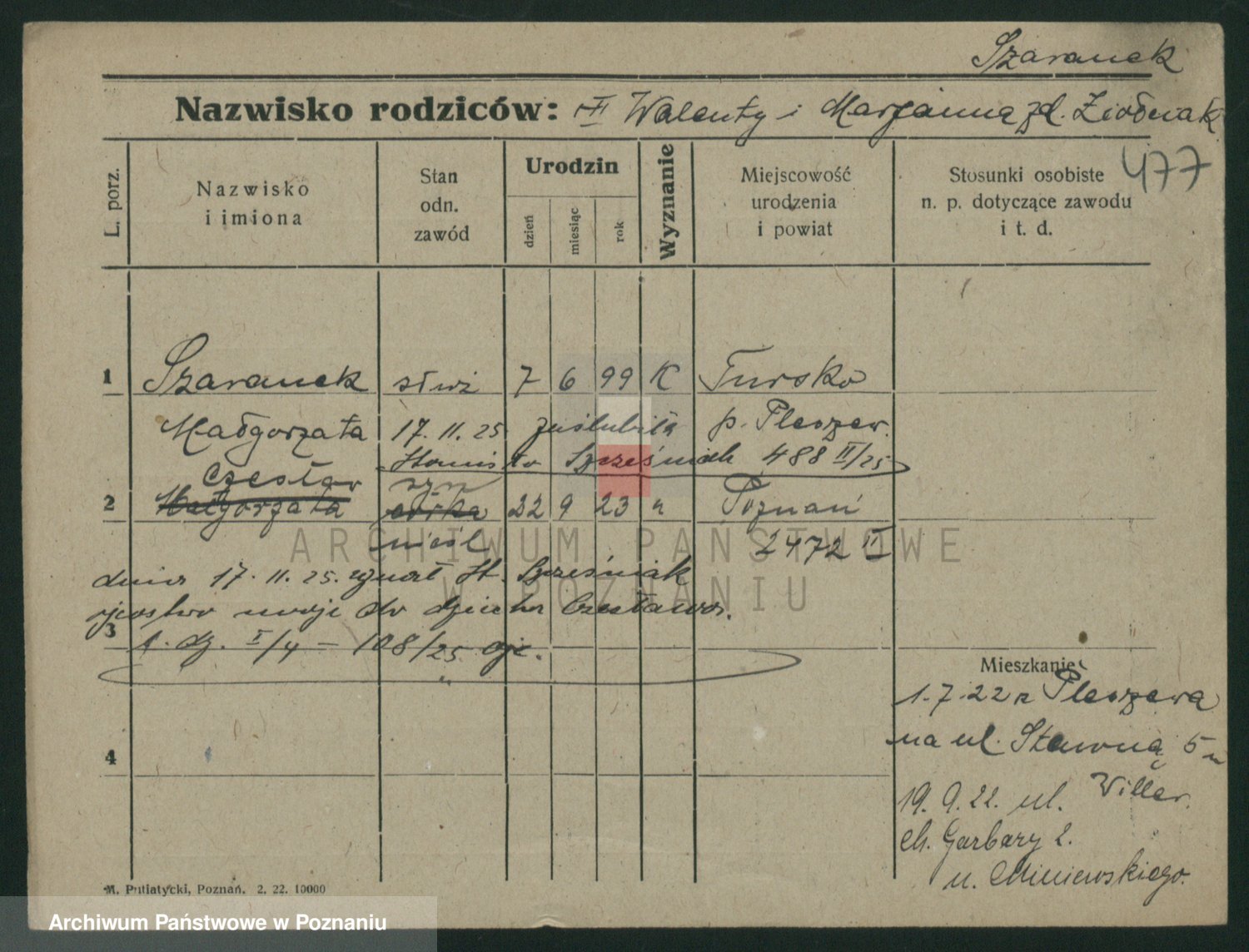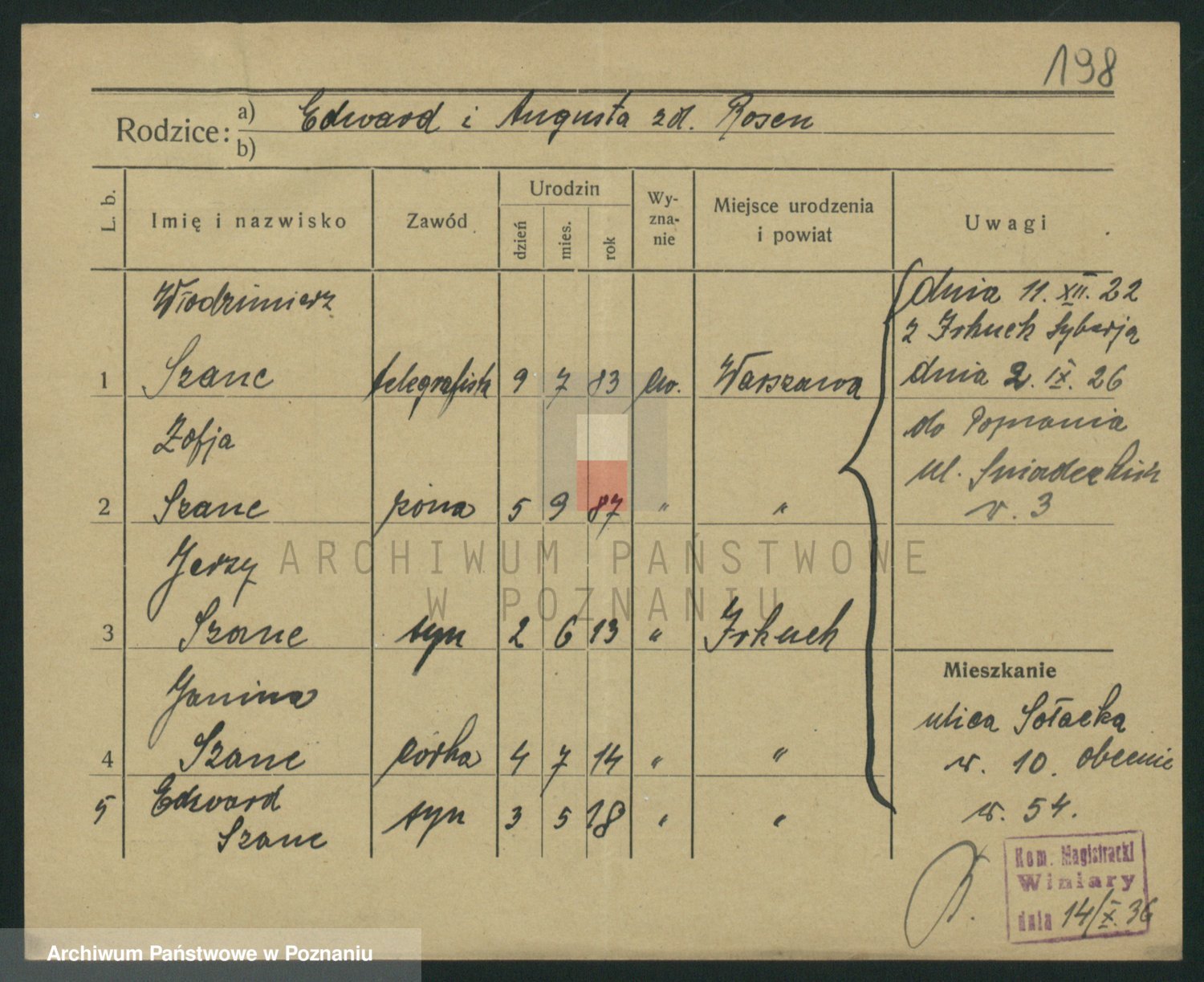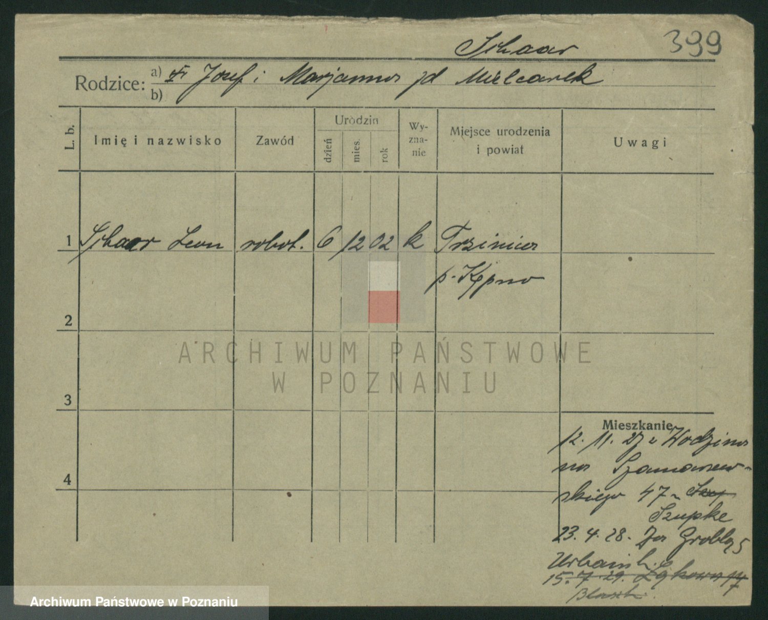 Podgląd karty osobowej dostępny jest po kliknięciu na nazwisko lub ikonkę karty. Można dokonywać powiększenia (ikony na górze) lub przechodzić między kolejnymi skanami (strzałki po bokach).