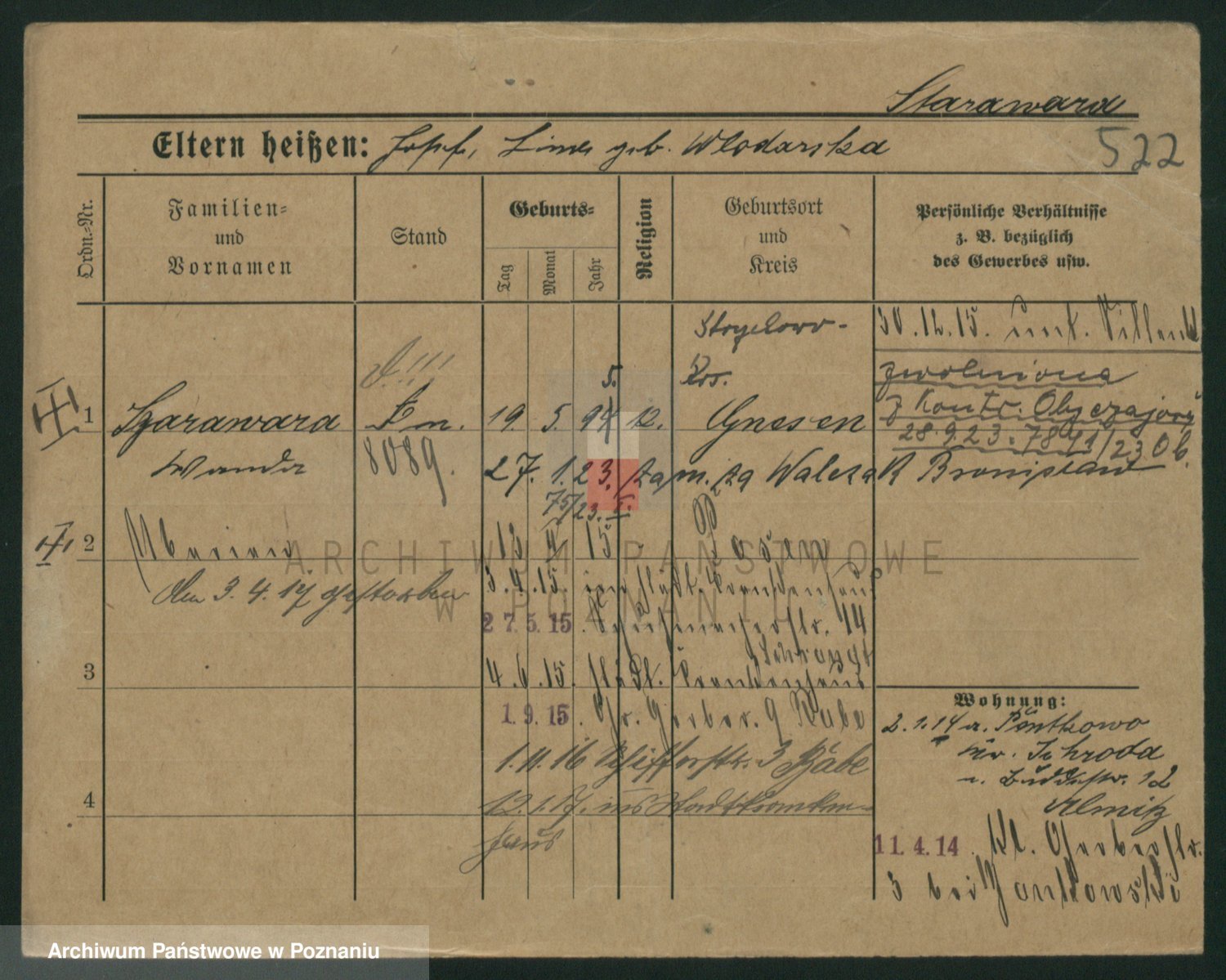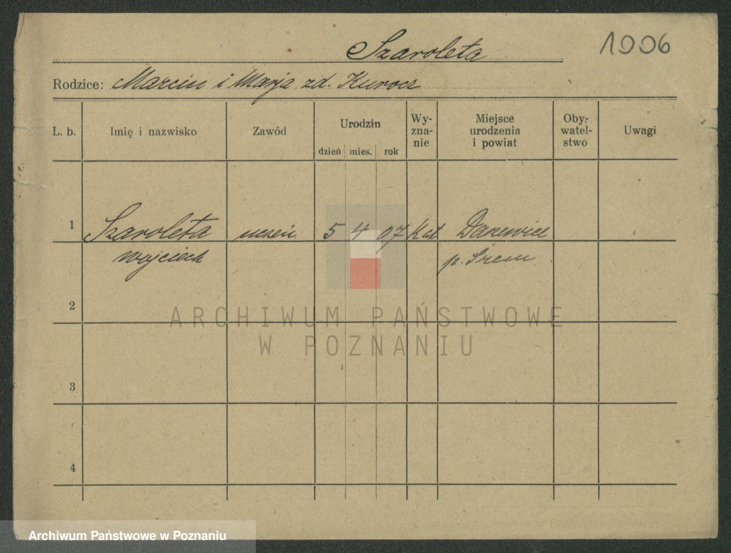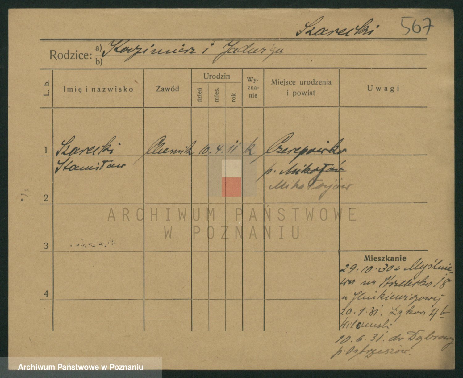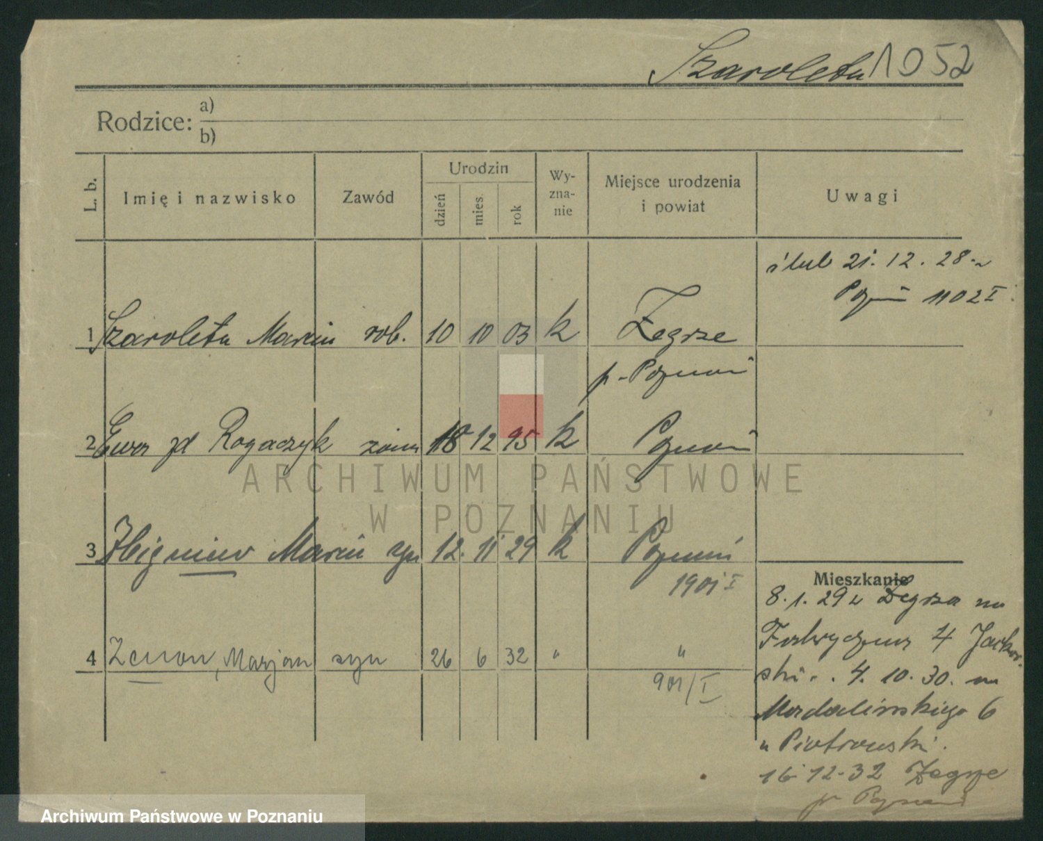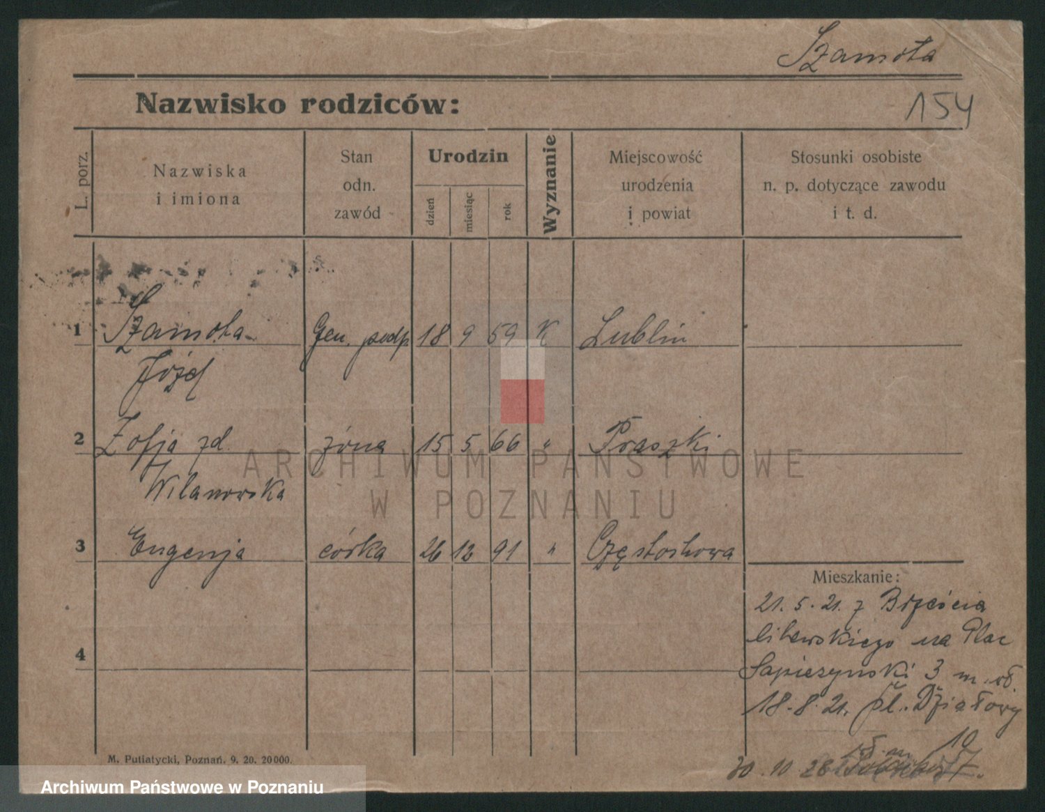 Podgląd karty osobowej dostępny jest po kliknięciu na nazwisko lub ikonkę karty. Można dokonywać powiększenia (ikony na górze) lub przechodzić między kolejnymi skanami (strzałki po bokach).