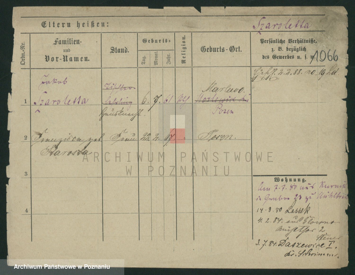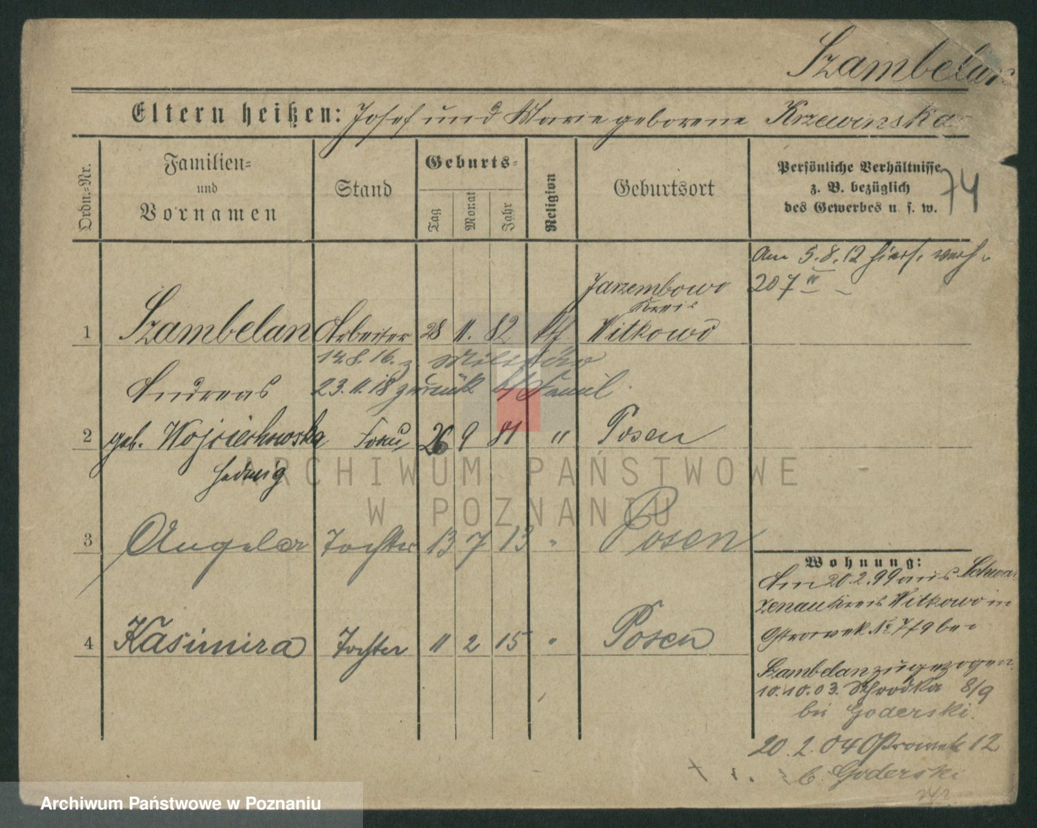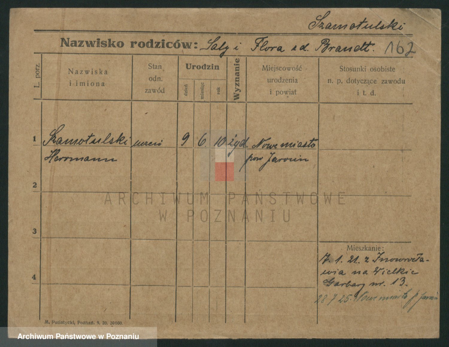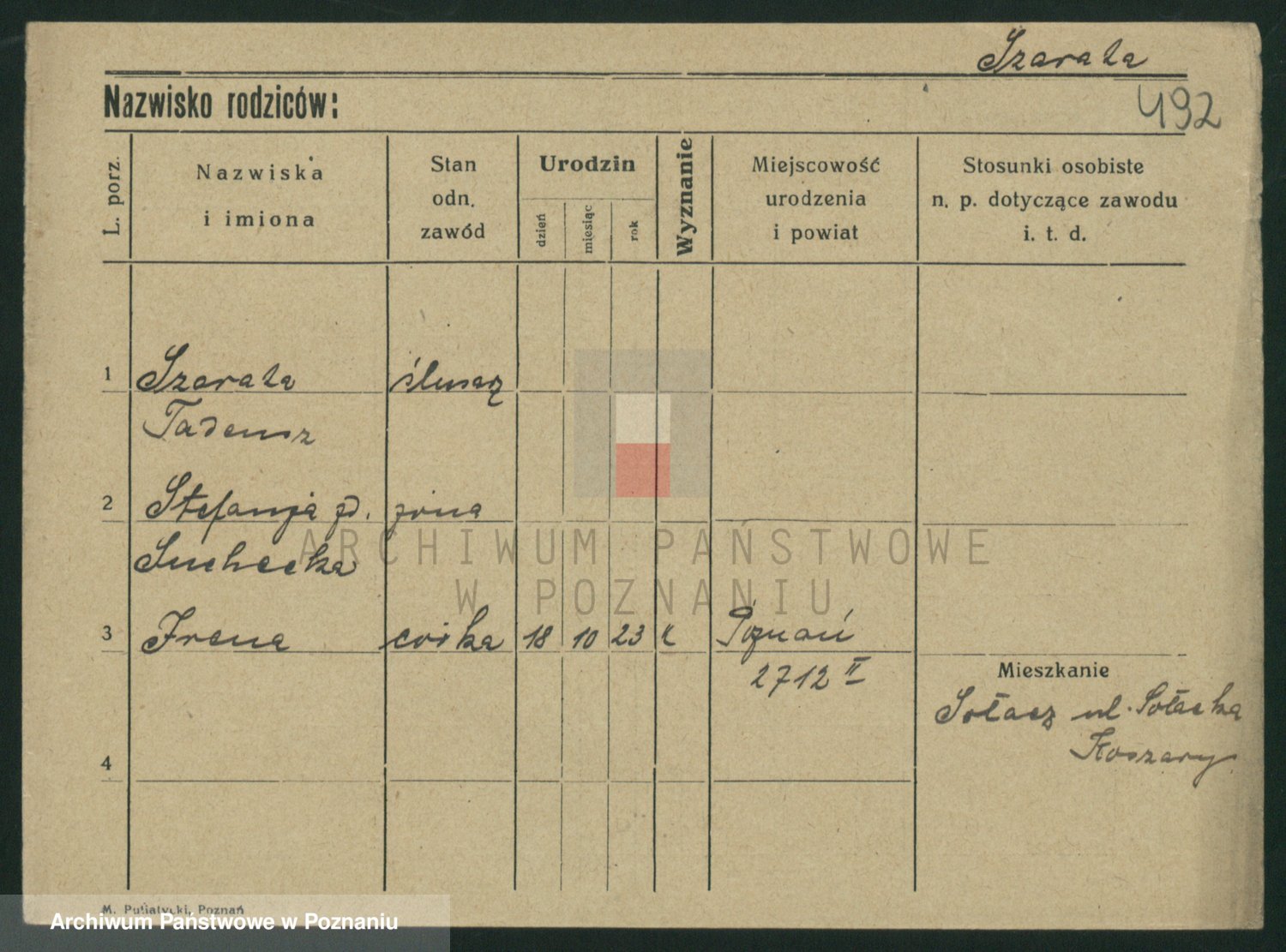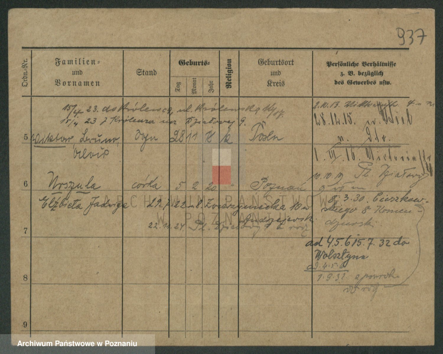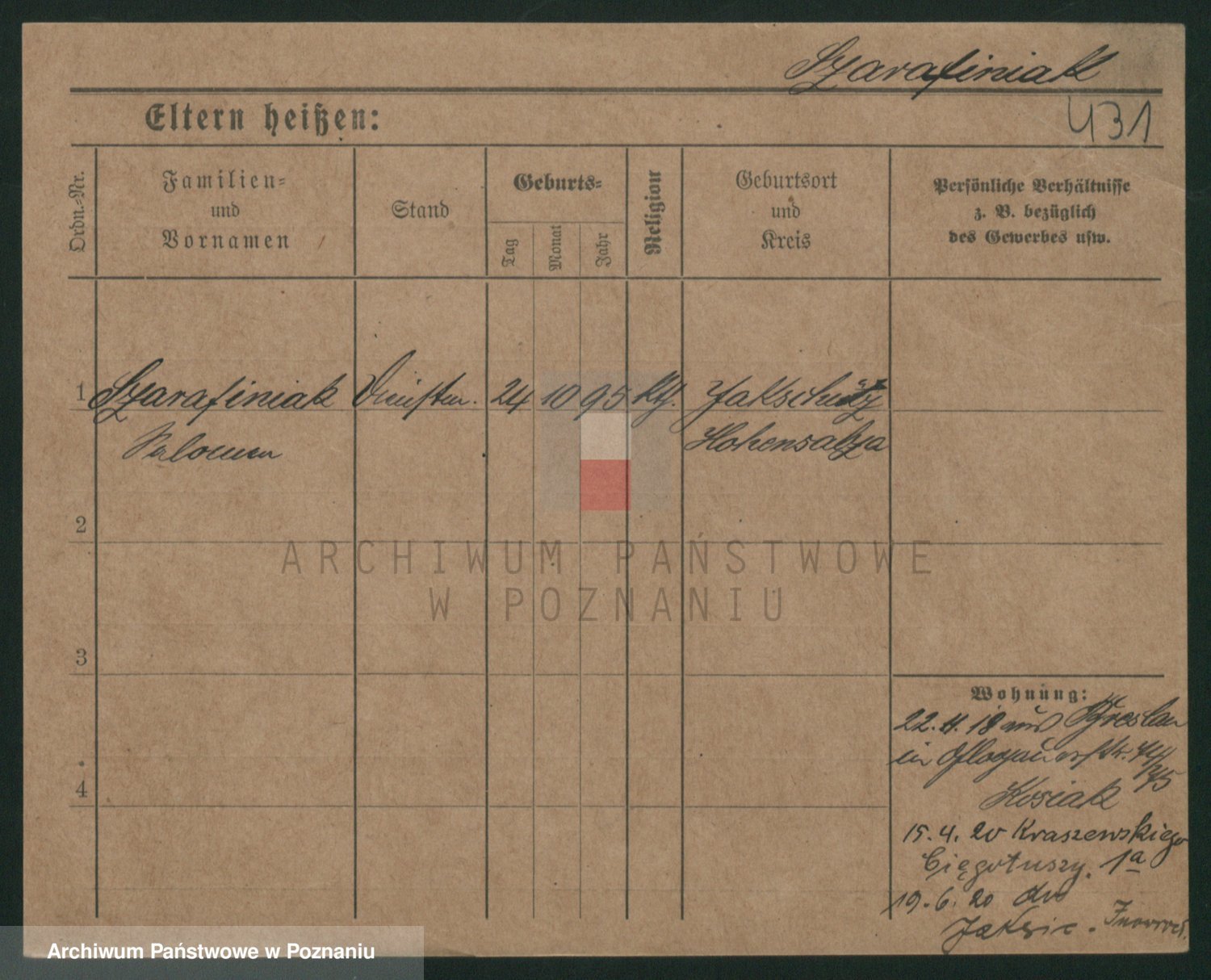 Podgląd karty osobowej dostępny jest po kliknięciu na nazwisko lub ikonkę karty. Można dokonywać powiększenia (ikony na górze) lub przechodzić między kolejnymi skanami (strzałki po bokach).