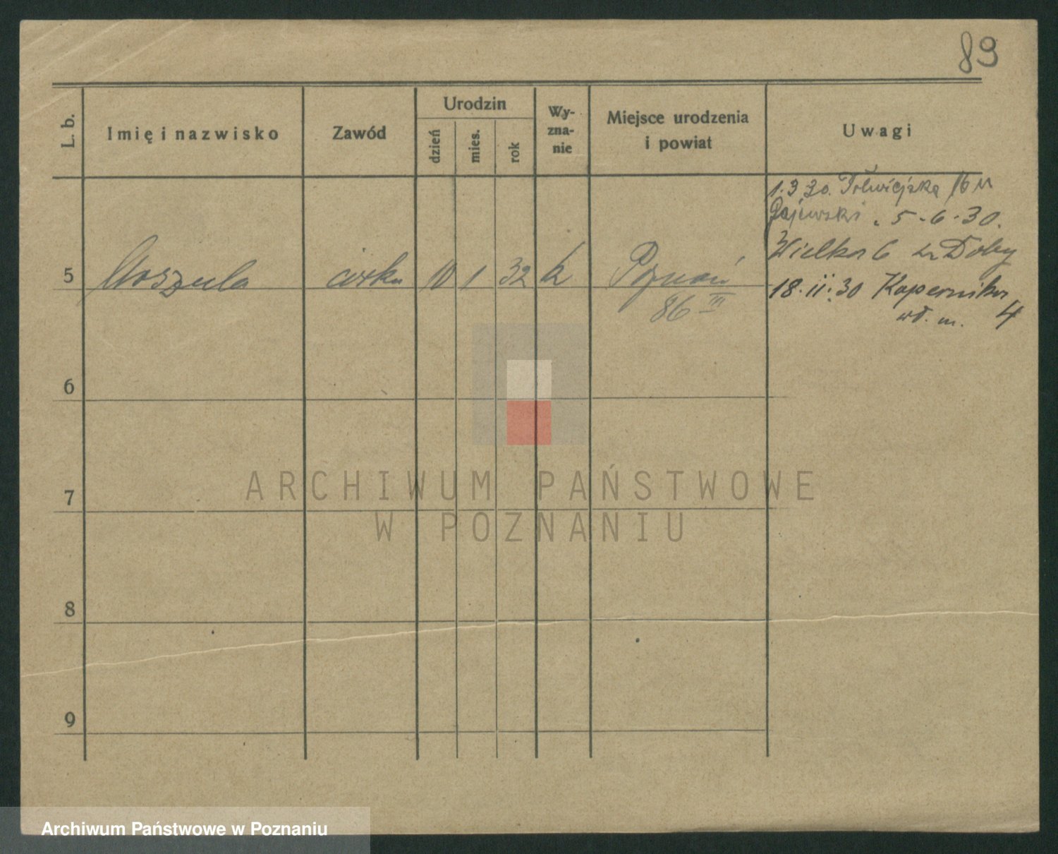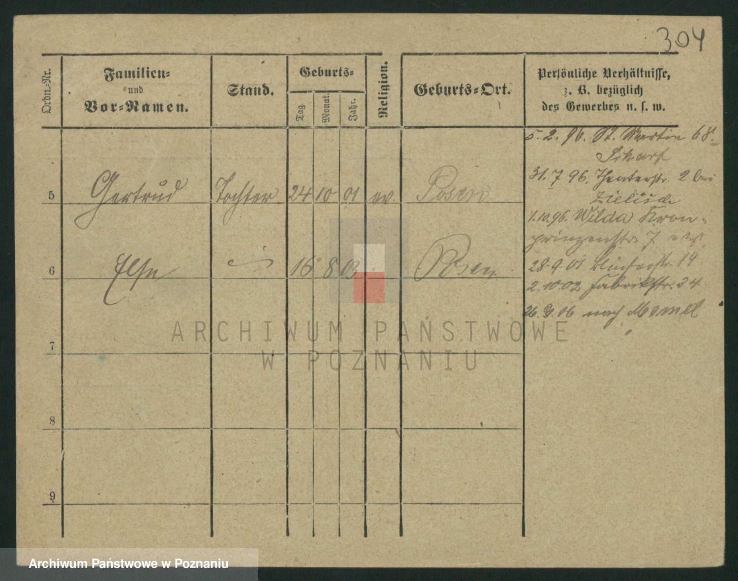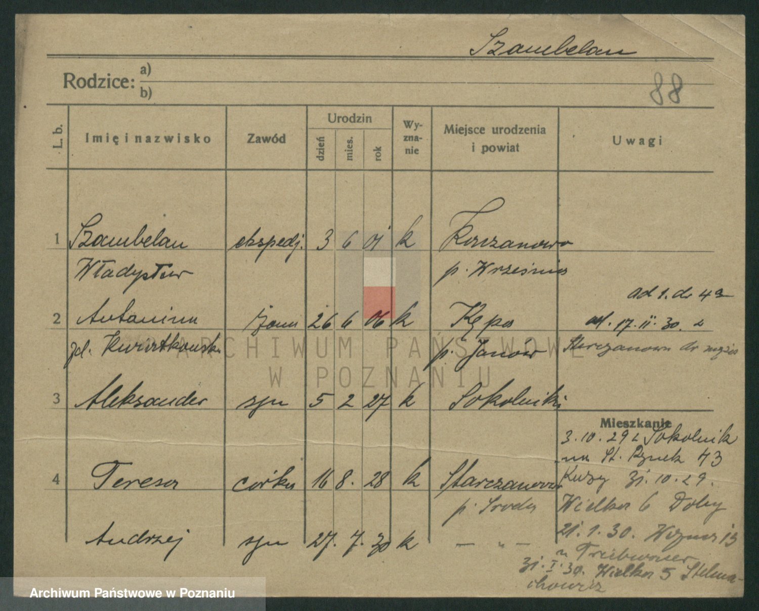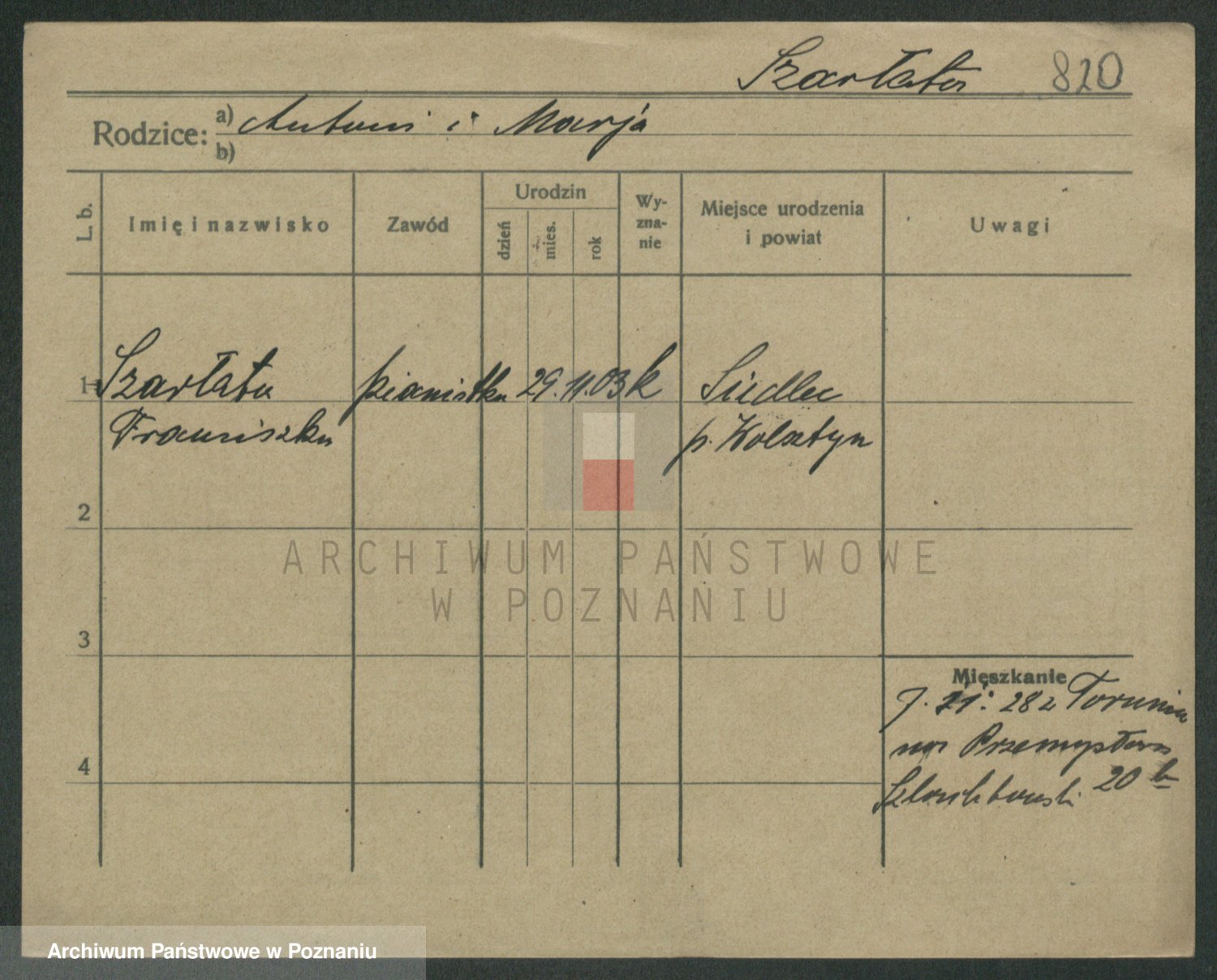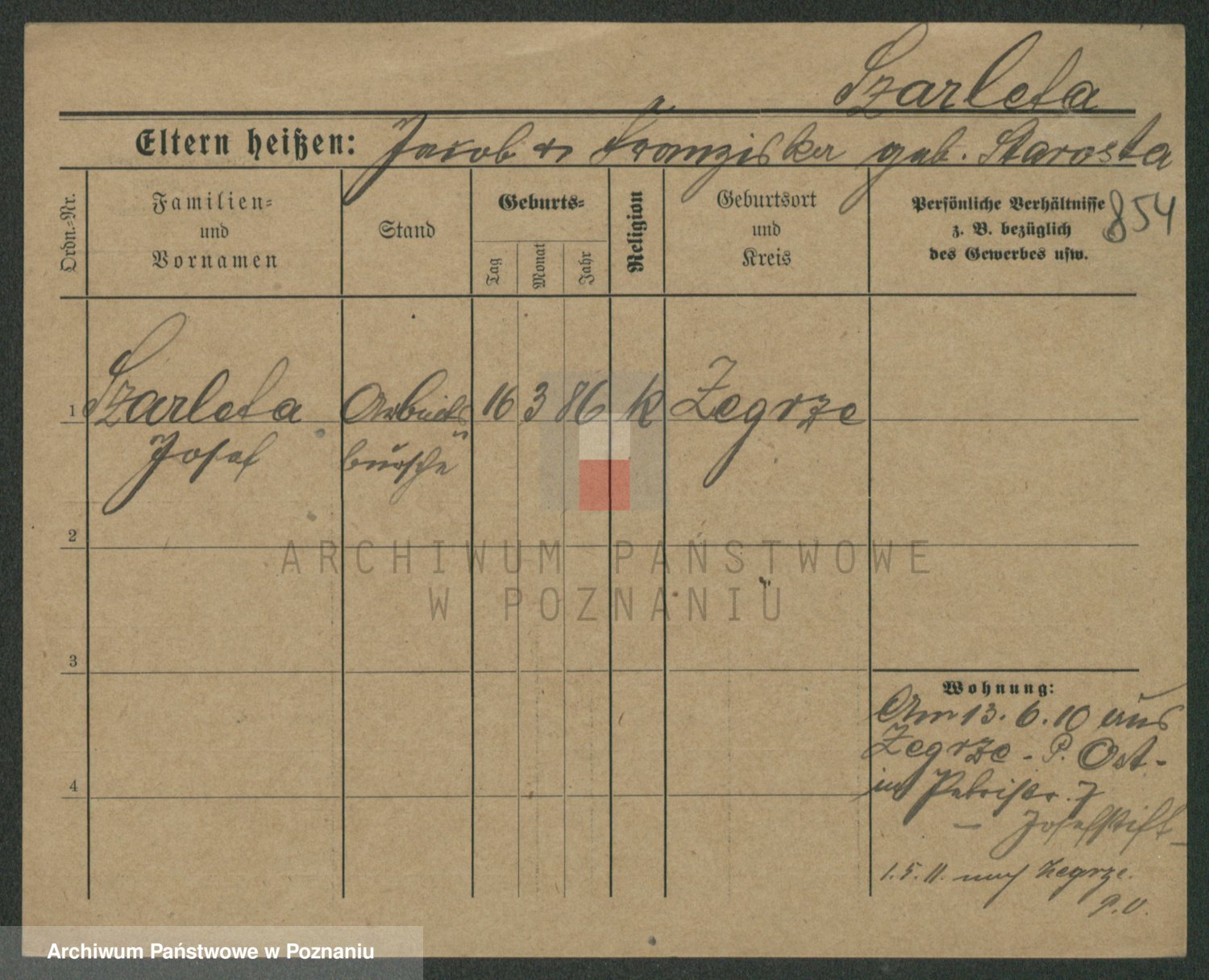 Podgląd karty osobowej dostępny jest po kliknięciu na nazwisko lub ikonkę karty. Można dokonywać powiększenia (ikony na górze) lub przechodzić między kolejnymi skanami (strzałki po bokach).