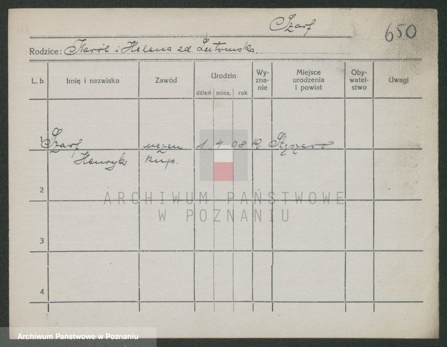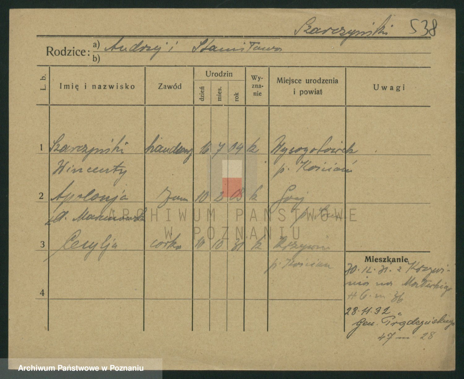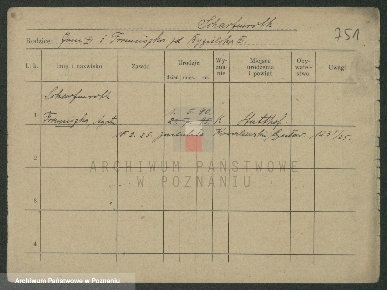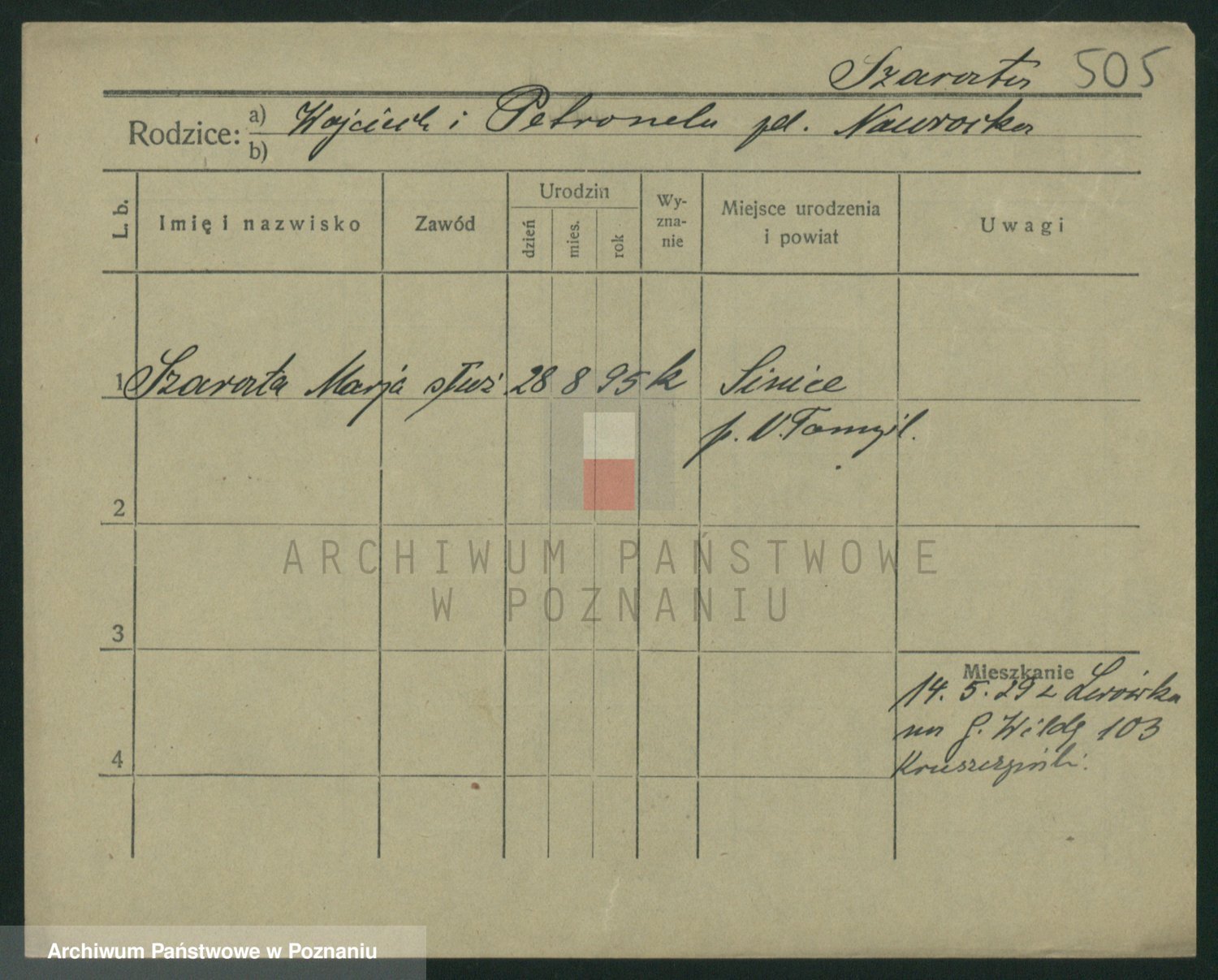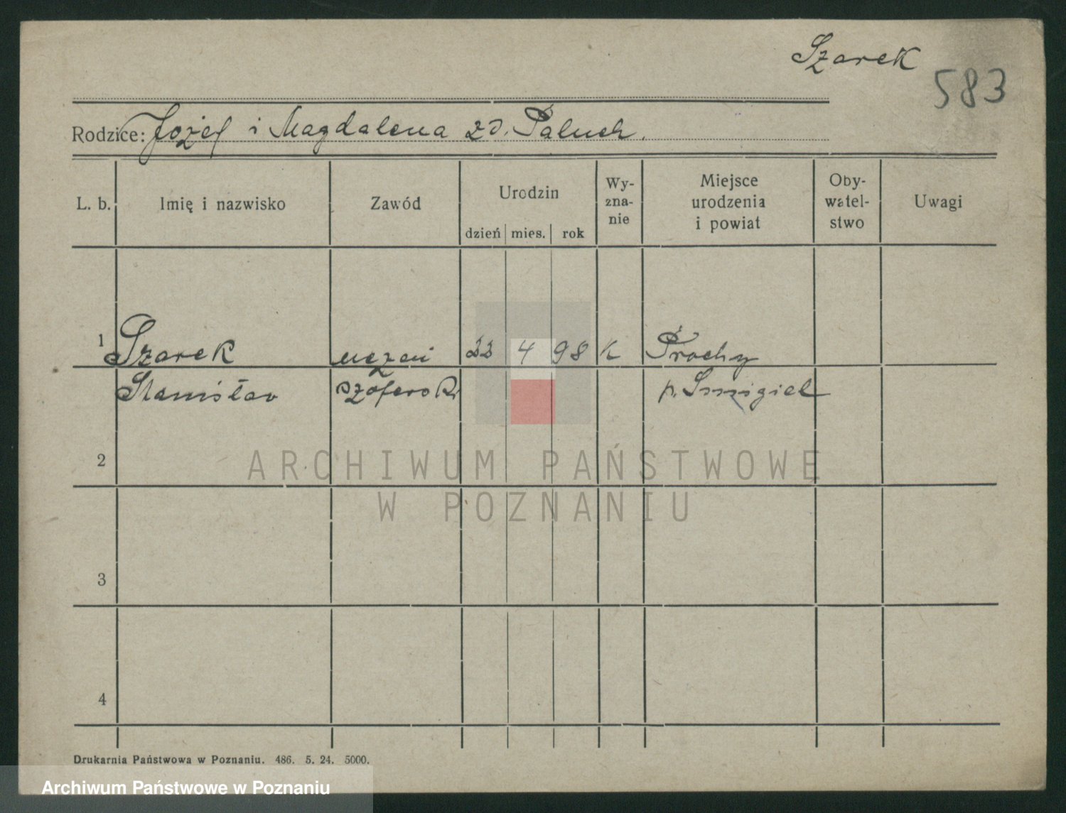 Podgląd karty osobowej dostępny jest po kliknięciu na nazwisko lub ikonkę karty. Można dokonywać powiększenia (ikony na górze) lub przechodzić między kolejnymi skanami (strzałki po bokach).