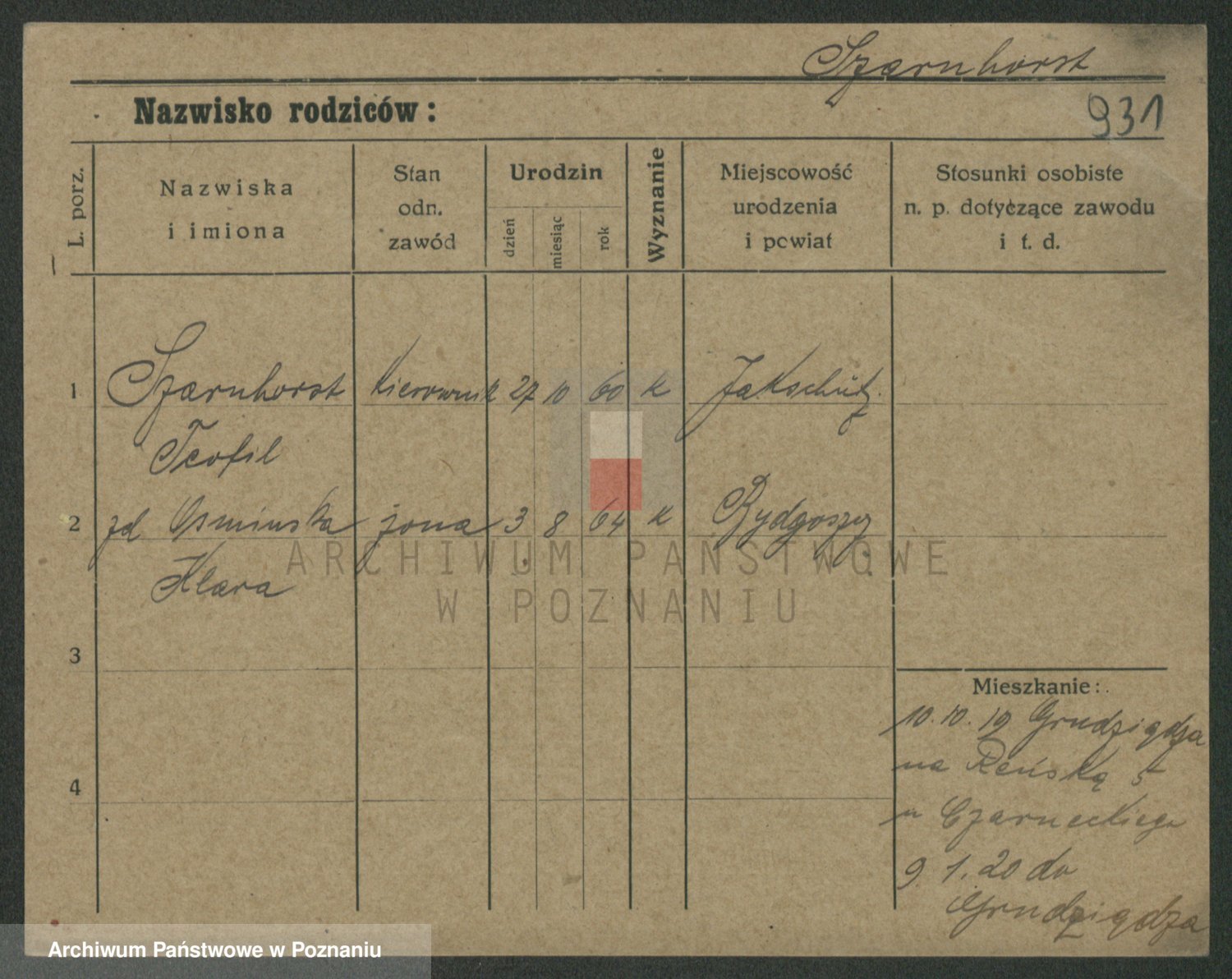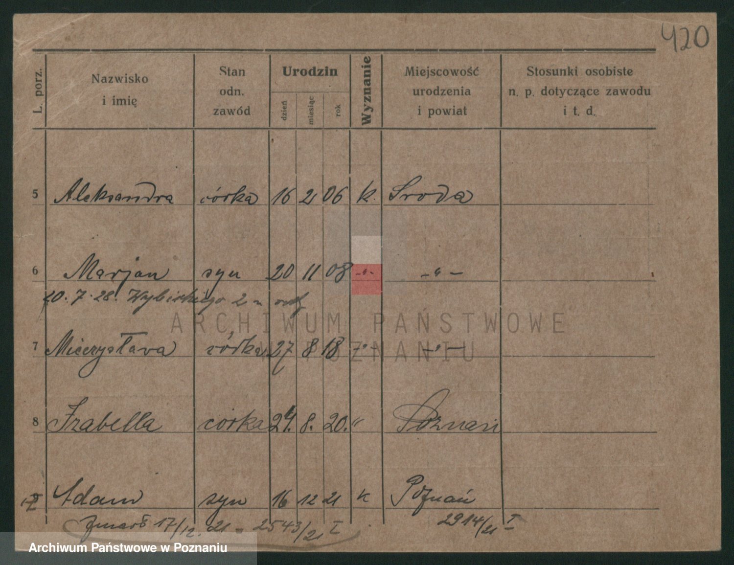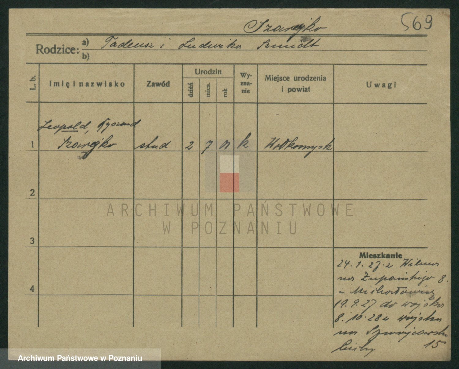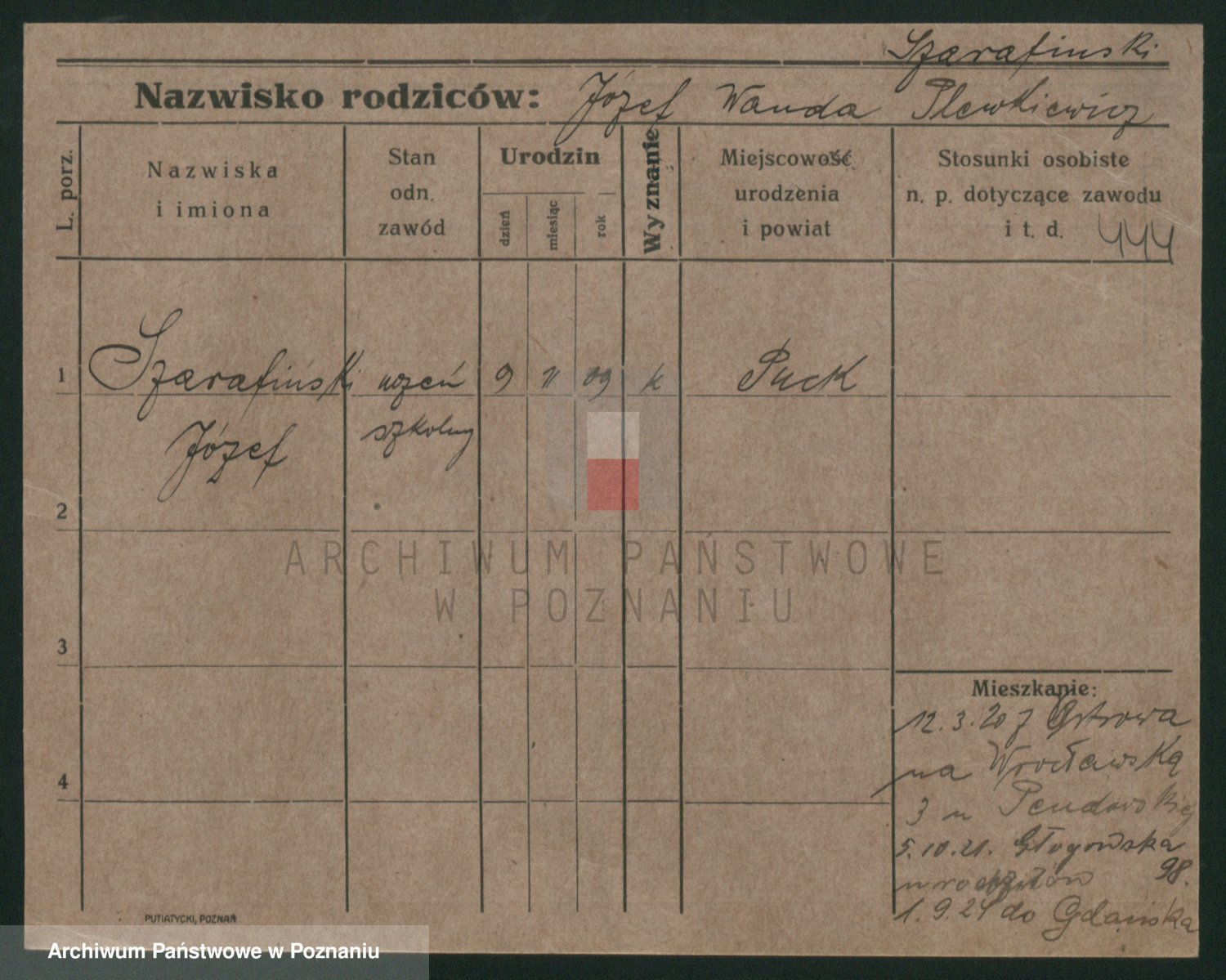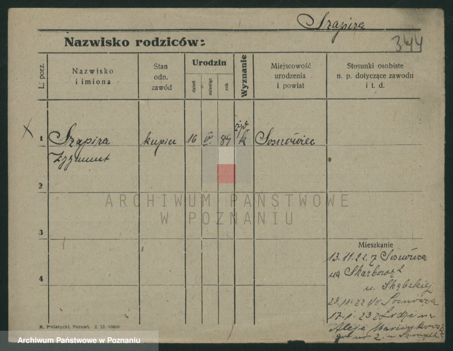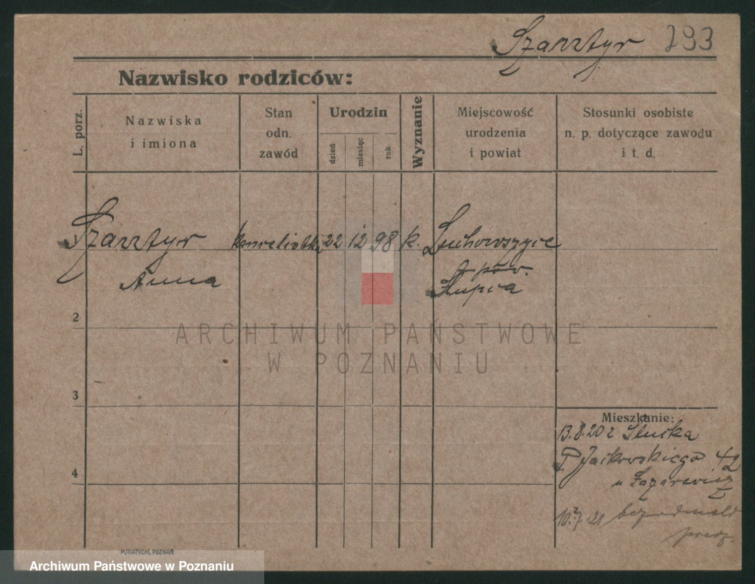 Podgląd karty osobowej dostępny jest po kliknięciu na nazwisko lub ikonkę karty. Można dokonywać powiększenia (ikony na górze) lub przechodzić między kolejnymi skanami (strzałki po bokach).