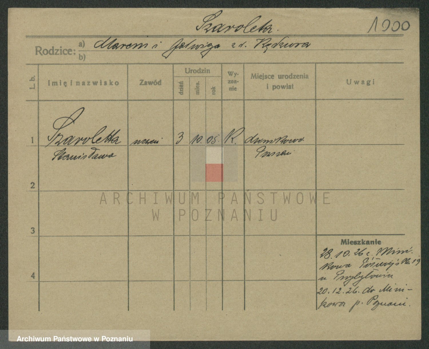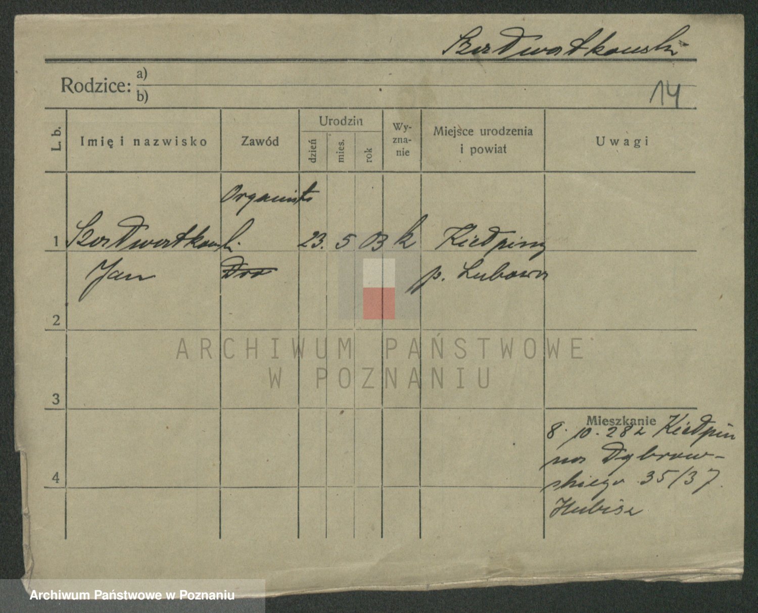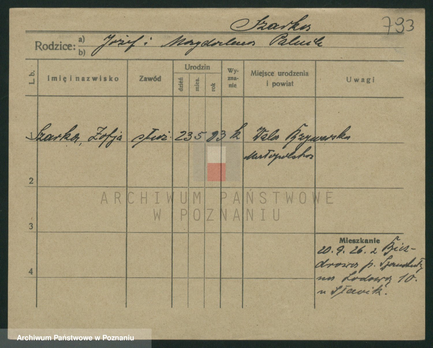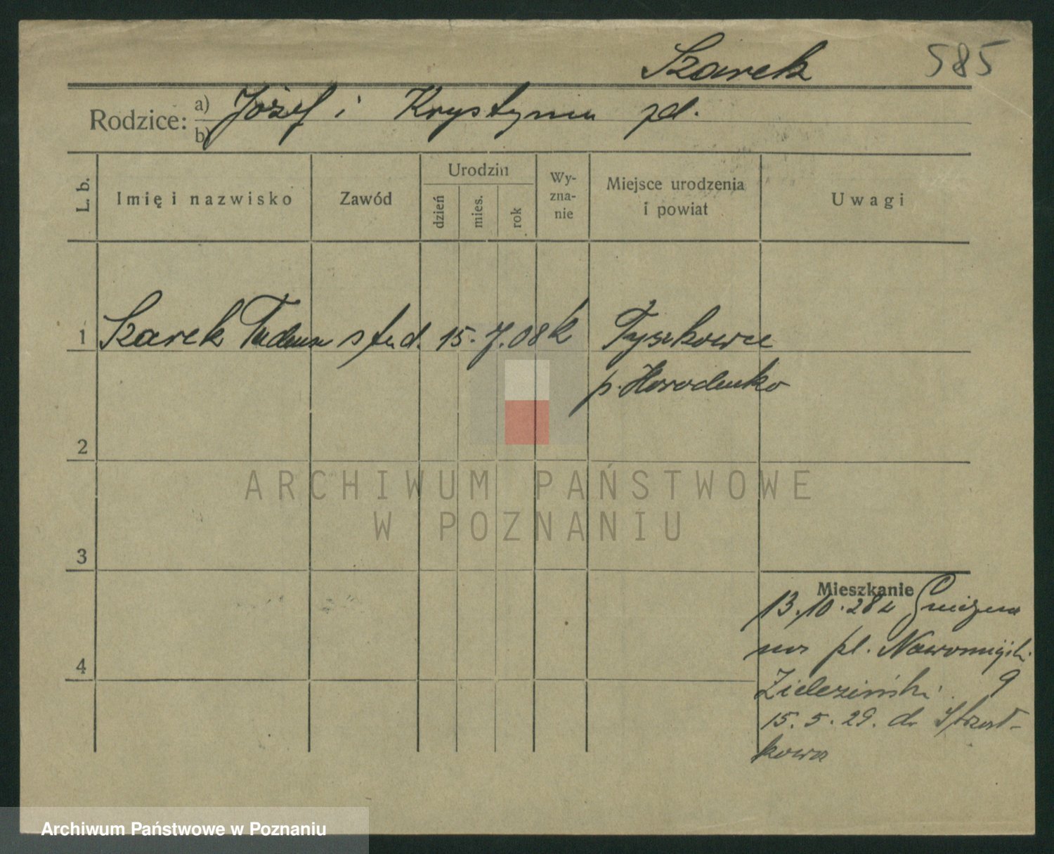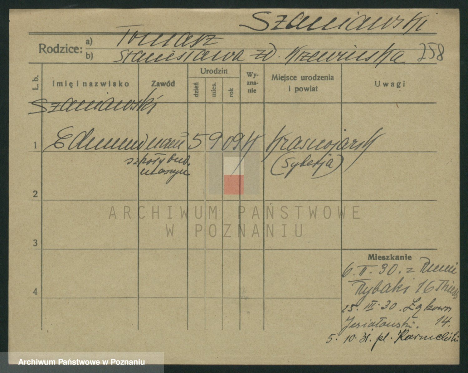 Podgląd karty osobowej dostępny jest po kliknięciu na nazwisko lub ikonkę karty. Można dokonywać powiększenia (ikony na górze) lub przechodzić między kolejnymi skanami (strzałki po bokach).